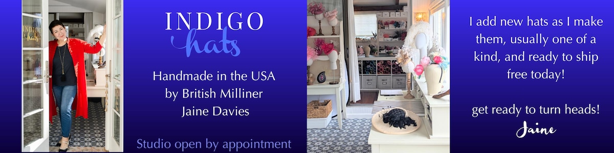 Periwinkle Straw Teardrop Pillbox Hat with velvet flowers, veiling and curled quills