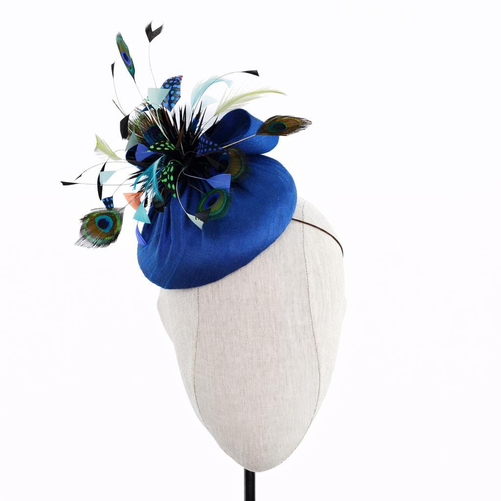 This charming 'button' style is handblocked in a blue dupioni silk. It features one of my handmade feather pom poms - I make them with a lovely selection of gorgeous feathers including biot' peacock and Lady Amhurst pheasant to add beautiful movement to this headpiece. It also features a handmade bow in the same dupioni silk as the hat.