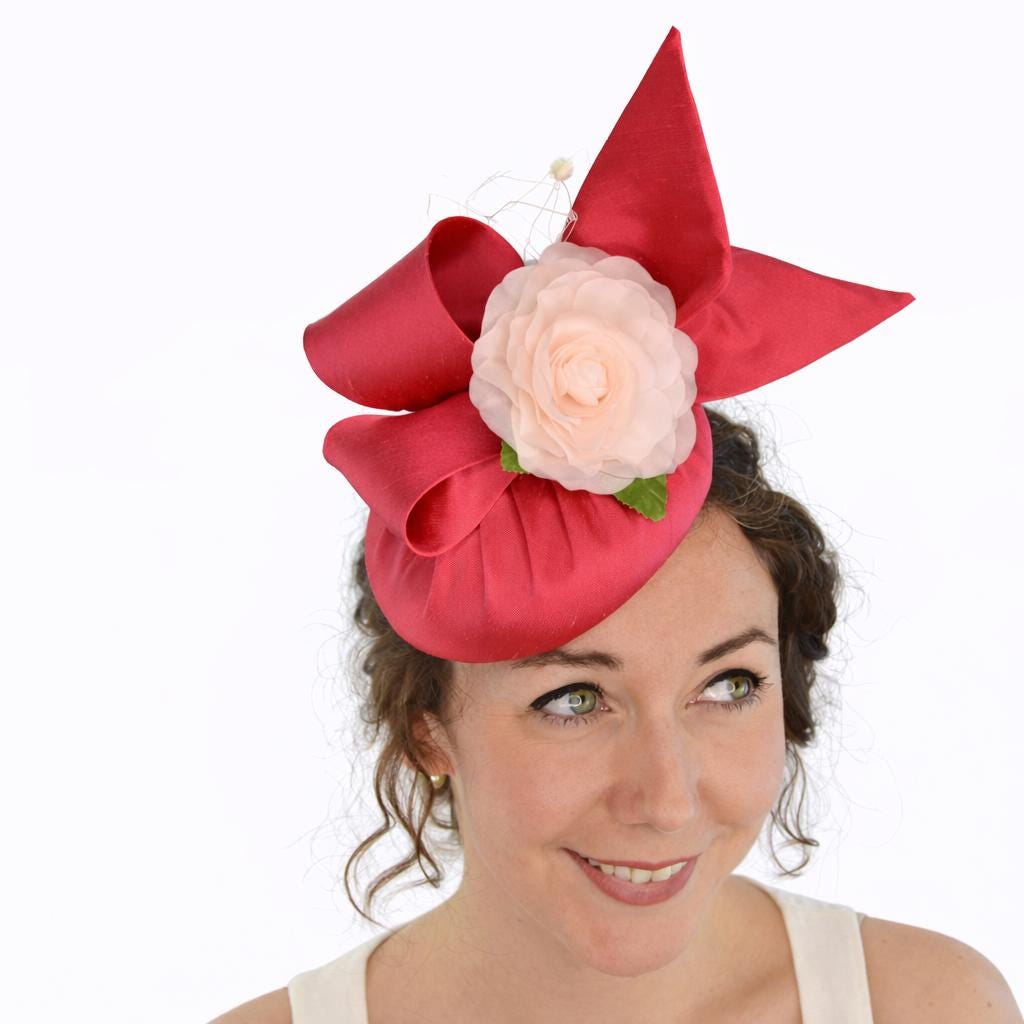 This stylish headpiece looks fabulous on - and is so light and easy to wear! I made it in a lovely fuchsia, pure Silk, created an open bow finished with a charming camellia flower. A flourish of vintage style veiling at the back sets off the glamorous look of this hat.