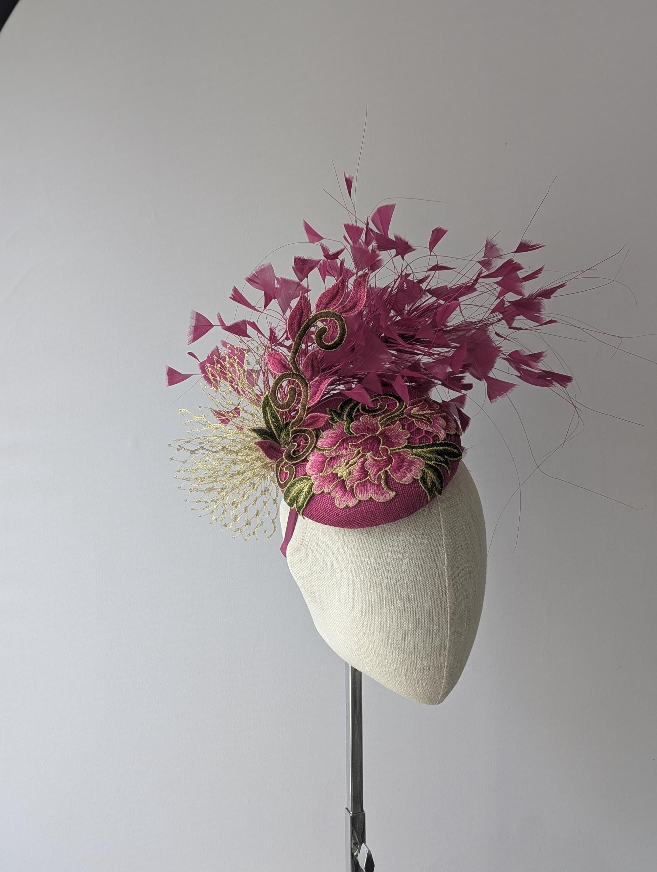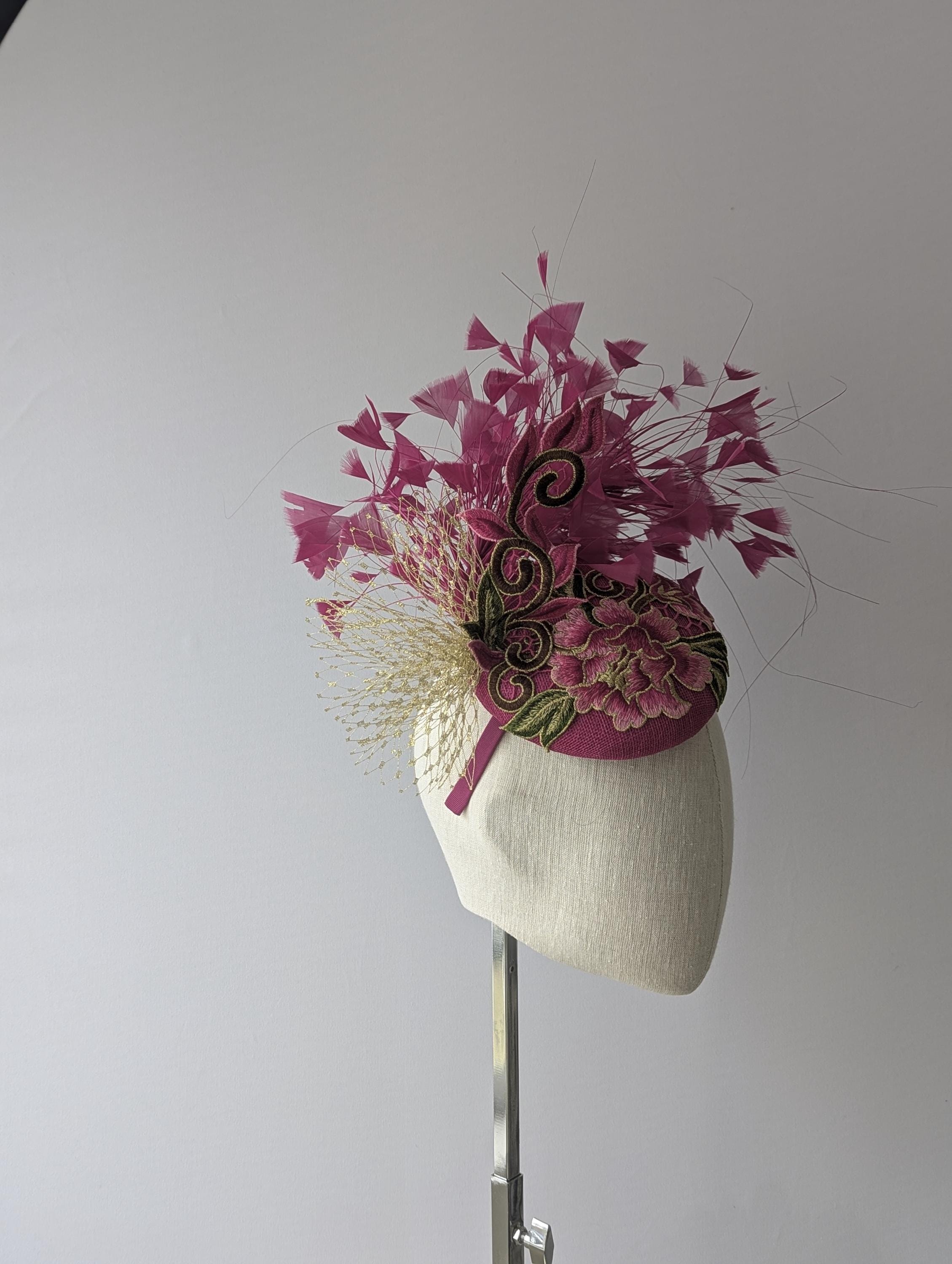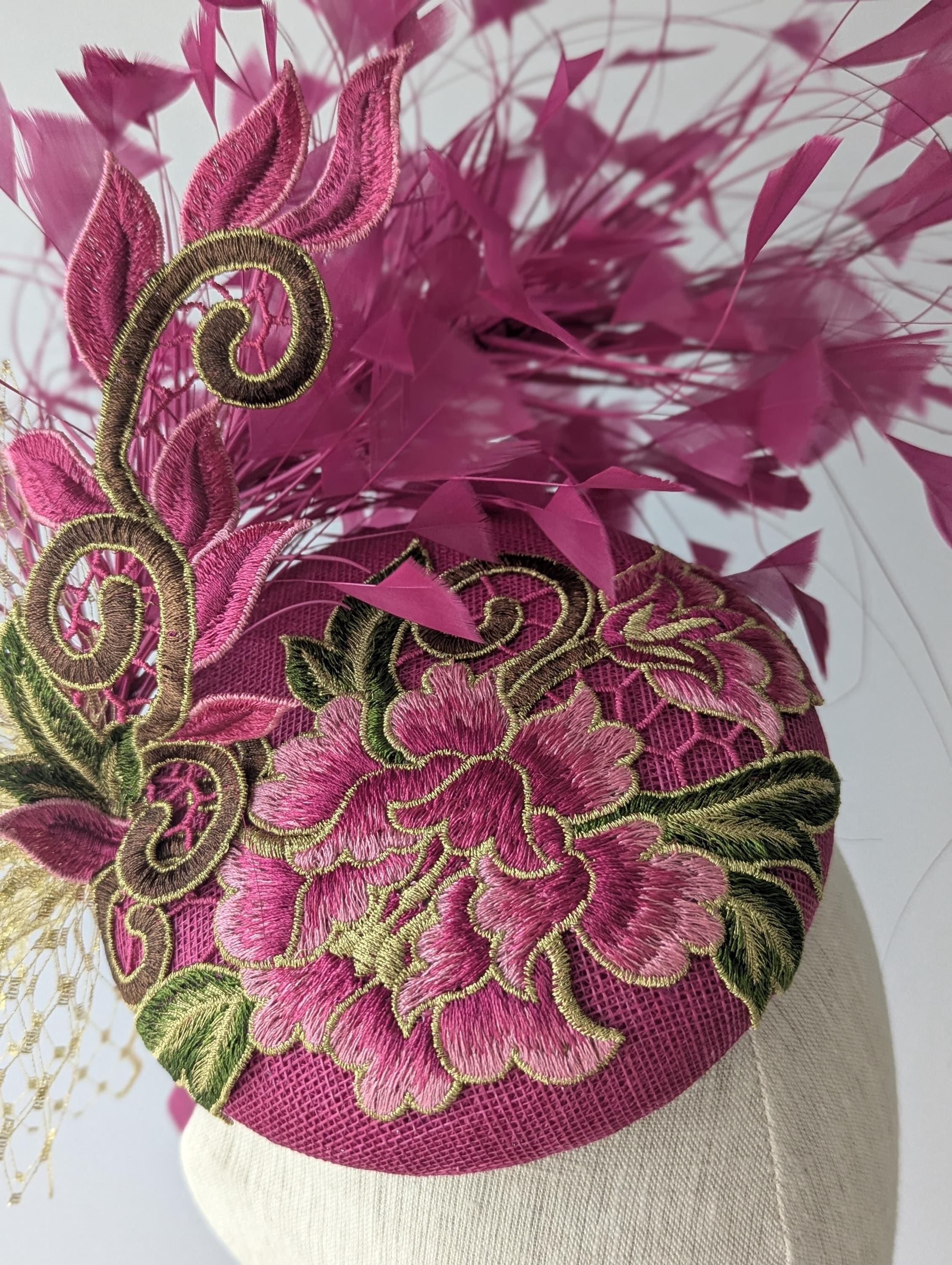 I love the drama of this hat! I handblocked layers of magenta pink straw in a flattering button shape. Then added a stunning embroidered floral lace design in pink and gold with a lively flourish to follow the lines of the hat. Matching exuberant feathers and glamorous gold veiling complete the look.