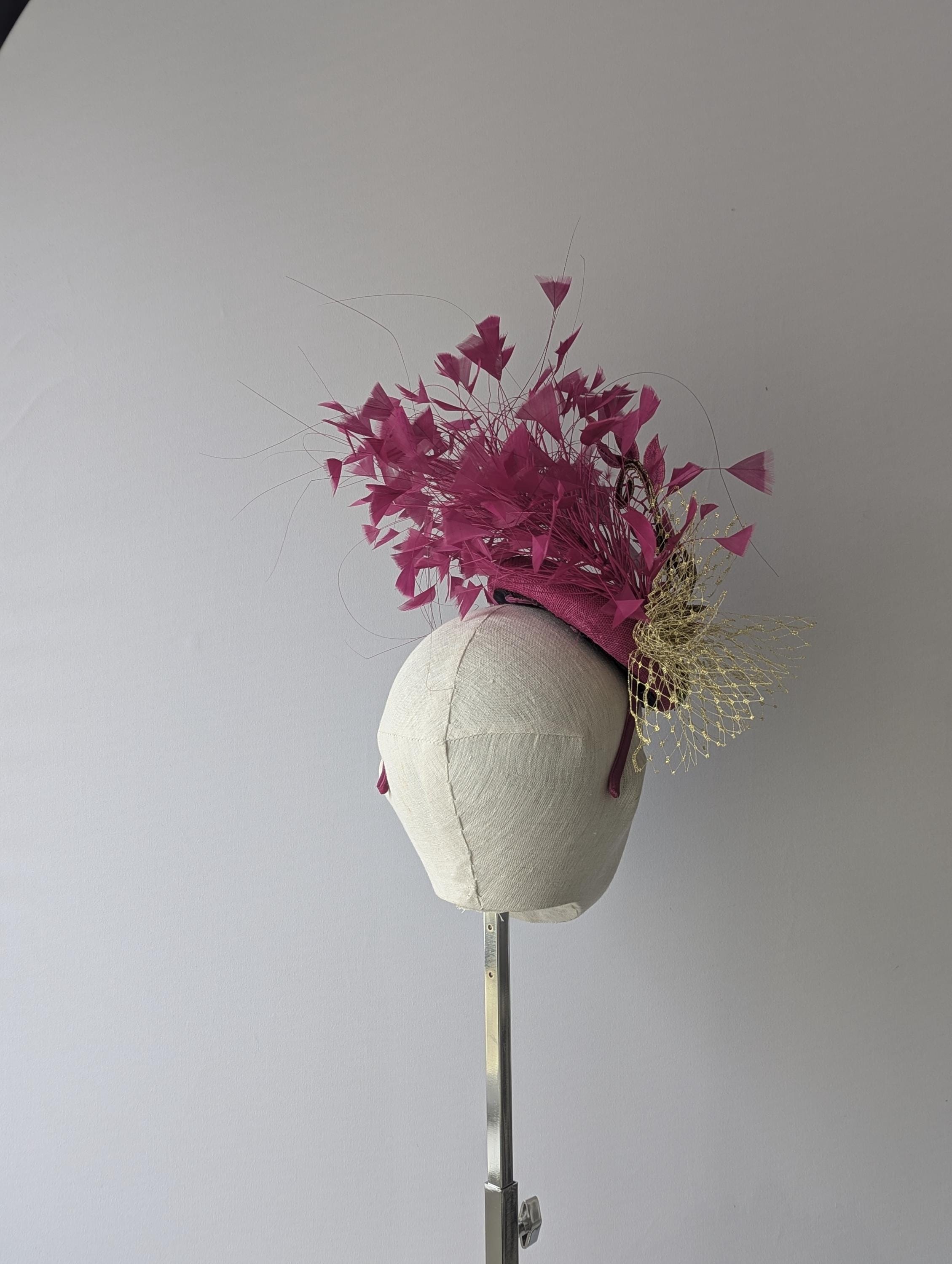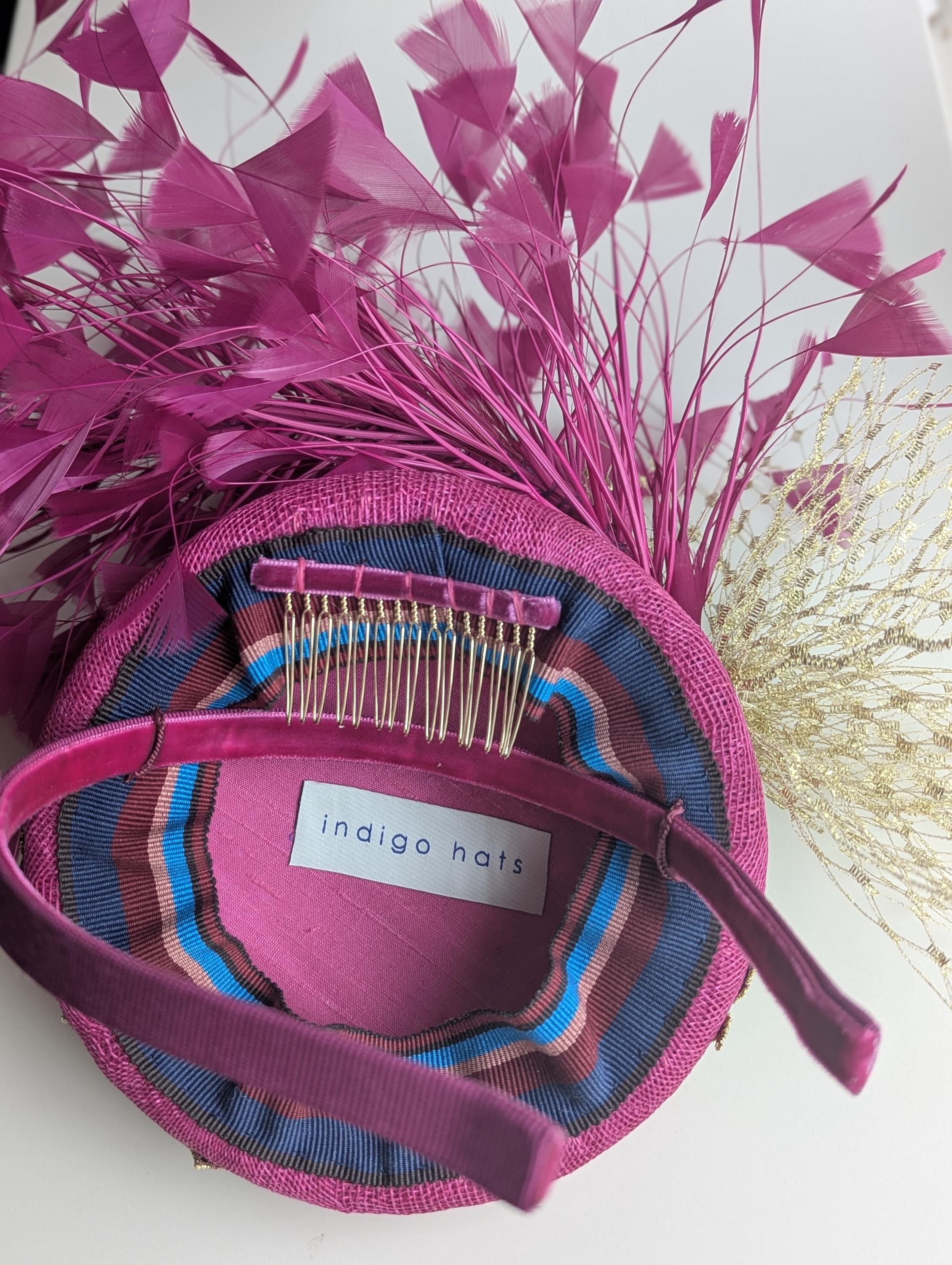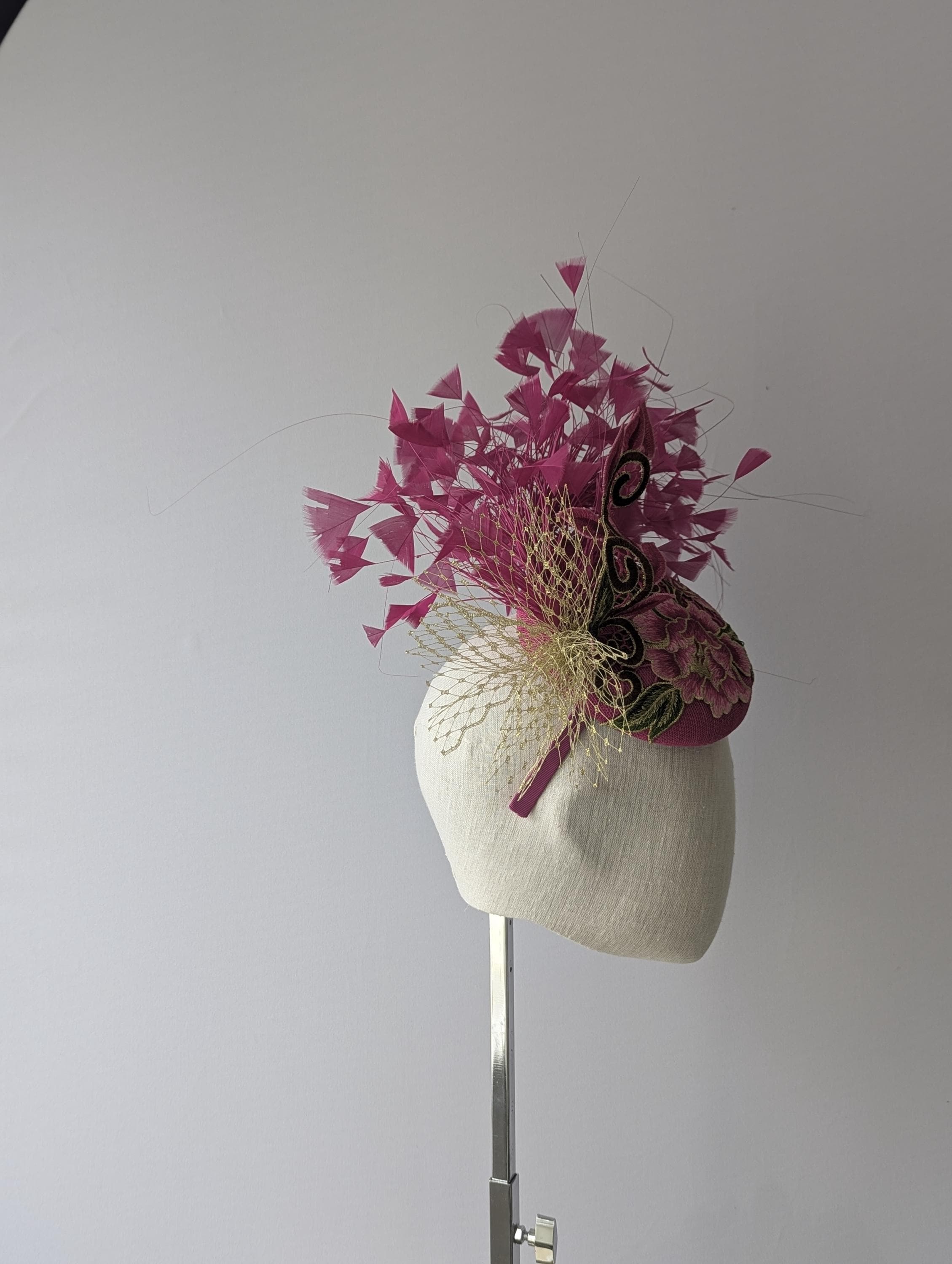 I love the drama of this hat! I handblocked layers of magenta pink straw in a flattering button shape. Then added a stunning embroidered floral lace design in pink and gold with a lively flourish to follow the lines of the hat. Matching exuberant feathers and glamorous gold veiling complete the look.