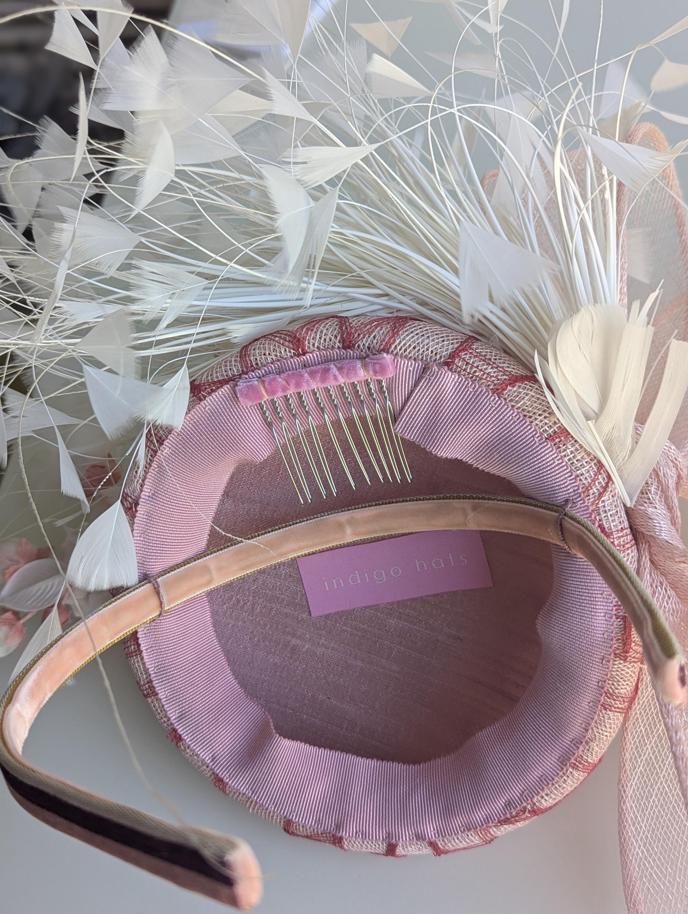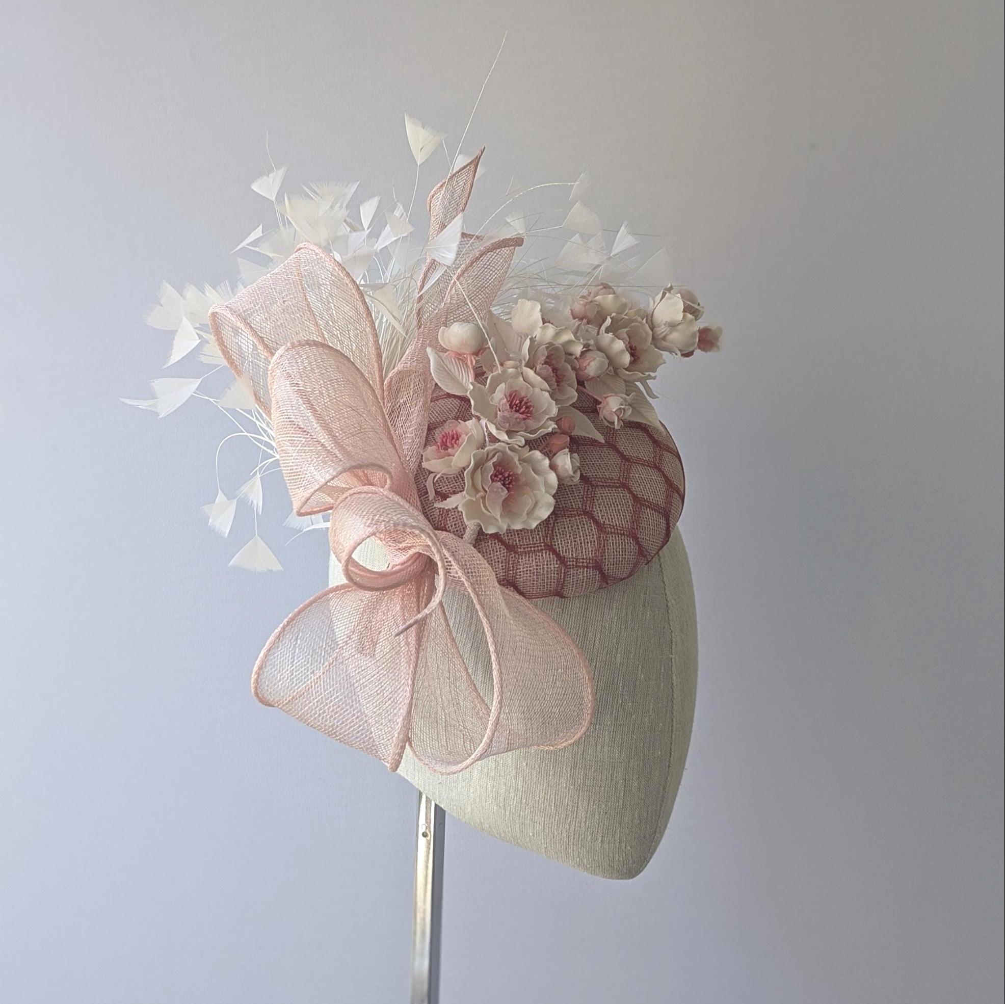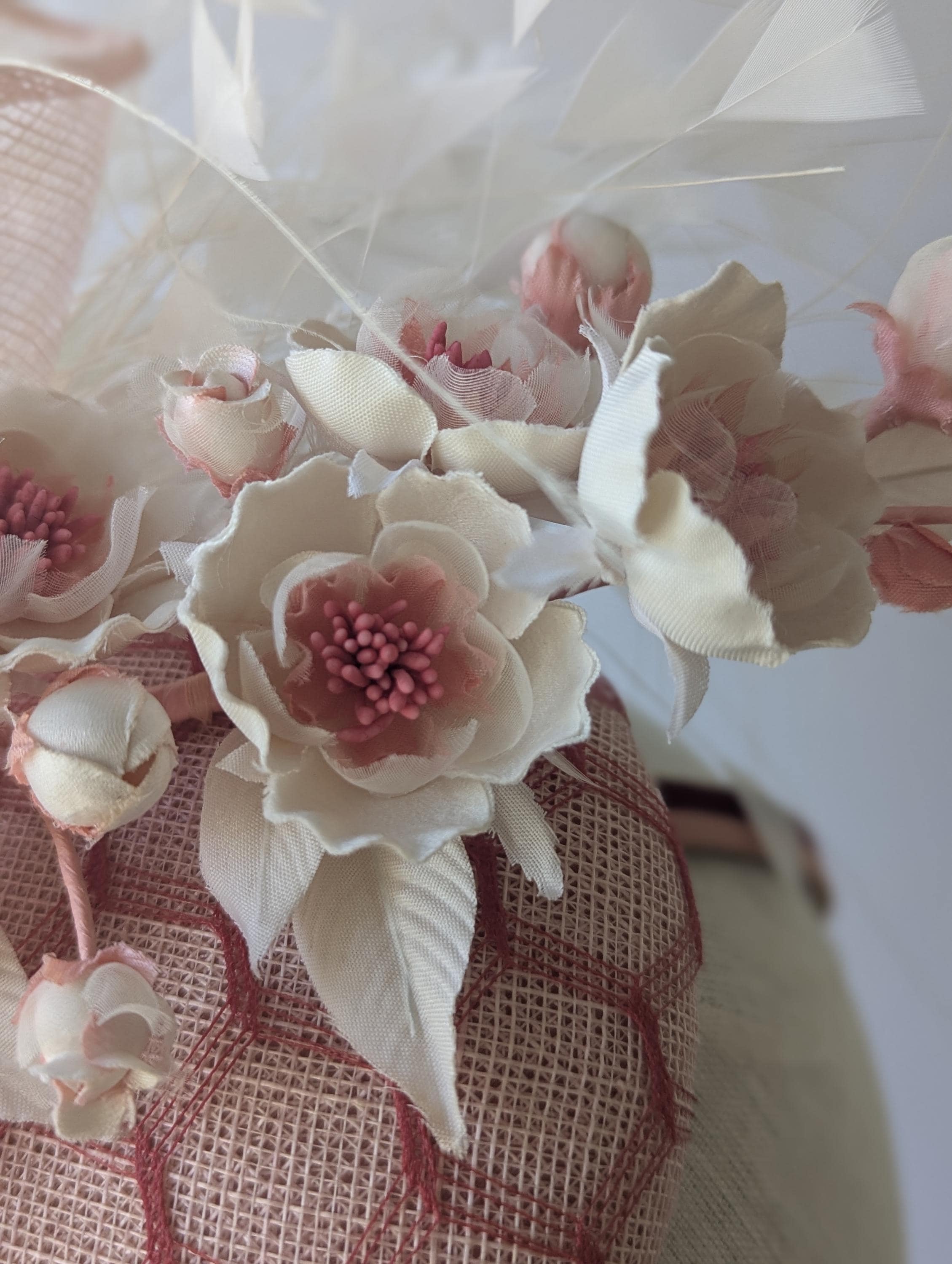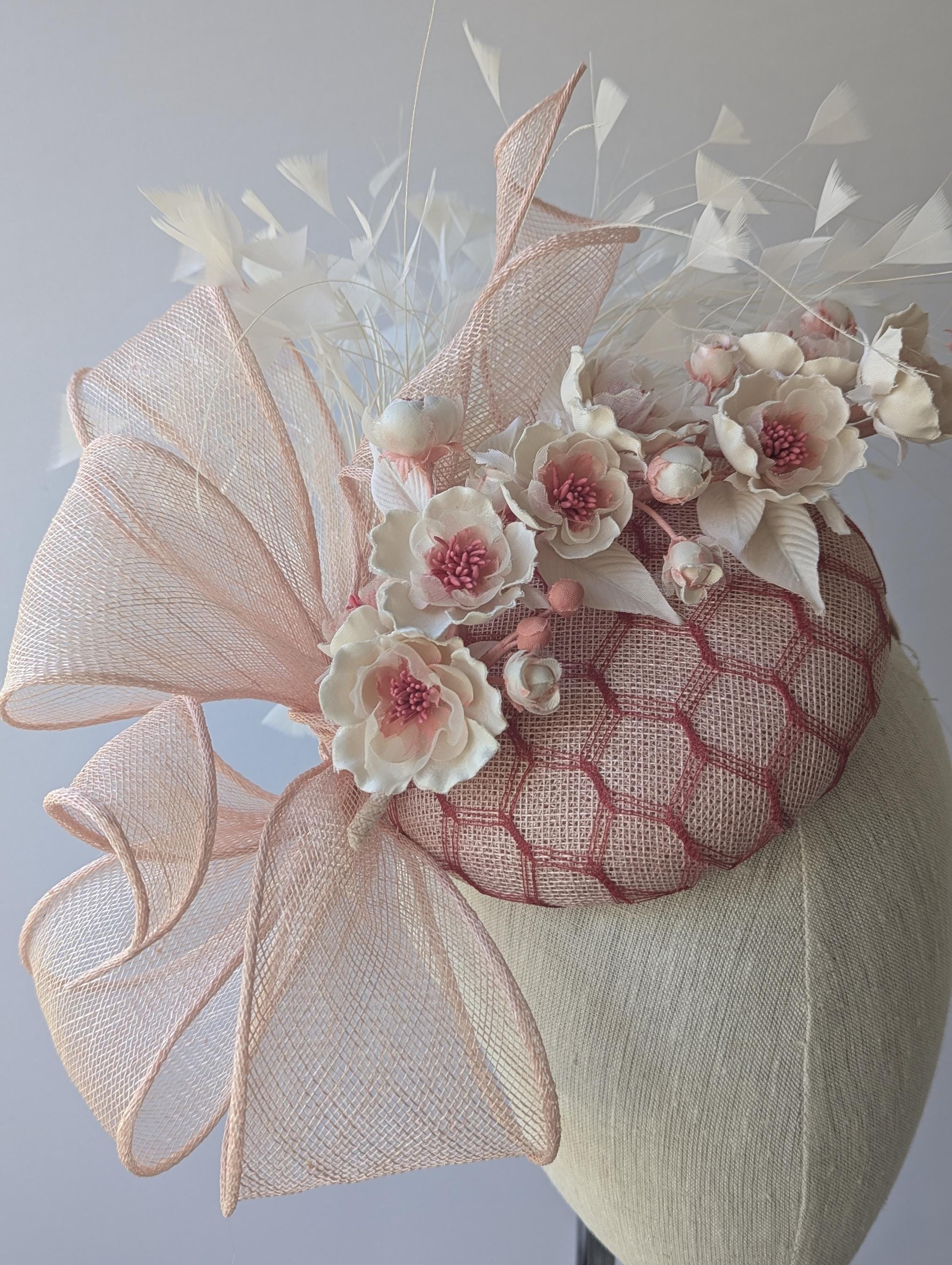 I love the drama of this hat! I handblocked a pretty blush pink straw in a flattering button shape. These flowers are stunning! dainty creamy silk with rouge centers. I then added a large bow in the same straw with a lively flourish to follow the lines of the hat. Exuberant ivory feathers and amazing rouge red vintage veiling complete the look - phew!