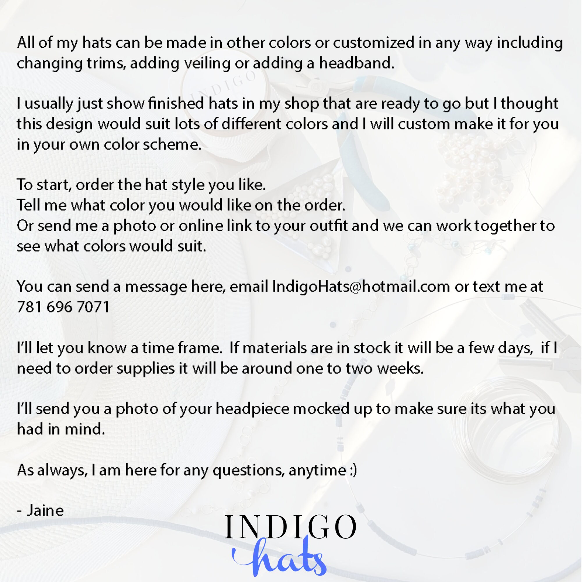 Its really important to me that you are thrilled with your hat and enjoy your shopping experience with Indigo Hats.