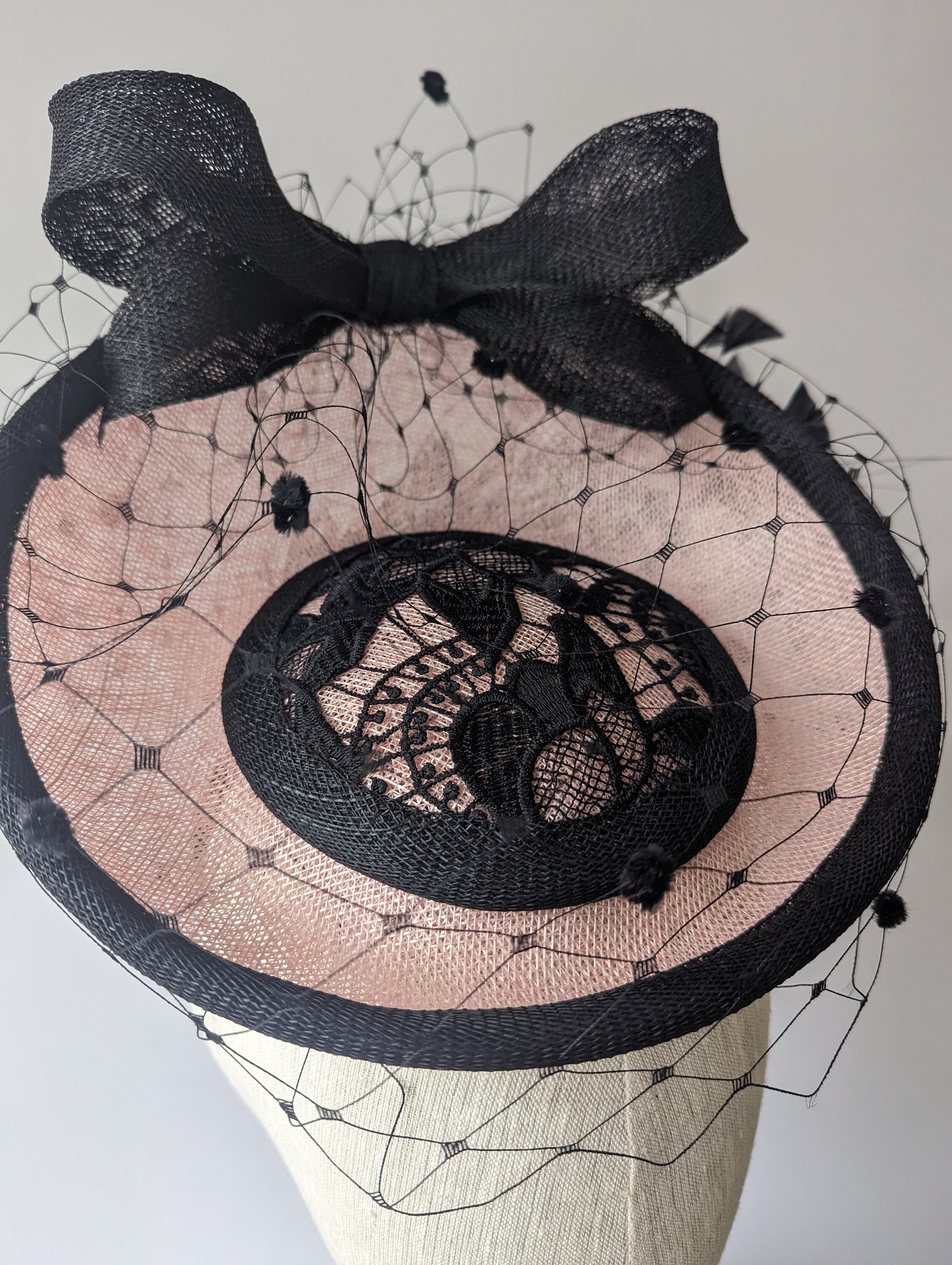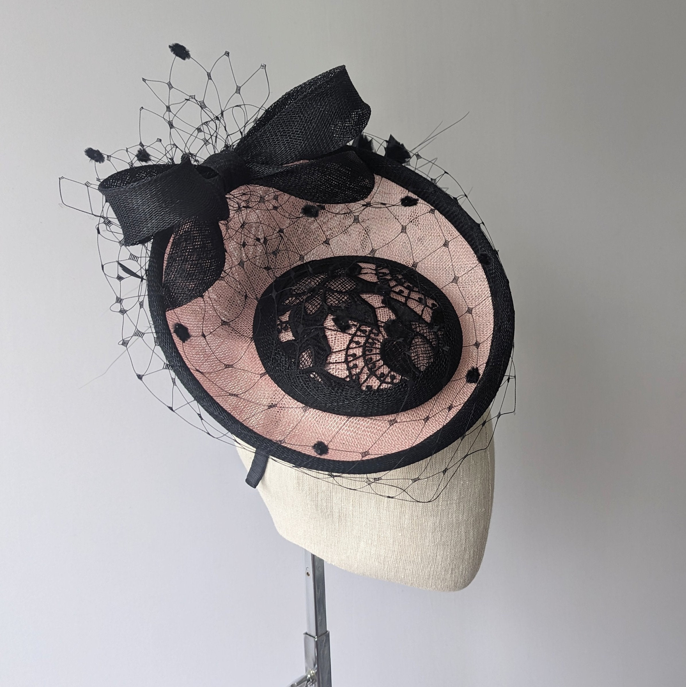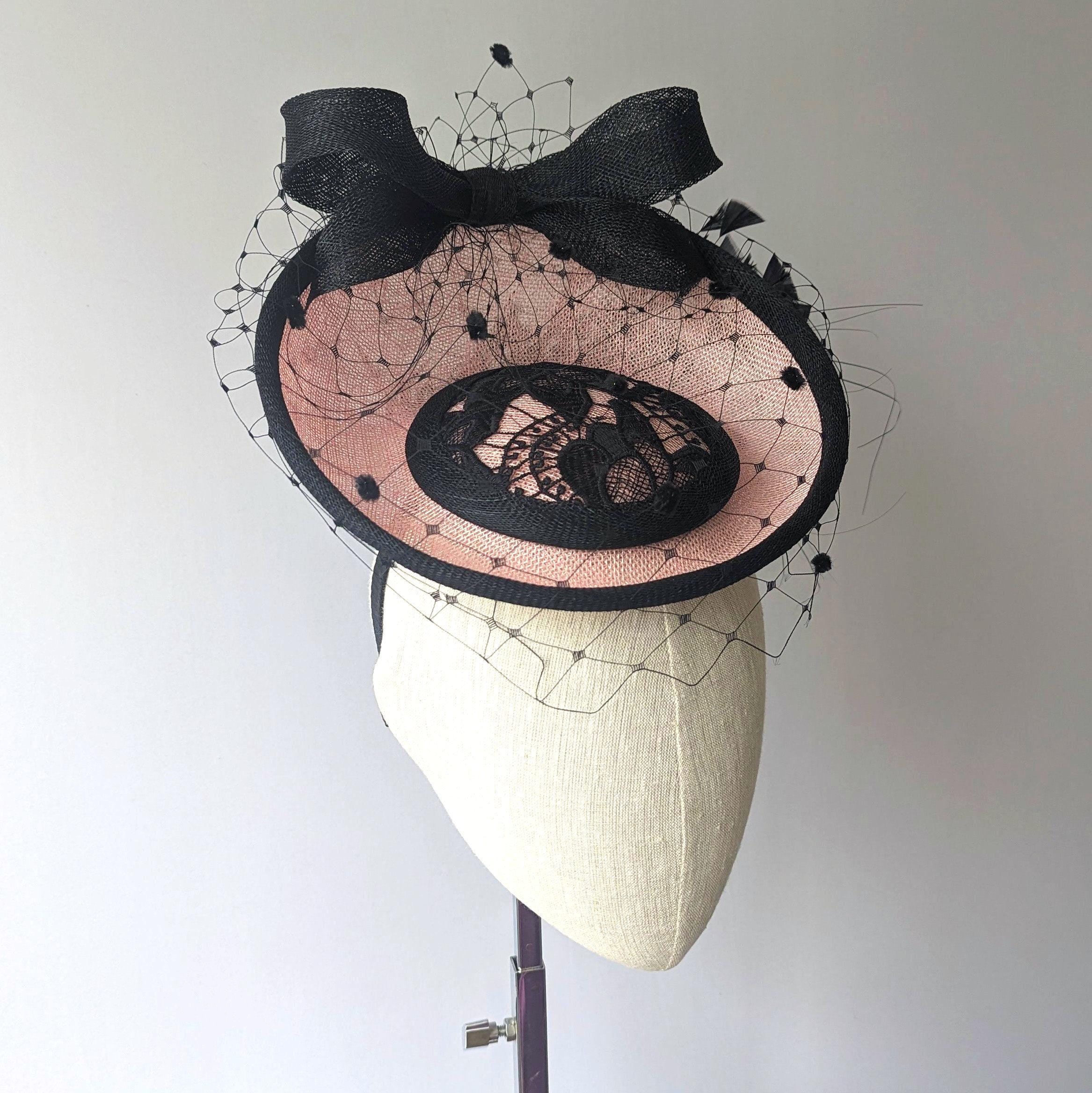 I hand blocked this elegant hat in a soft pink sinamay straw. I made a charming bow in black straw that ties in with the binding around the edges, I highlighted the center of the hat with black Guipure lace. Flirty feathers and sexy vintage style veiling gives this hat a really chic look.