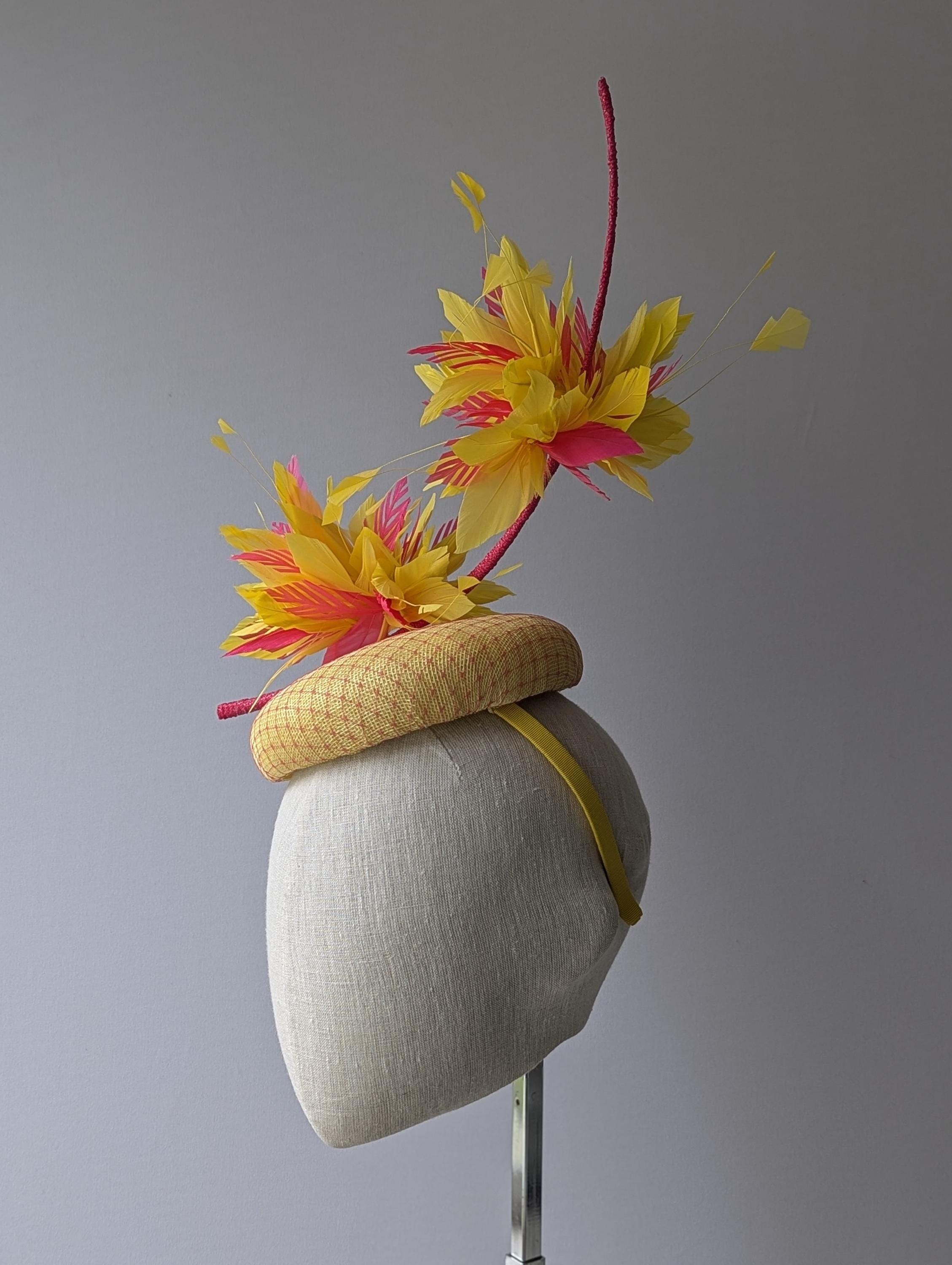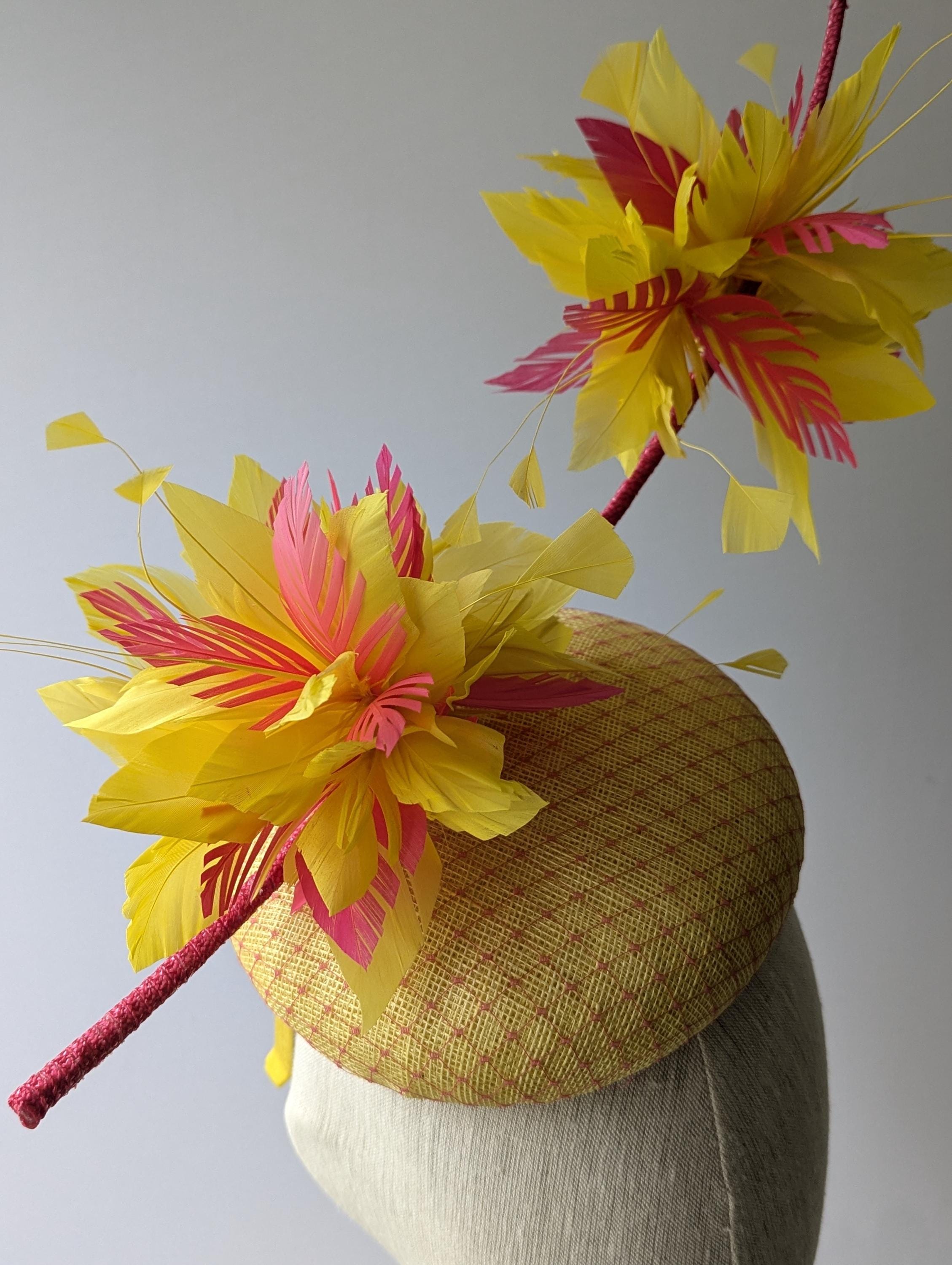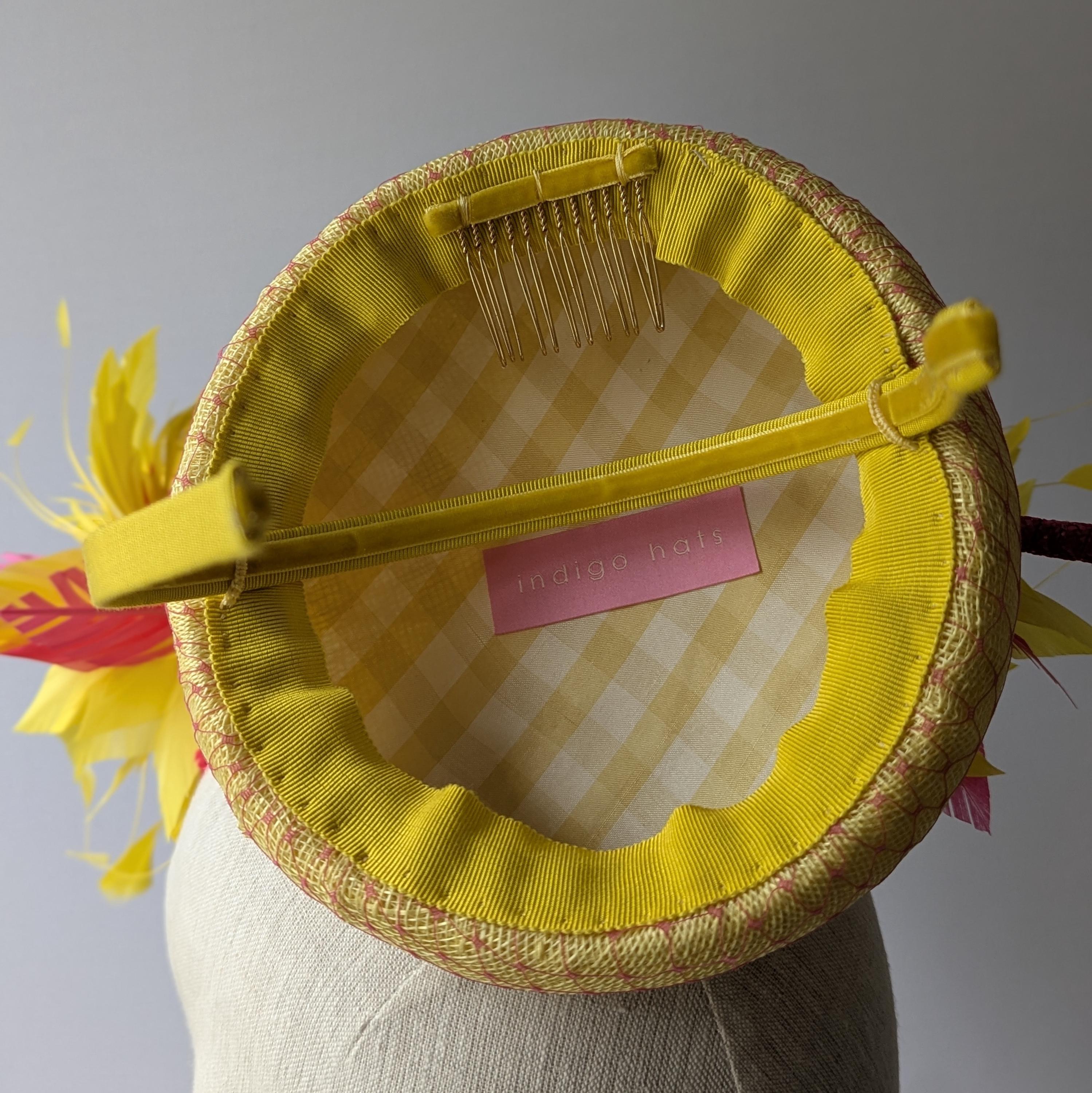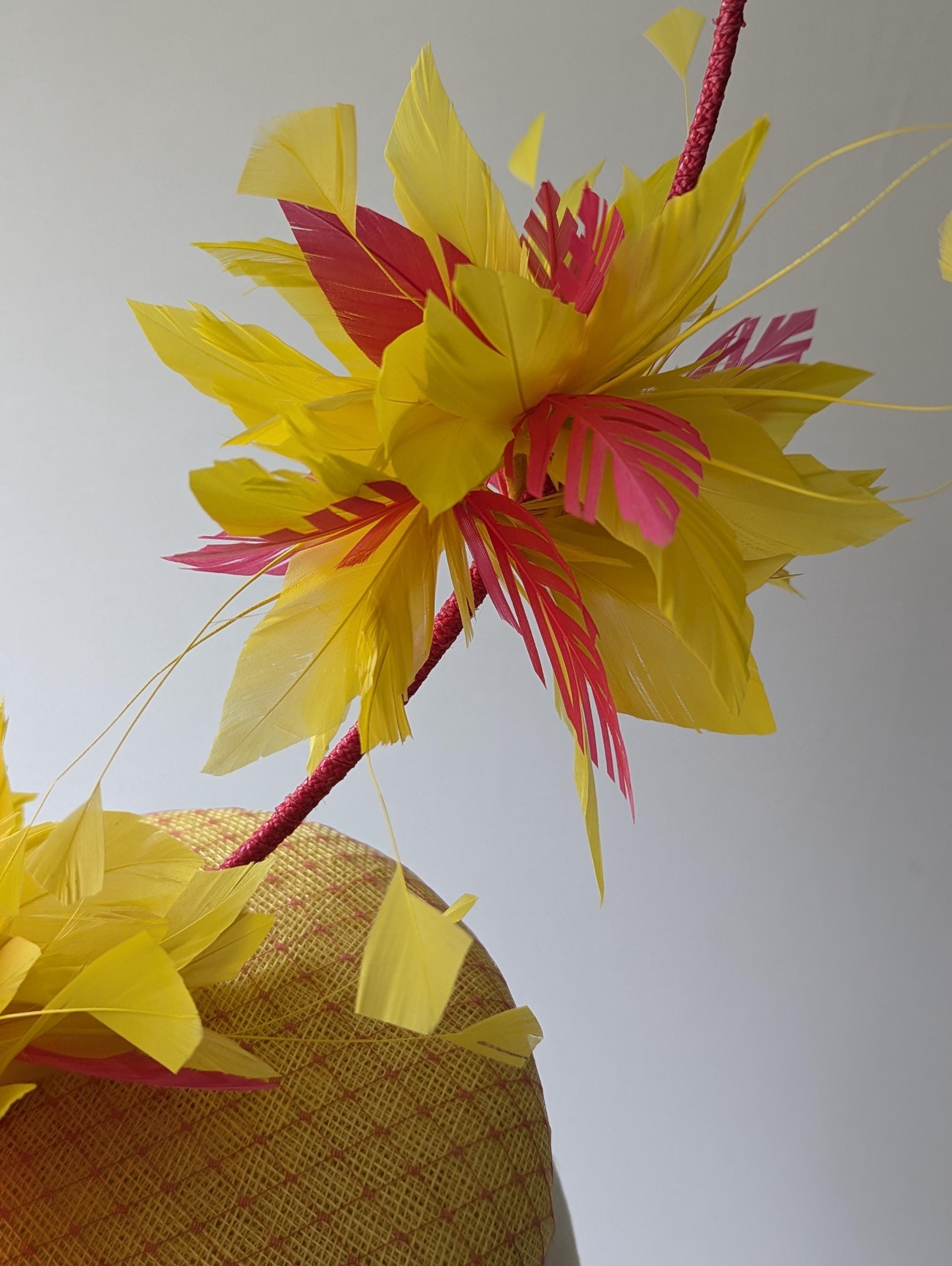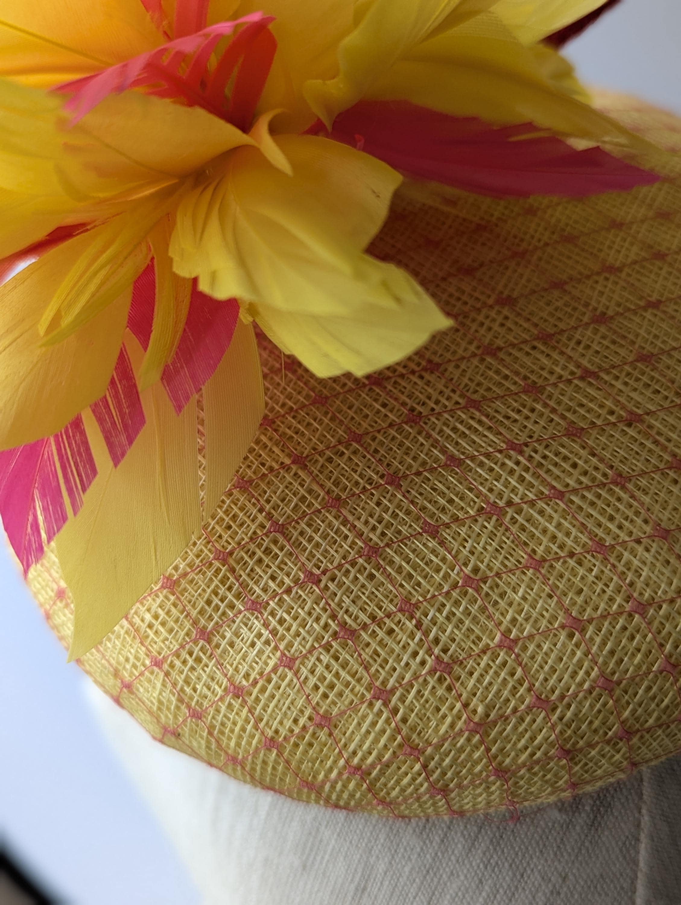 This showstopper cocktail hat is handblocked in a lovely yellow sinamay straw. It features lush feathers in a mix of yellow and pinks on a handwrapped quill in matching pink swiss straw. I also overlayed the base with a fine pink veiling to tie all of the colors together.