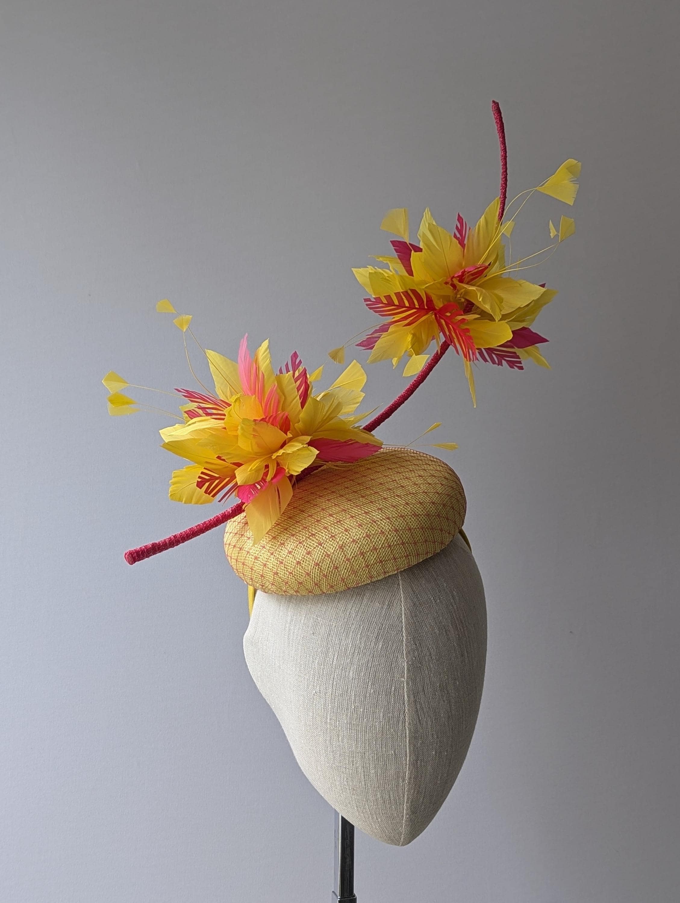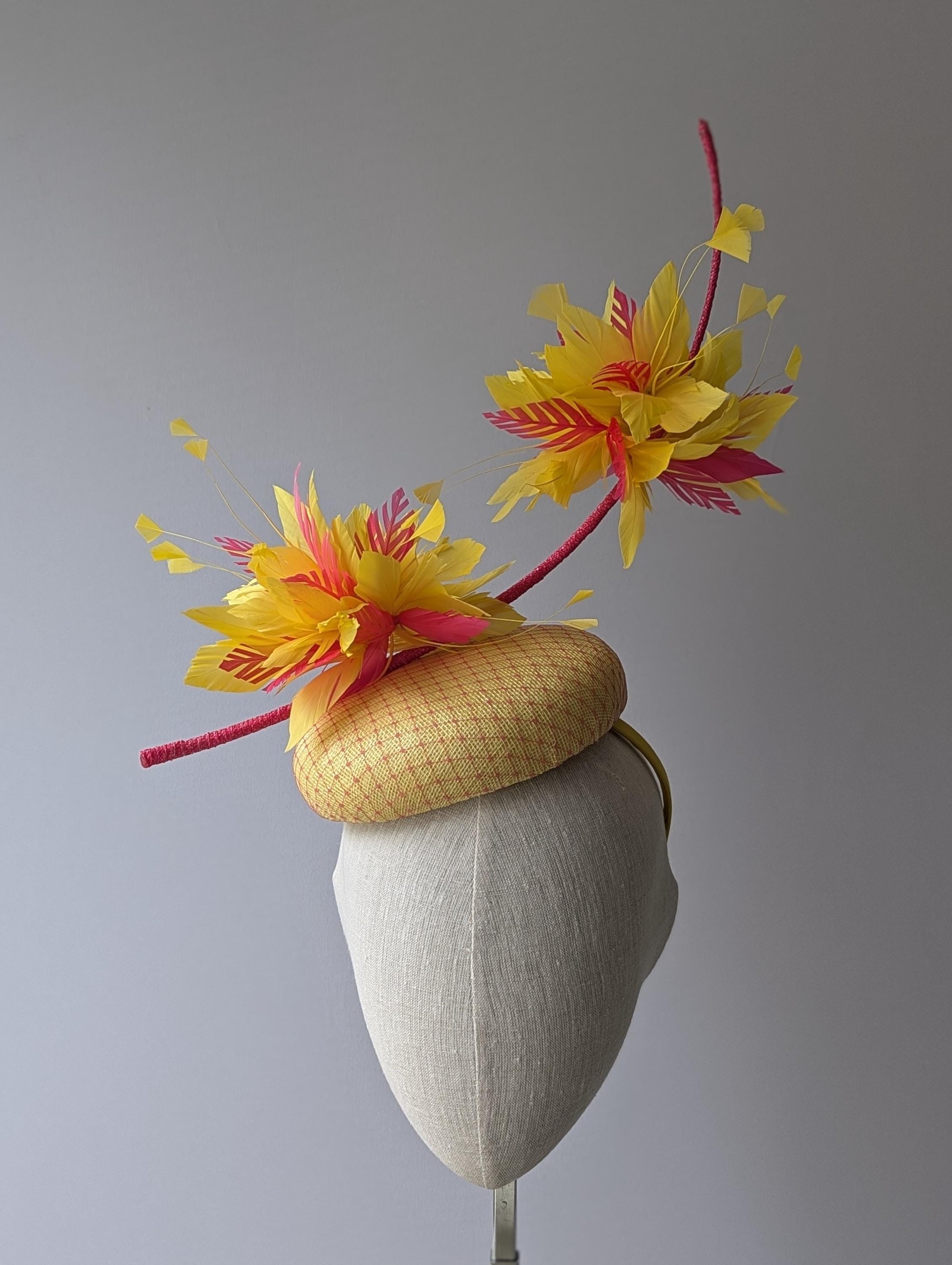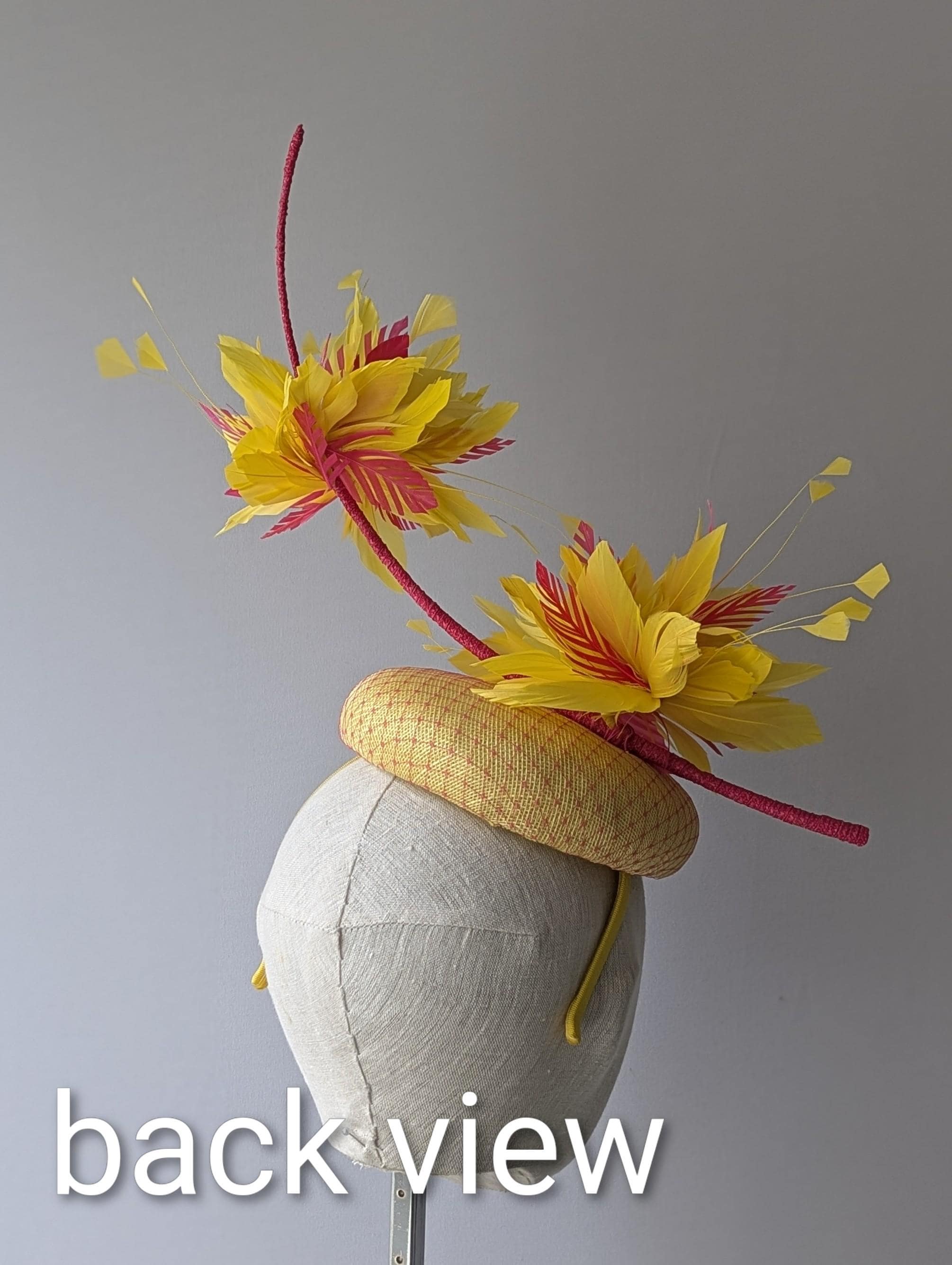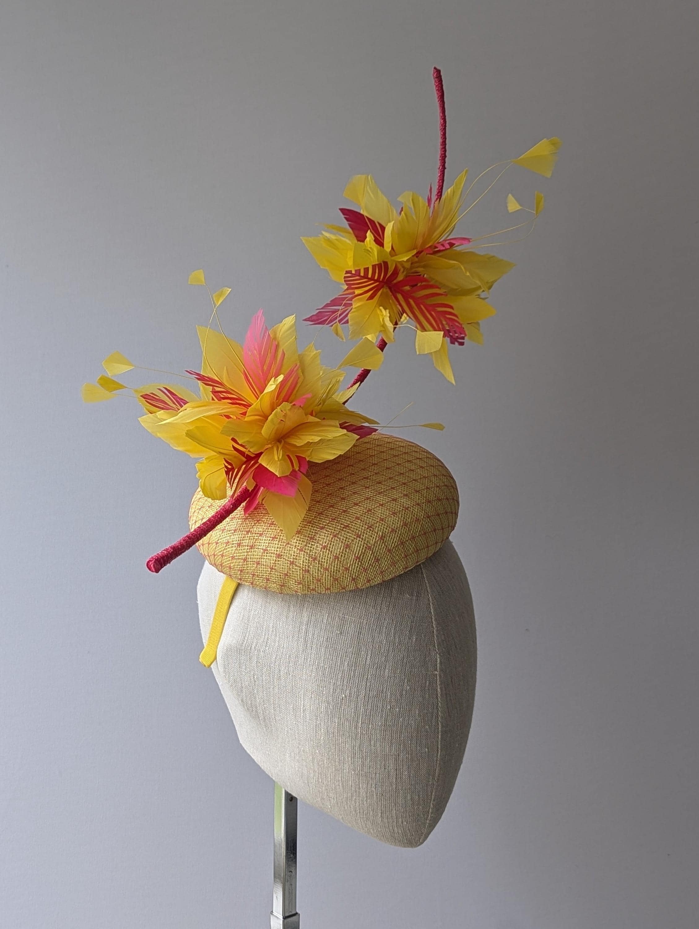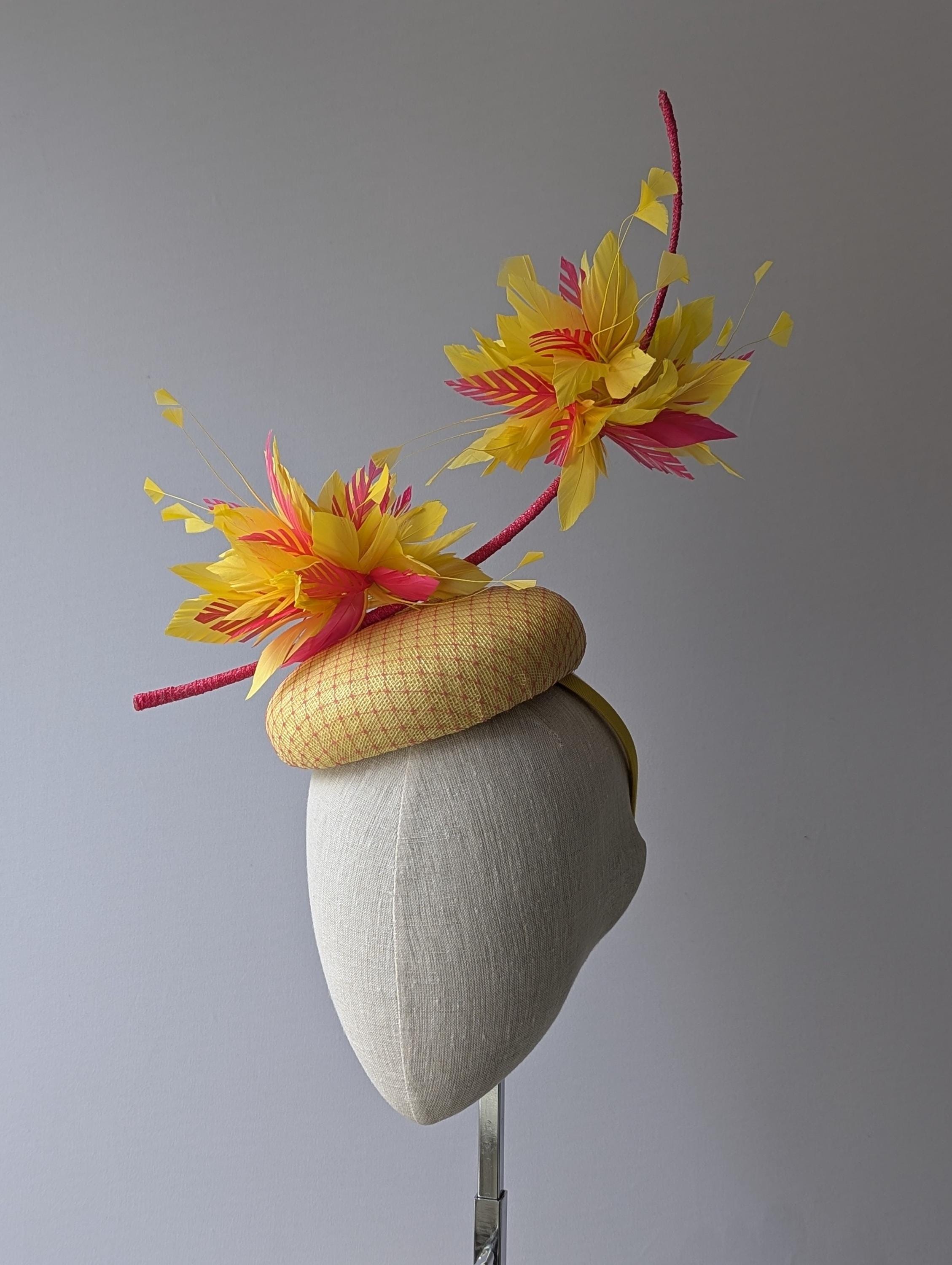 This showstopper cocktail hat is handblocked in a lovely yellow sinamay straw. It features lush feathers in a mix of yellow and pinks on a handwrapped quill in matching pink swiss straw. I also overlayed the base with a fine pink veiling to tie all of the colors together.
