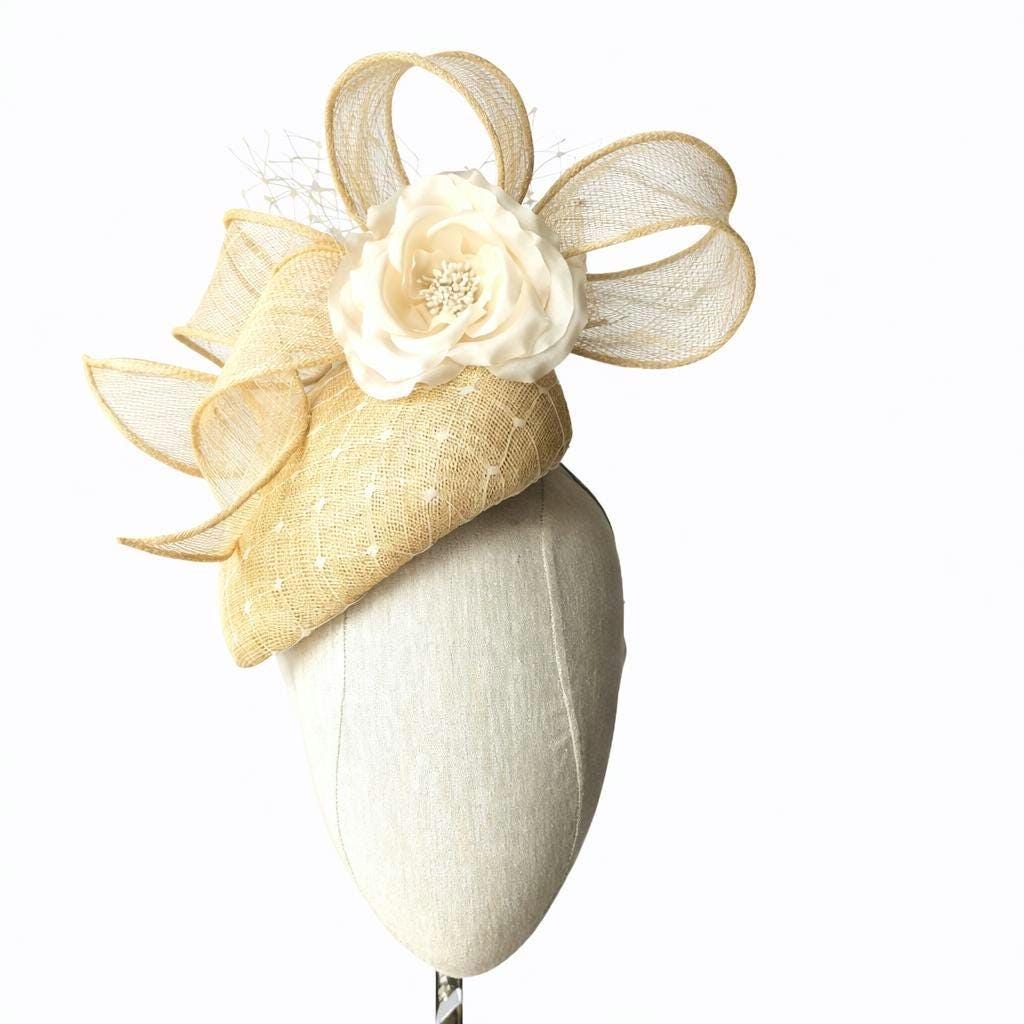 I hand blocked this elegant hat in natural color sinamay straw, its a lovely teardrop shape that hugs the head. It features a fabulous large bow design in the same straw with a rolled edge which adds a lot of drama. I overlayed the base with a vintage style veiling and added a lovely cream open rose, handmade in silk. Its finished off with a flurry of matching veiling for chic look.