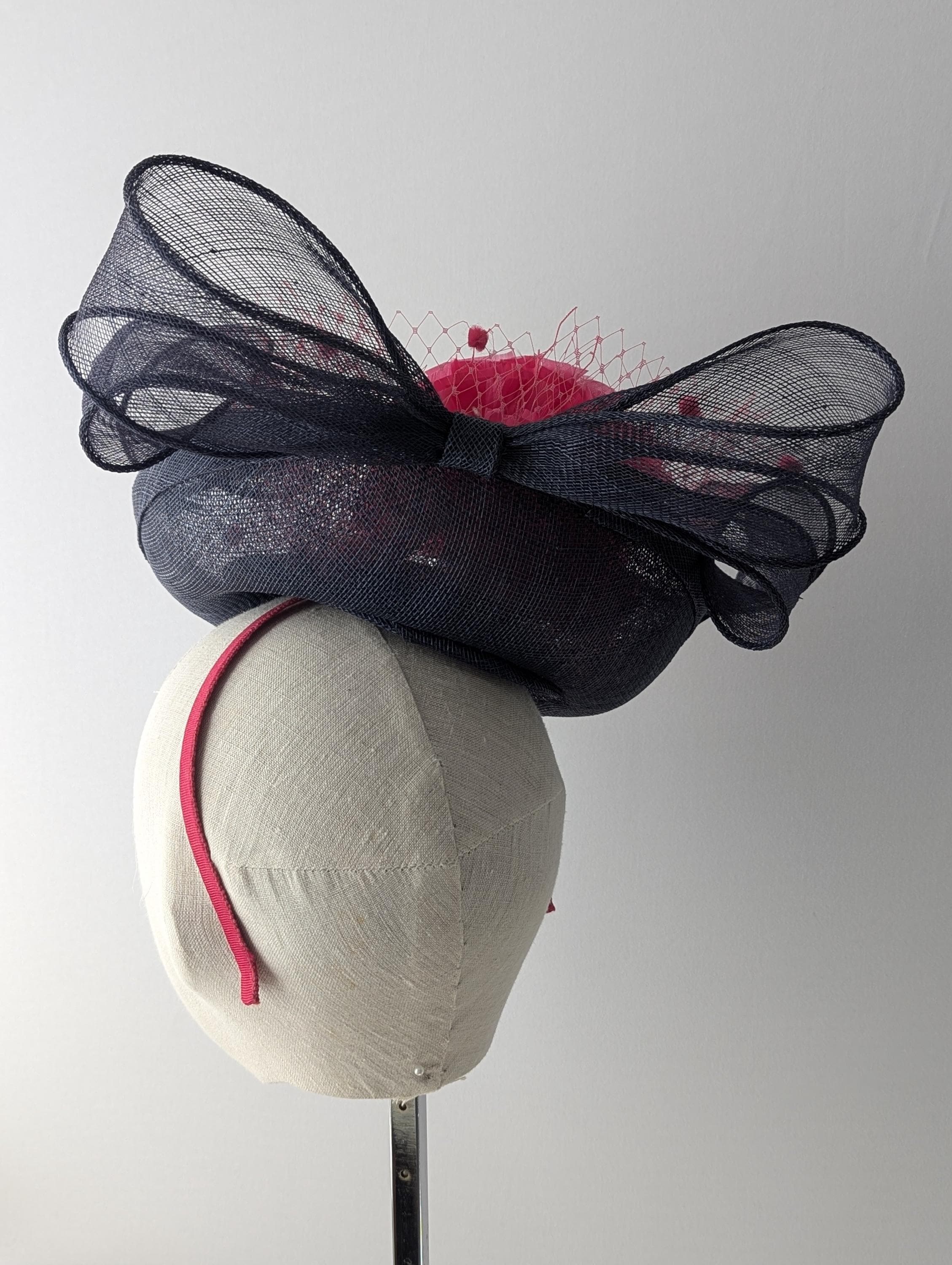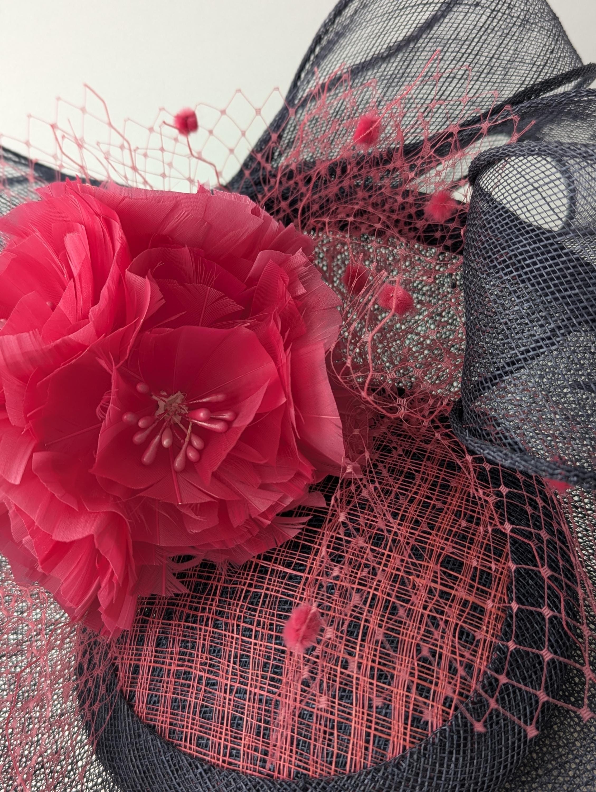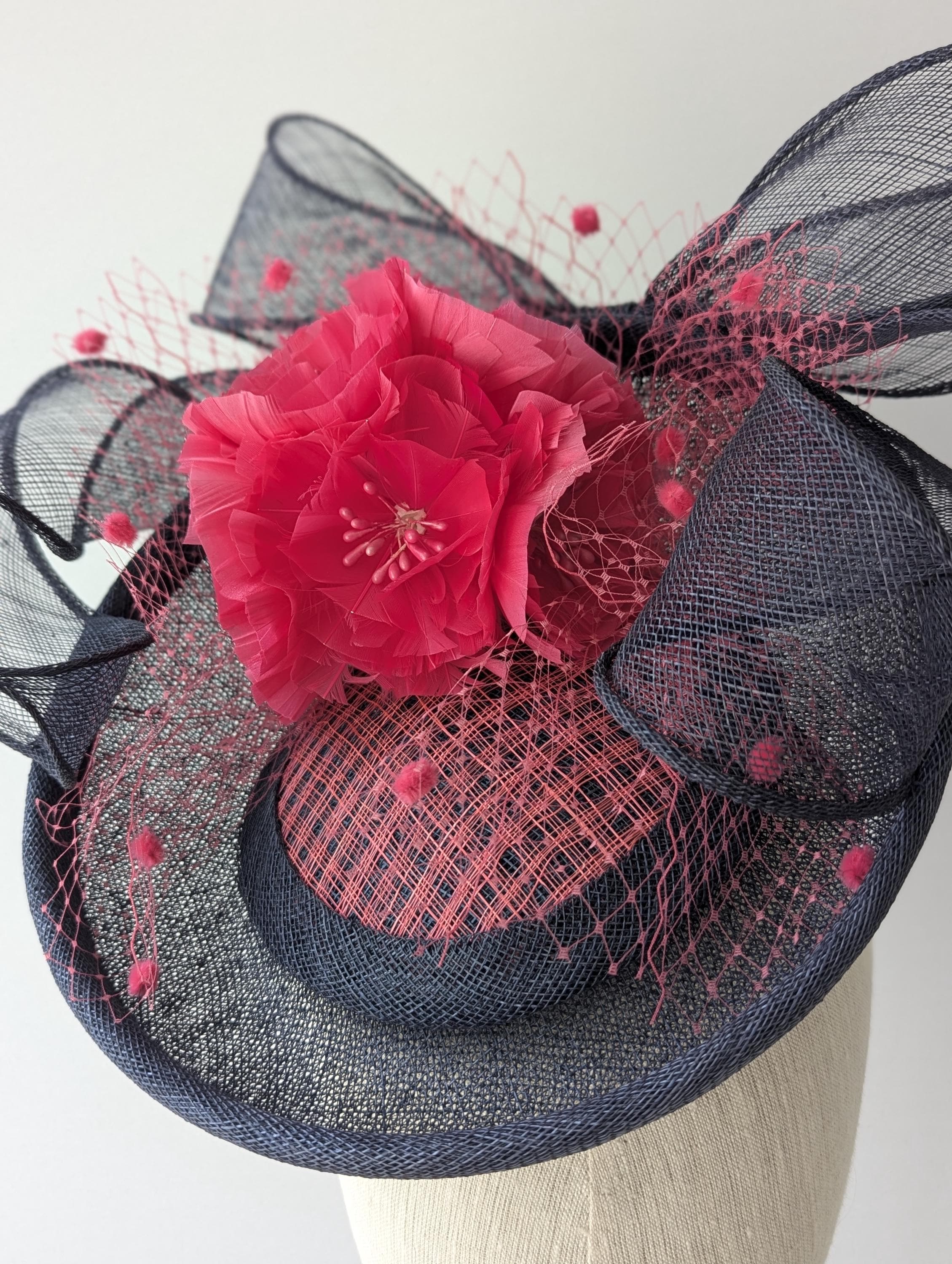 I hand blocked this elegant hat in a navy sinamay straw. I added a lovely full feather flower ball and a large matching swirly navy bow, also in sinamay straw. I highlighted the center of the hat with pink 'windowpane' straw and bound the panel in more matching navy sinamay straw. Flirty pink veiling with chenille dots gives this hat a showstopping look.