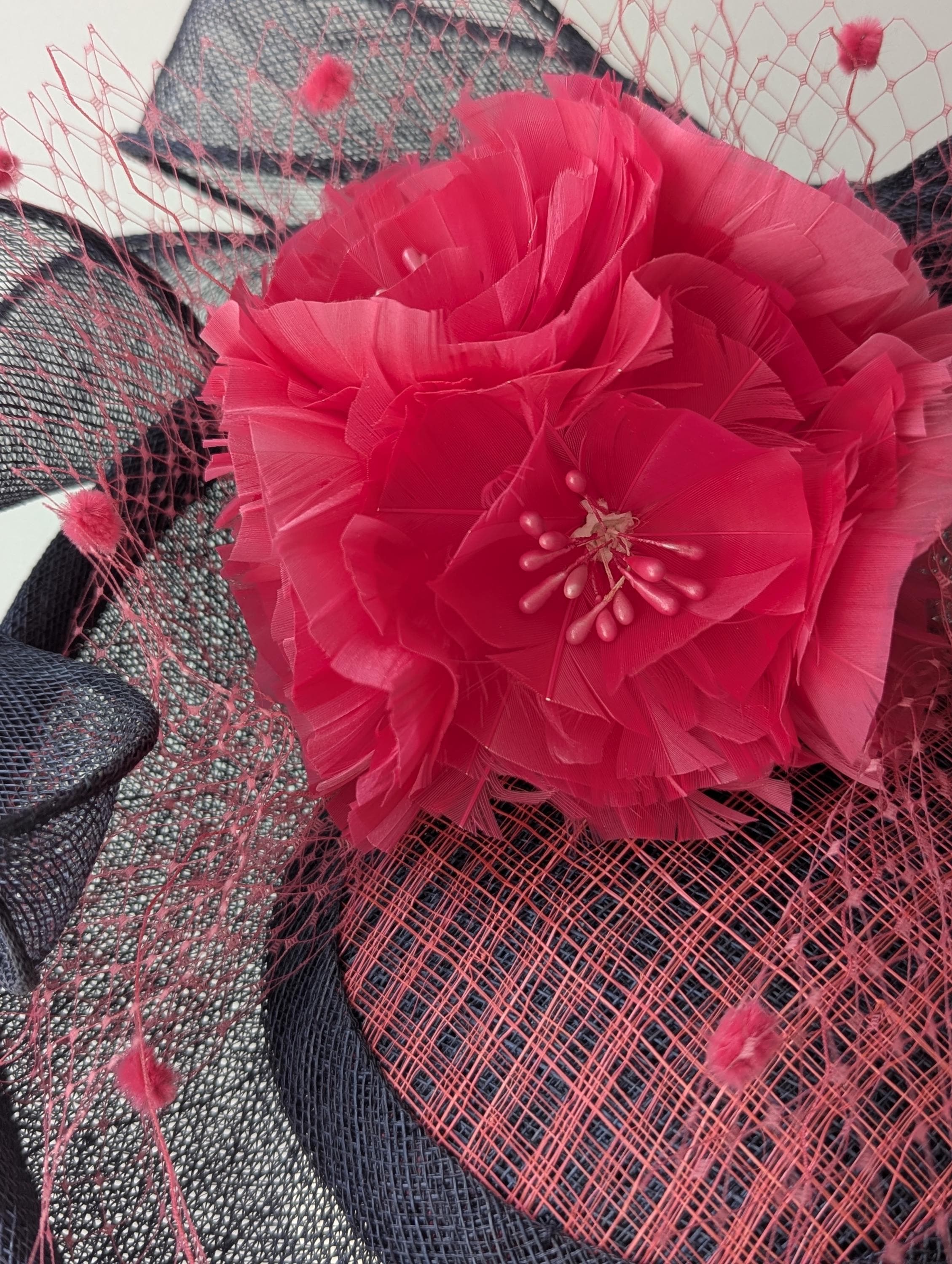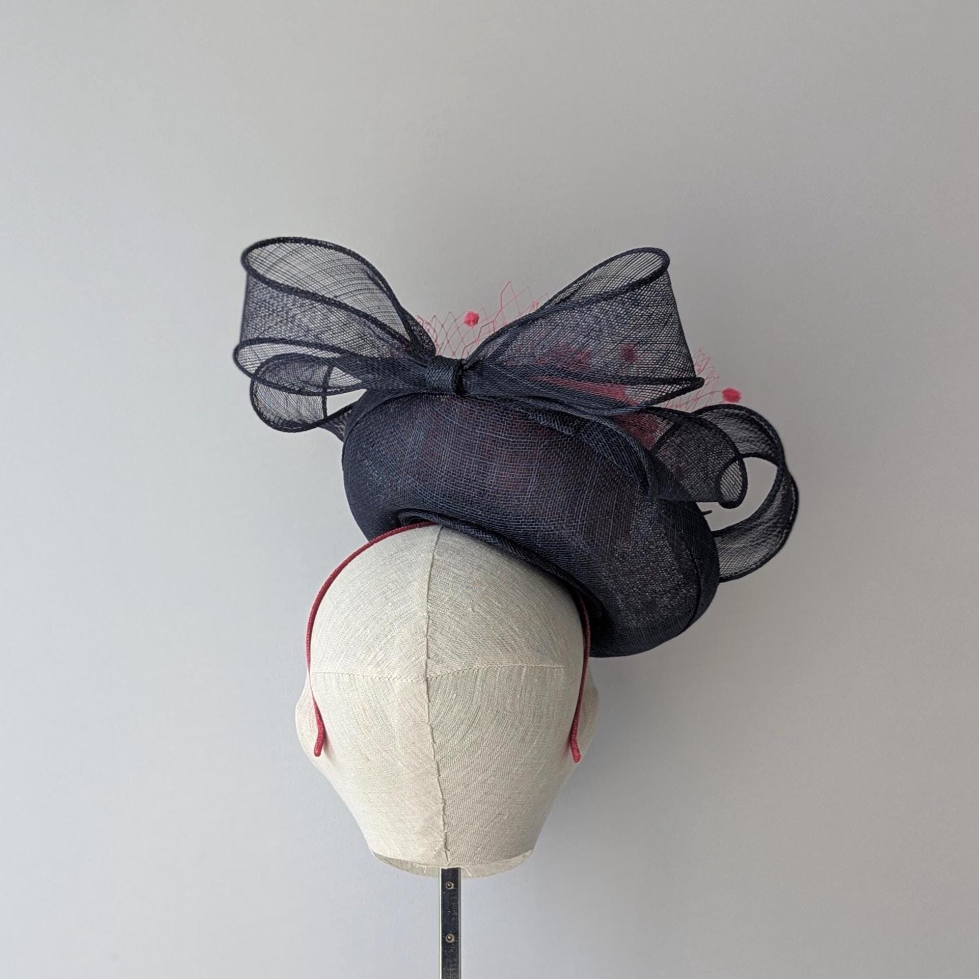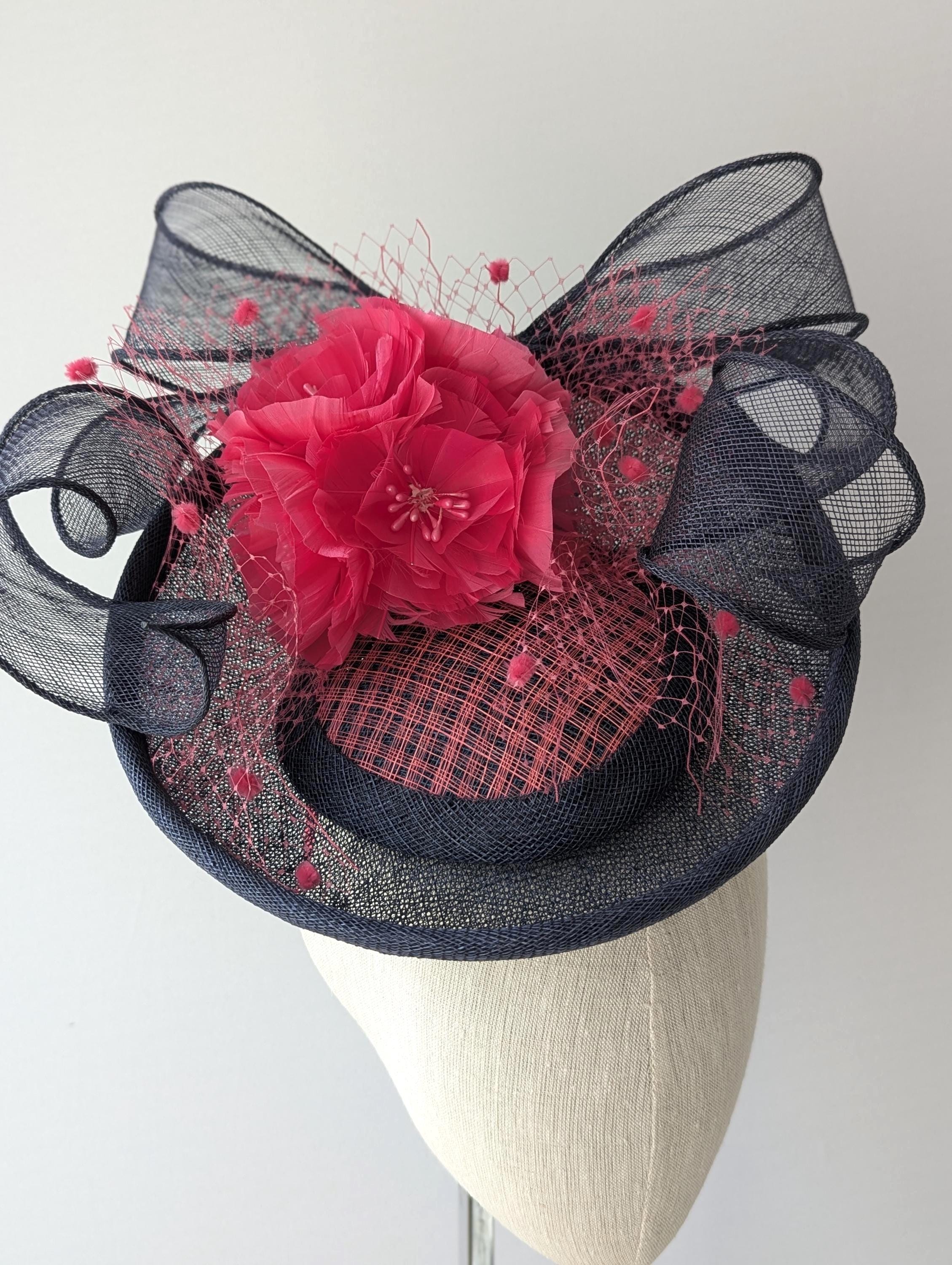I hand blocked this elegant hat in a navy sinamay straw. I added a lovely full feather flower ball and a large matching swirly navy bow, also in sinamay straw. I highlighted the center of the hat with pink 'windowpane' straw and bound the panel in more matching navy sinamay straw. Flirty pink veiling with chenille dots gives this hat a showstopping look.