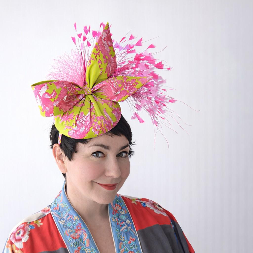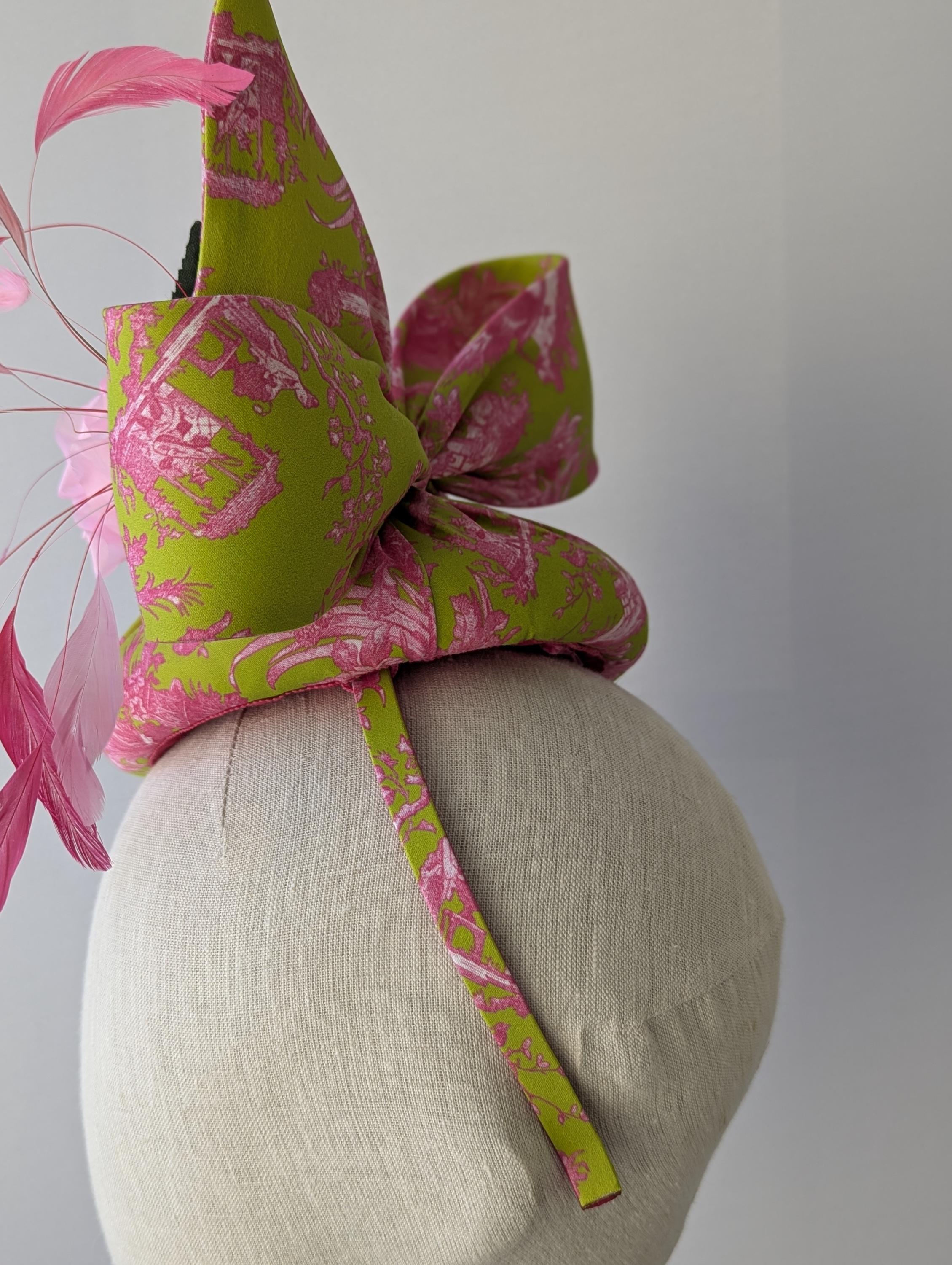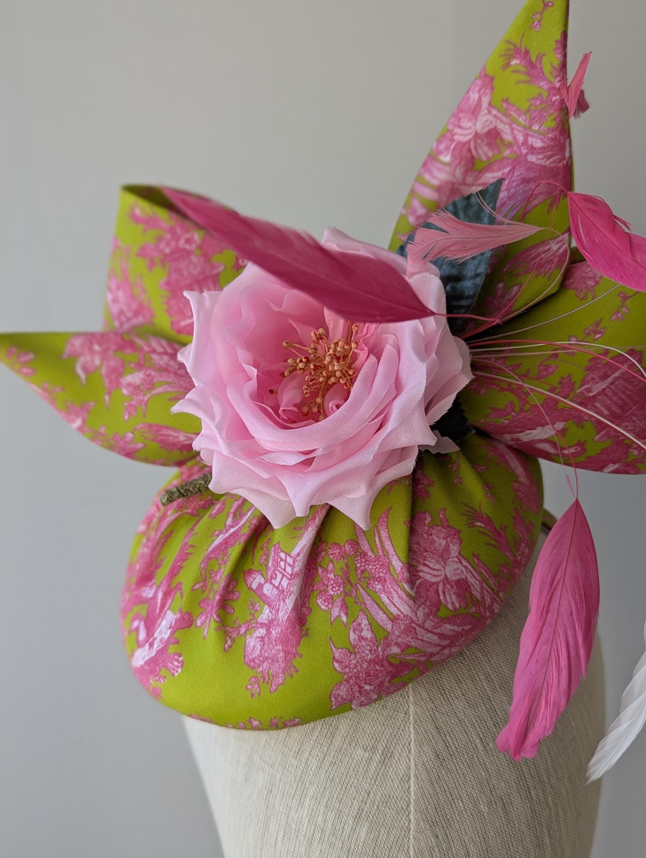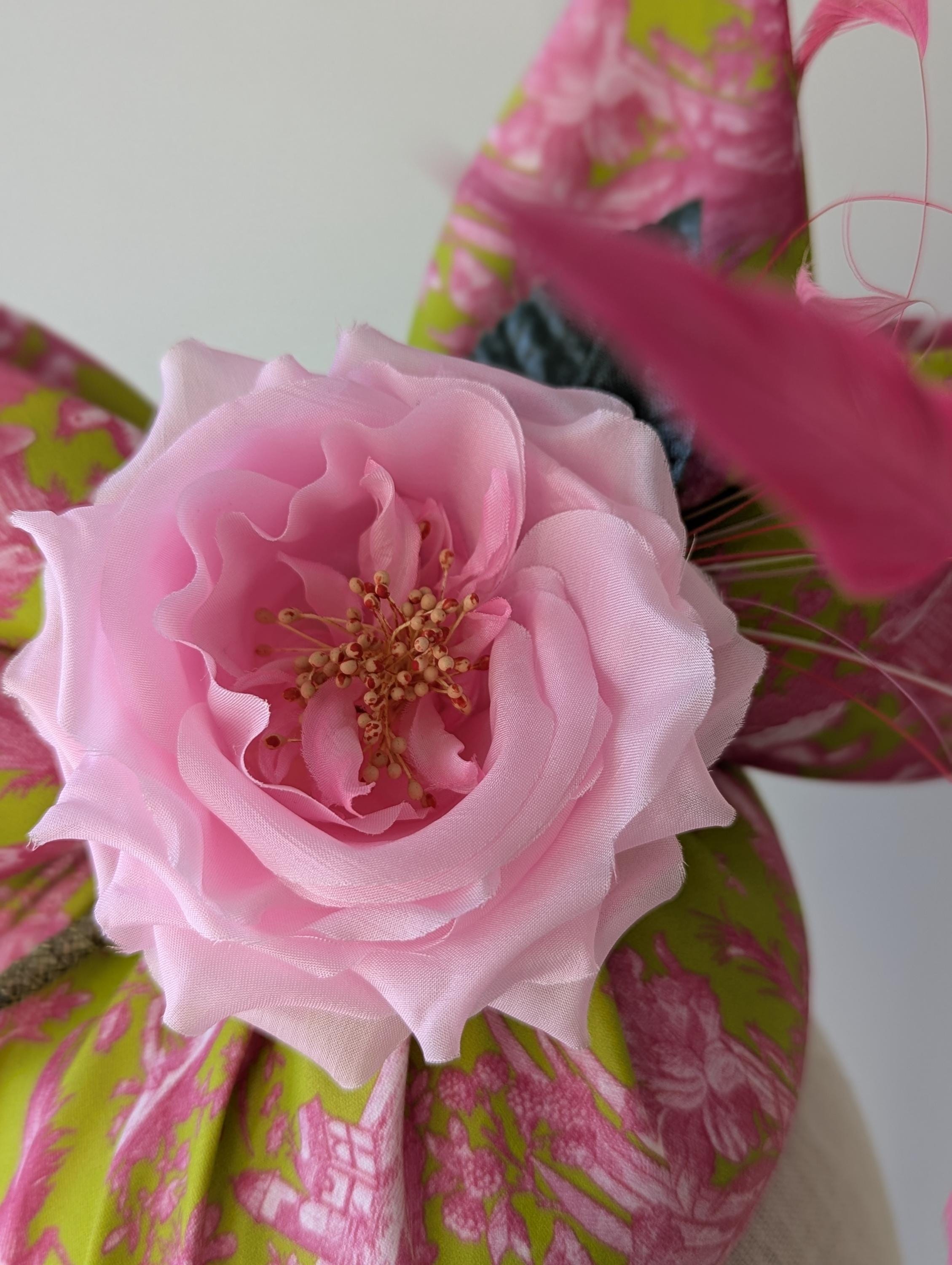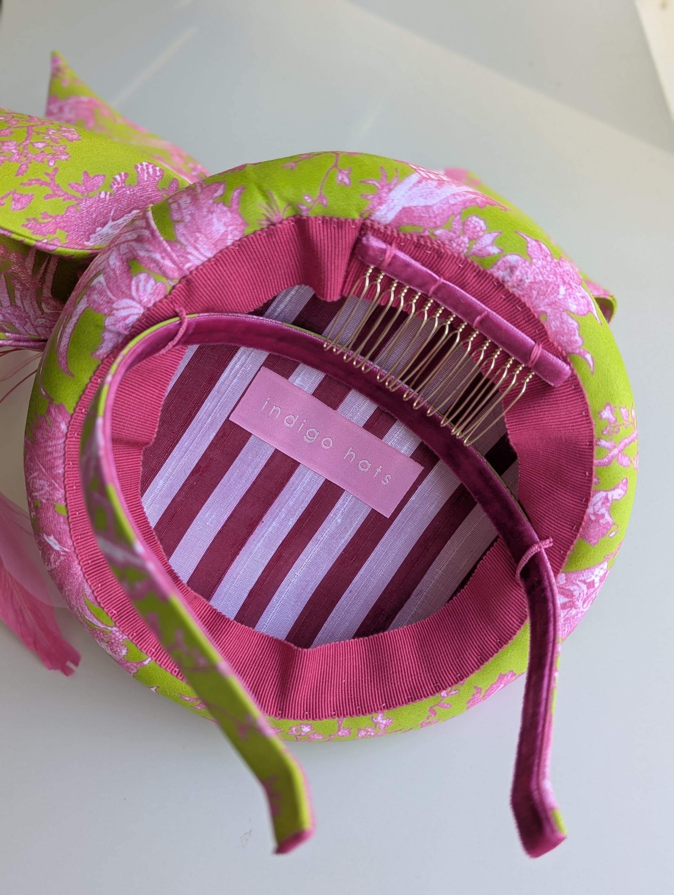 I made this charming hat is in a lovely pink and green toile print in organic fabric, made the bow in the same fabric to tie in to these exciting matching feathers! I also added a little pink veiling flurry around the back - I love my extra veiling touches!