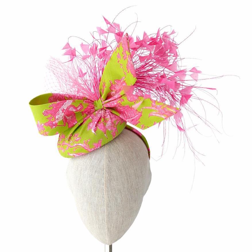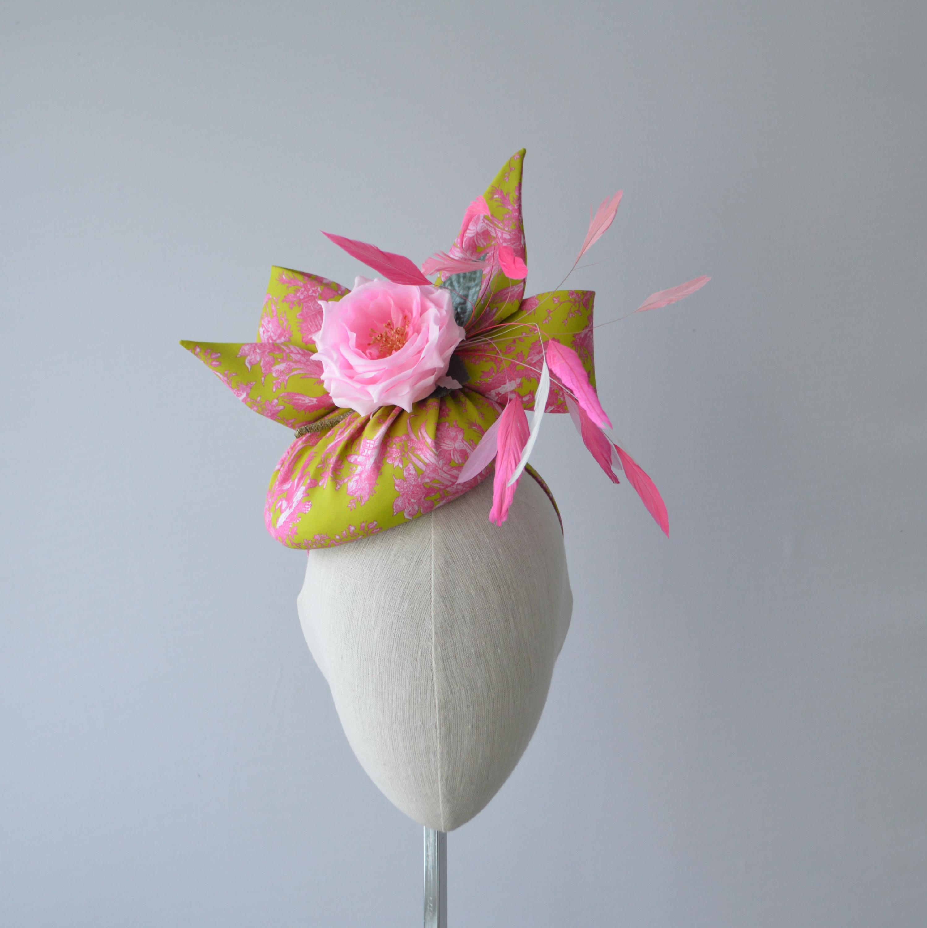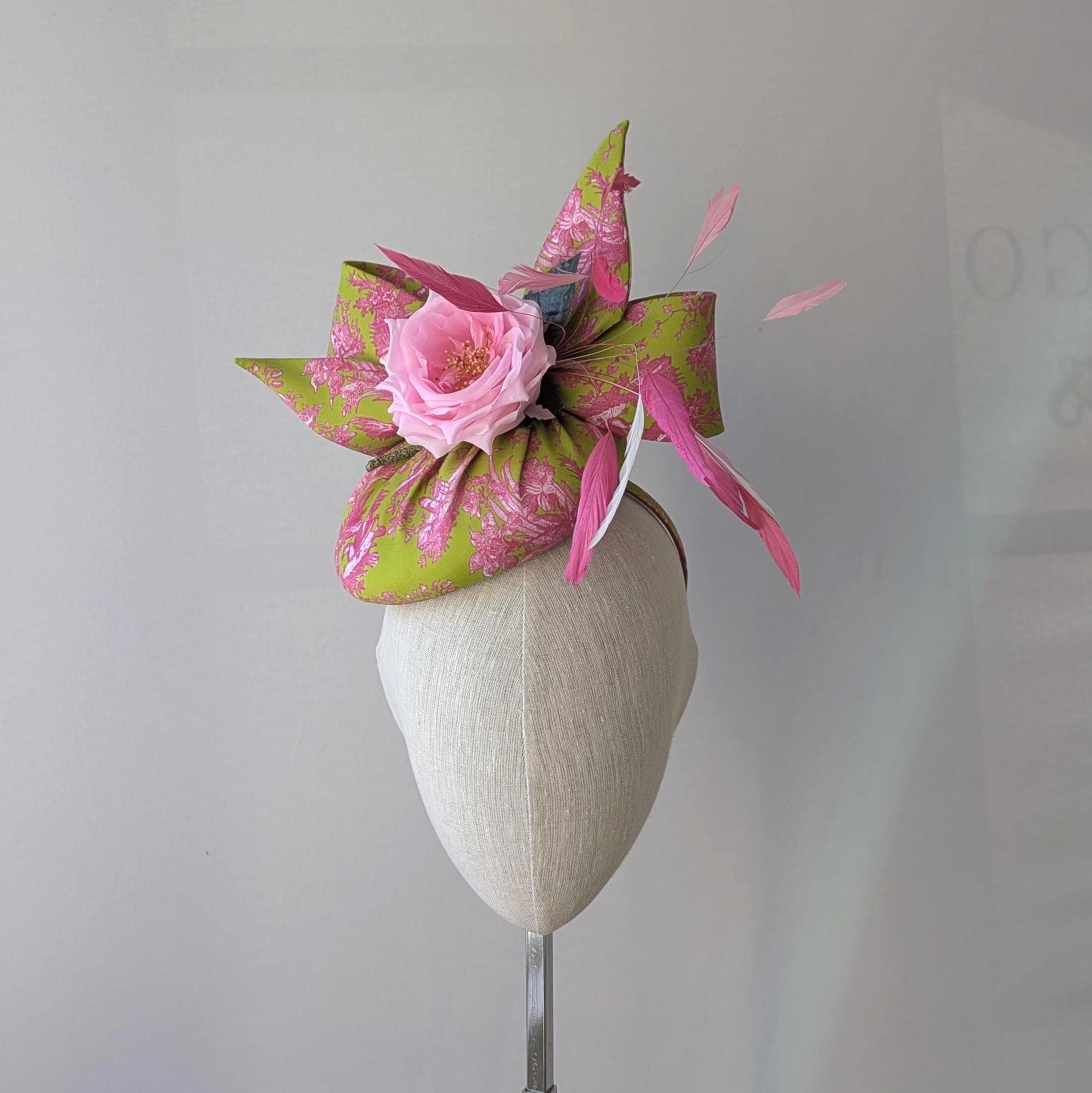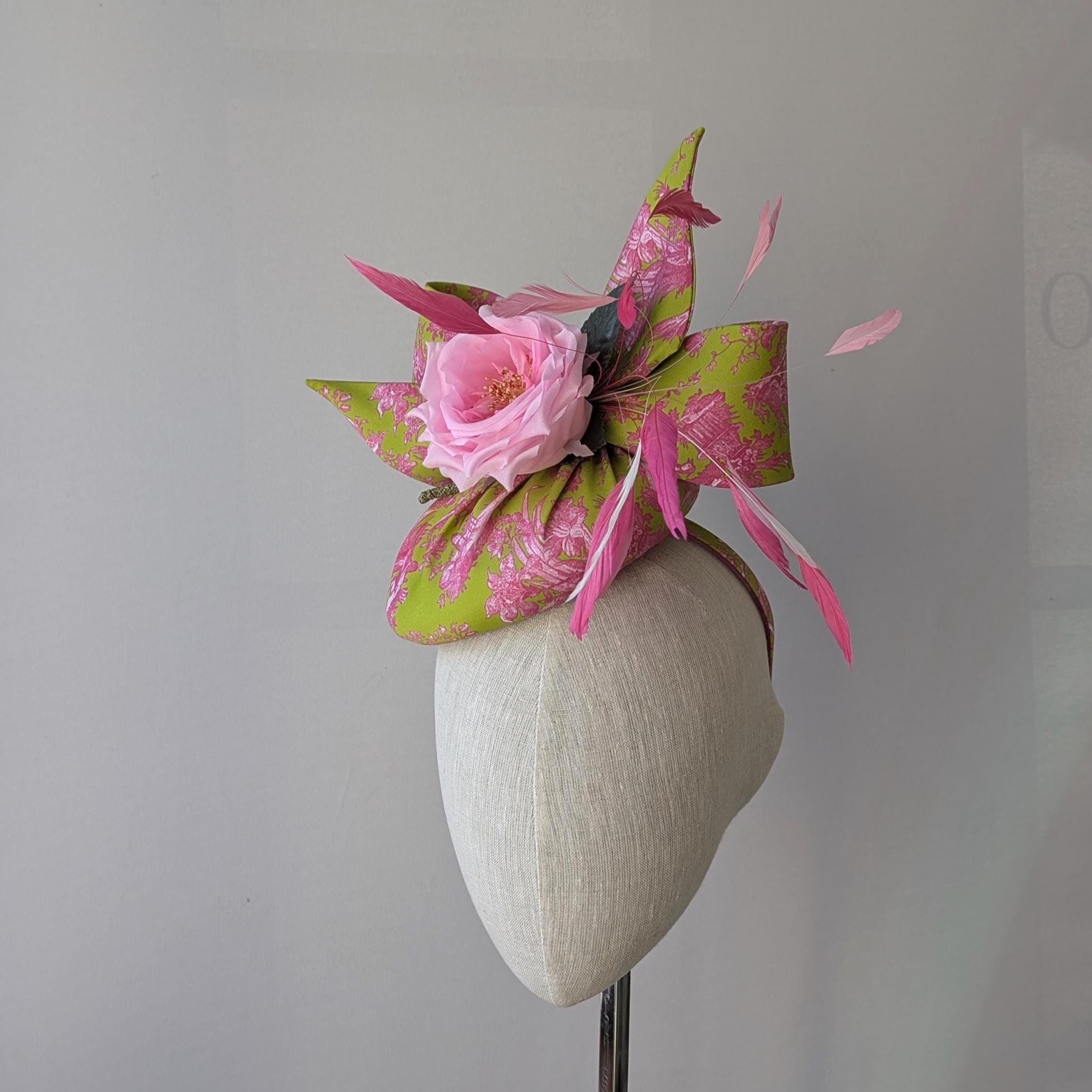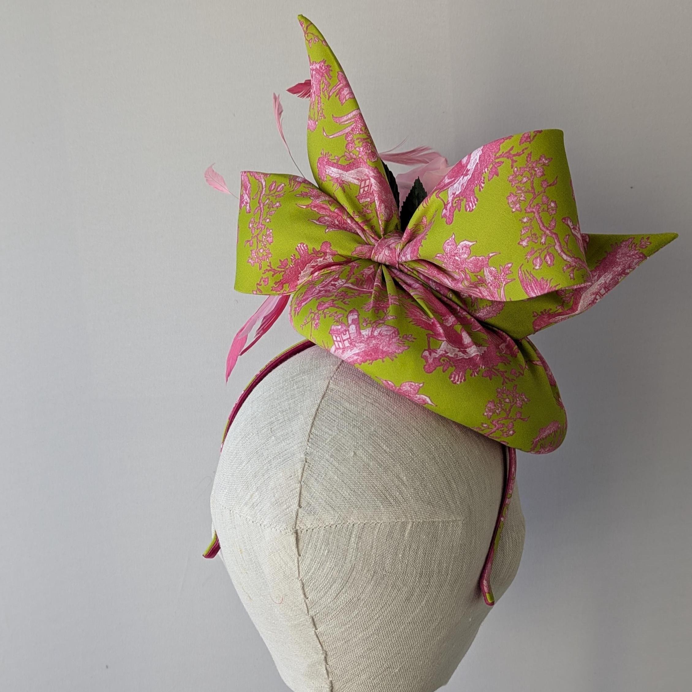 I made this charming hat is in a lovely pink and green toile print in organic fabric, made the bow in the same fabric to tie in to these exciting matching feathers! I also added a little pink veiling flurry around the back - I love my extra veiling touches!