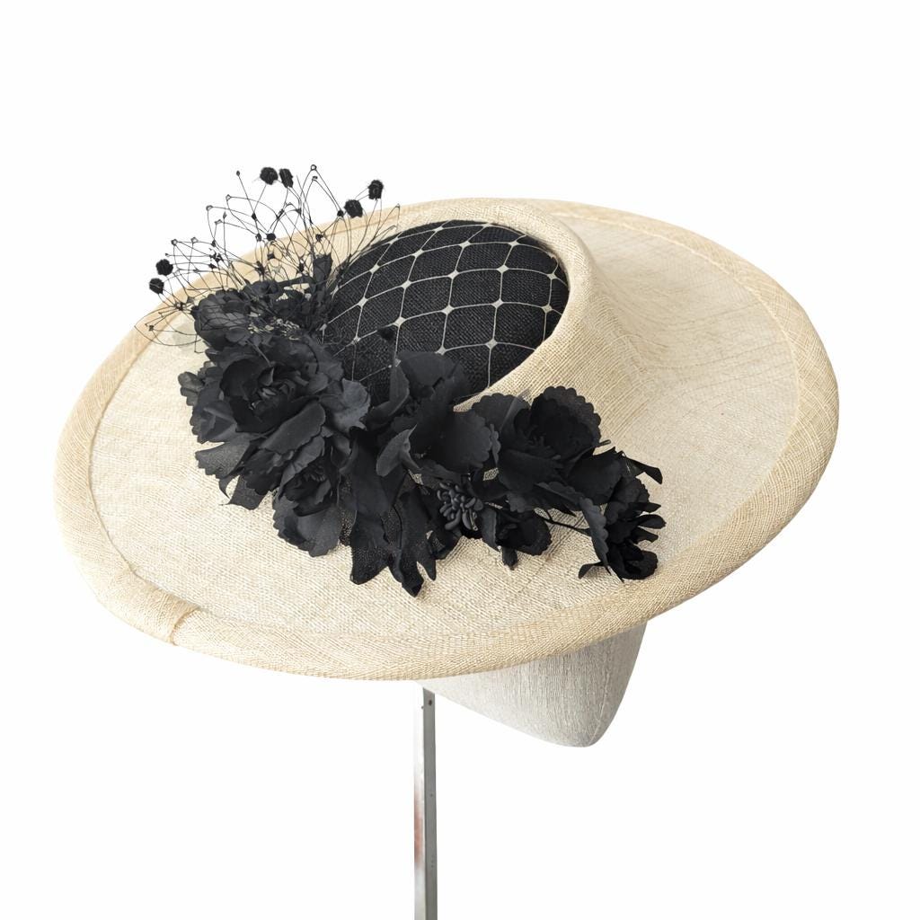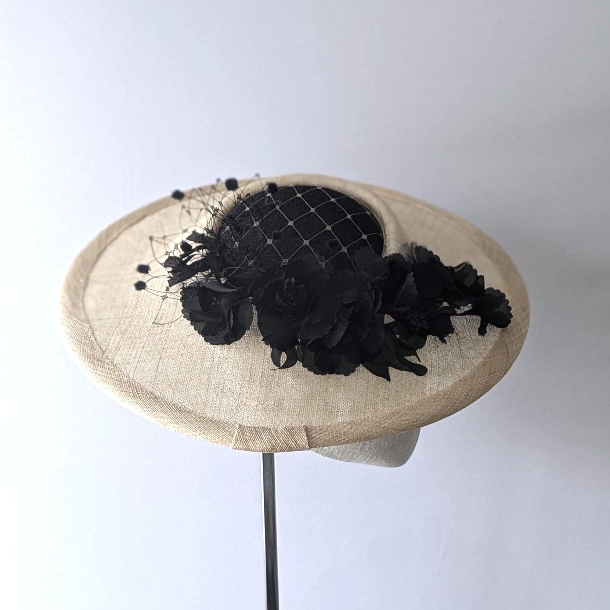 This is a fabulous new hat block shape for this year, I made the main brim of the hat in a natural sinamay straw, bound in the same. To give contrast I made the center of the hat in a black straw and added a beige veiling to match the brim. The finishing touch are these beautiful black silk flowers and a flirty pouf of black veiling.