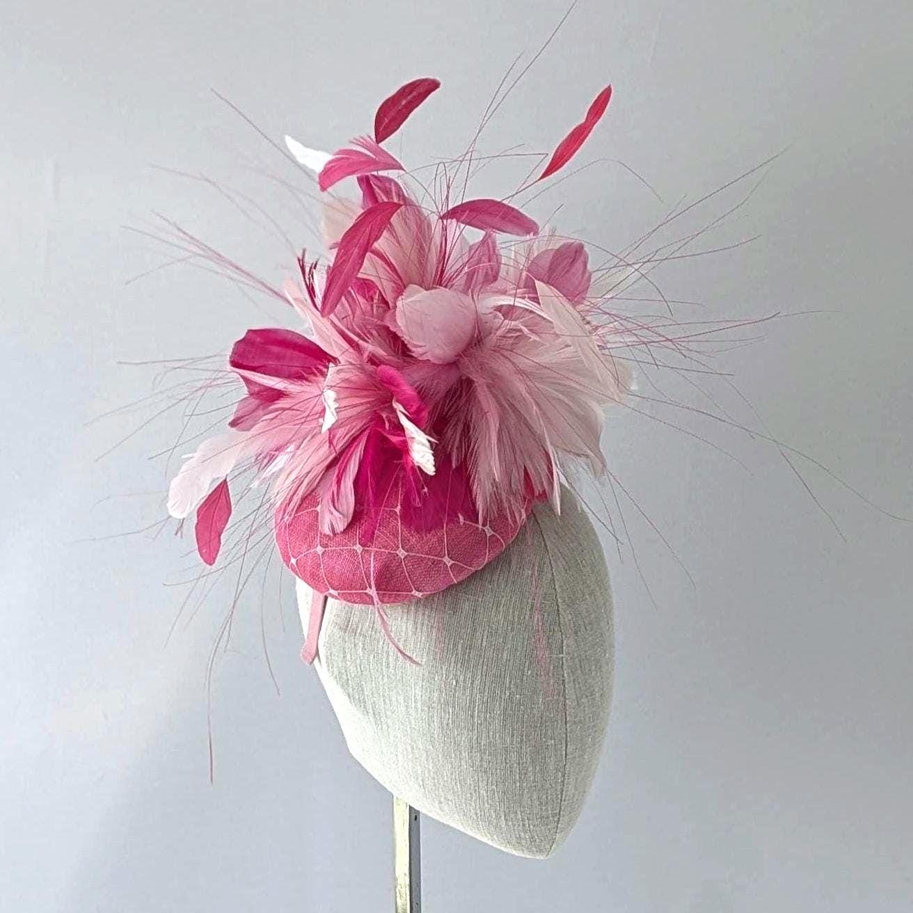 This showstopper cocktail hat is handblocked in a lovely pink pinokpok straw. It features lush feathers in shades of pink and white along with peacock hurl and stripped coque feathers that add beautiful movement to this headpiece. I also overlayed the base with a white veiling to tie all of the colors together.