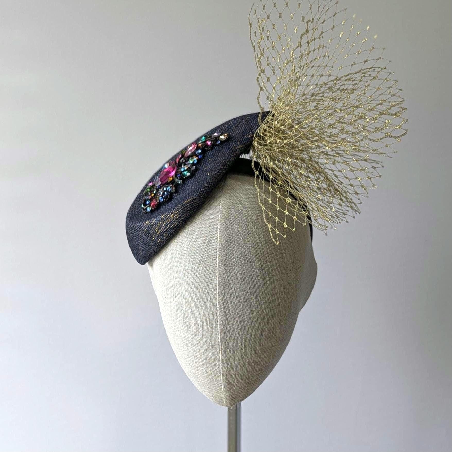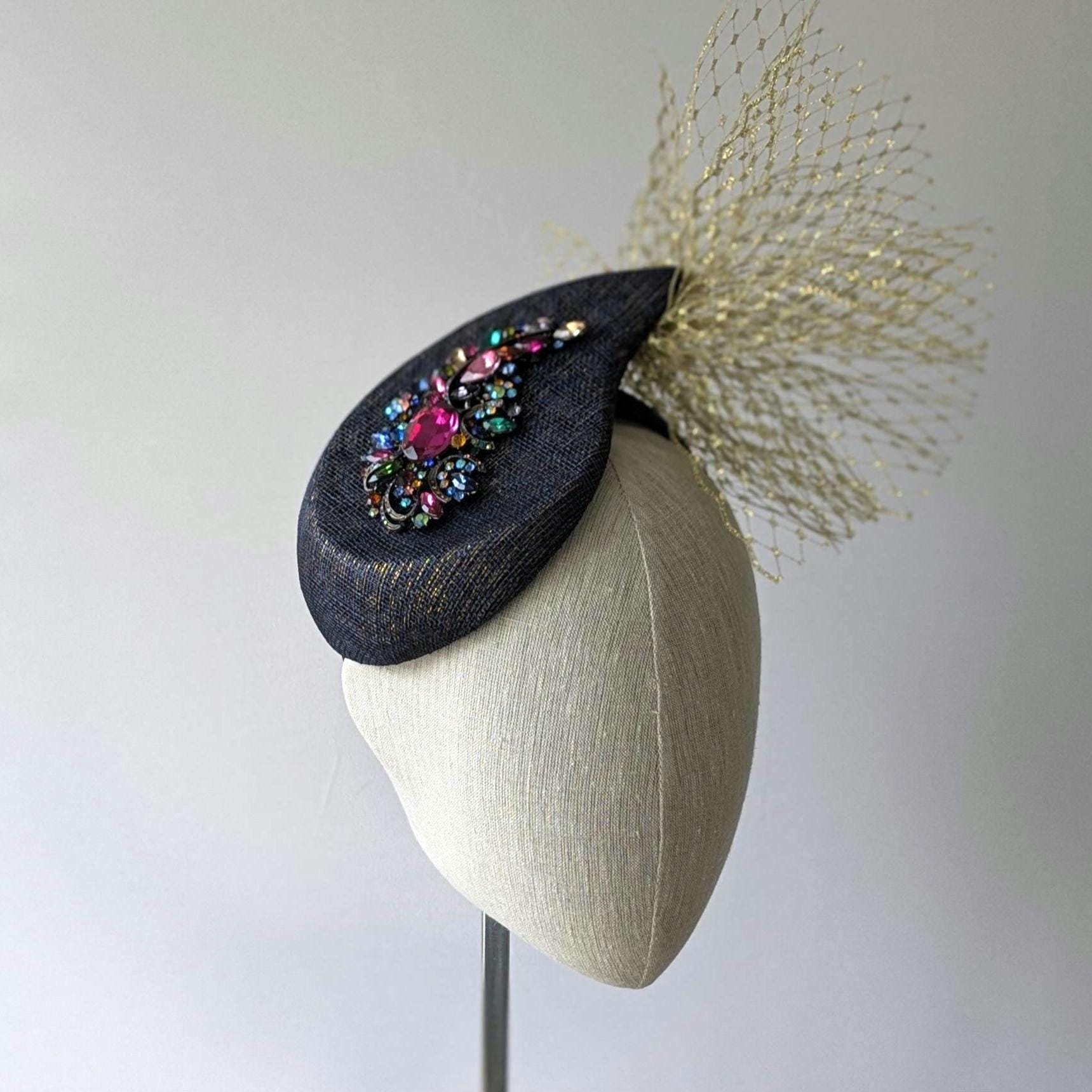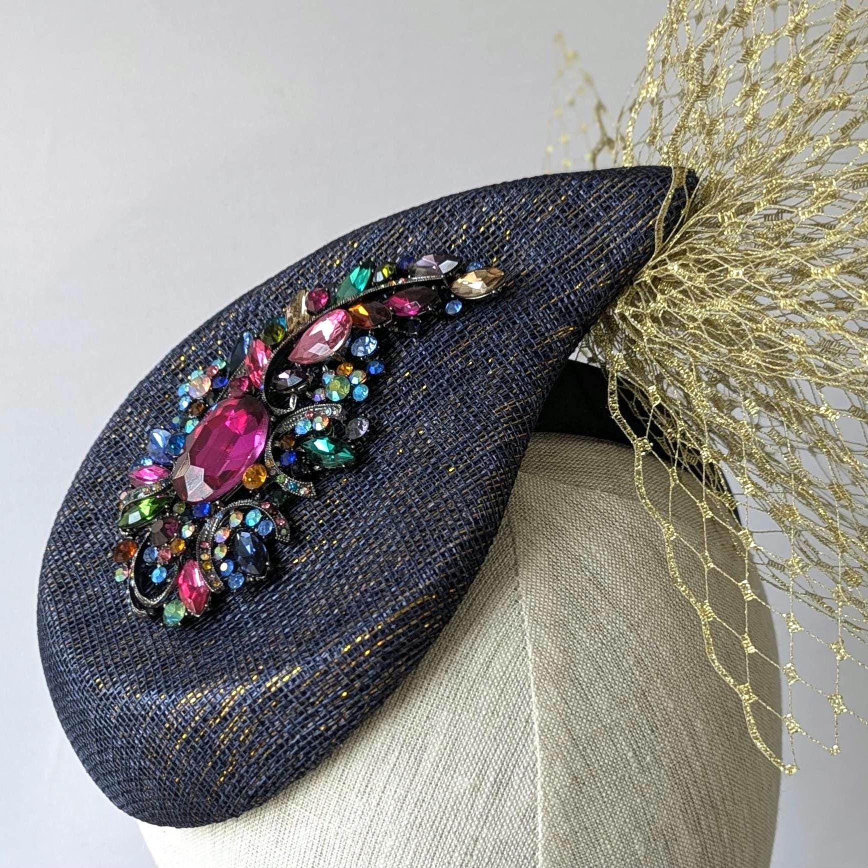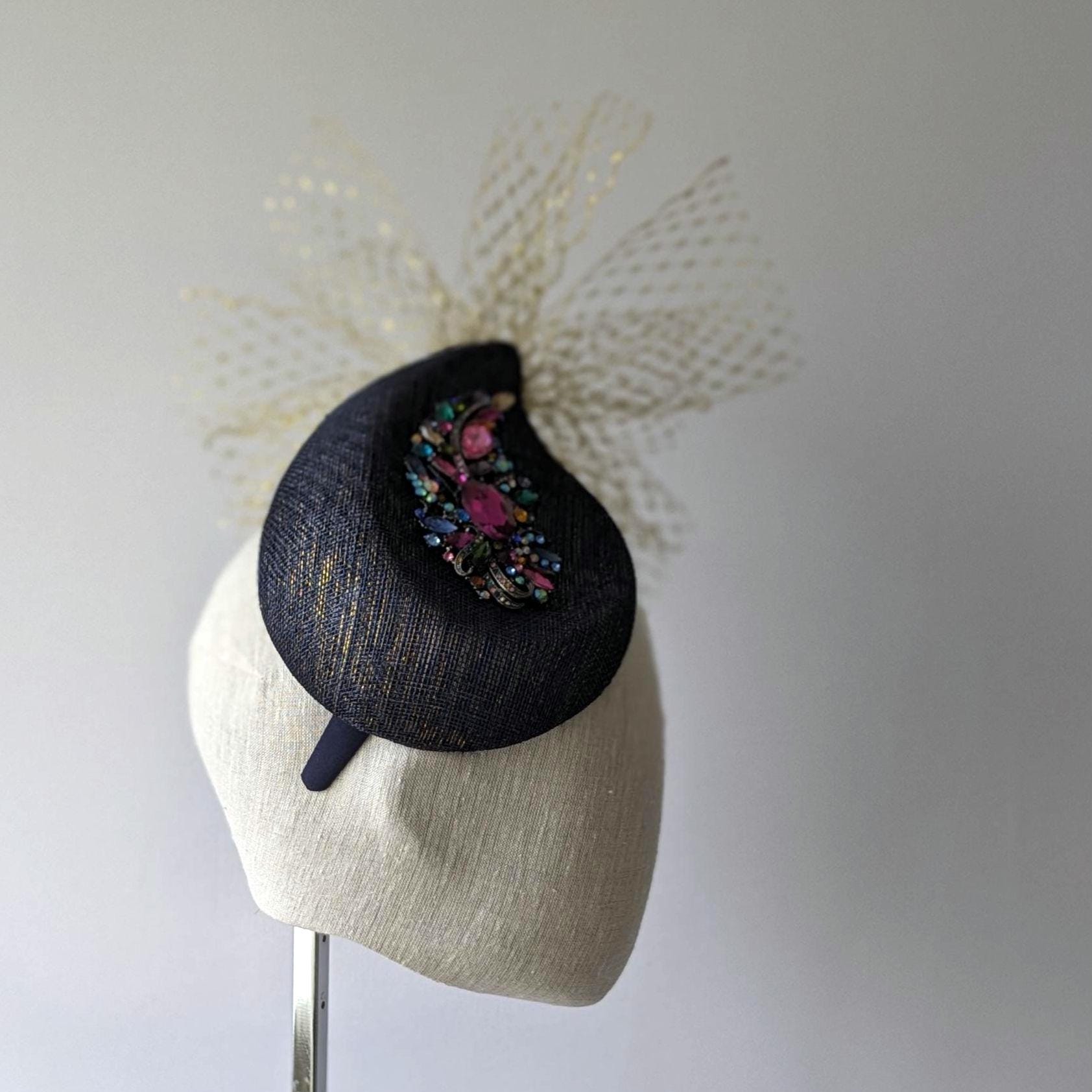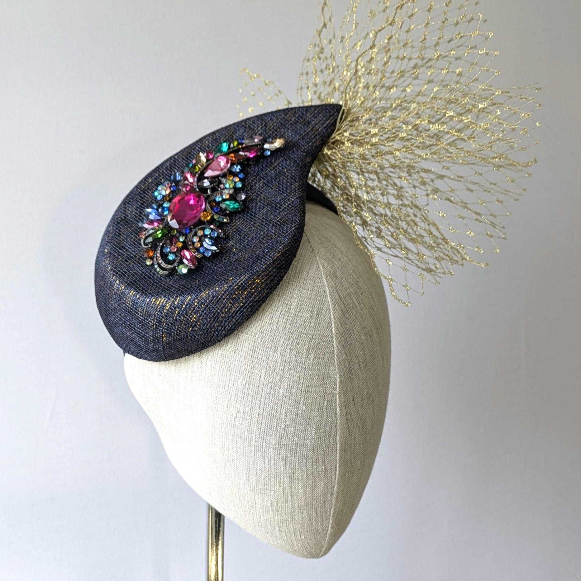 I hand blocked (steamed and stretched and pinned straw around a wooden shape) in a lovely new curvaceous paisley shape, a navy with a subtle gold sinamay straw, a new shape from Australia. After blocking I added a fabulous acrylic rhinestone embellishment with lots of different colors. An exciting flurry of gold veiling gives it a dramatic finishing touch.