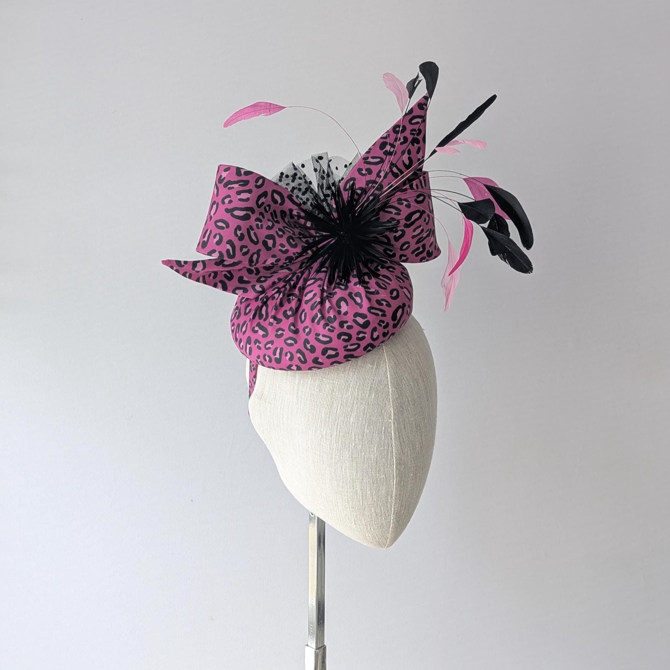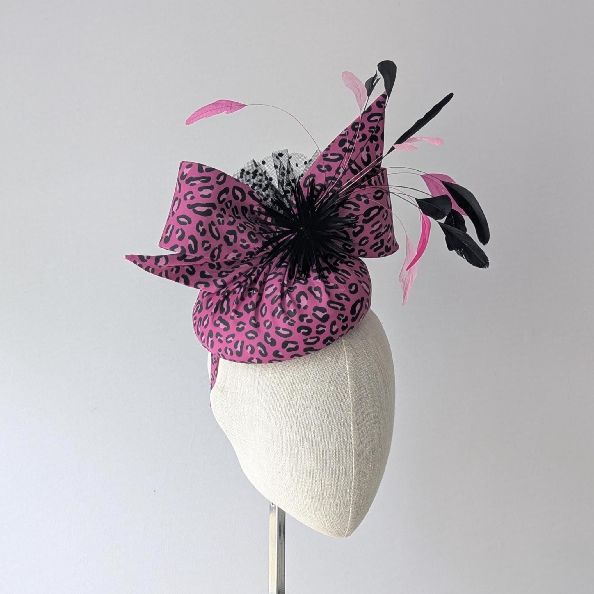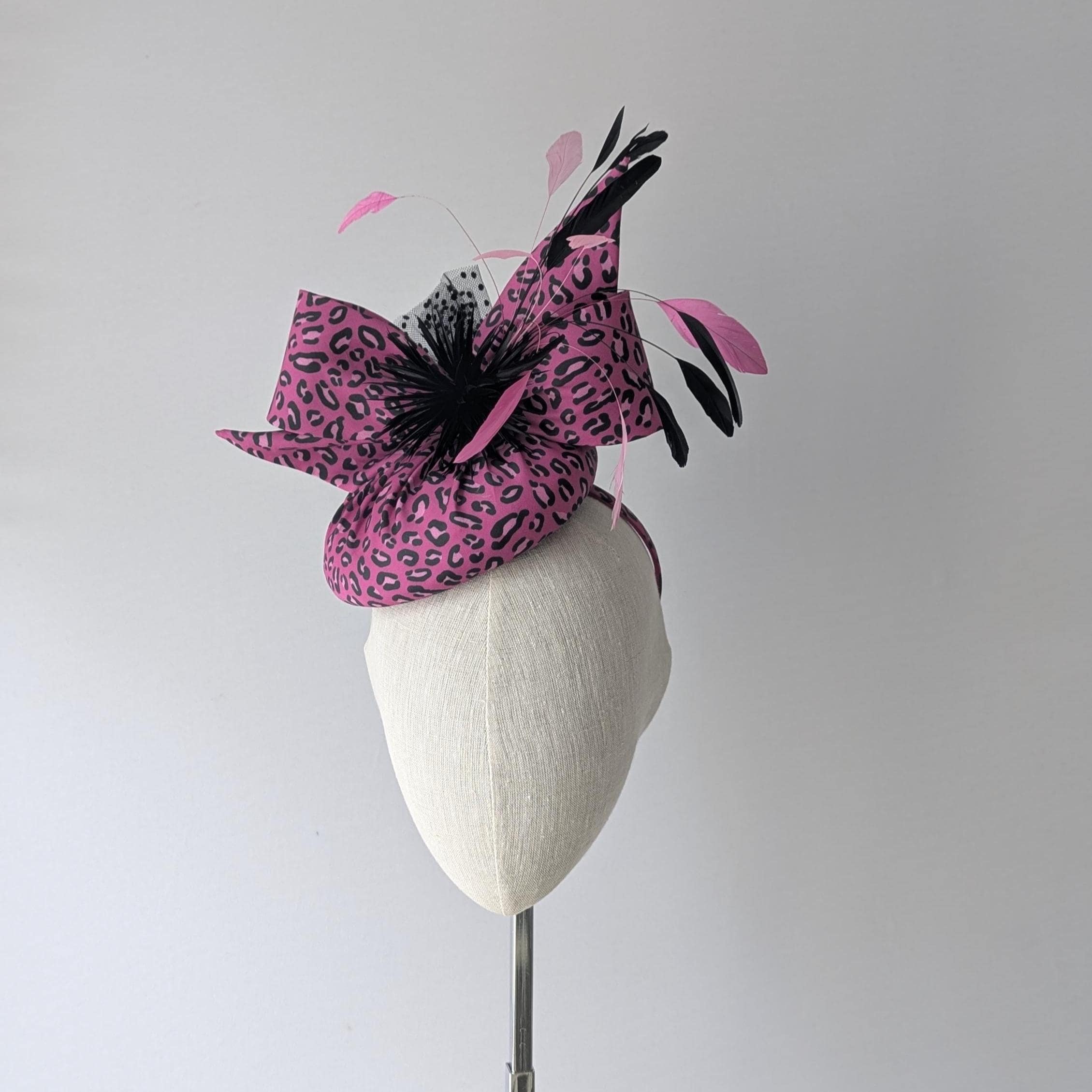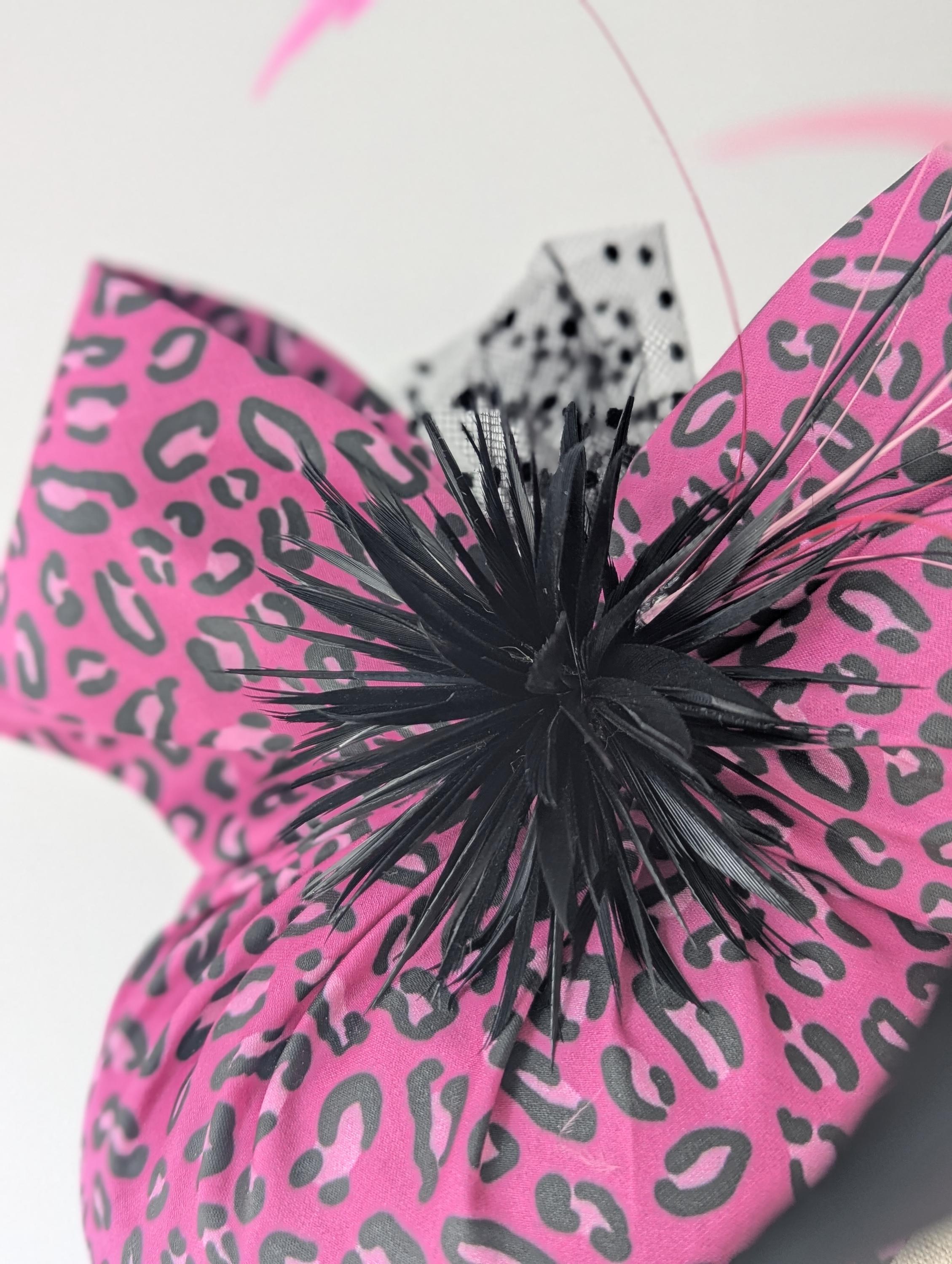 I made this animal print hat from organic cotton sateen. Such fun! I thought the pink was fabulous, I made the base and lively bow in it and then made a spray of matching coque feathers for lovely movement, some biot feathers in a little starburst design and spotty tulle for an added flourish!