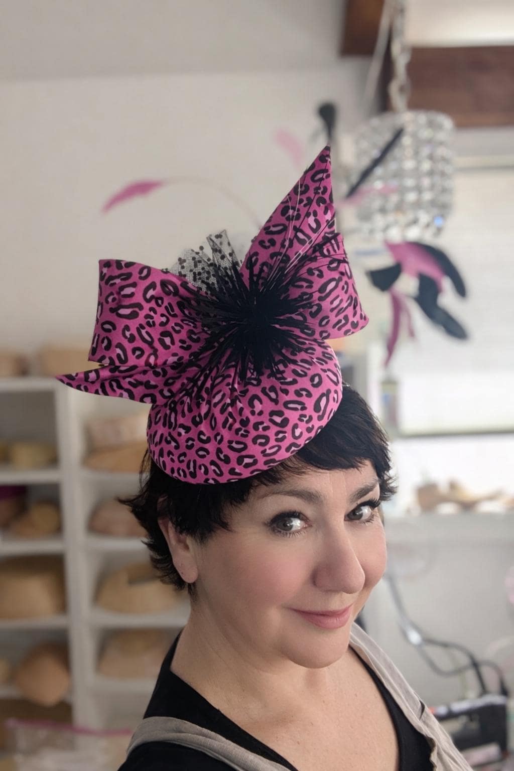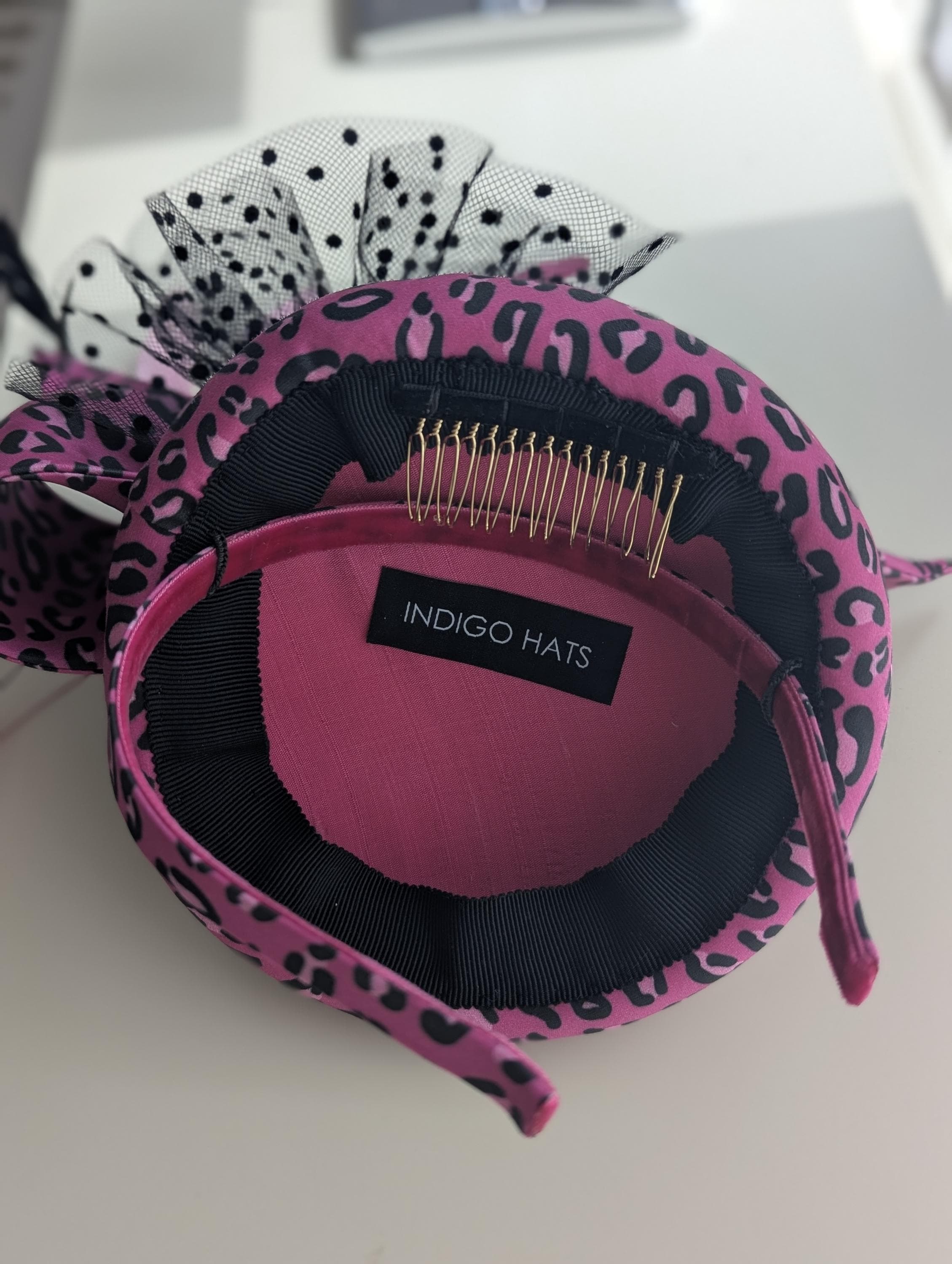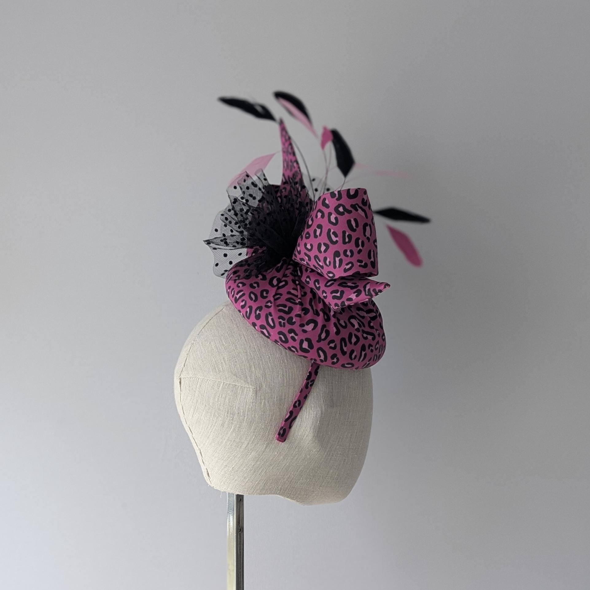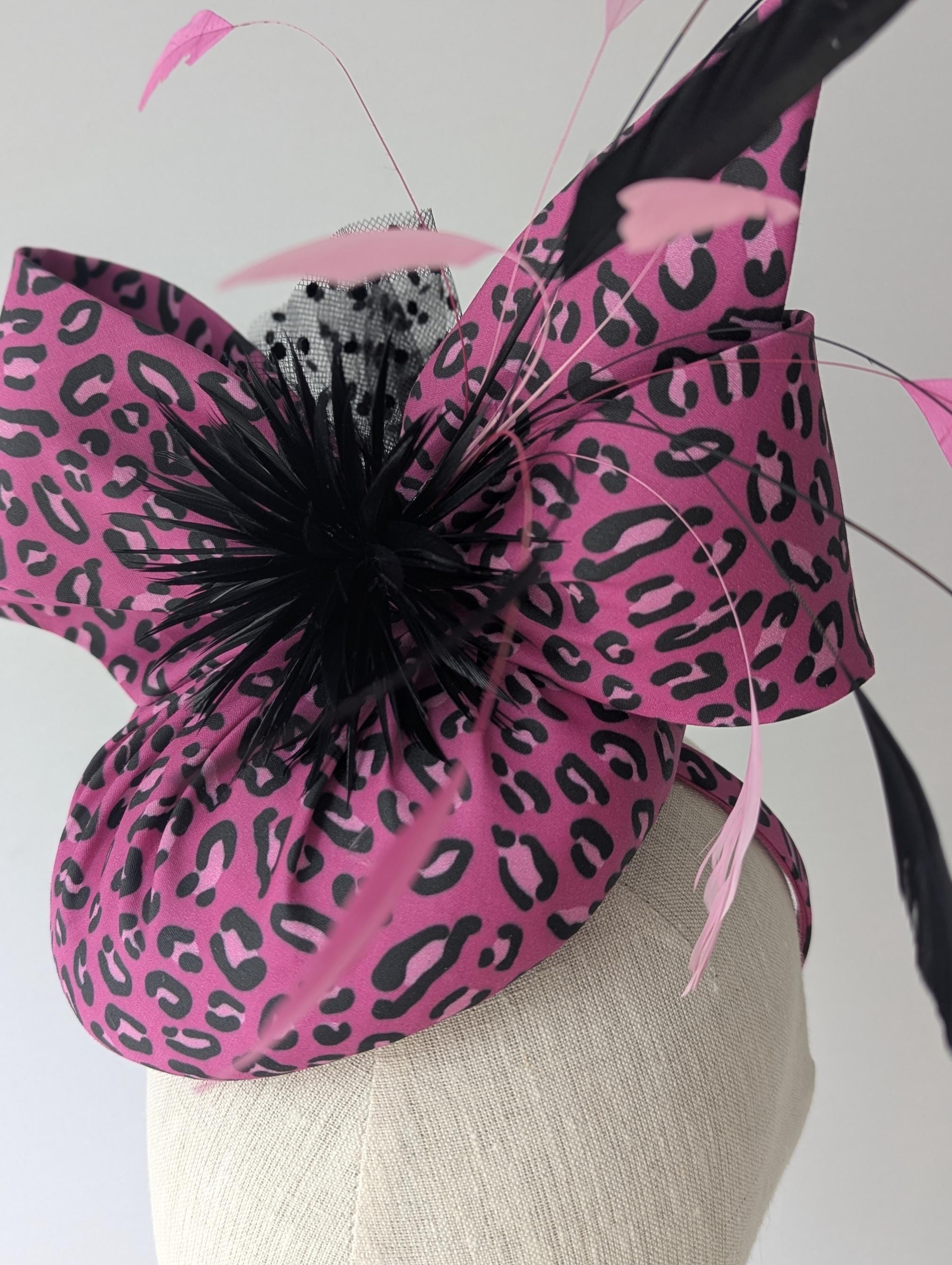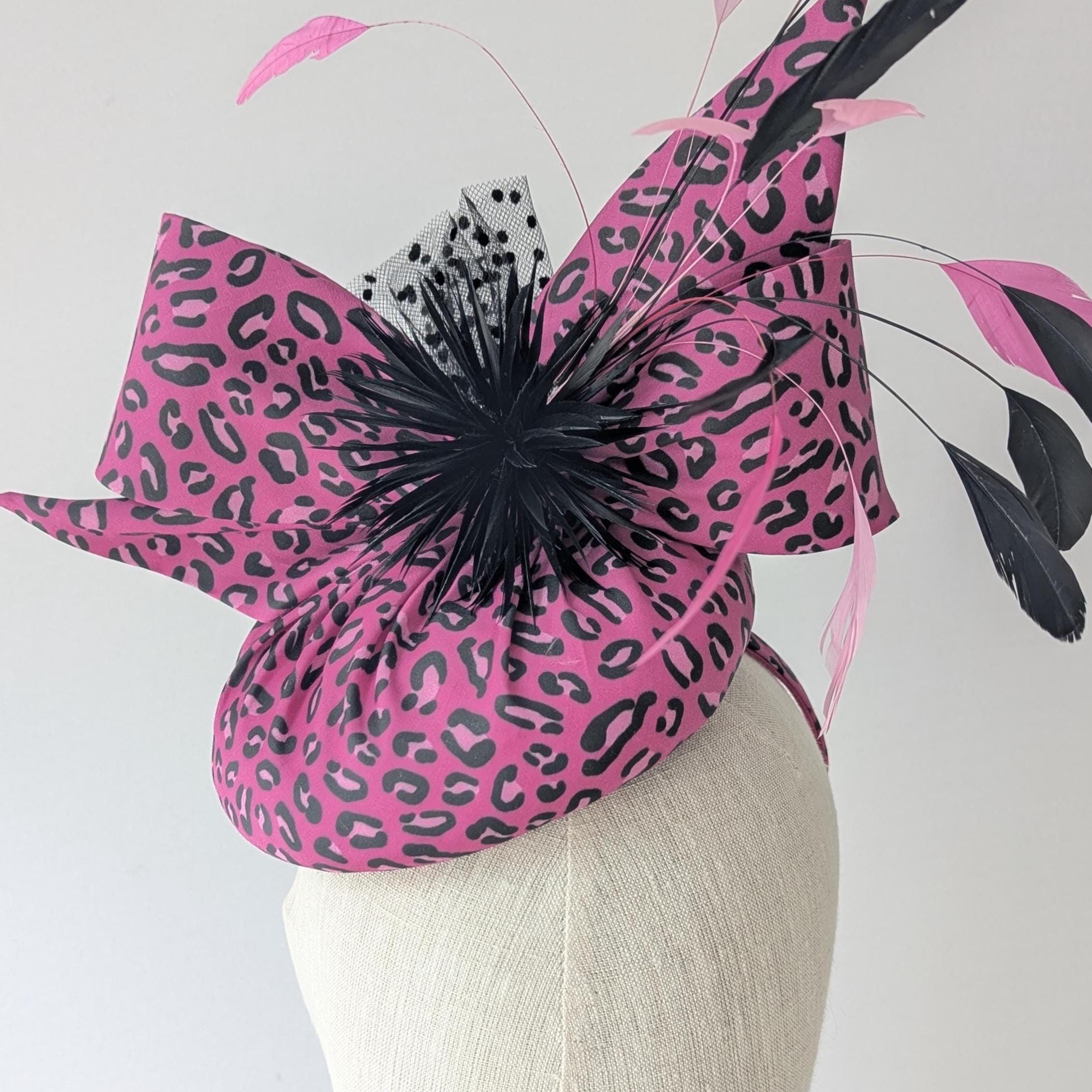 I made this animal print hat from organic cotton sateen. Such fun! I thought the pink was fabulous, I made the base and lively bow in it and then made a spray of matching coque feathers for lovely movement, some biot feathers in a little starburst design and spotty tulle for an added flourish!