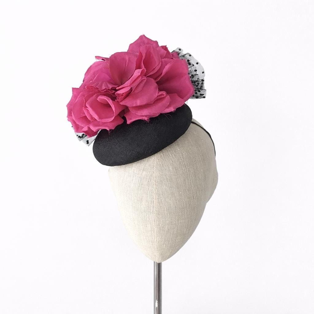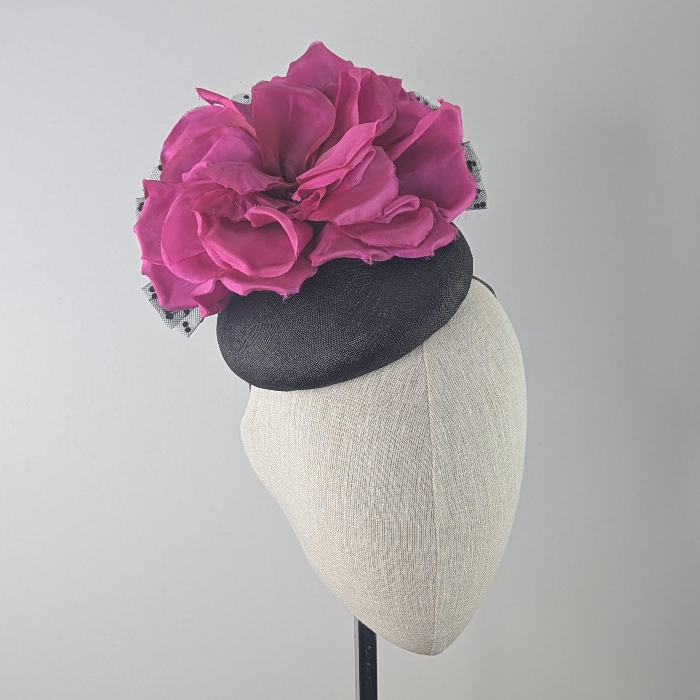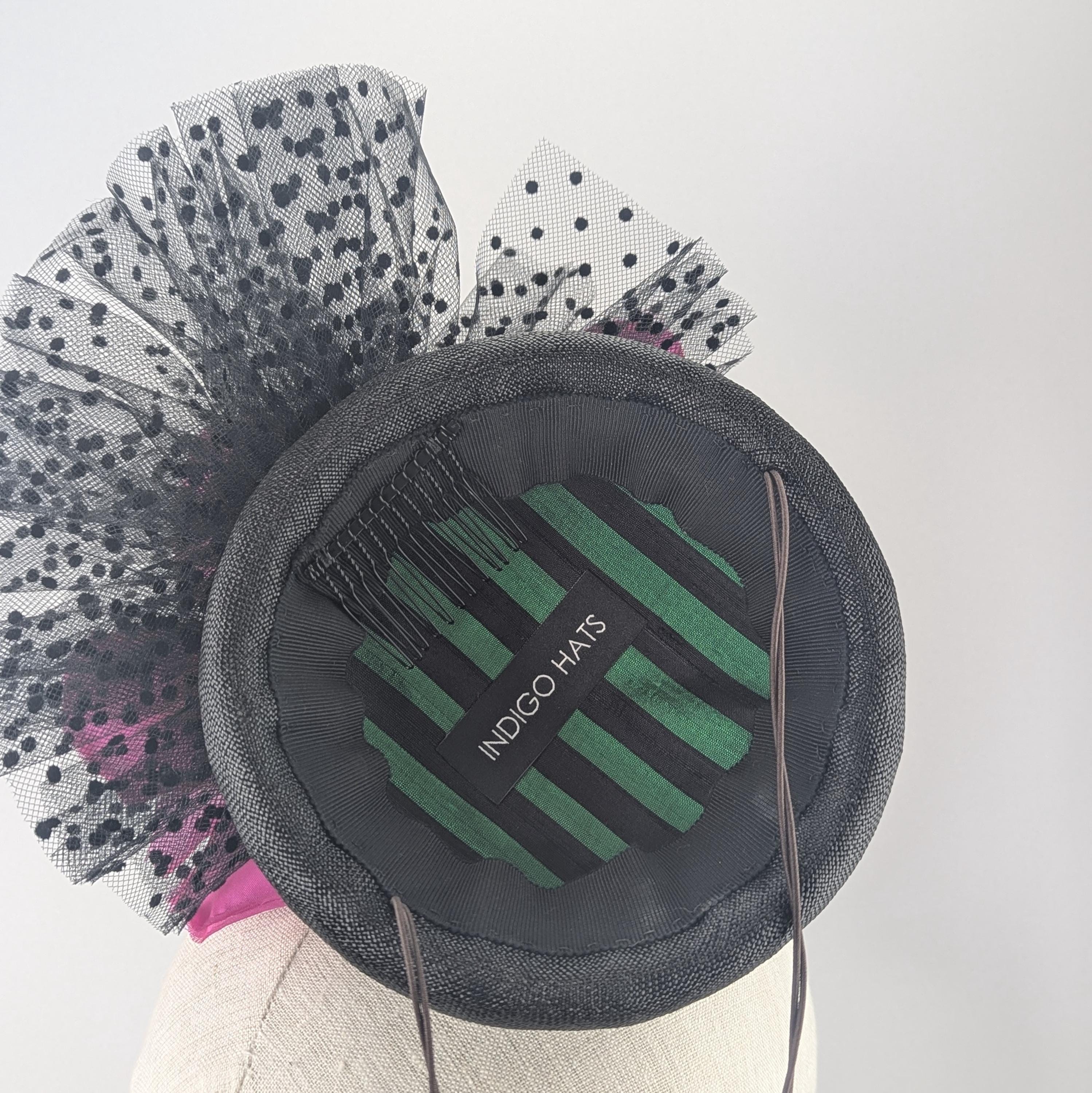 I hand blocked this lovely button shape in a fine black parisisal straw. Its adorned with gorgeous bright pink silk flower and a flurry of polka dot black tulle, I love how chic this hat looks.
