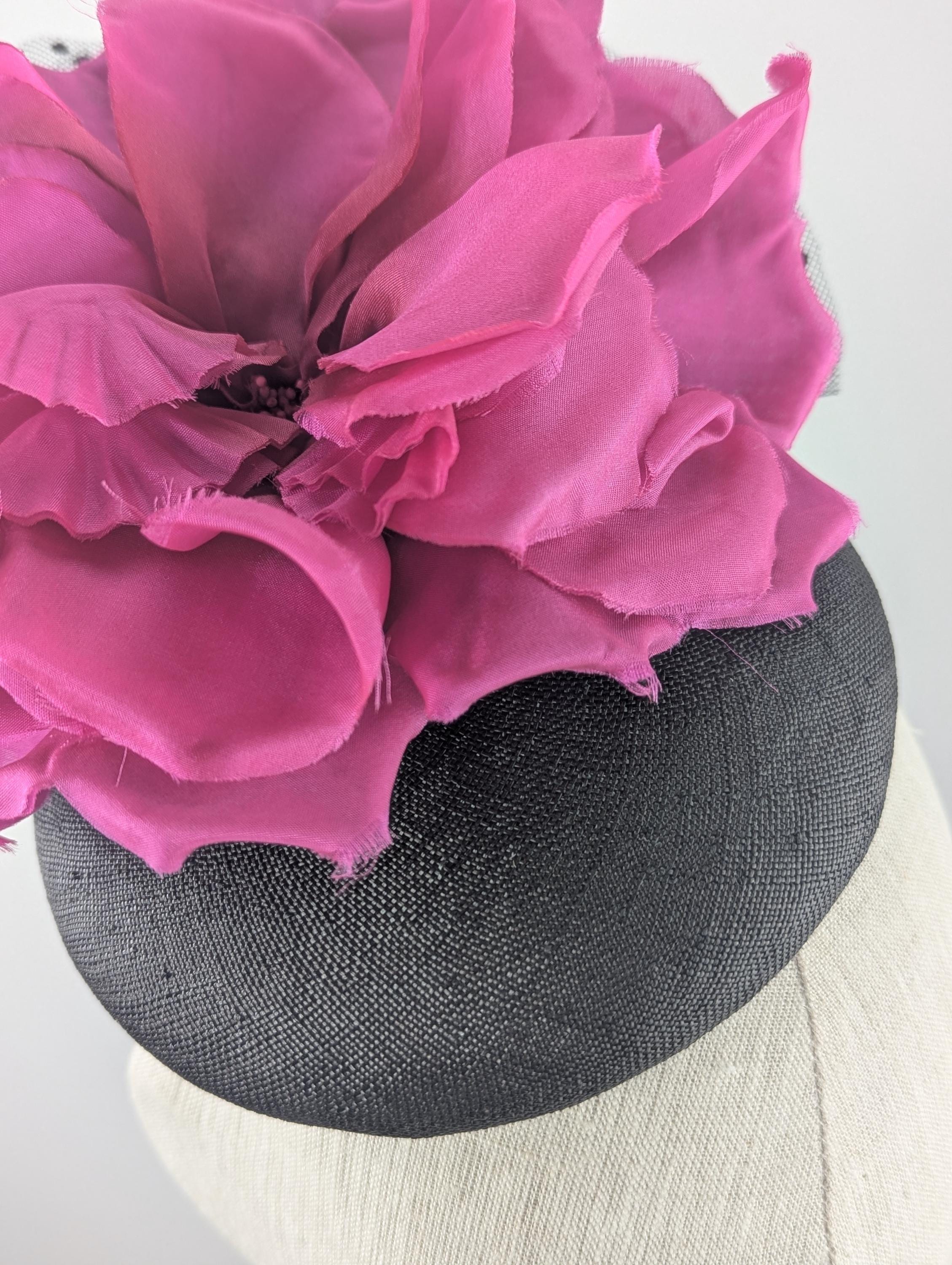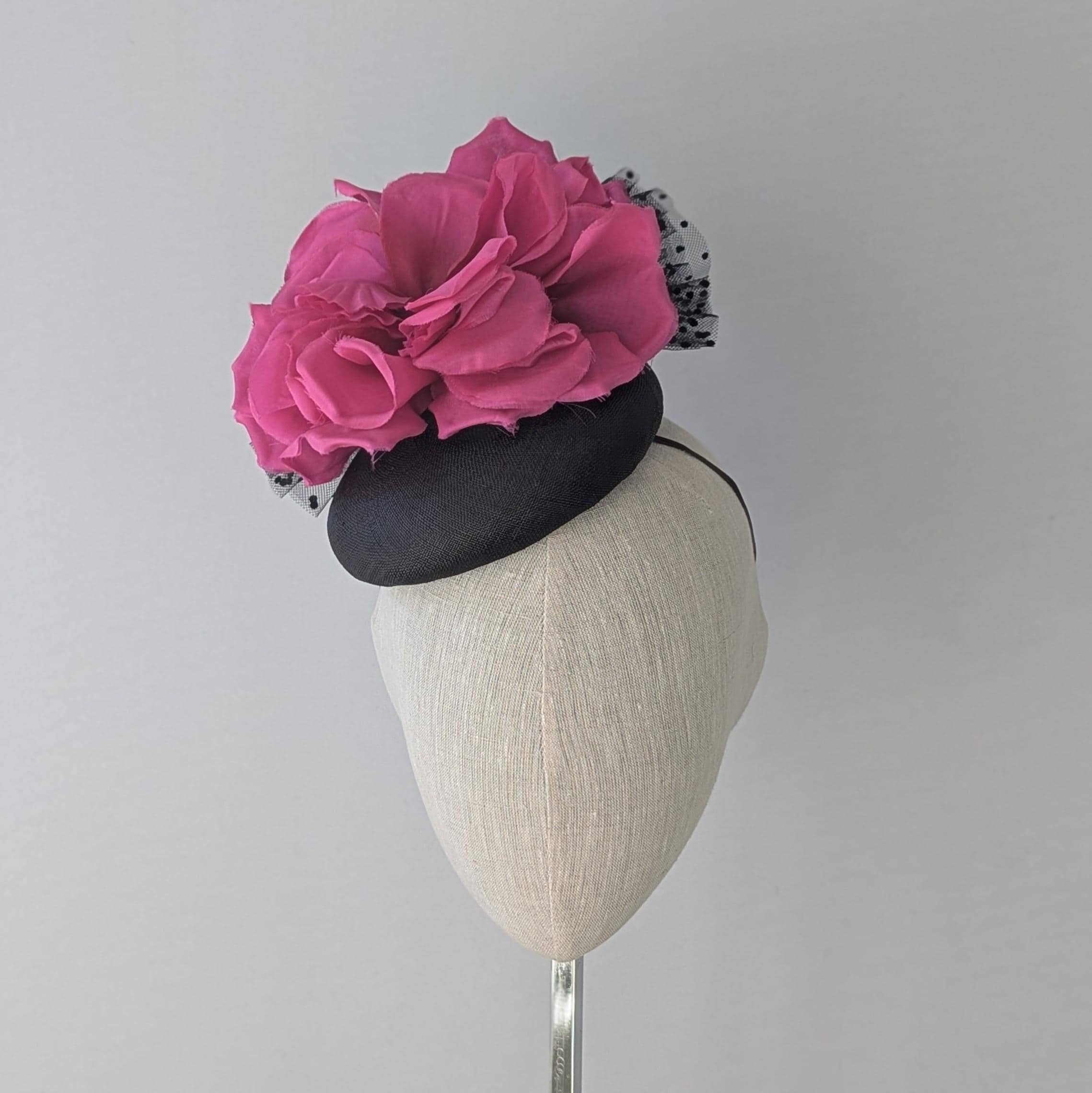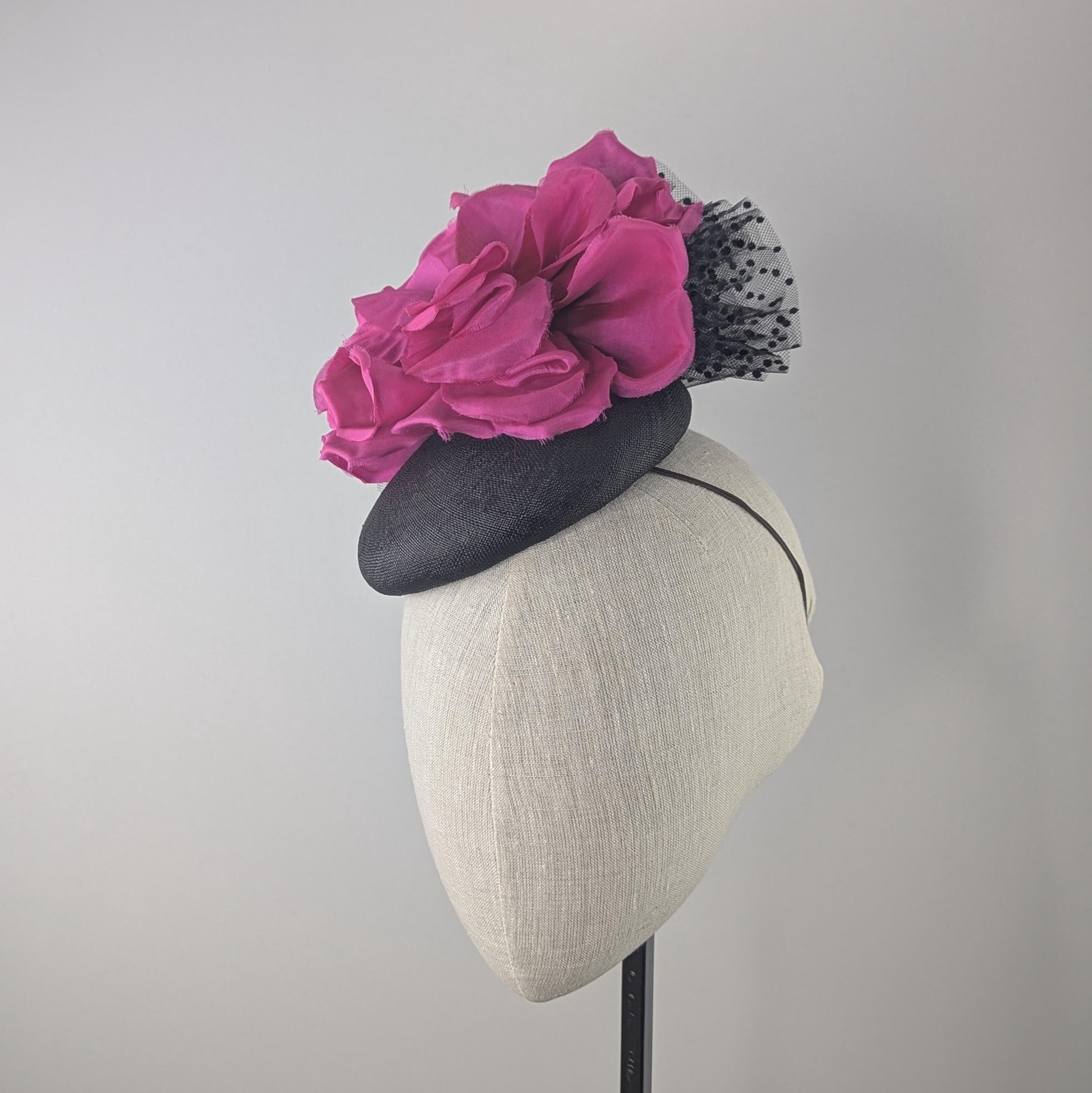 I hand blocked this lovely button shape in a fine black parisisal straw. Its adorned with gorgeous bright pink silk flower and a flurry of polka dot black tulle, I love how chic this hat looks.