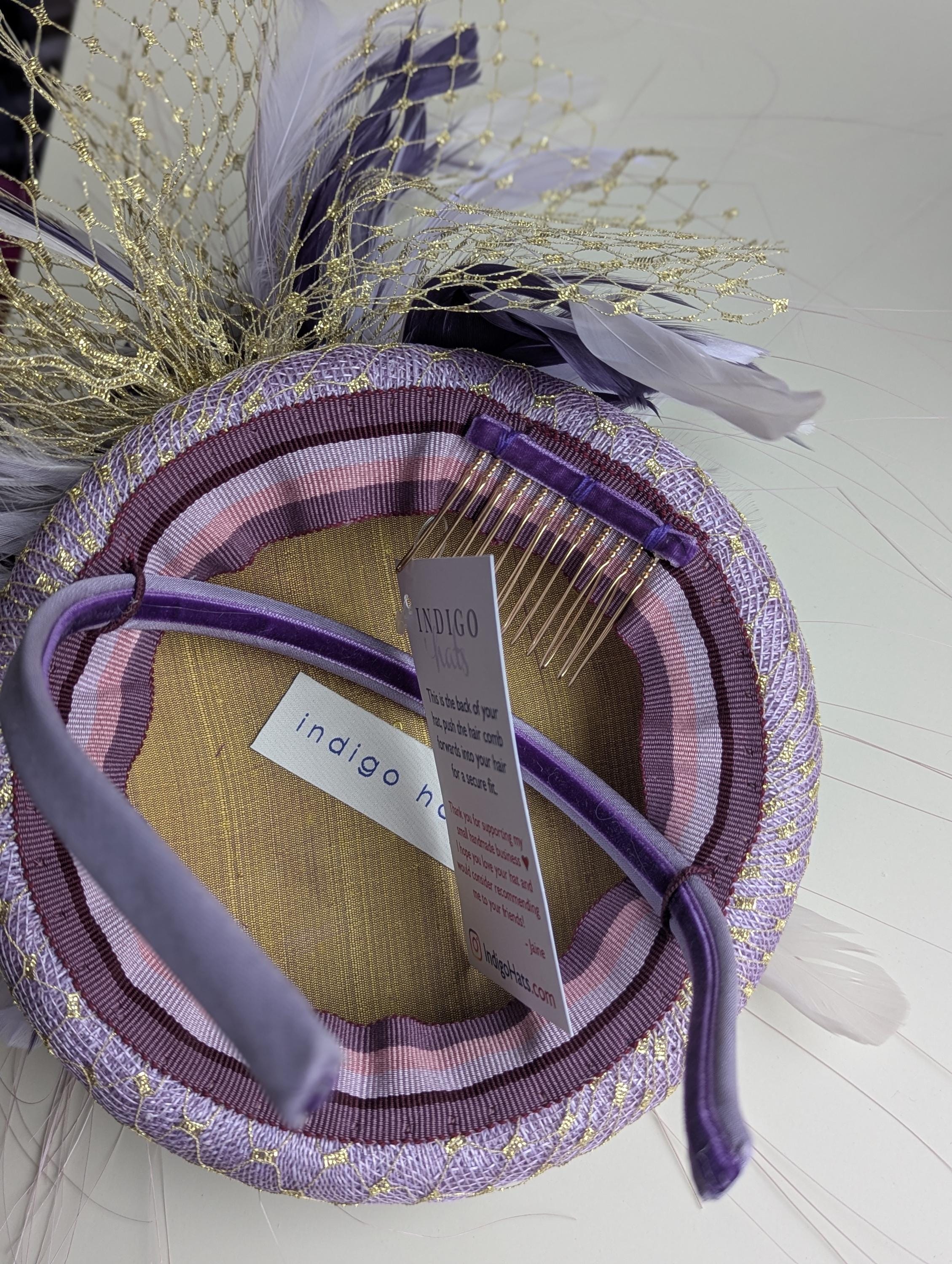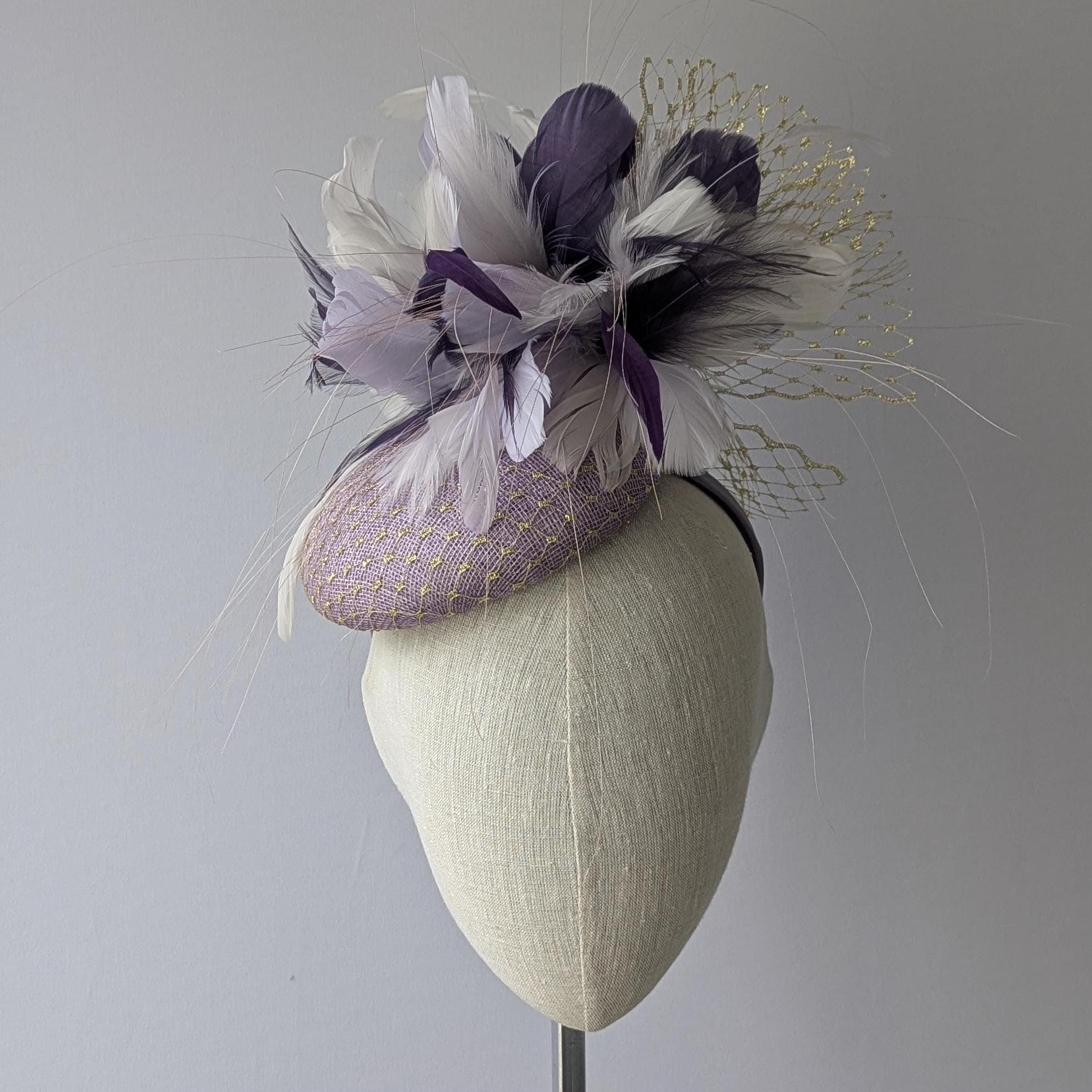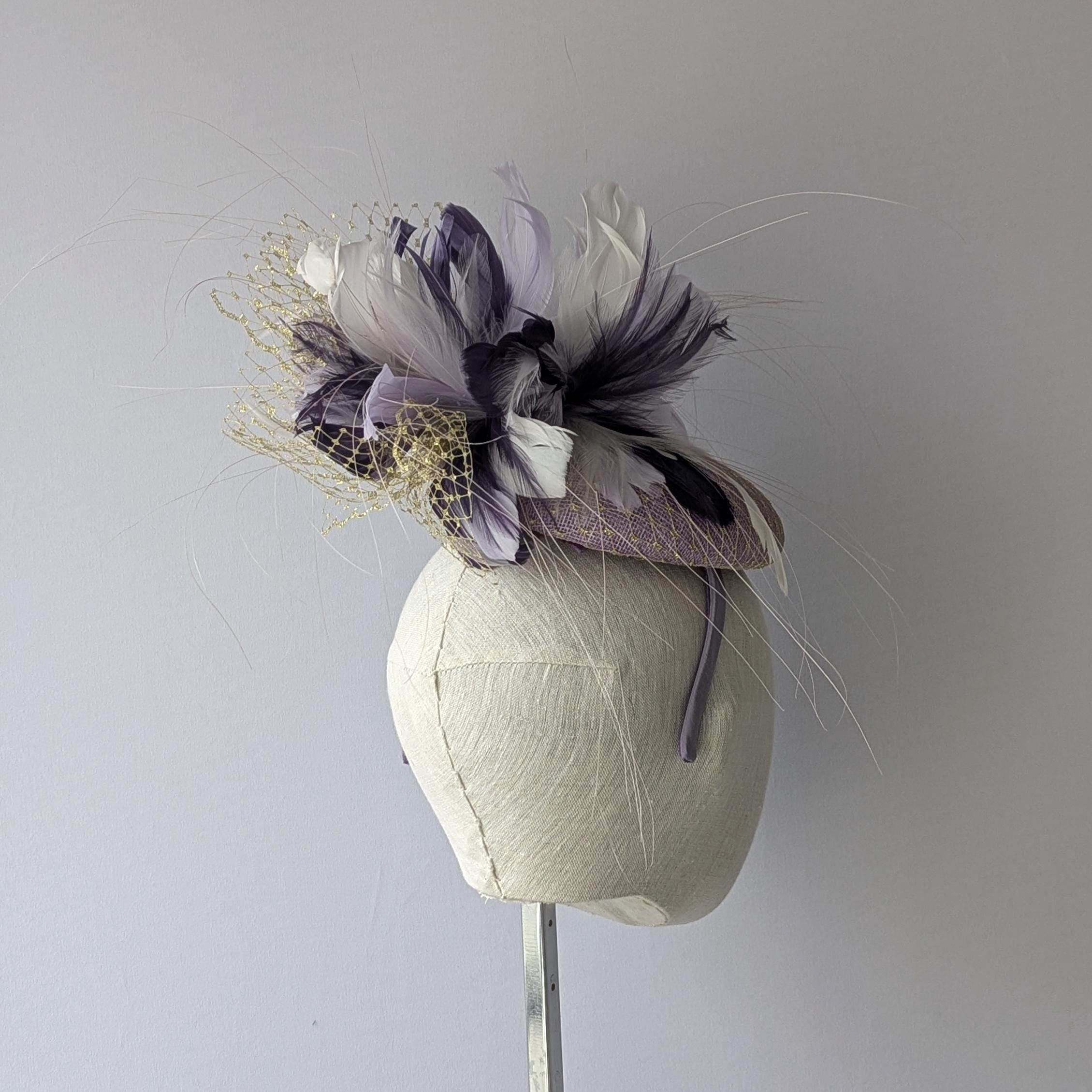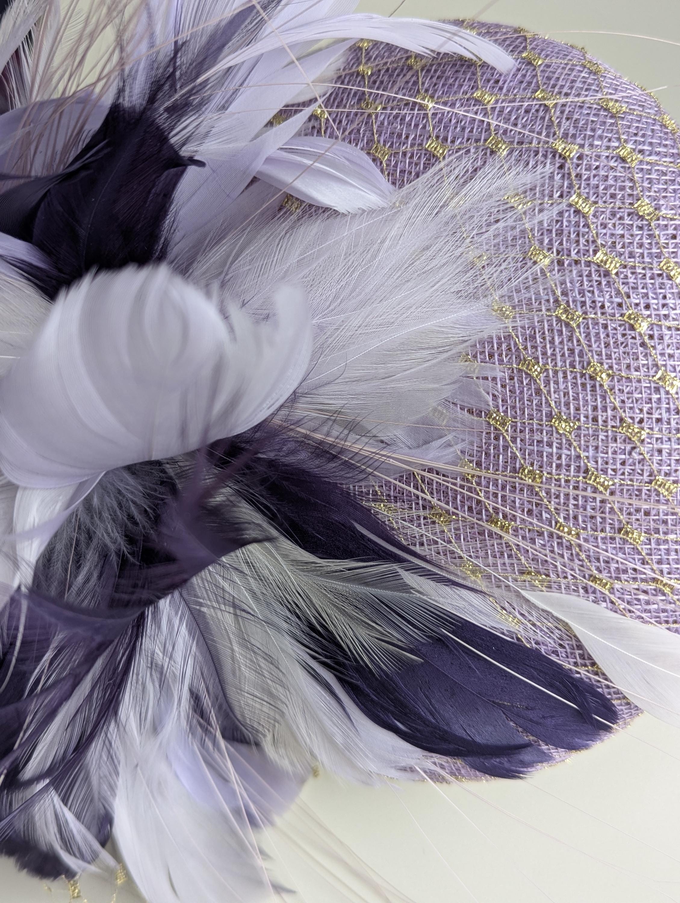 This showstopper cocktail hat is handblocked in layers of lilac straw and overlayed with gold veiling to give a lovely effect. It features lush feathers in a mix of purple, lilac and ivory along with peacock hurl and stripped coque feathers that add beautiful movement to this headpiece.