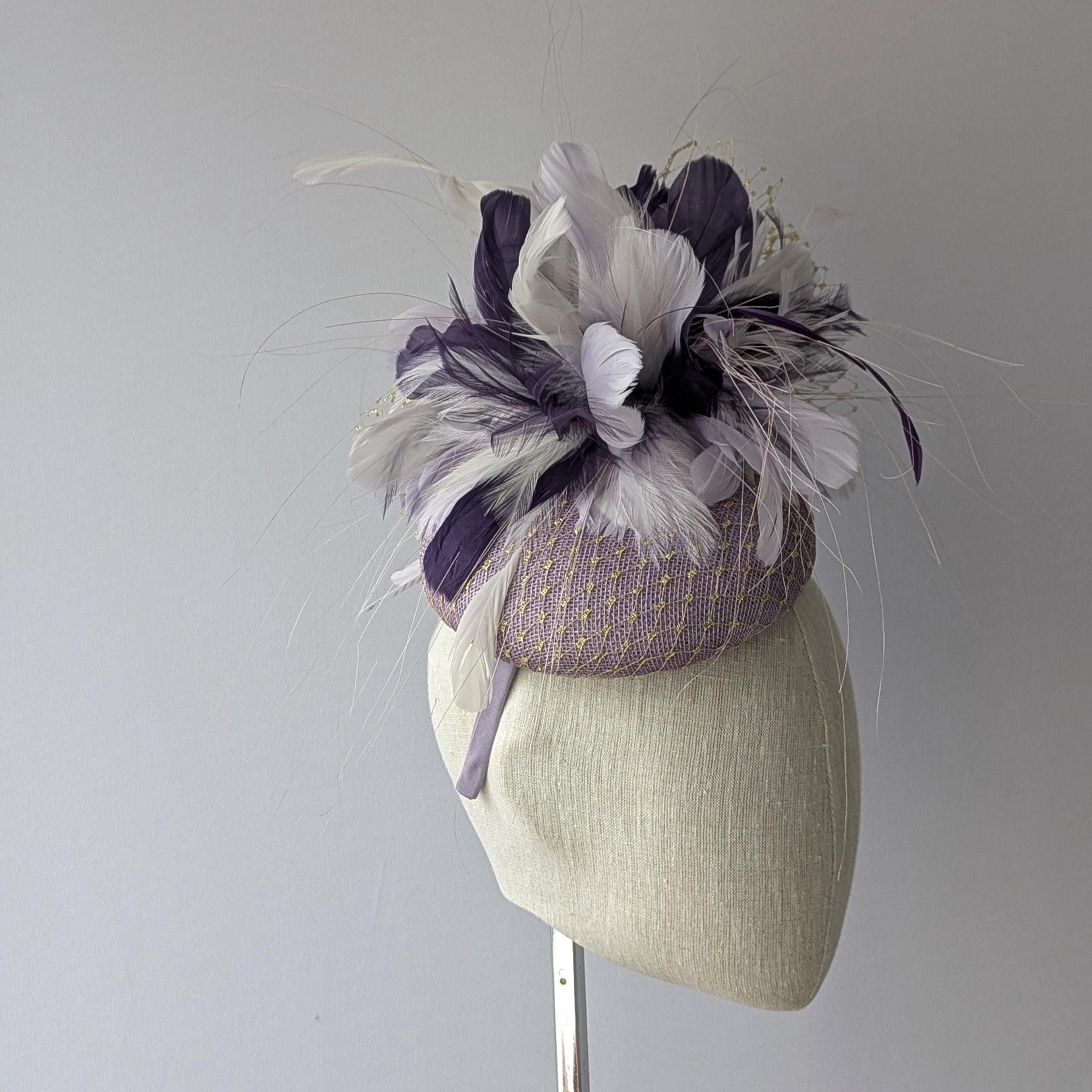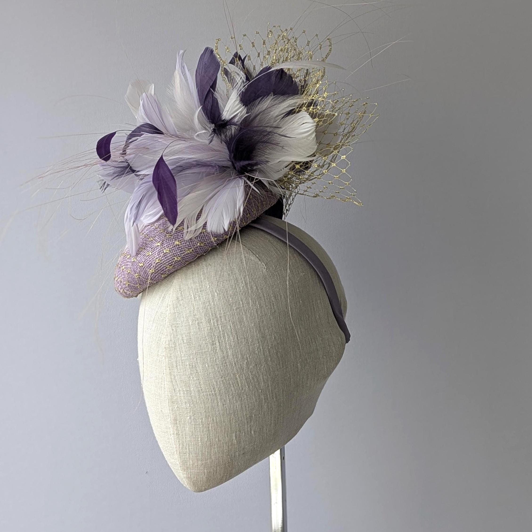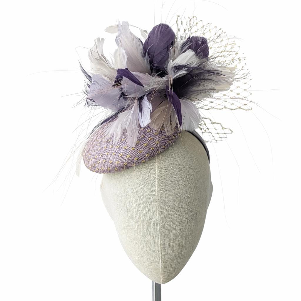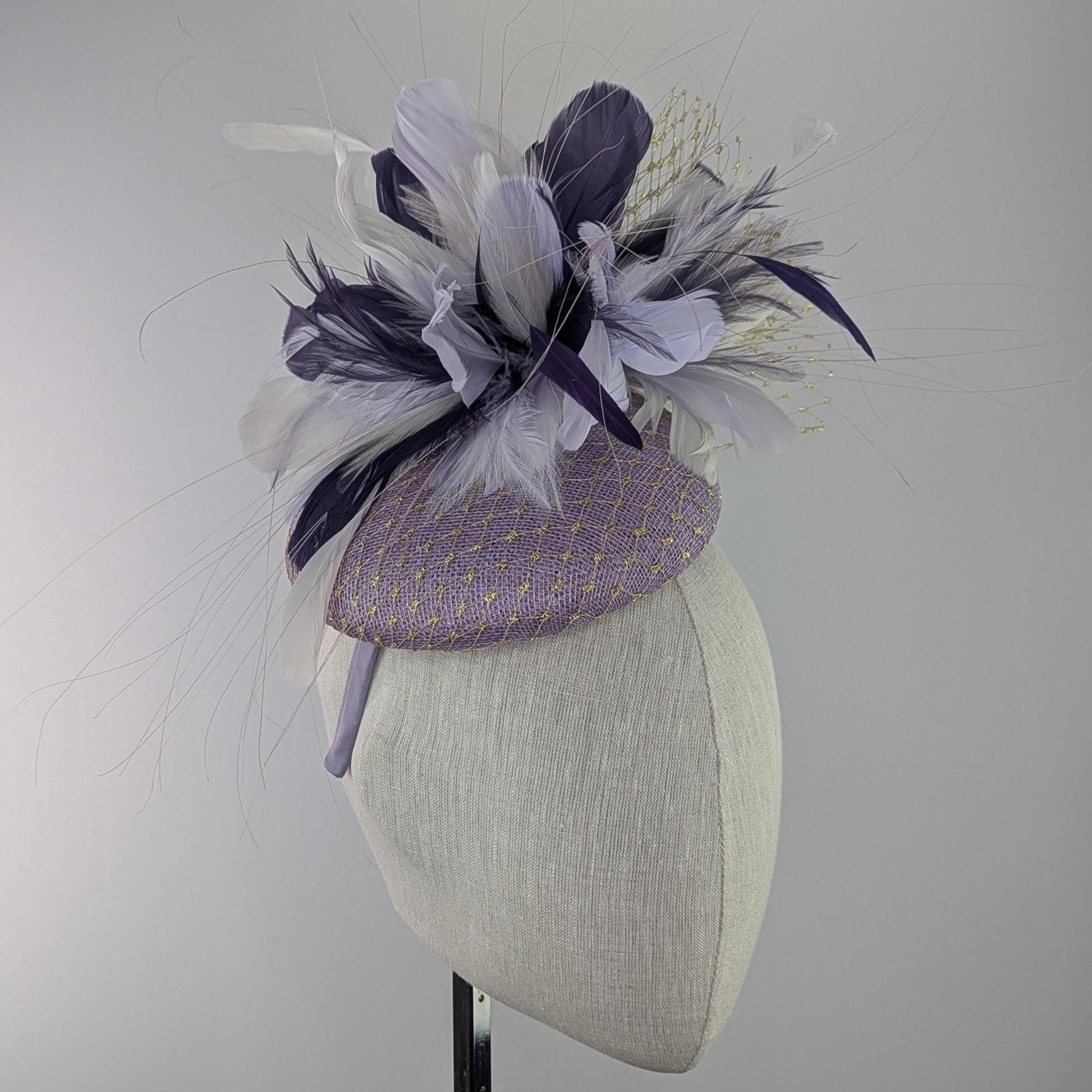 This showstopper cocktail hat is handblocked in layers of lilac straw and overlayed with gold veiling to give a lovely effect. It features lush feathers in a mix of purple, lilac and ivory along with peacock hurl and stripped coque feathers that add beautiful movement to this headpiece.