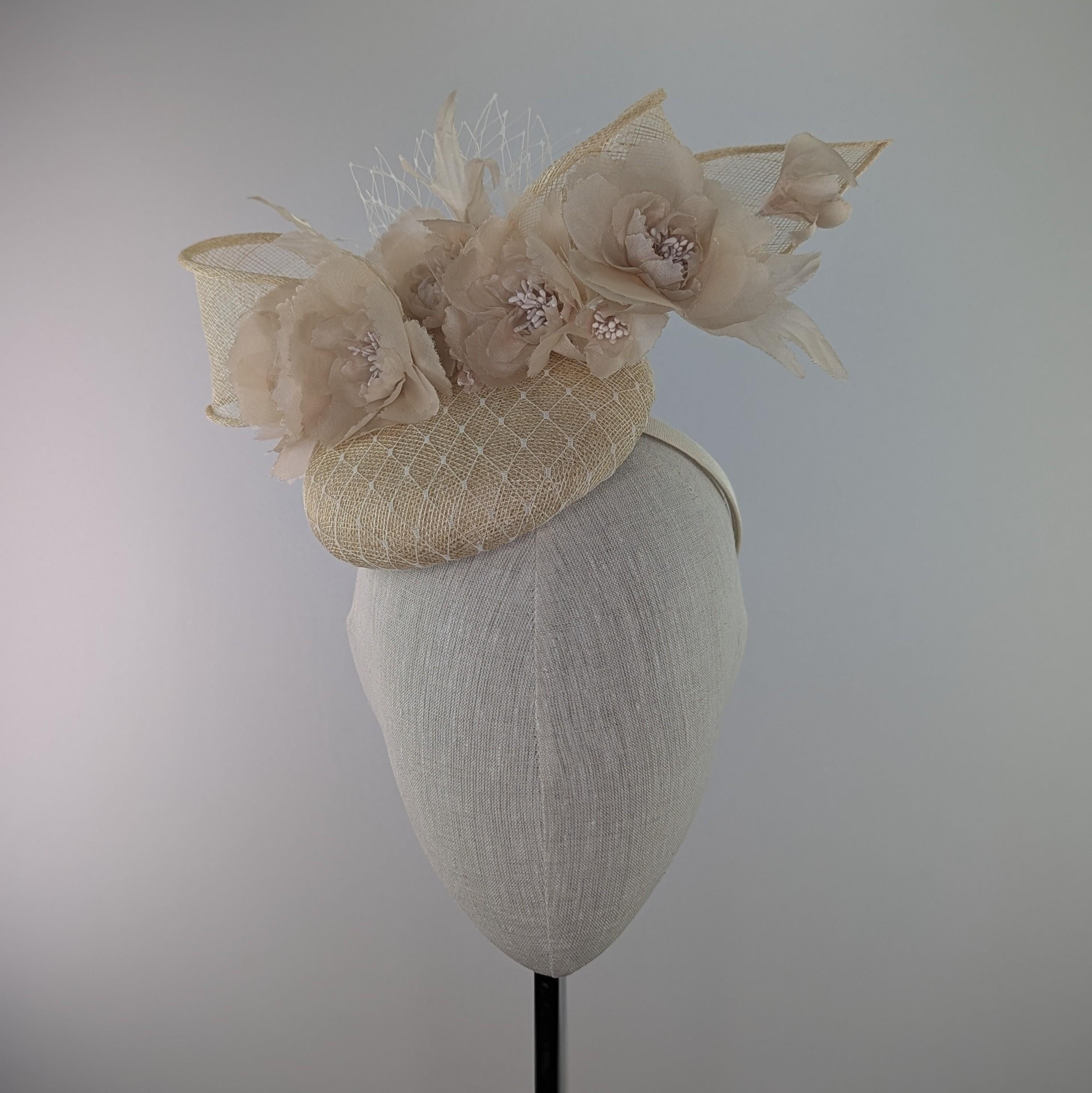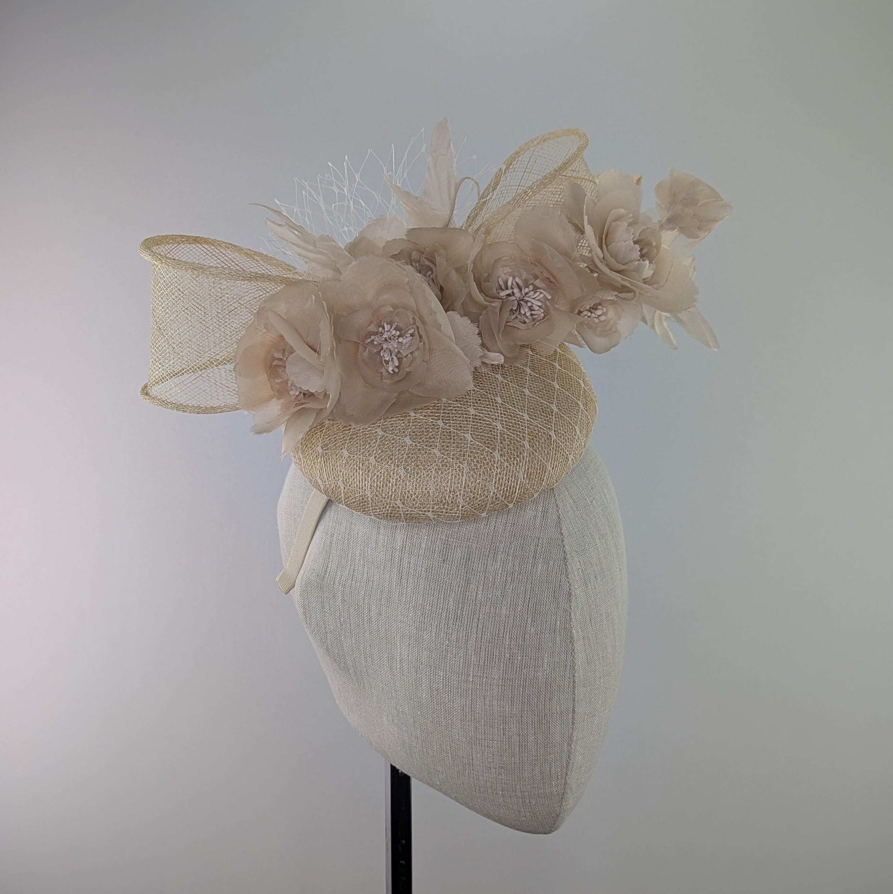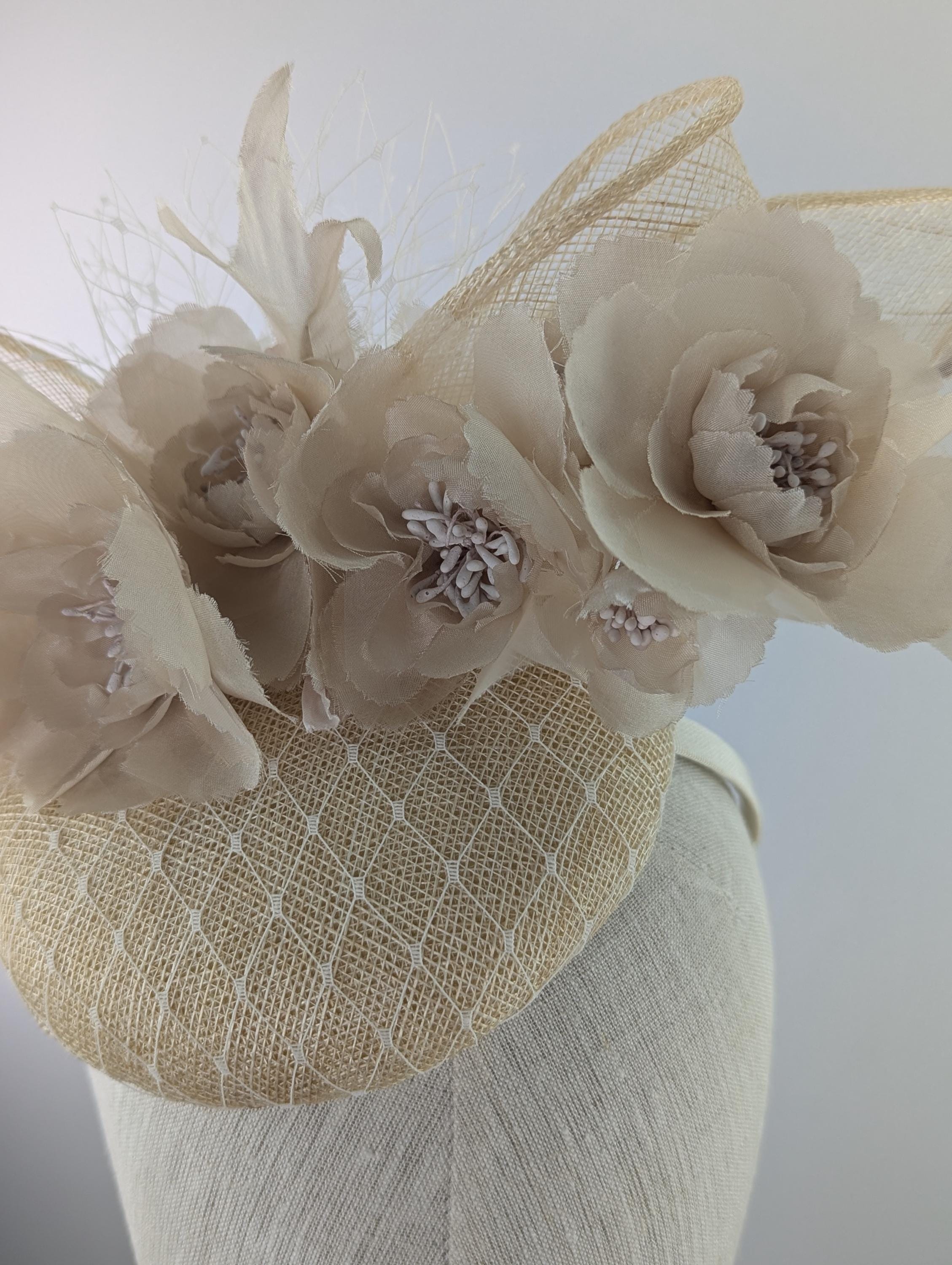 I made the base in natural undyed sinamy straw, added a white veiling overlay, with fabulous silk millinery flowers adorning it. The vintage look veiling flourish is a lovely soft finishing touch. It measures 6" across.