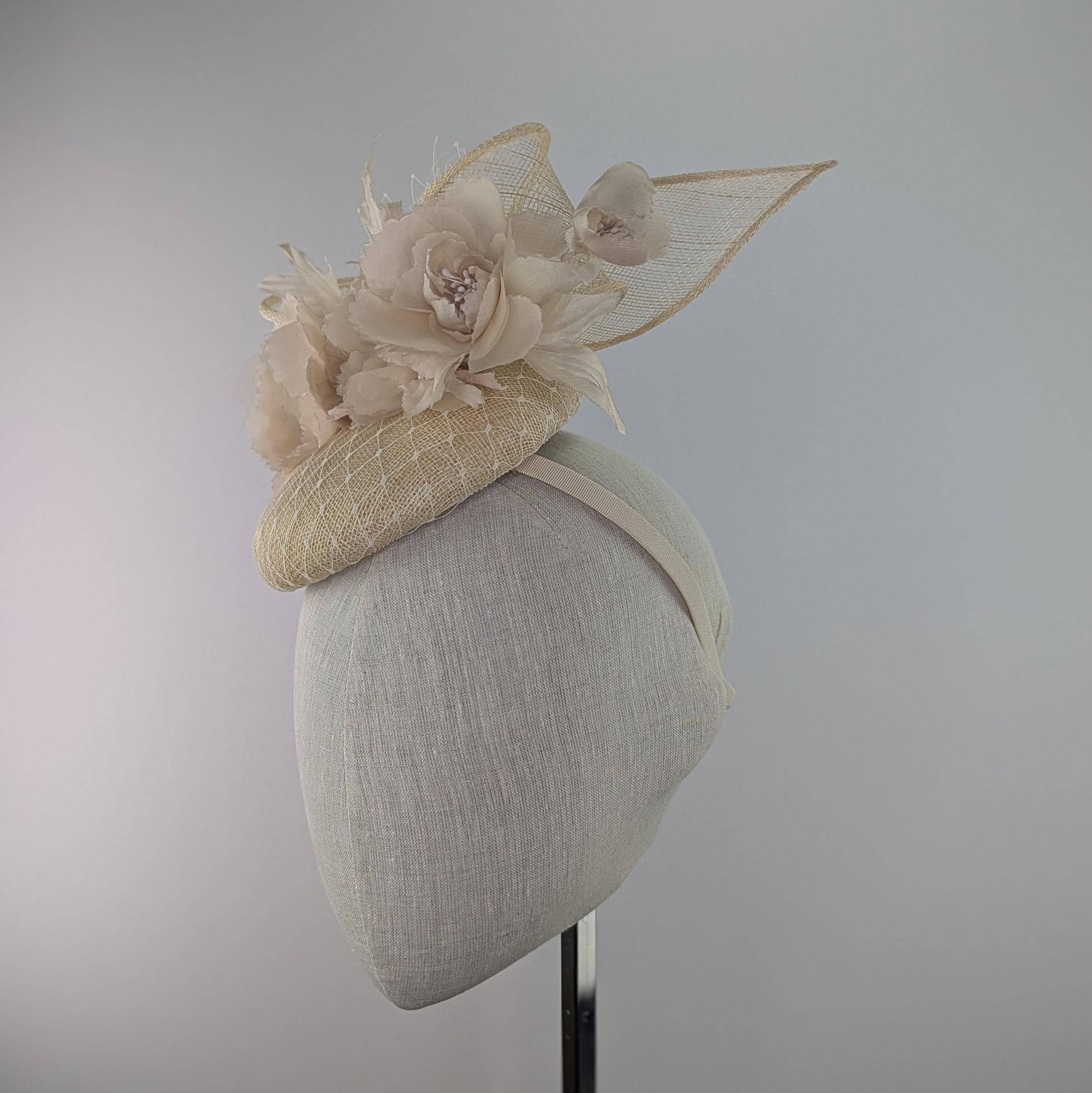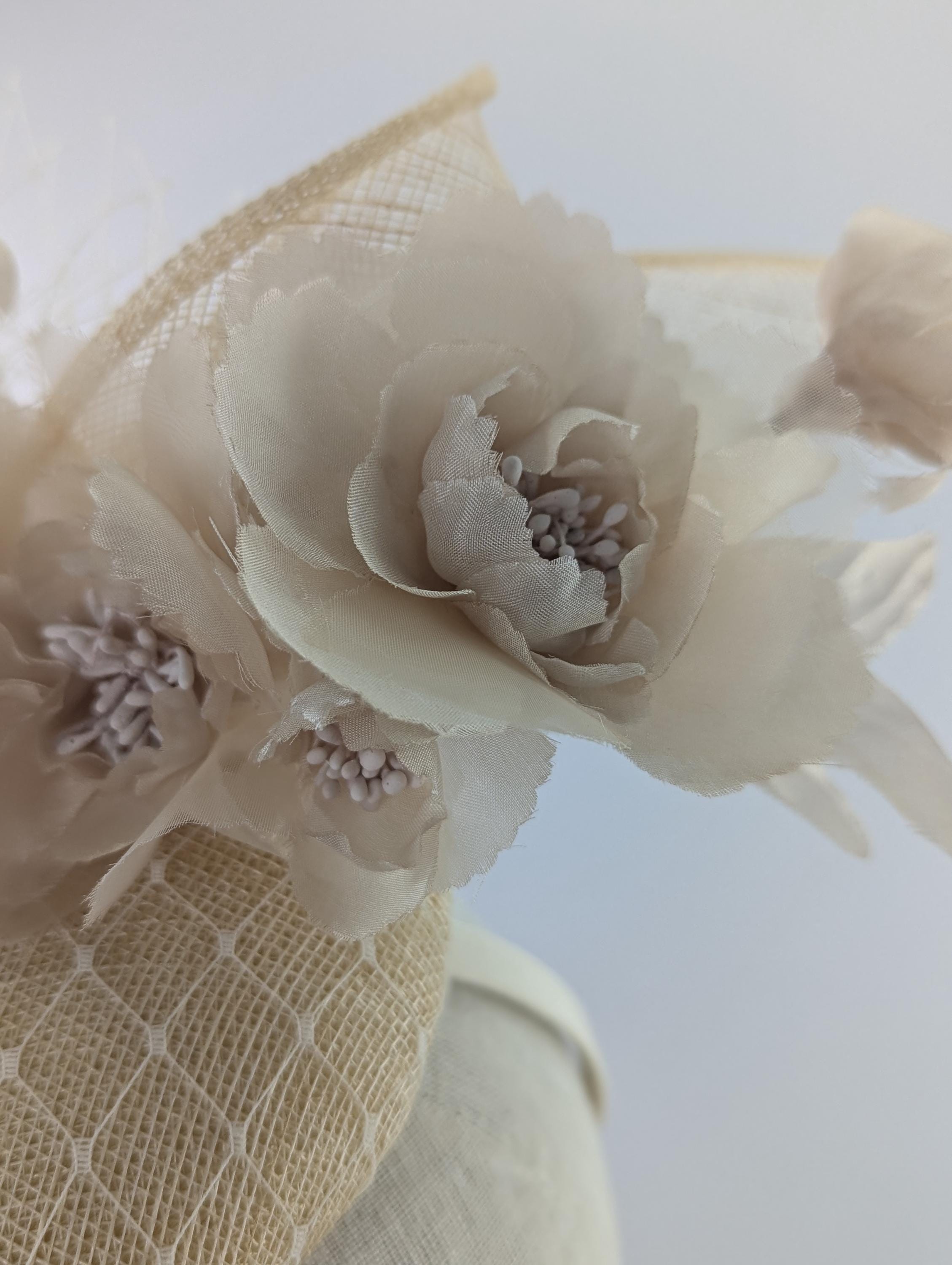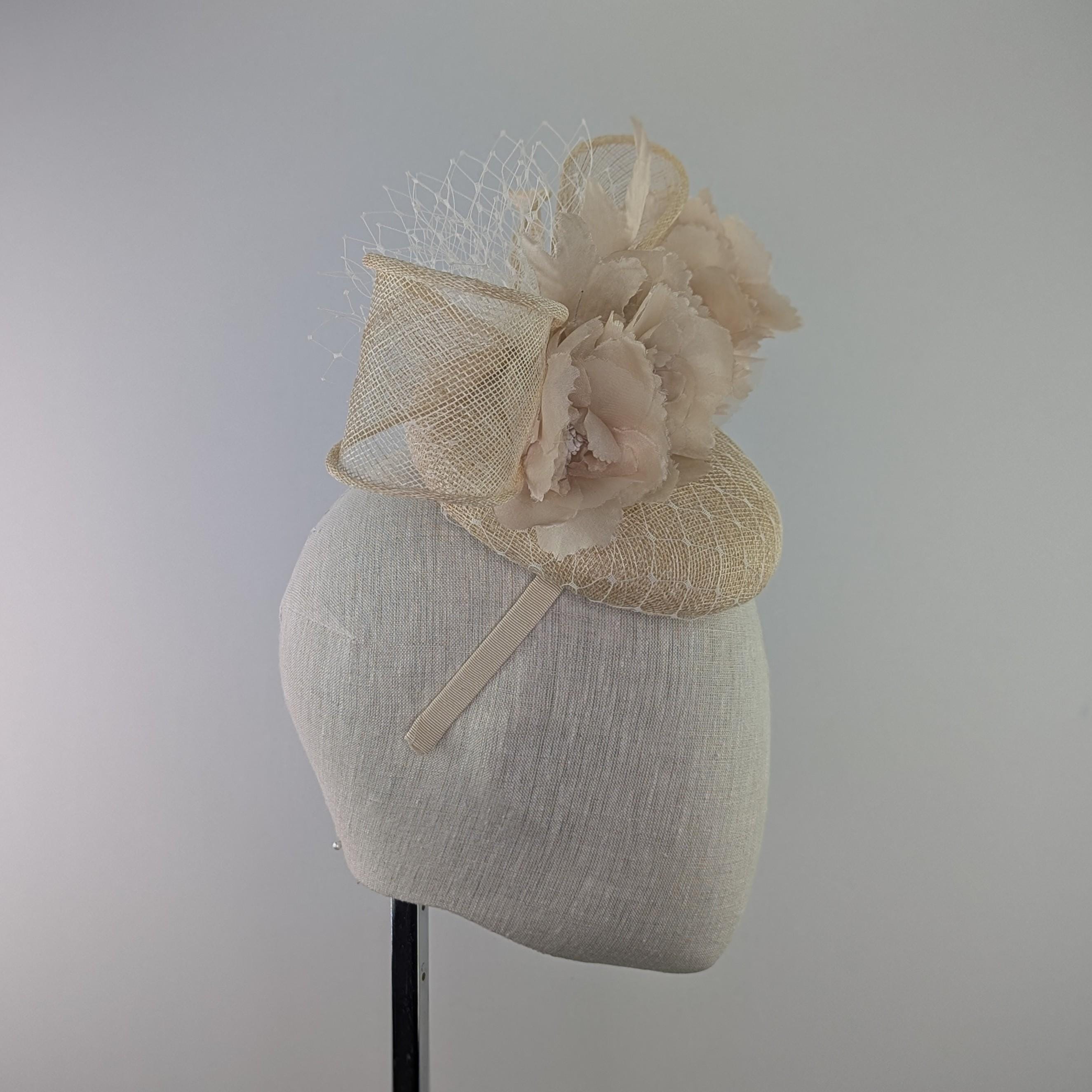 I made the base in natural undyed sinamy straw, added a white veiling overlay, with fabulous silk millinery flowers adorning it. The vintage look veiling flourish is a lovely soft finishing touch. It measures 6" across.