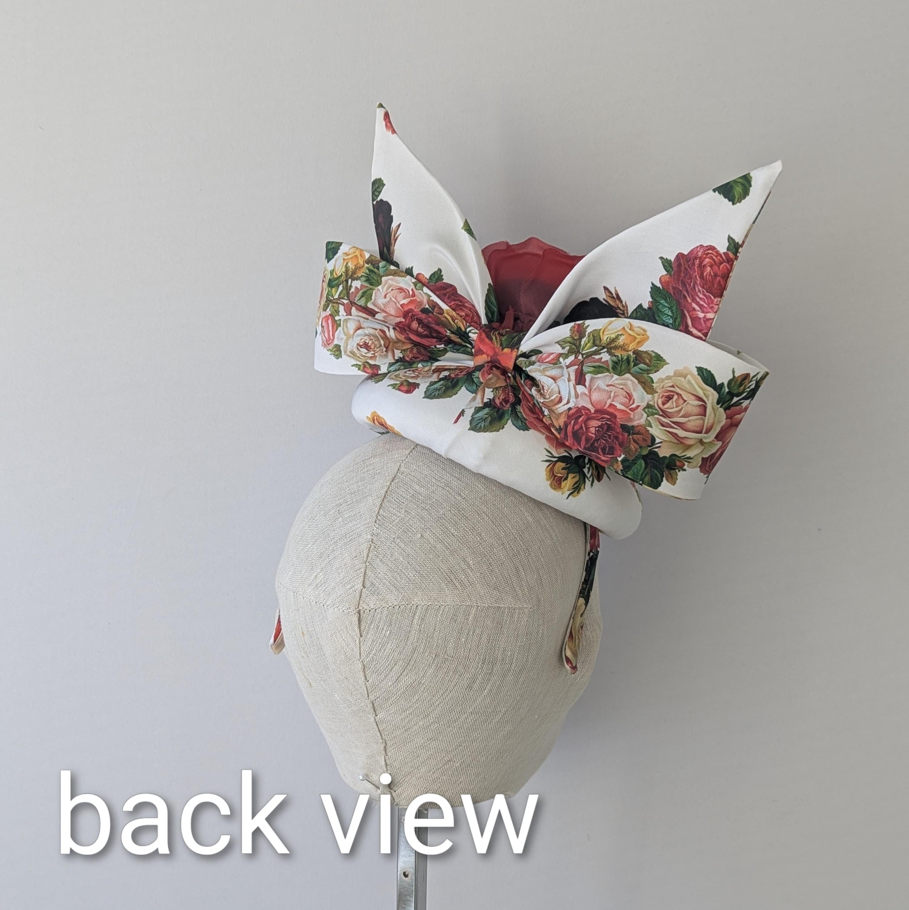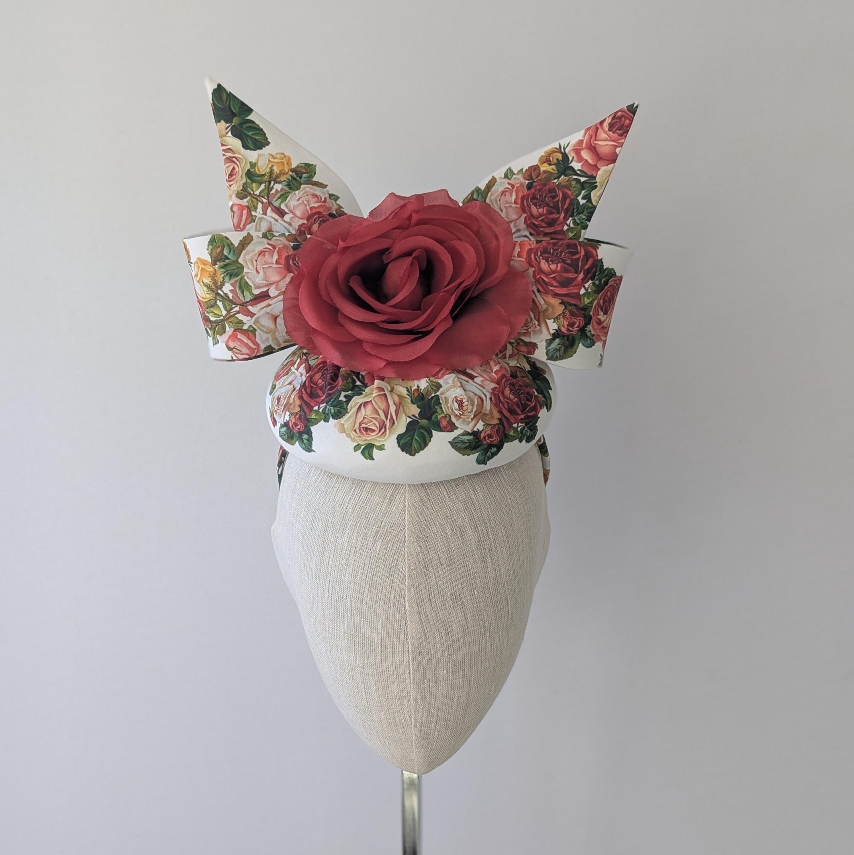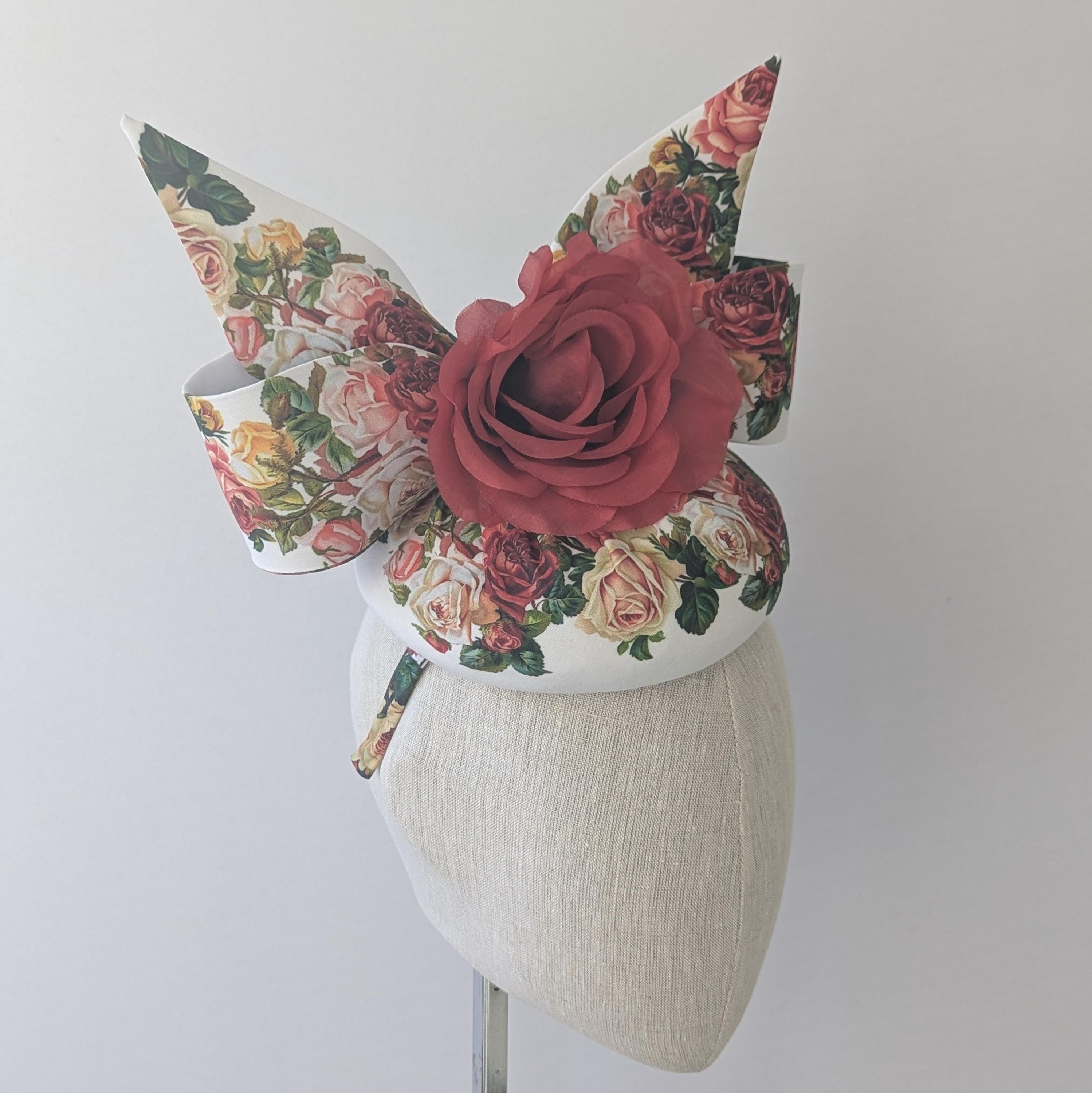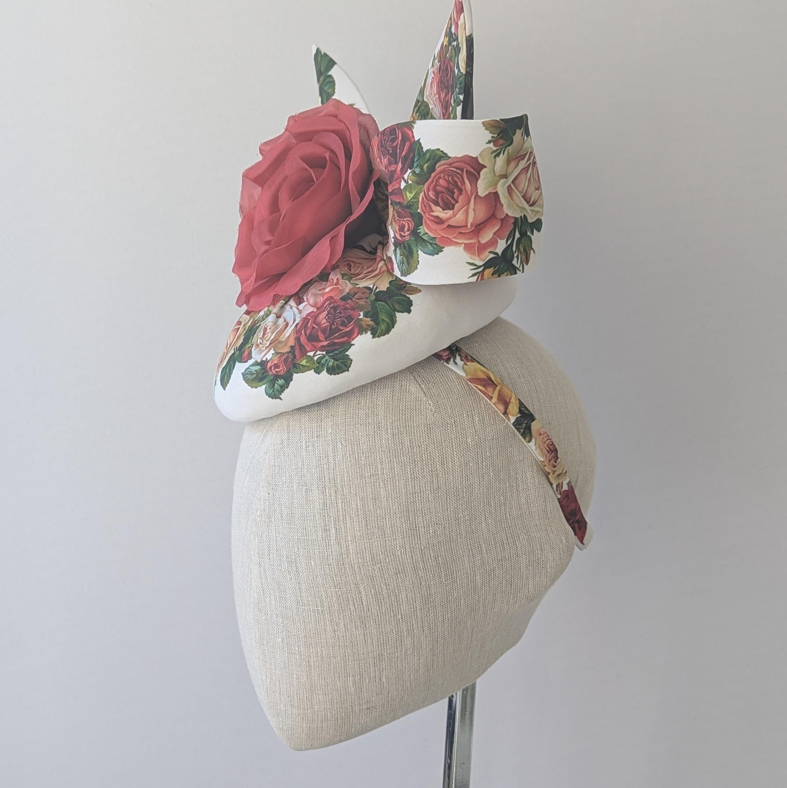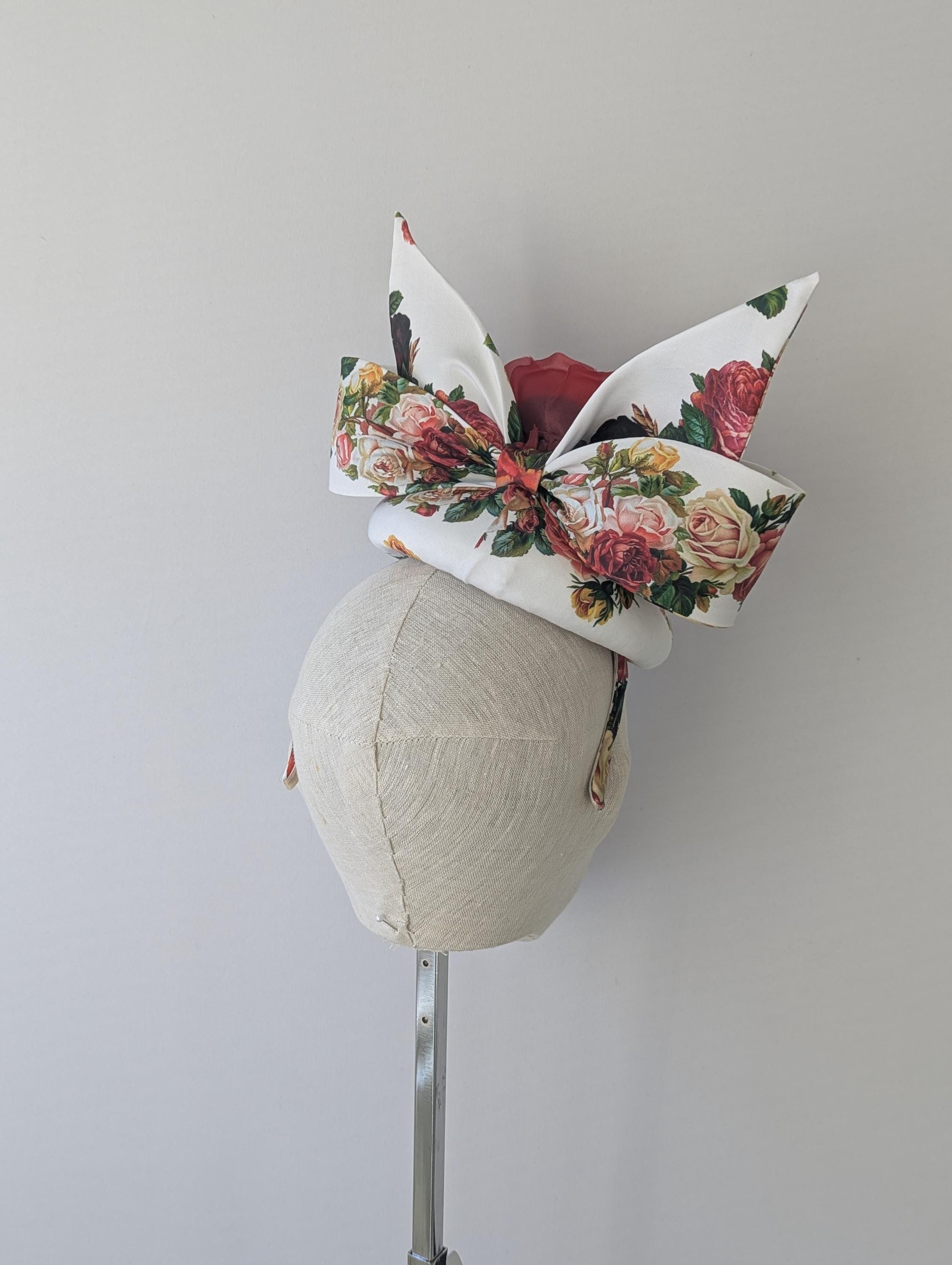 I made this charming hat is in a dramatic floral print with a white background in organic fabric, made the bow in the same fabric and finished it off with a lush red silk rose.