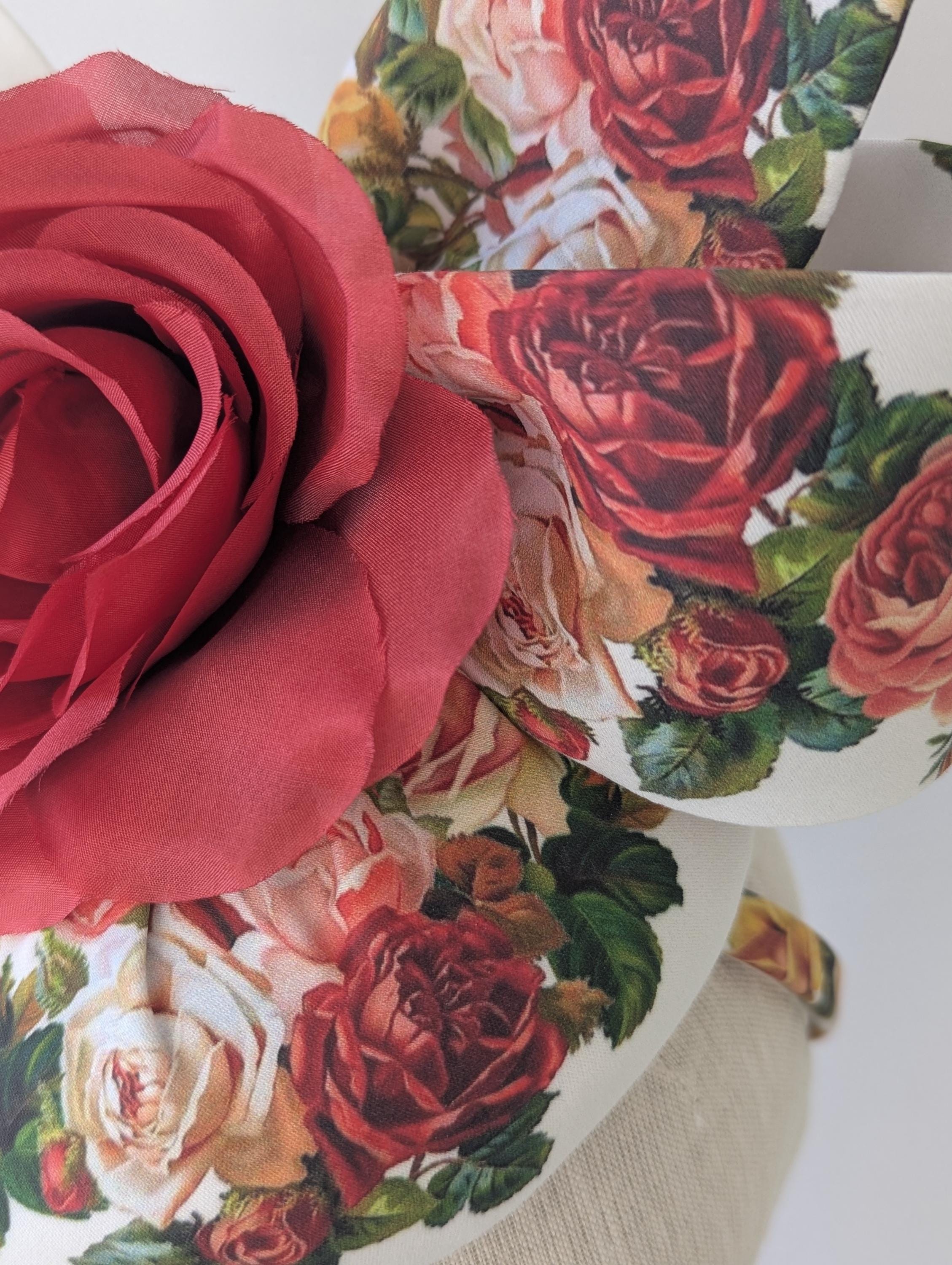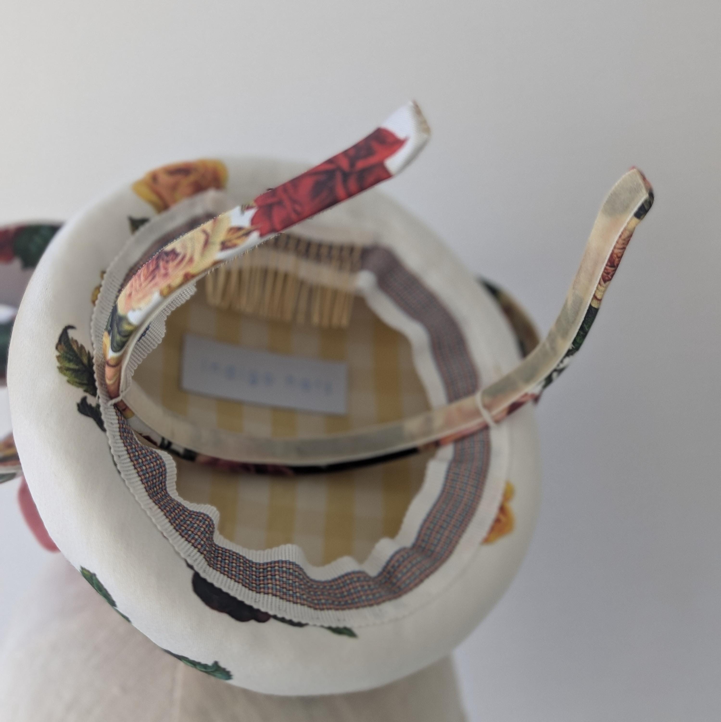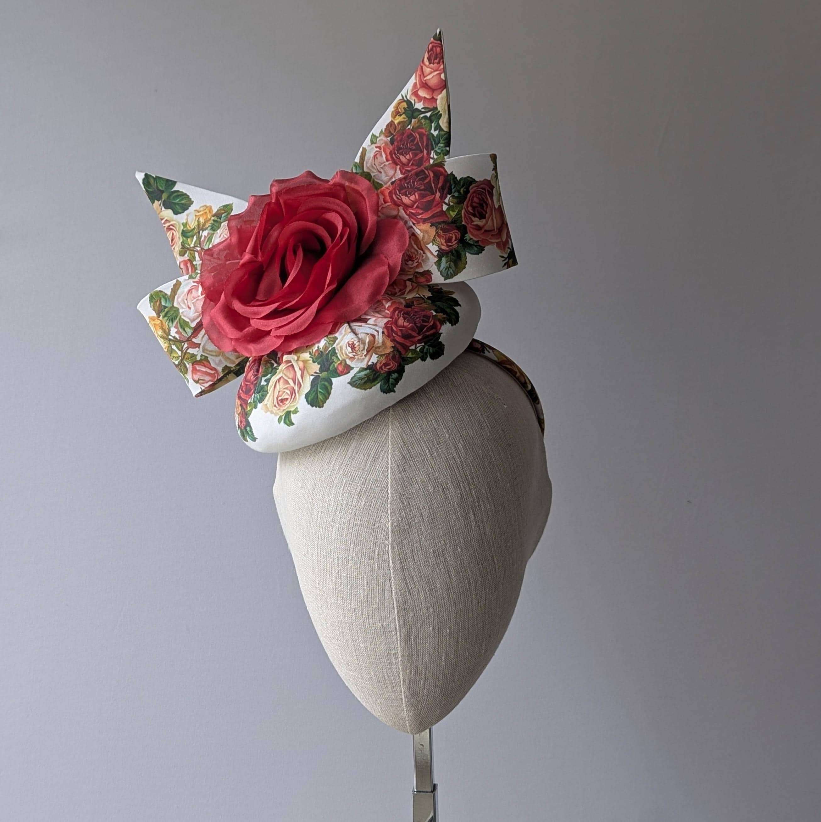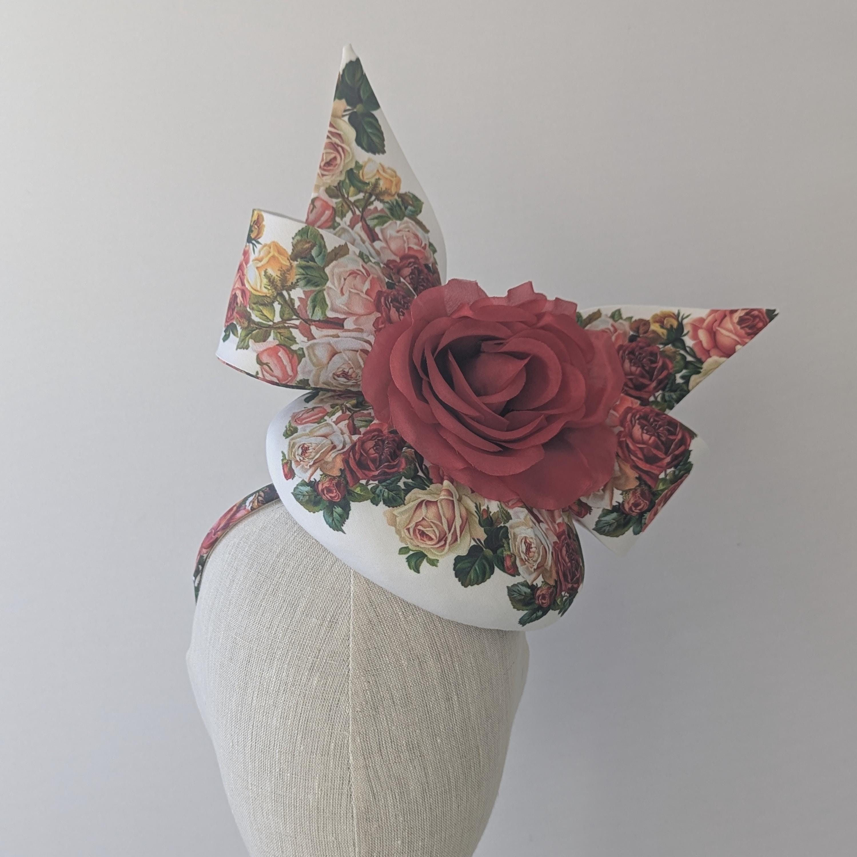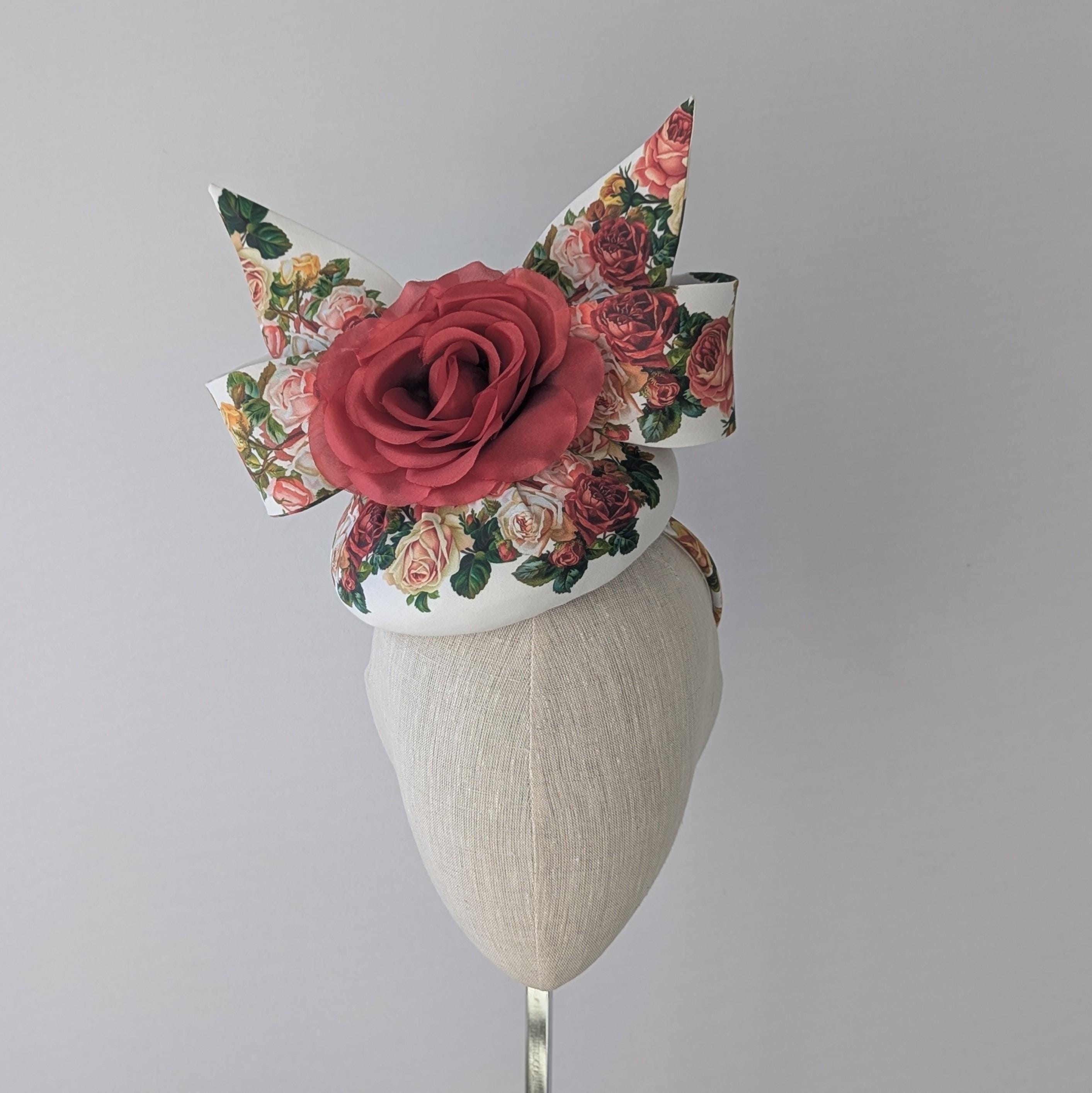 I made this charming hat is in a dramatic floral print with a white background in organic fabric, made the bow in the same fabric and finished it off with a lush red silk rose.
