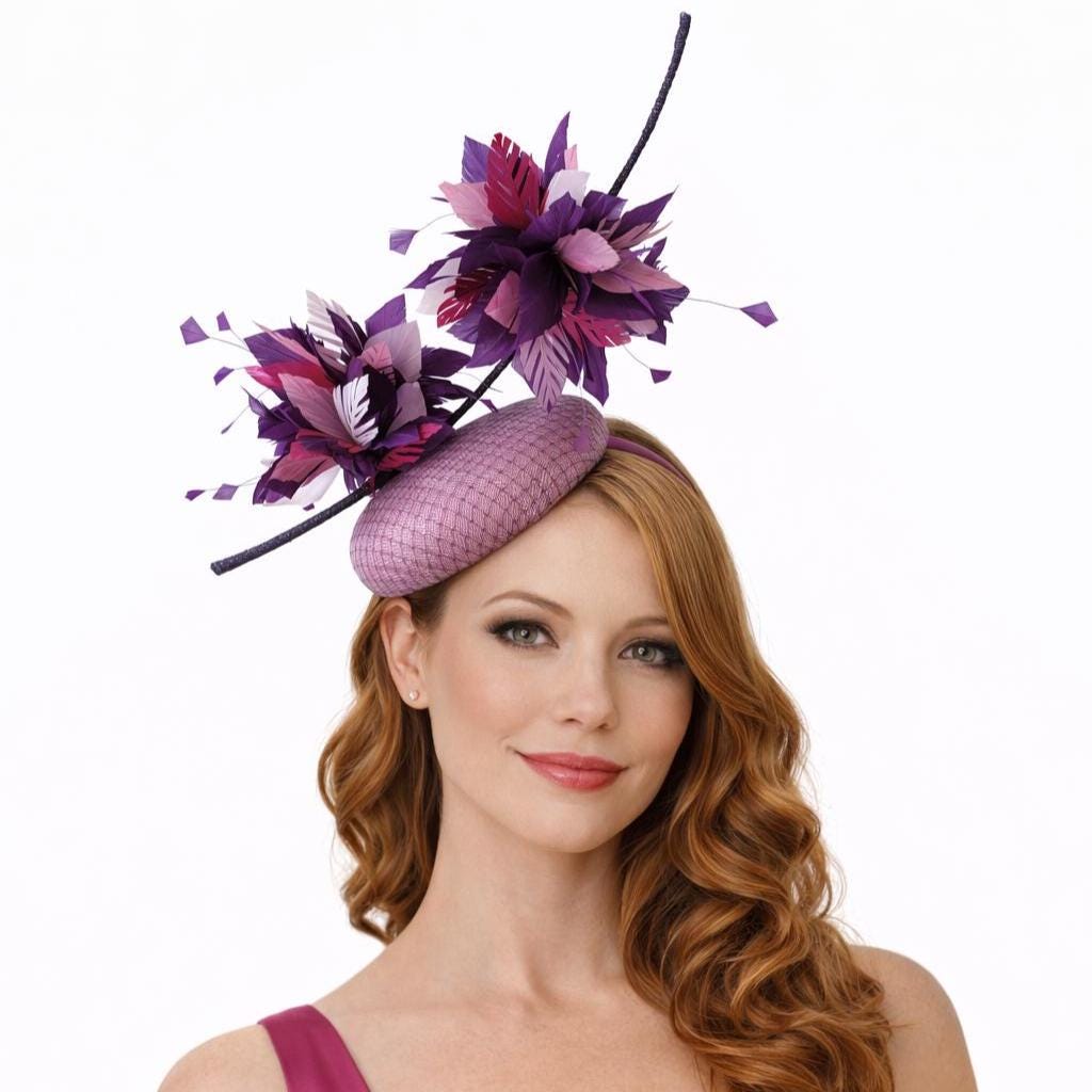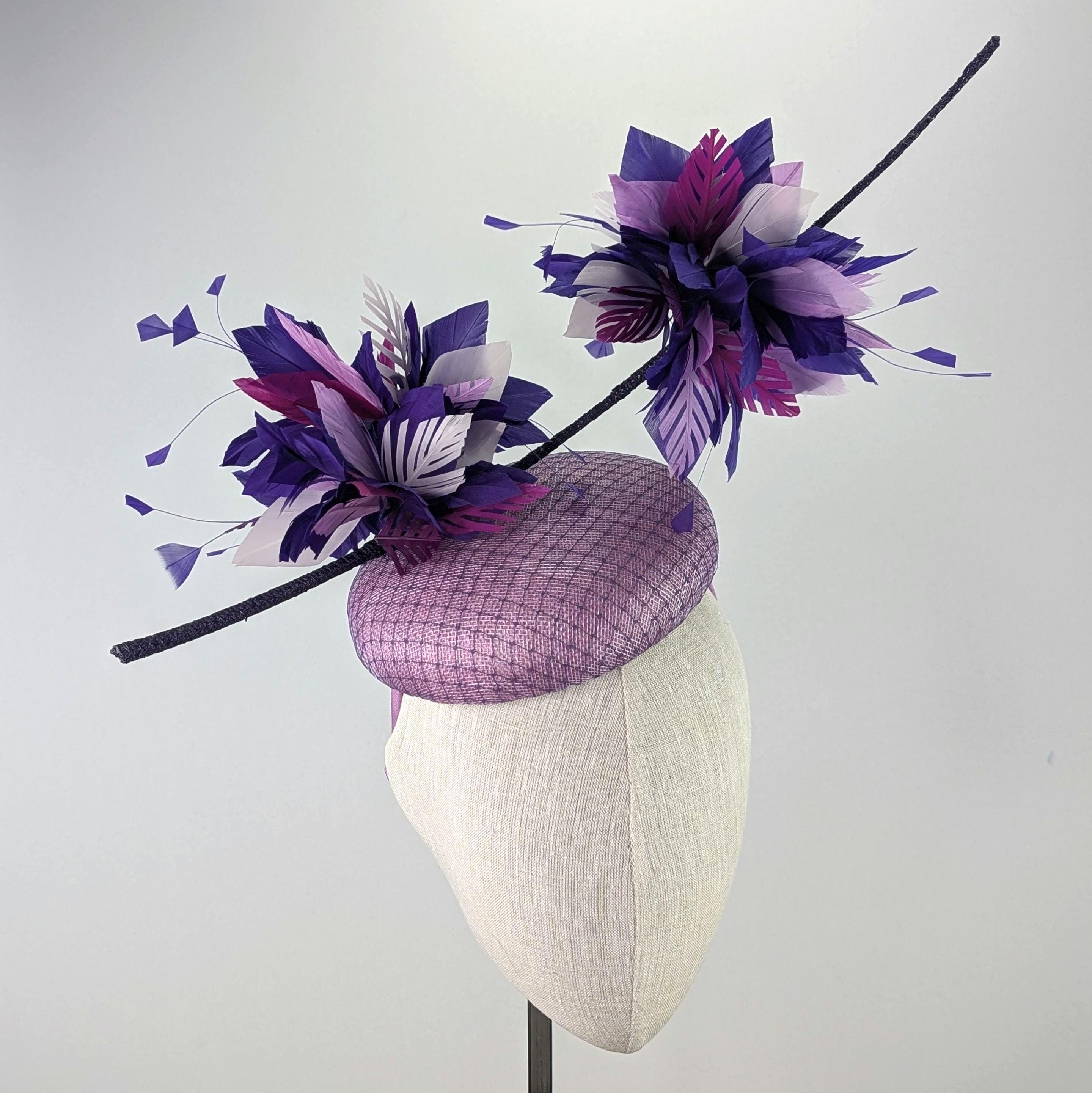 This showstopper cocktail hat is handblocked in orchid color straw. It features lush feathers in a mix of purple, orchid and pink on a handwrapped quill in swiss straw. I also overlayed the base with a fine vintage veiling to tie all of the colors together.