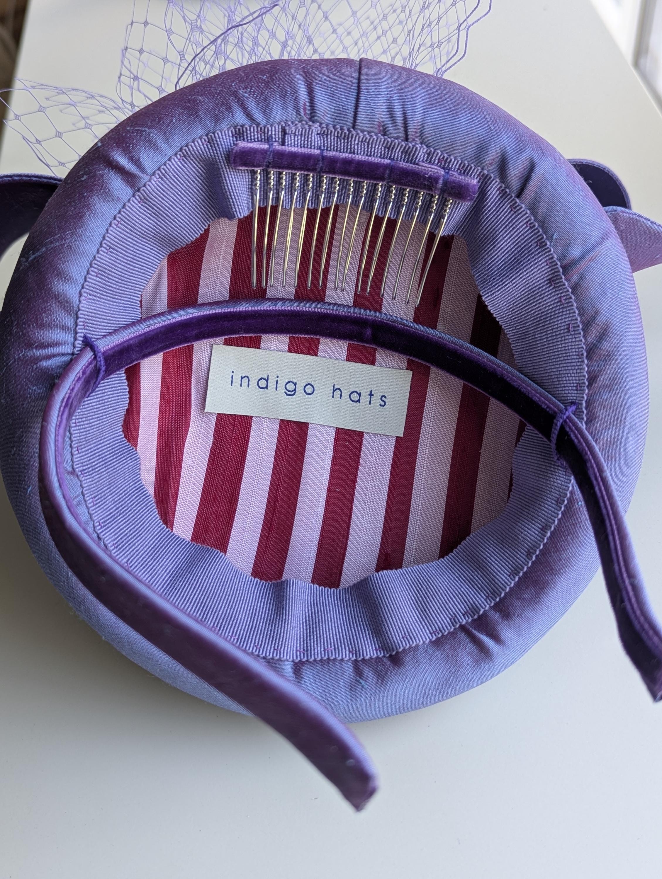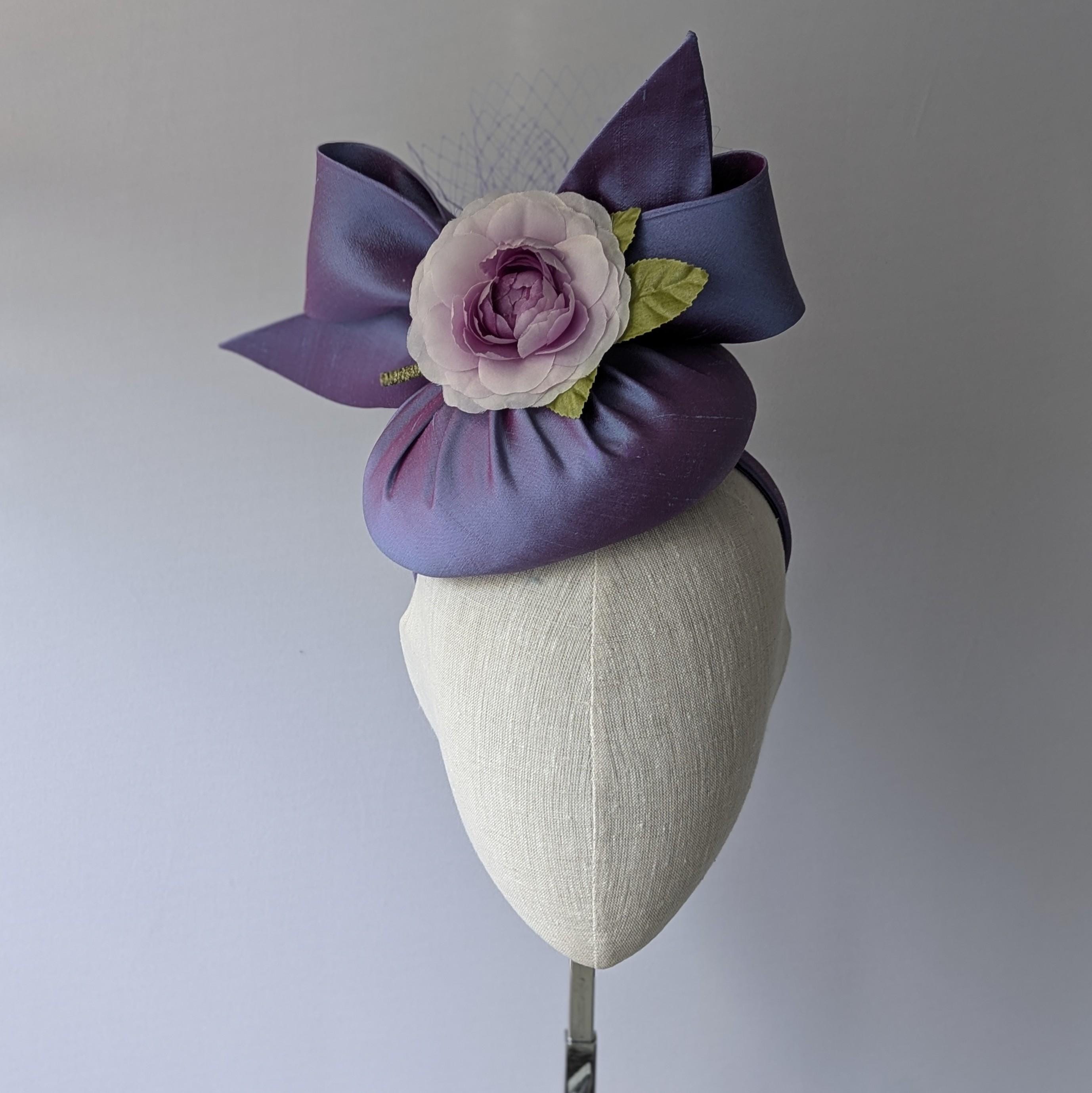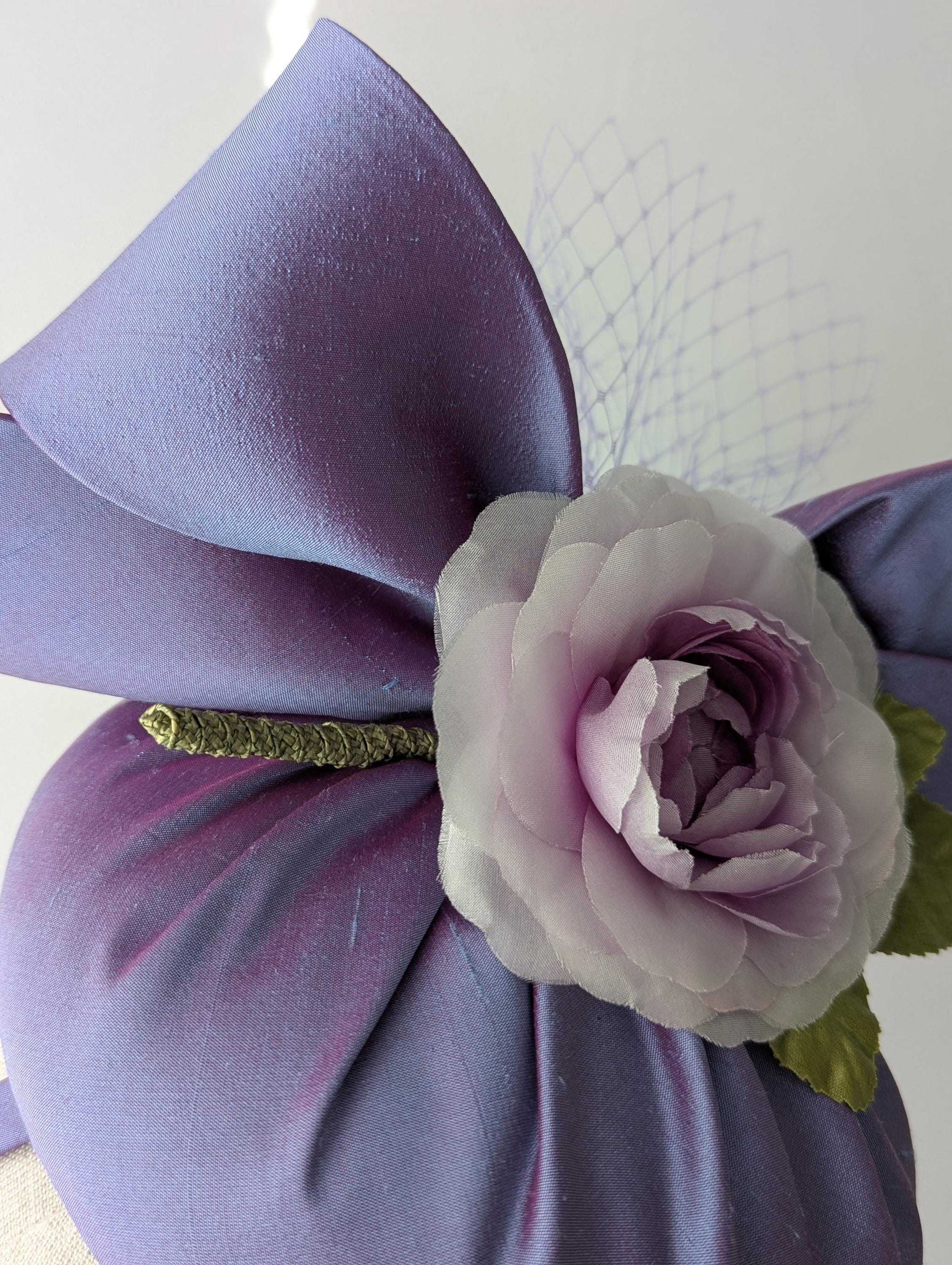 I made this luxe hat in a two tone violet silk, made the bow the same silk and added a charming handmade matching silk camelia flower with leaves and Swiss straw stem. it's finished off with a flurry of matching veiling behind the bow.
