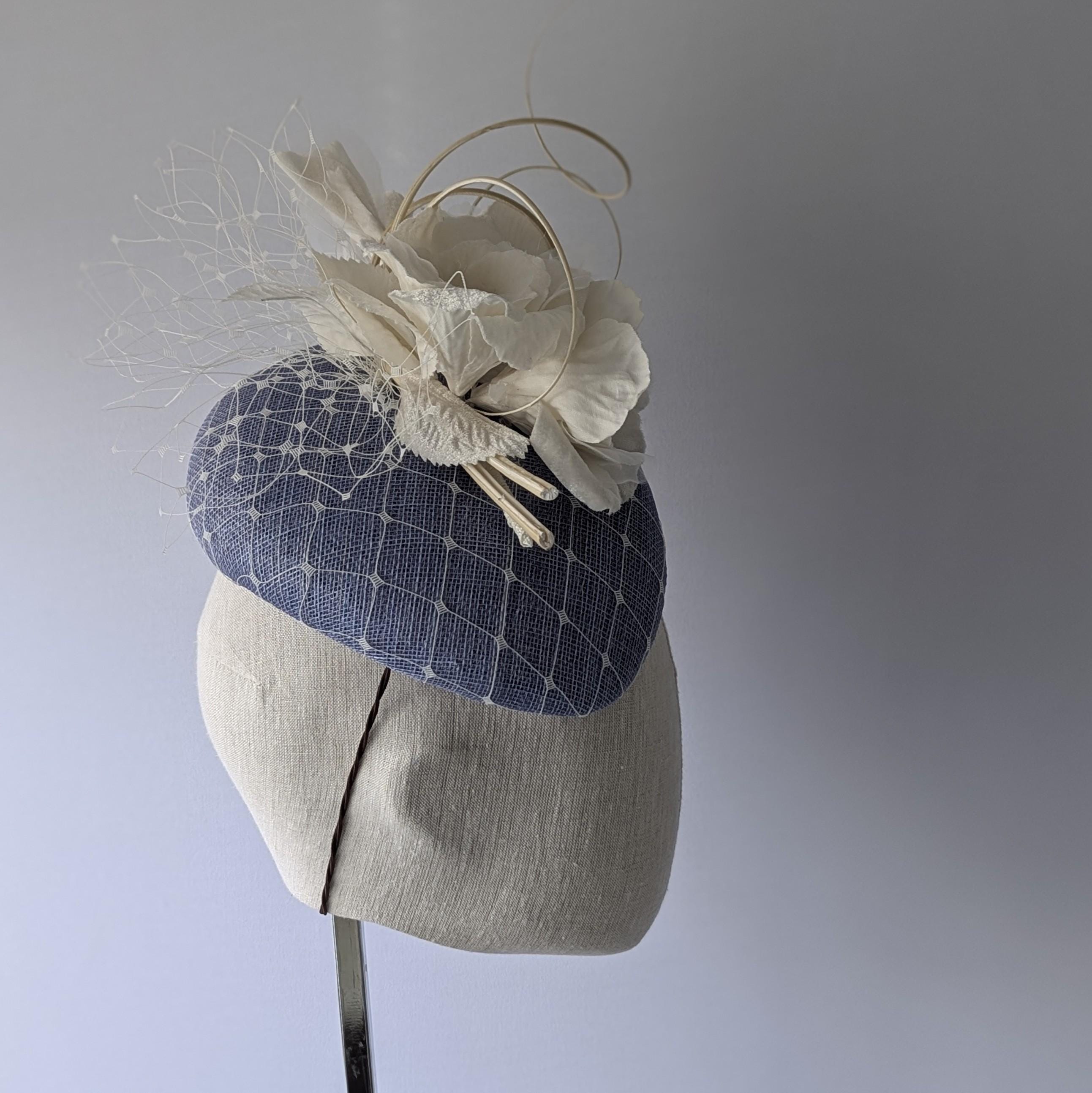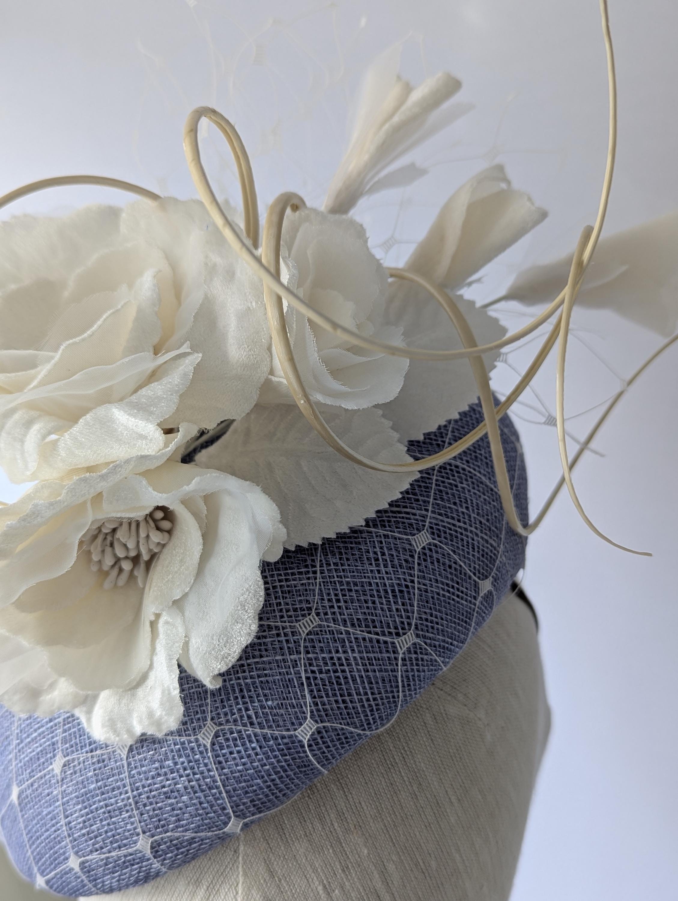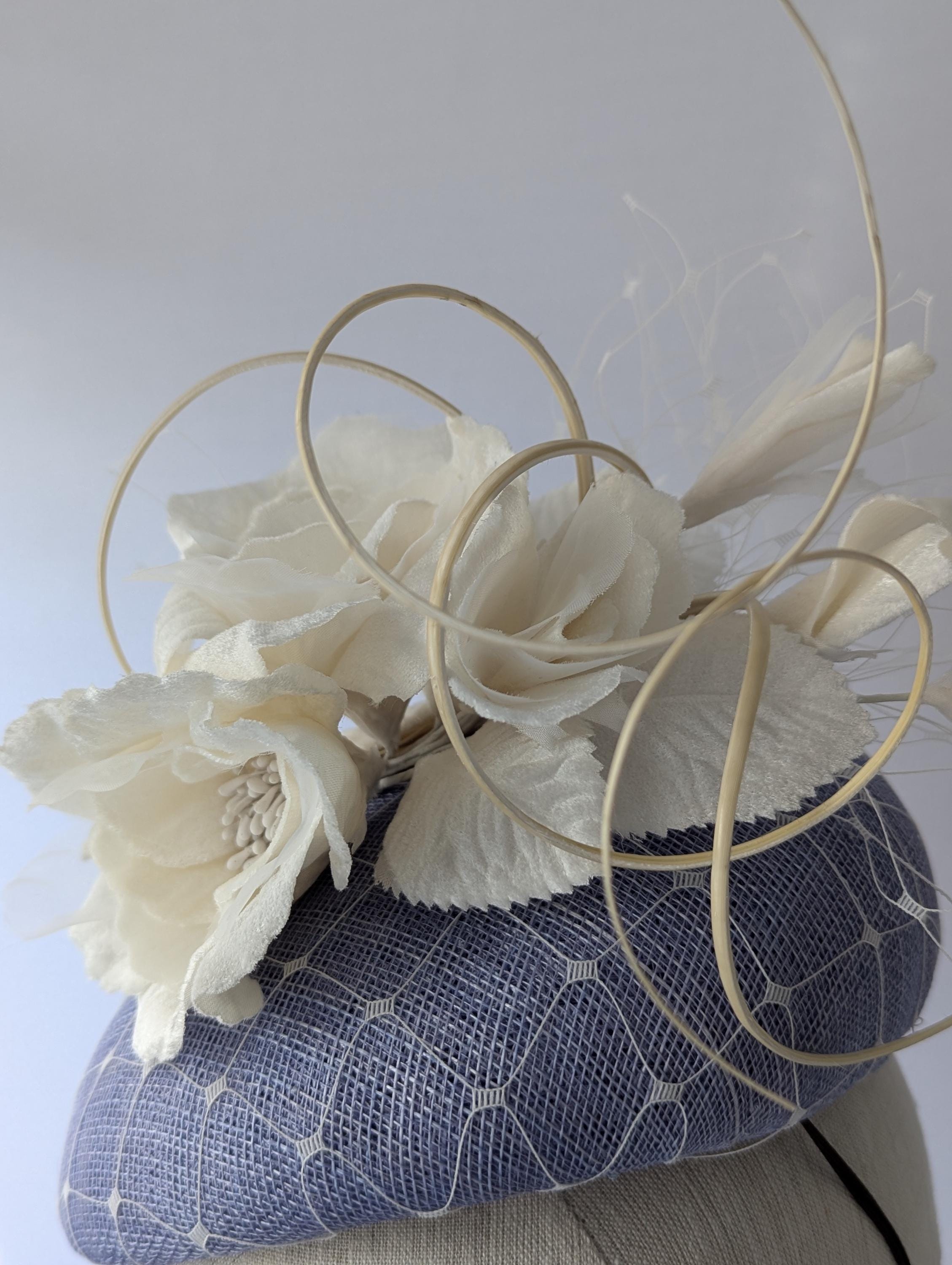 I hand blocked this elegant hat in a periwinkle sinamay straw, its a lovely teardrop shape that hugs the head. It features fabulous cream velvet flowers and buds intwined with hand curled quills which add a lot of drama. I overlayed the base with a vintage style veiling with an extra flourish of the veiling behind the flowers.