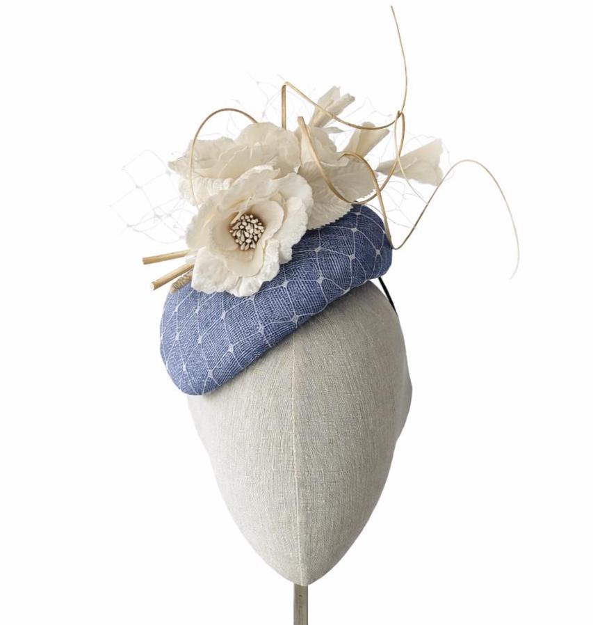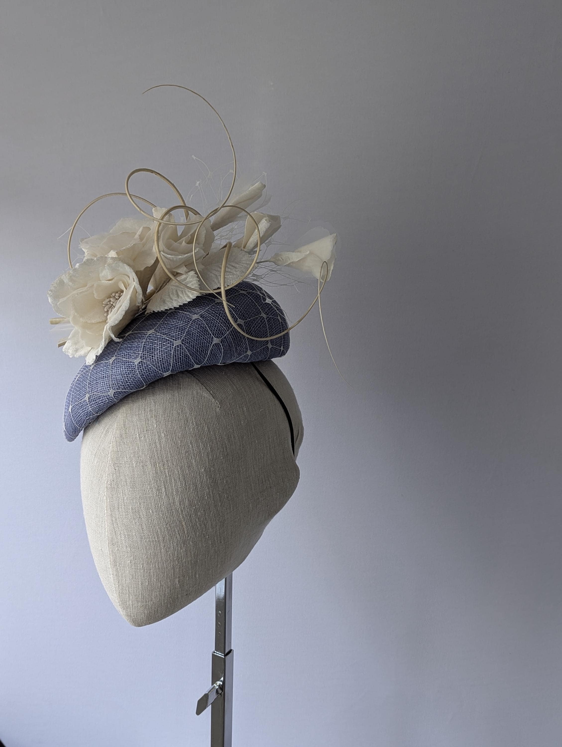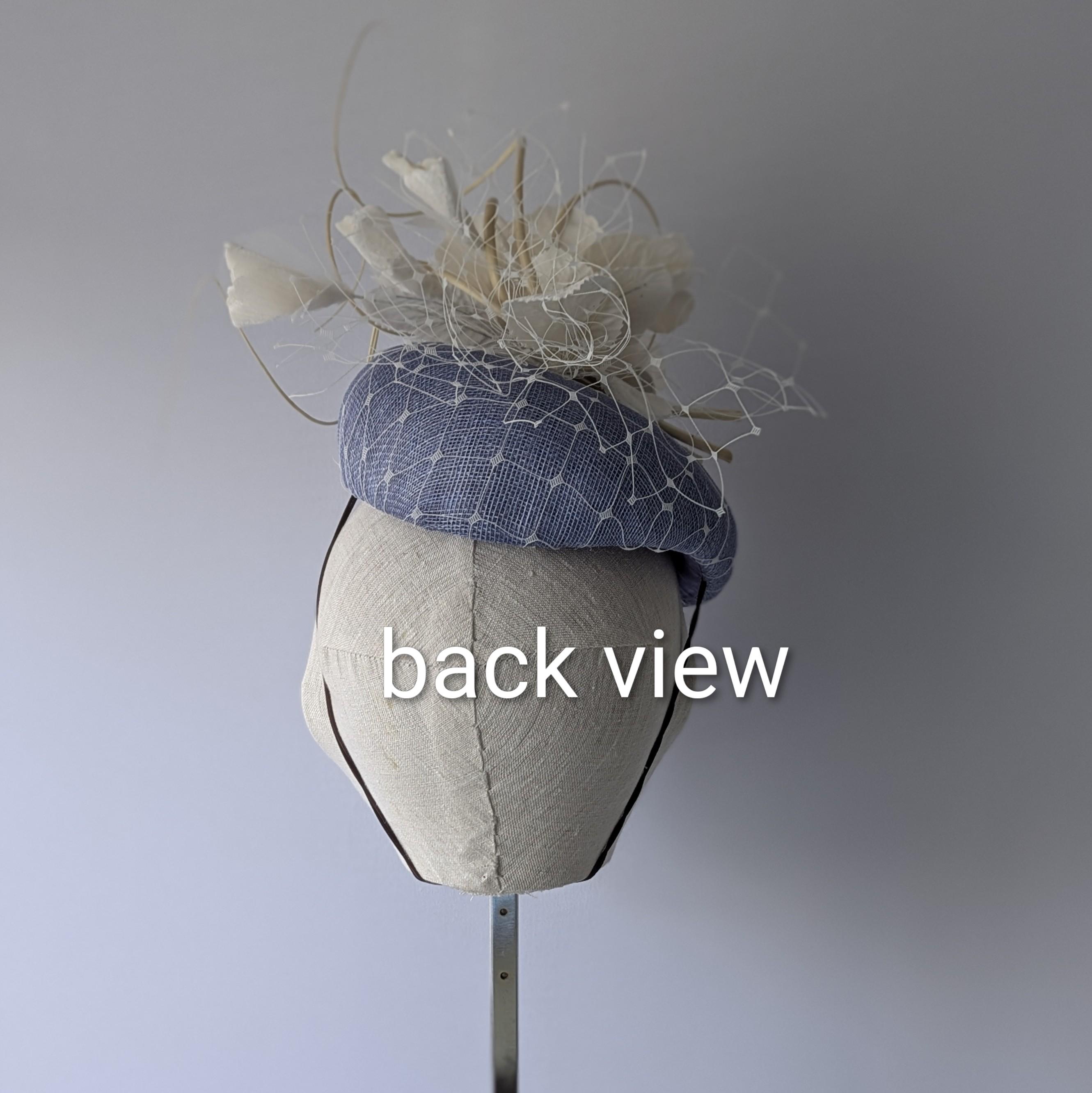 I hand blocked this elegant hat in a periwinkle sinamay straw, its a lovely teardrop shape that hugs the head. It features fabulous cream velvet flowers and buds intwined with hand curled quills which add a lot of drama. I overlayed the base with a vintage style veiling with an extra flourish of the veiling behind the flowers.