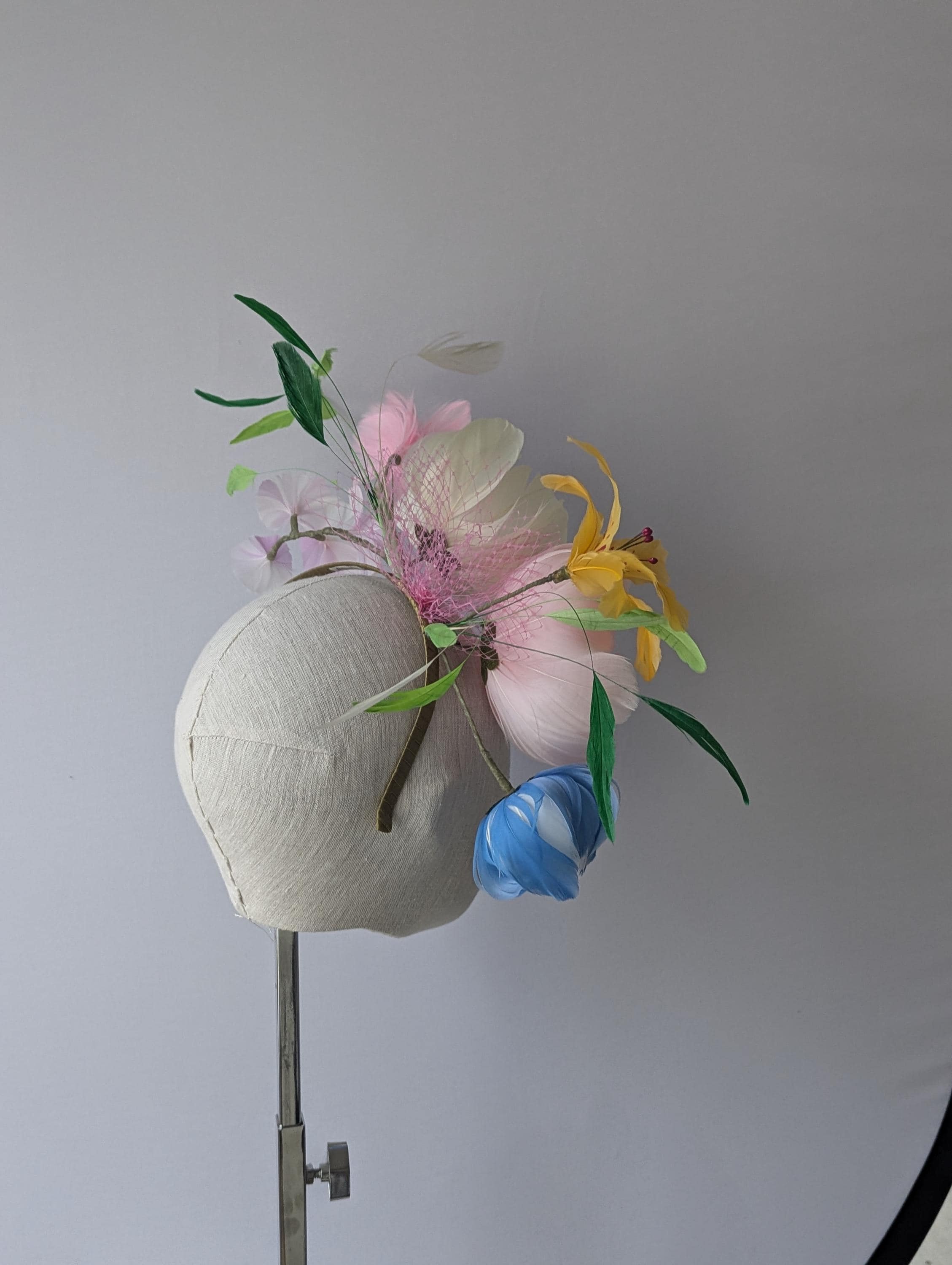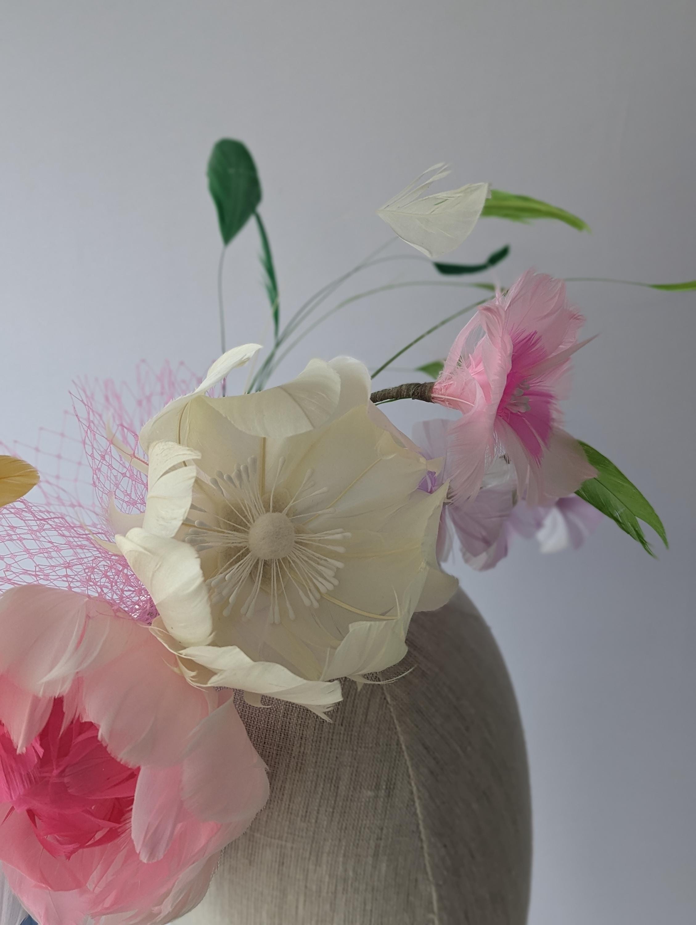 I then trimmed down some coque feathers for a lively flourish of 'leaves'. Its finished off with a little pink veiling around the back.