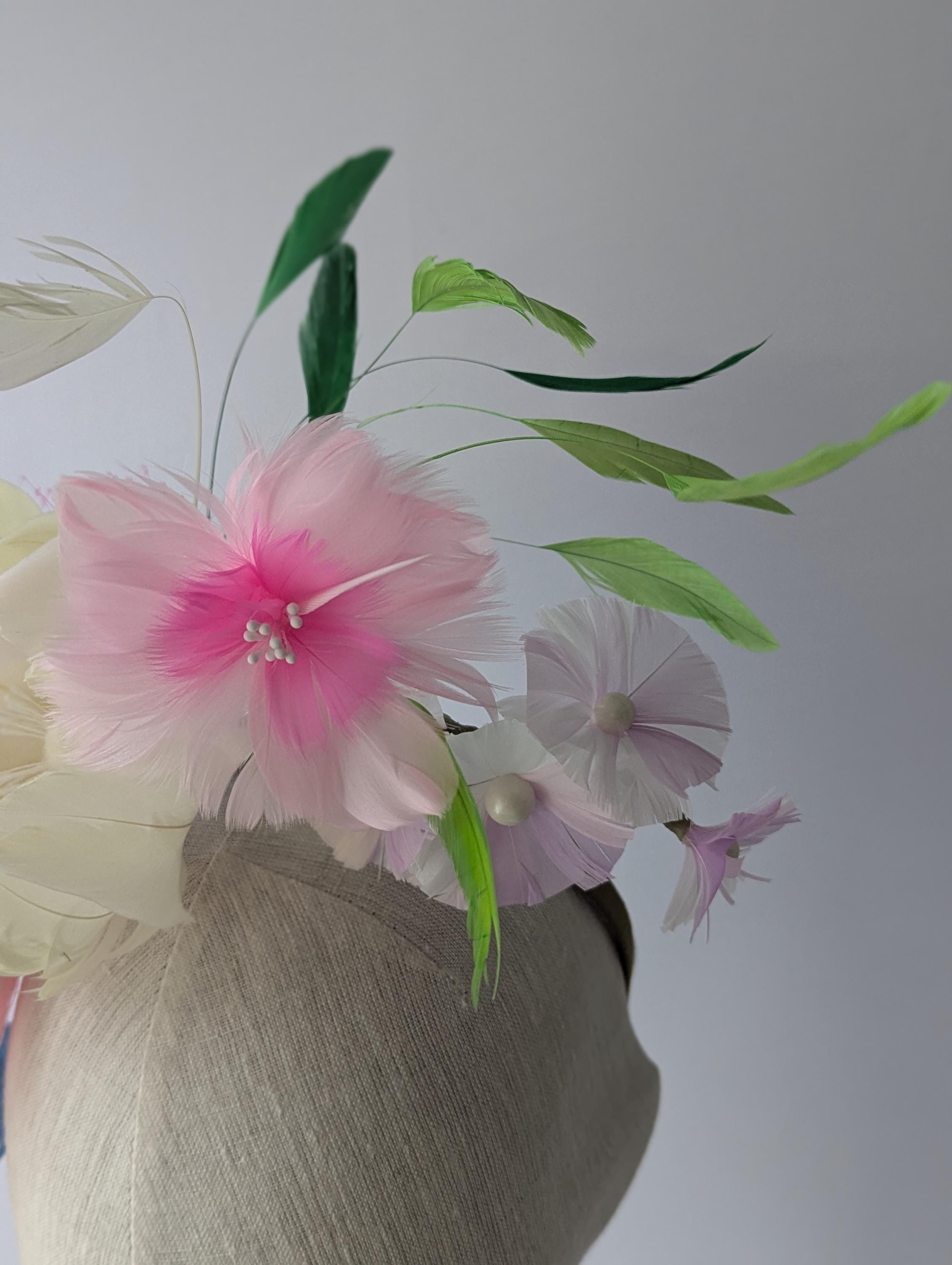 I individually cut and shape each feather ( there are over 100 in each headpiece) and then make them into beautiful flower shapes that are wired and then the stems wrapped in ribbon. They are then thoughtfully arranged to be flattering around your face. The flowers are held on by a handwrapped headband and small haircomb.