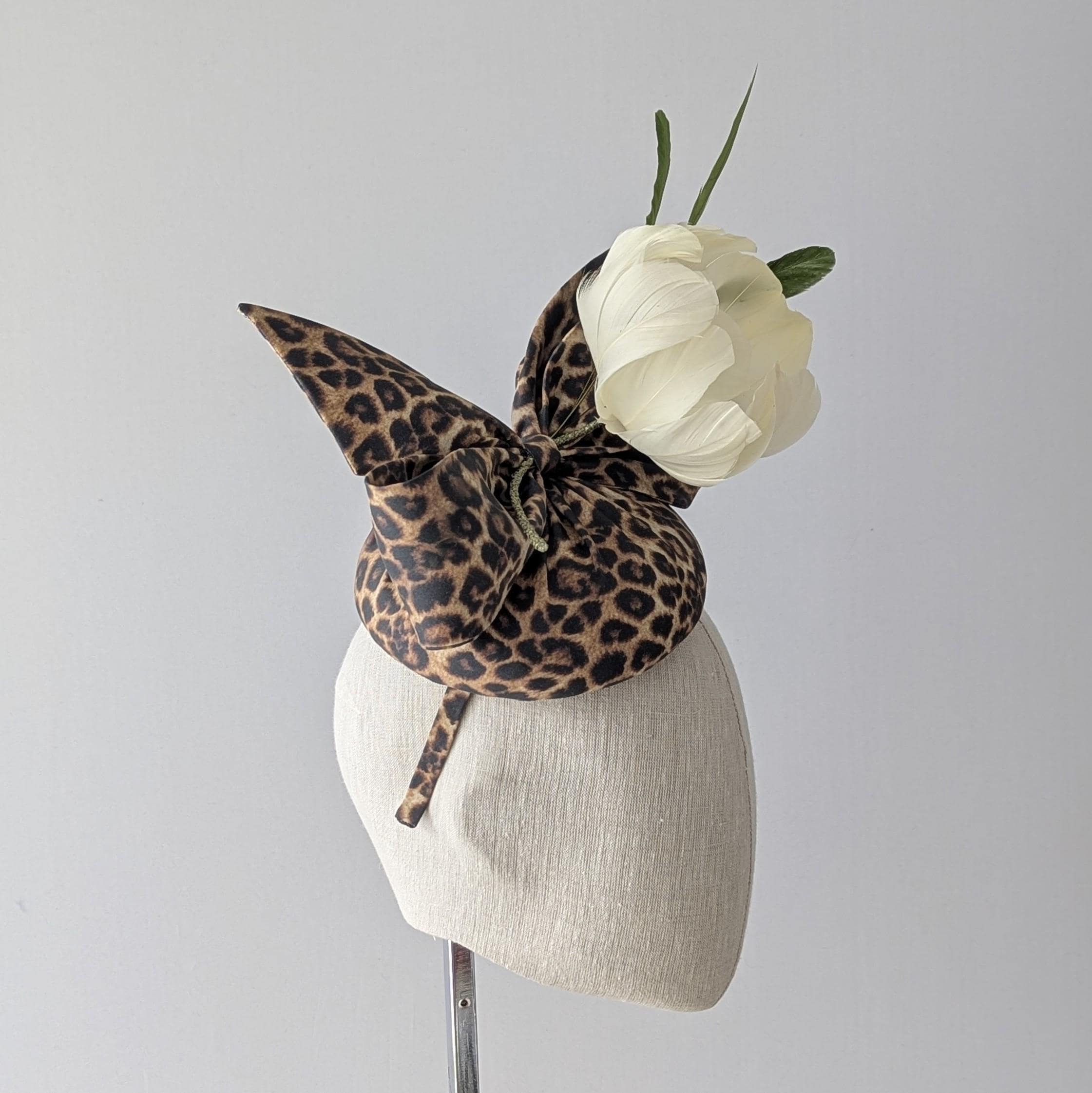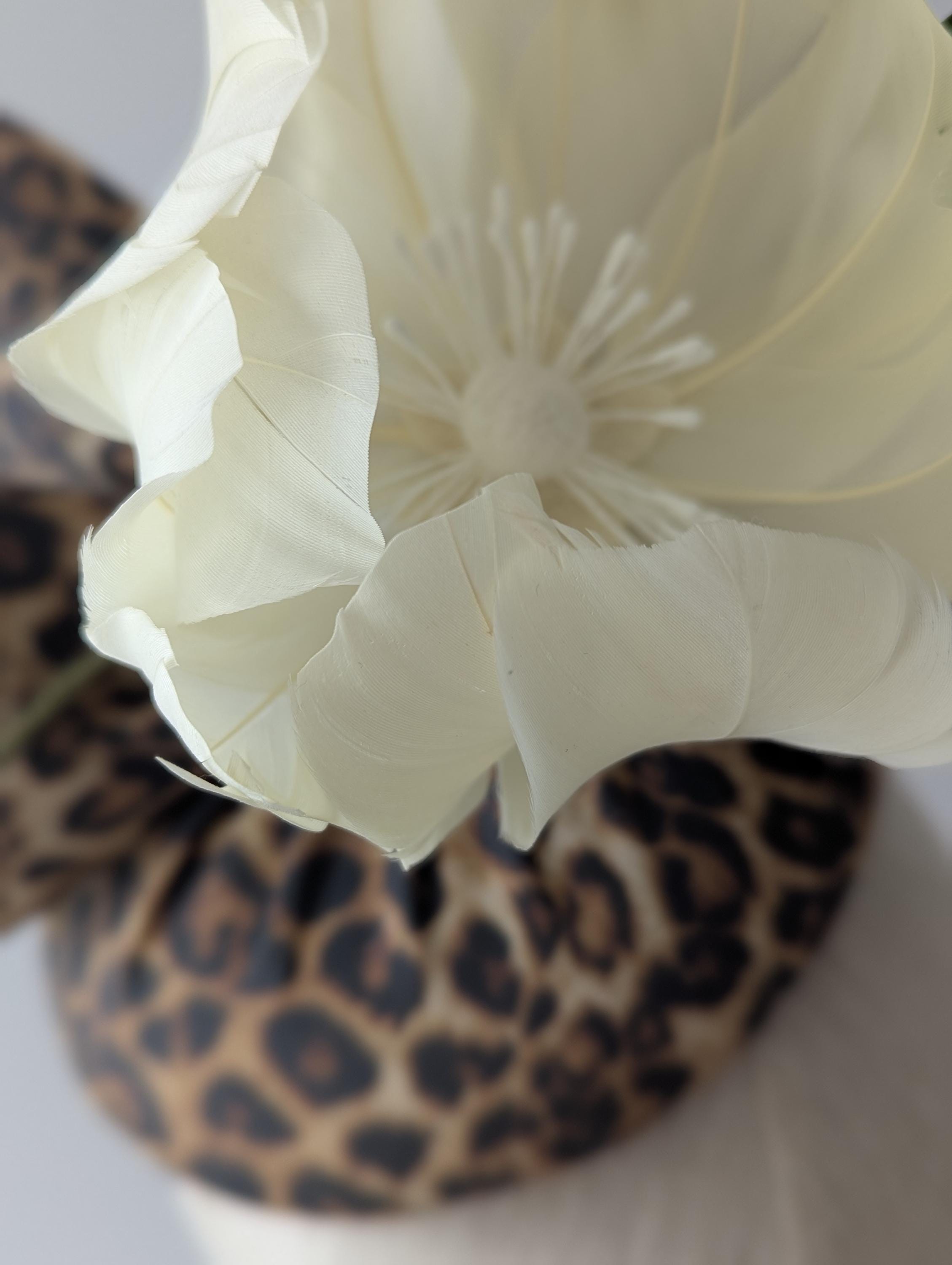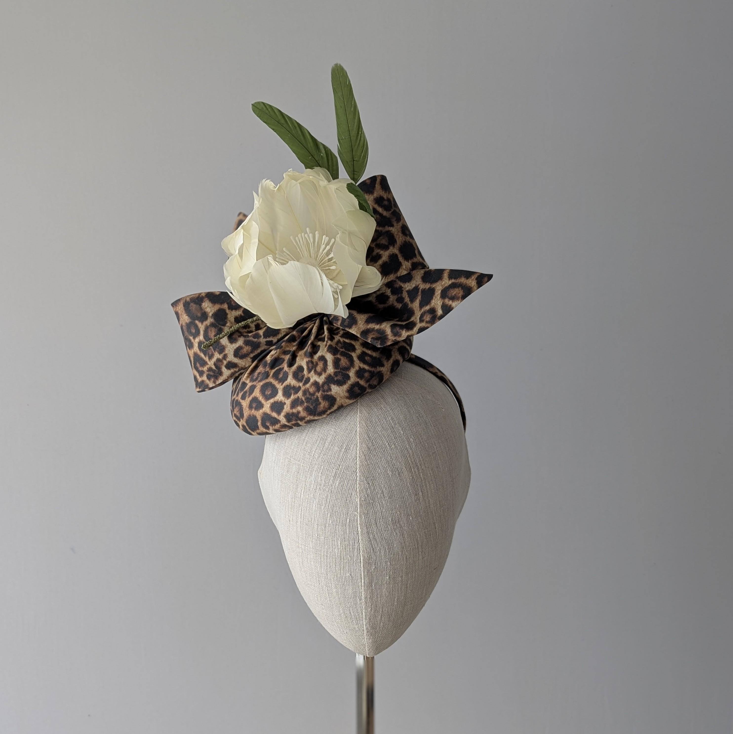 It features a lively bow in the same fabric as the hat and one of my handmade poppies in a gorgeous creamy color, I stripped some coque feather 'leaves' to add a lively movement to it too - definitely has that wow appeal!