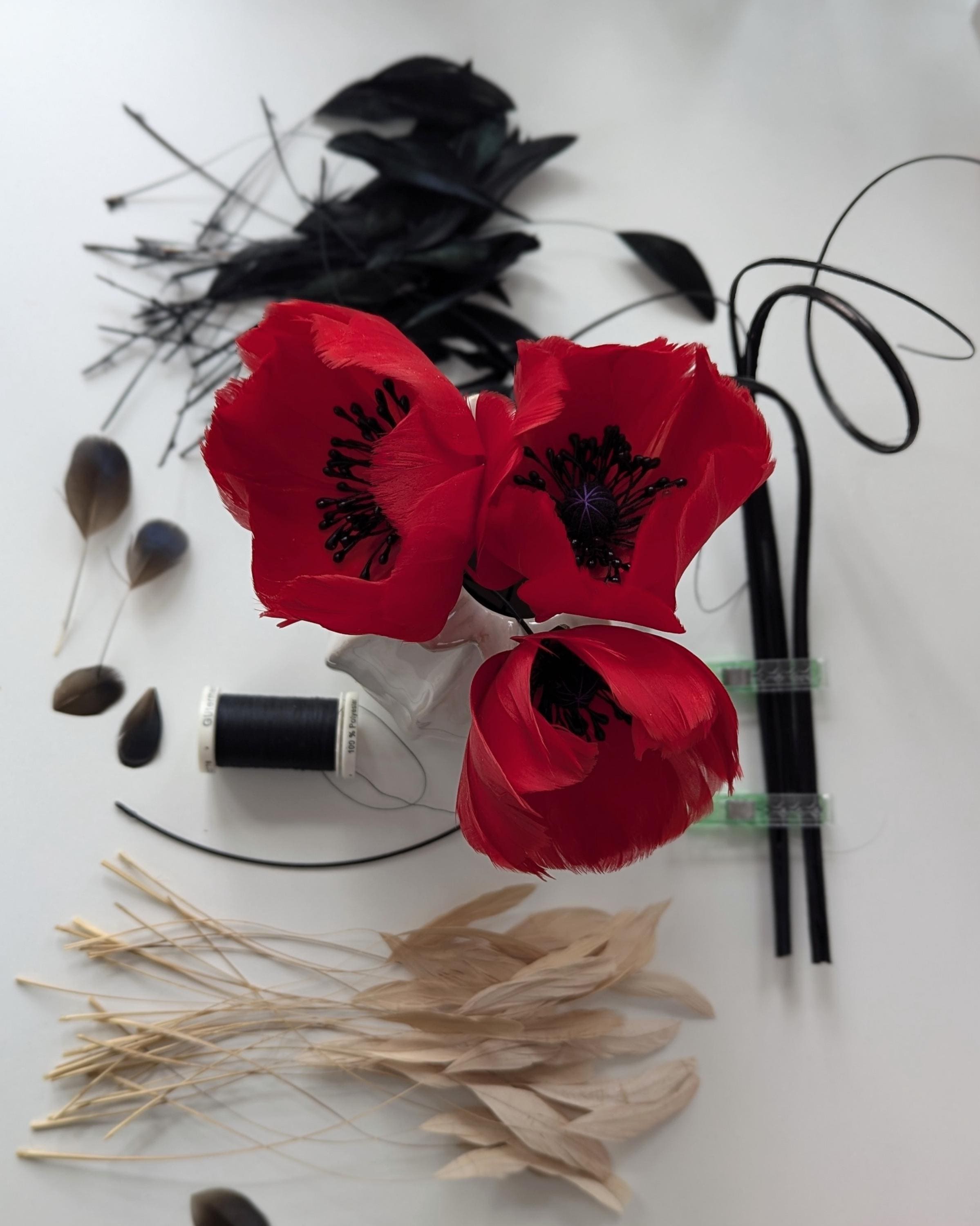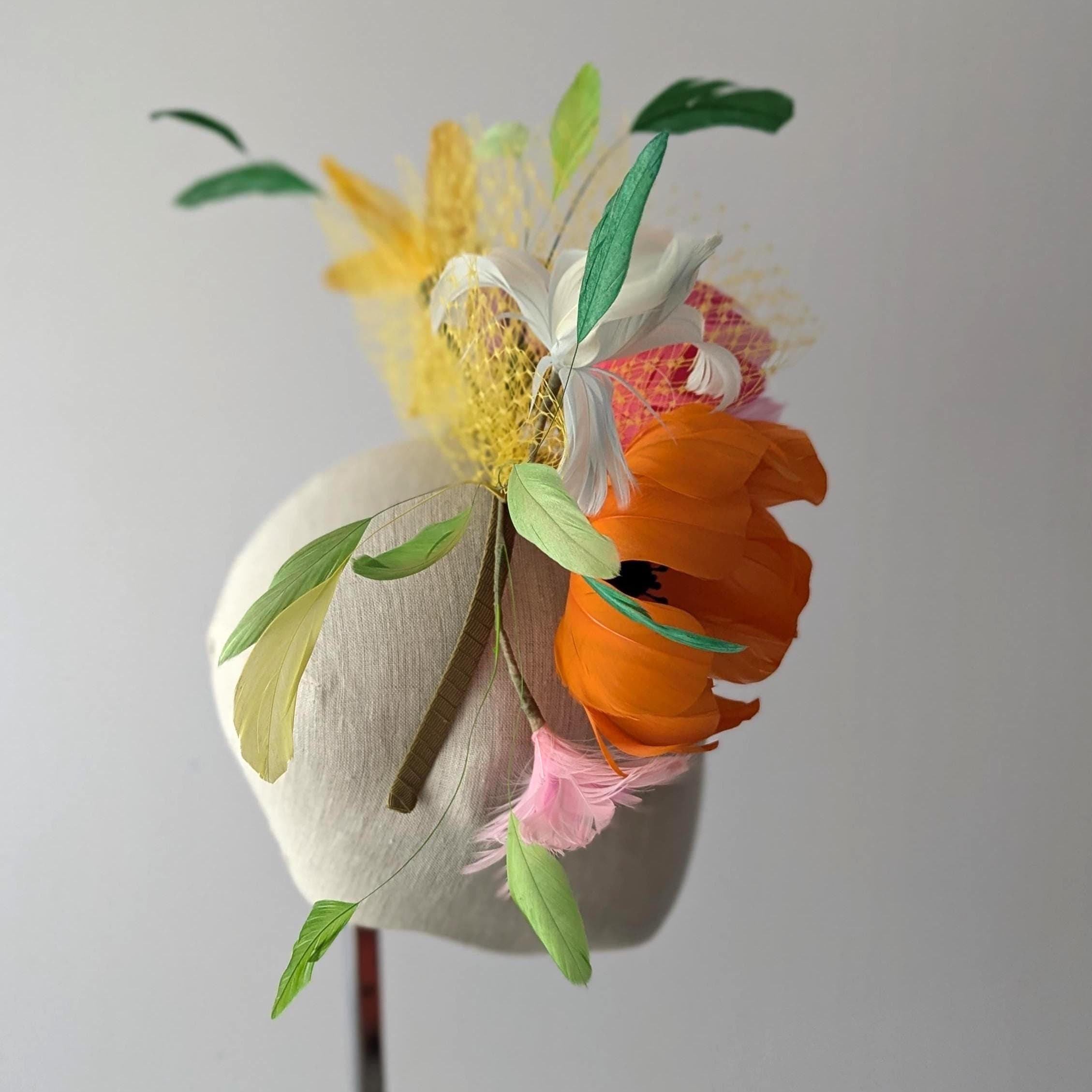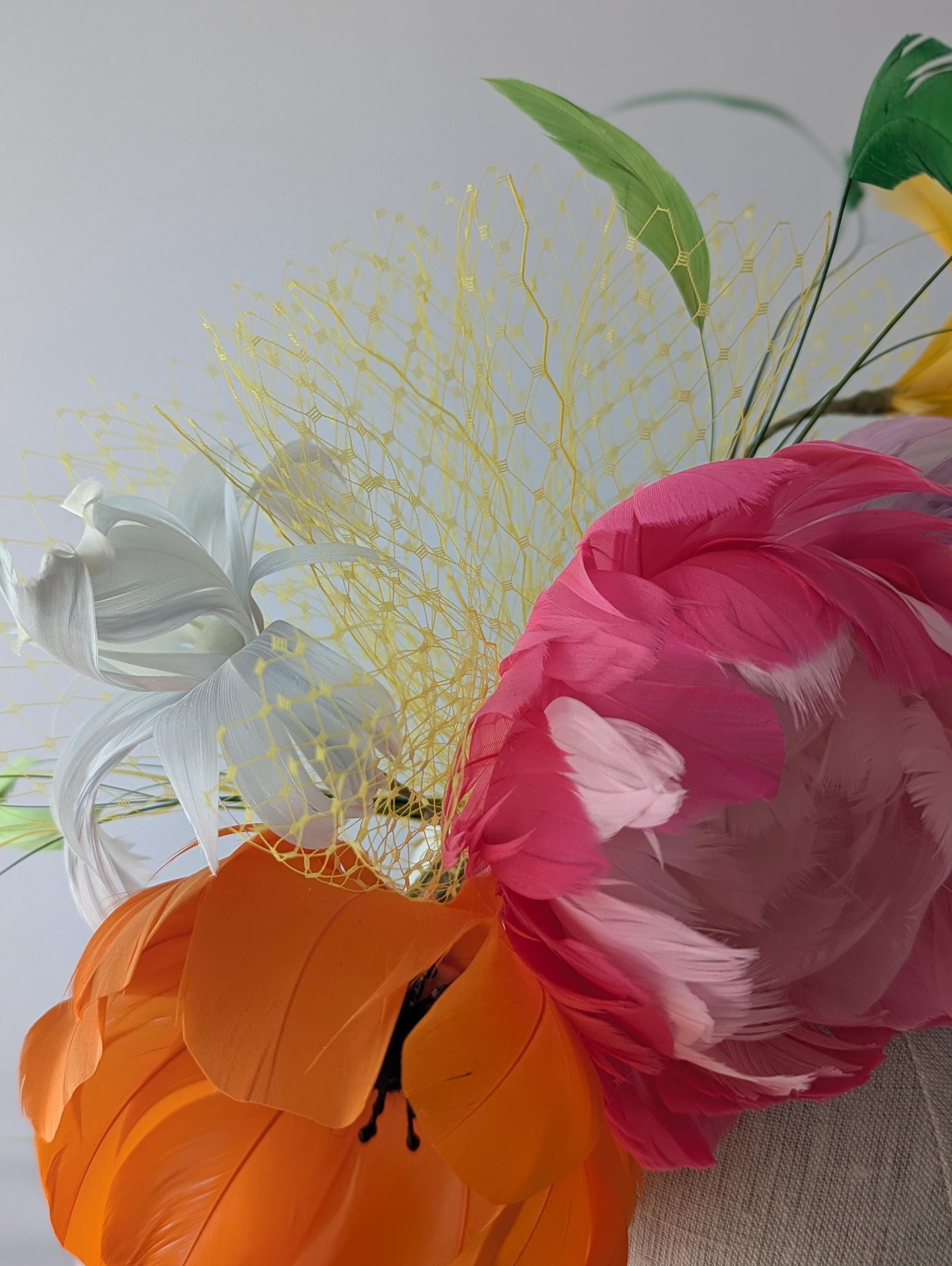 I individually cut and shape each feather ( there are over 100 in each headpiece) and then make them into beautiful flower shapes that are wired and then the stems wrapped in ribbon. They are then thoughtfully arranged to be flattering around your face. I then trimmed down some coque feathers for a lively flourish of 'leaves'. The flowers are held on by a handwrapped headband and small haircomb.