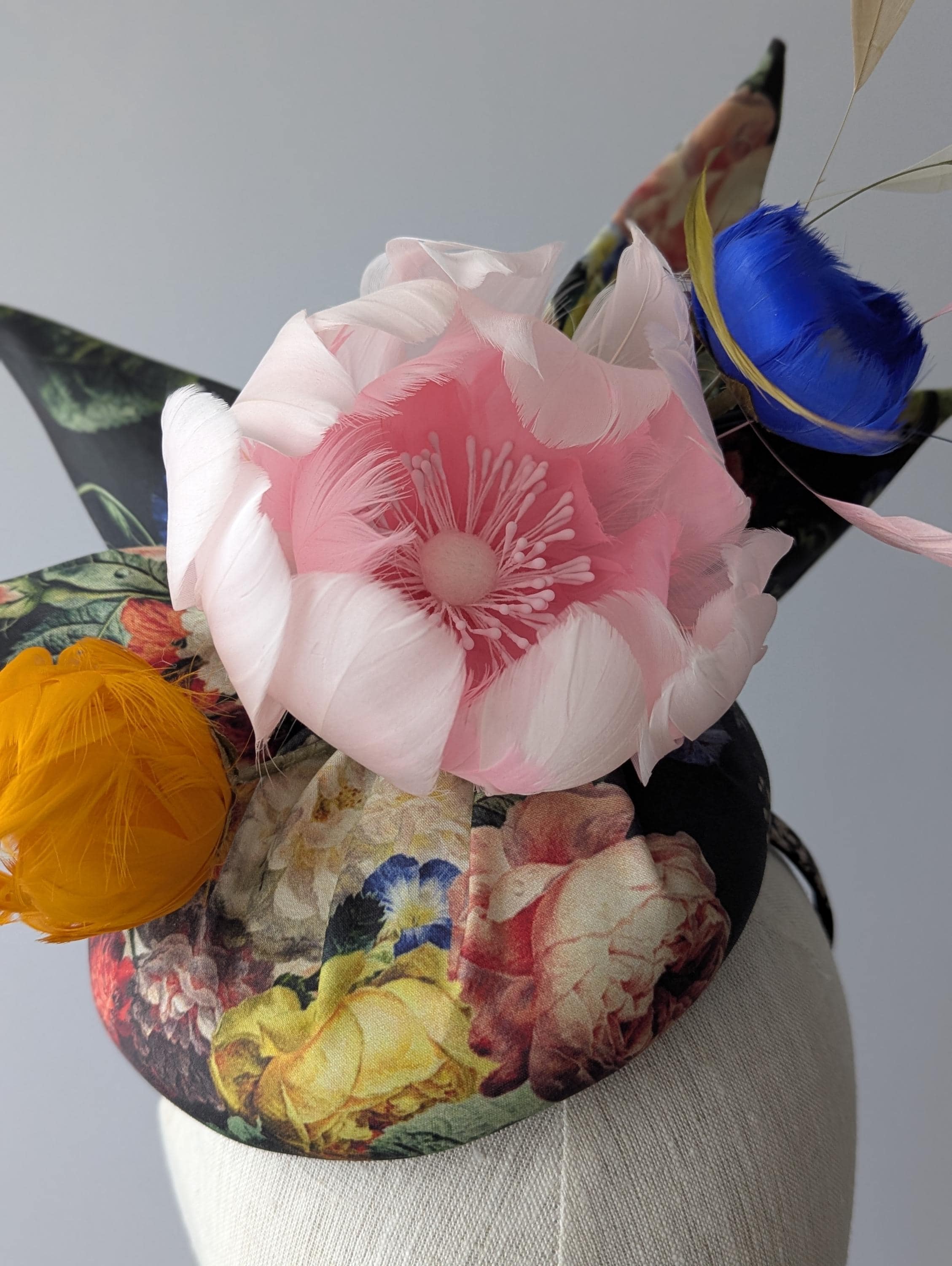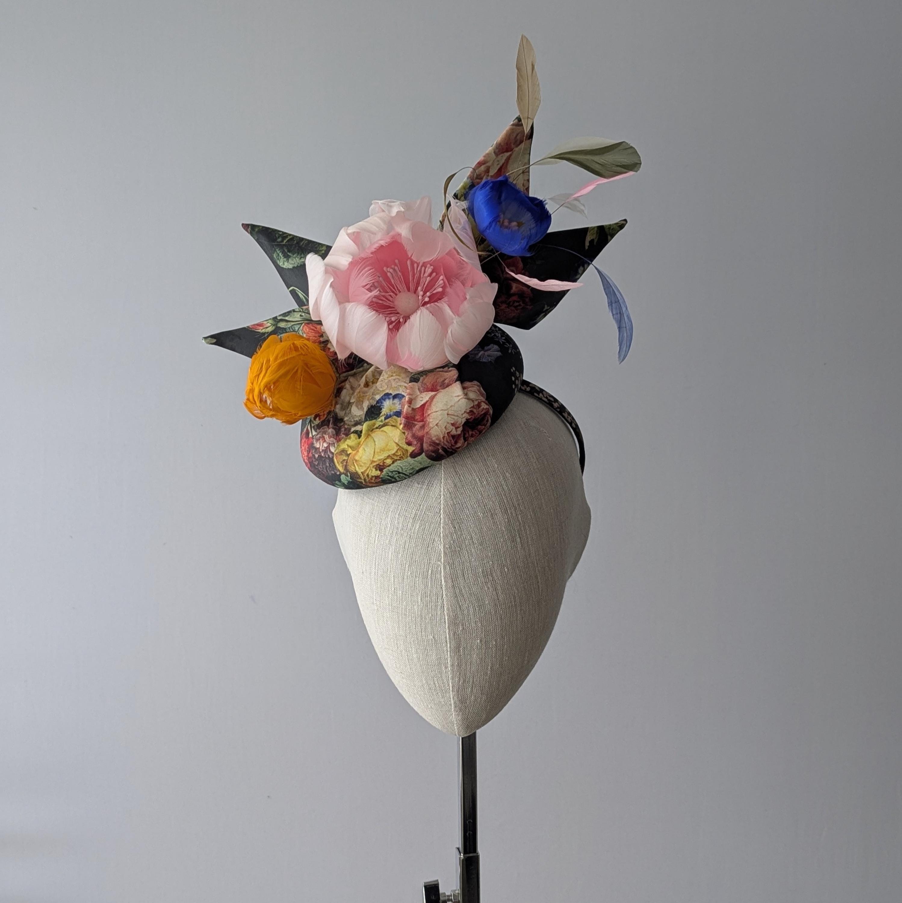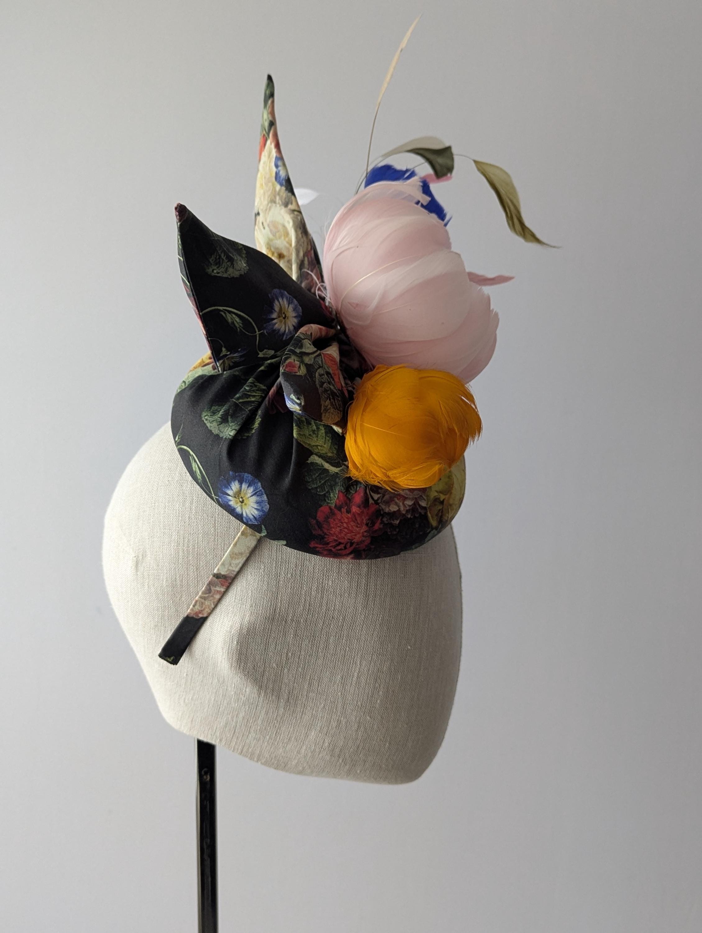 I made this charming hat from a dramatic baroque floral print organic fabric, made the perky bow in the same fabric and then made a lovely plump pink feather rose, orange bud and blue morning glory. I finished it off with some lively coque feathers that always add lovely movement.