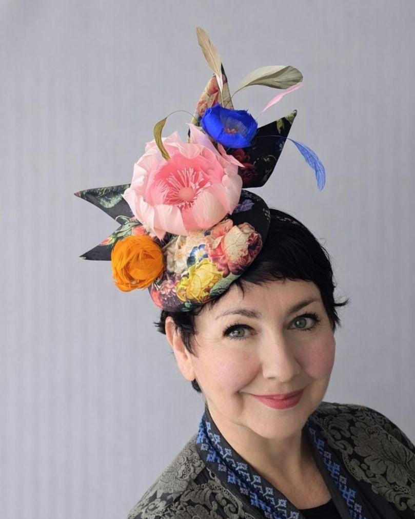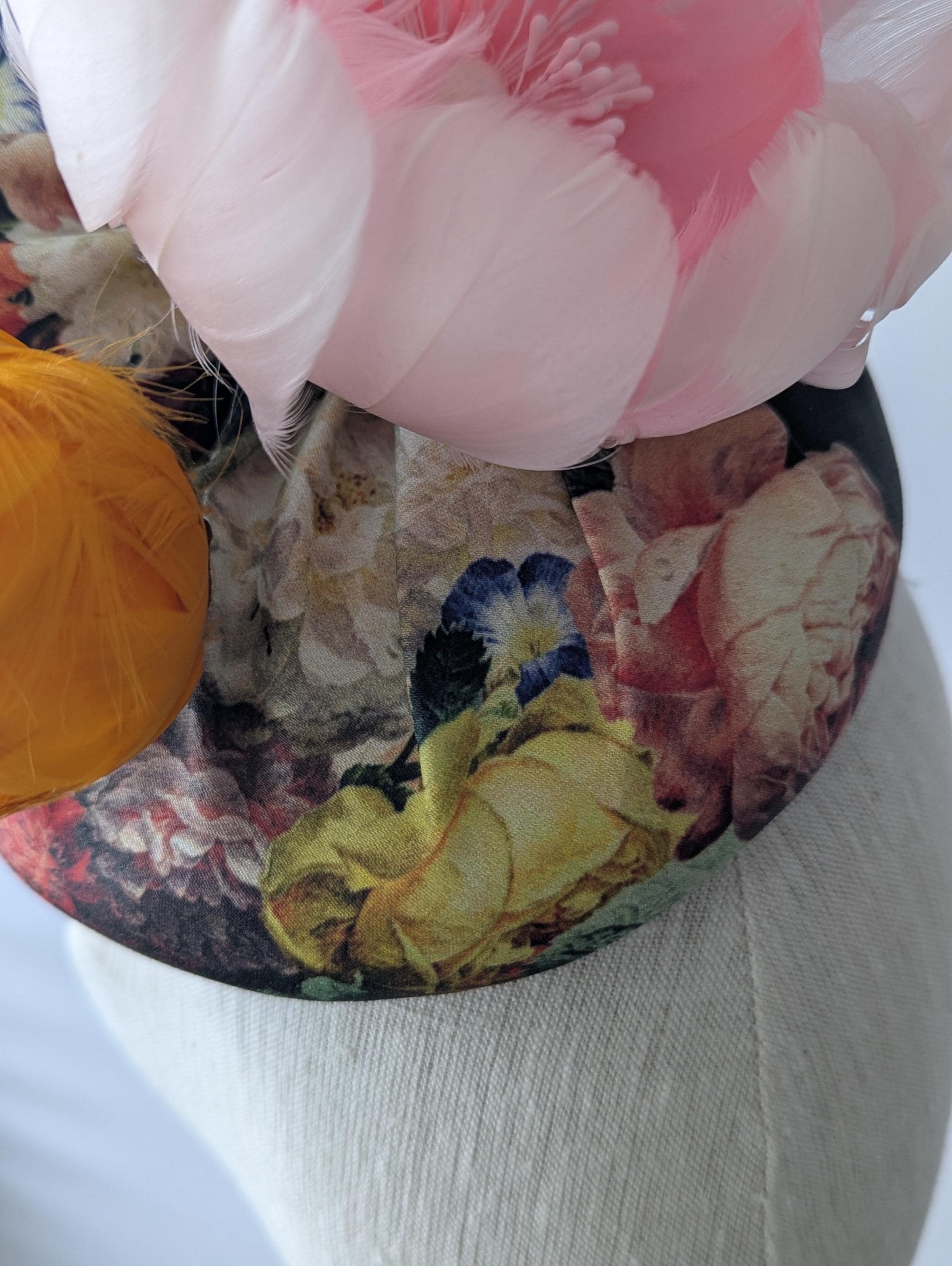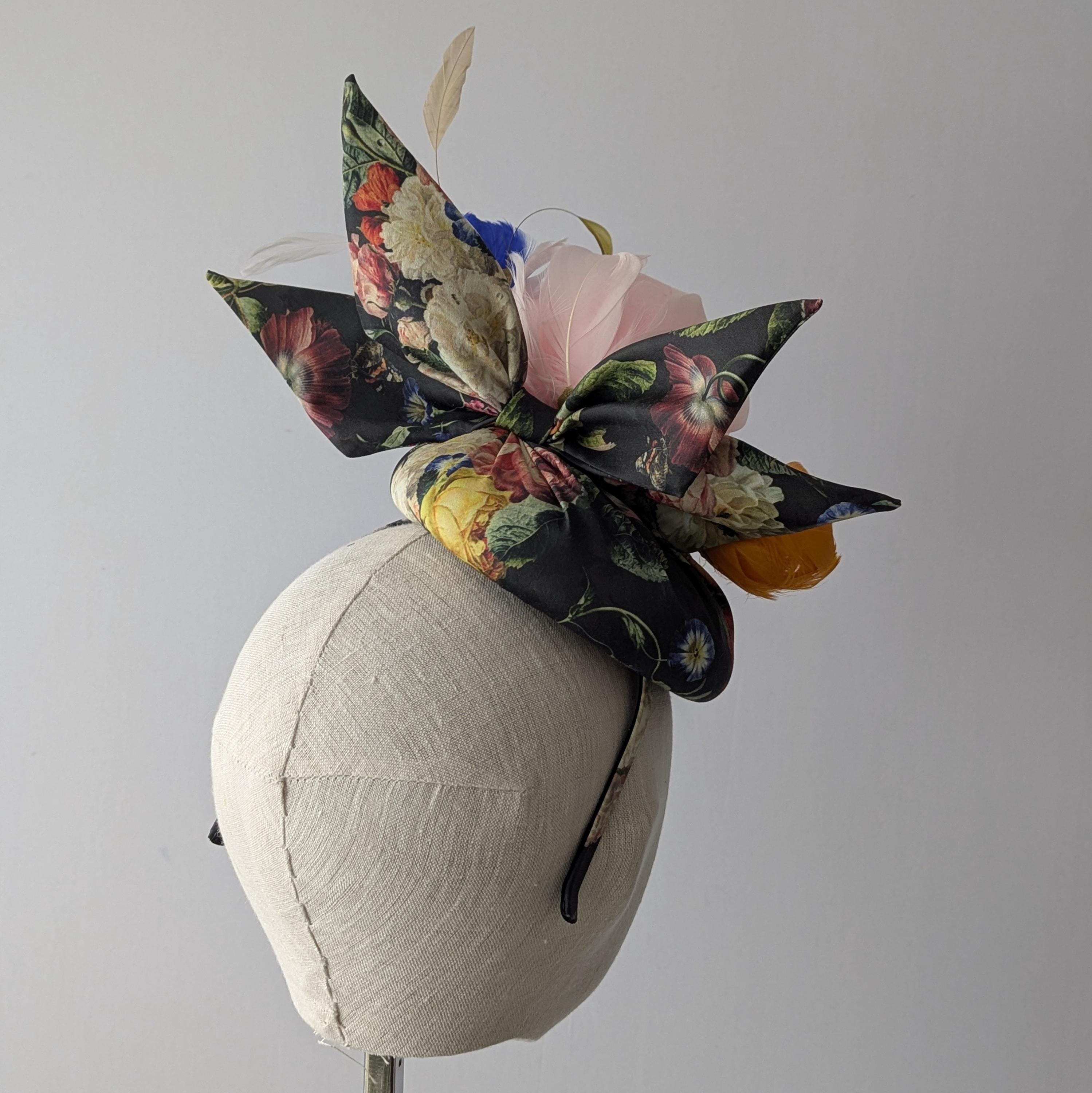 I made this charming hat from a dramatic baroque floral print organic fabric, made the perky bow in the same fabric and then made a lovely plump pink feather rose, orange bud and blue morning glory. I finished it off with some lively coque feathers that always add lovely movement.