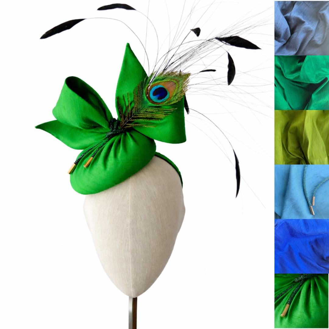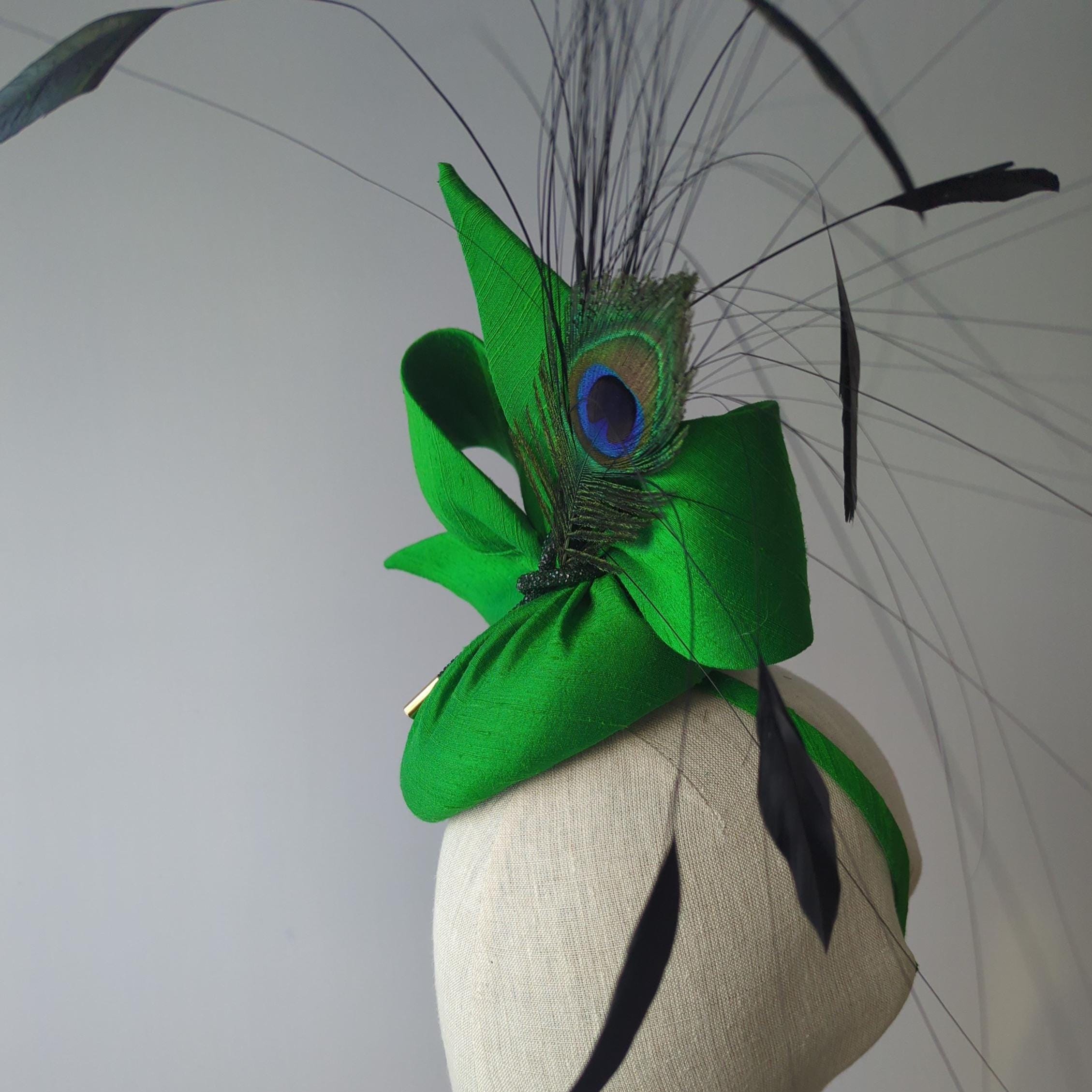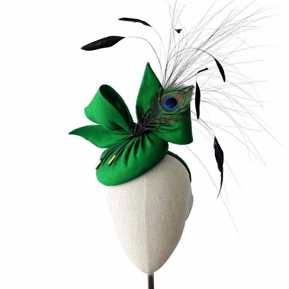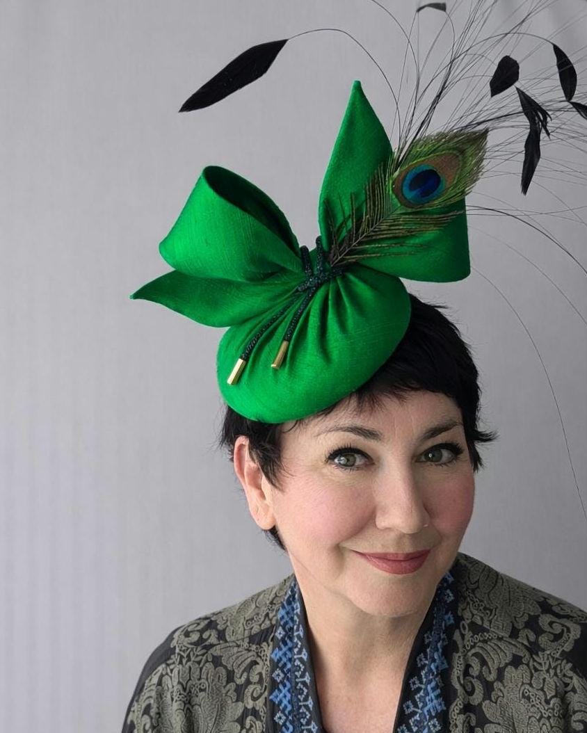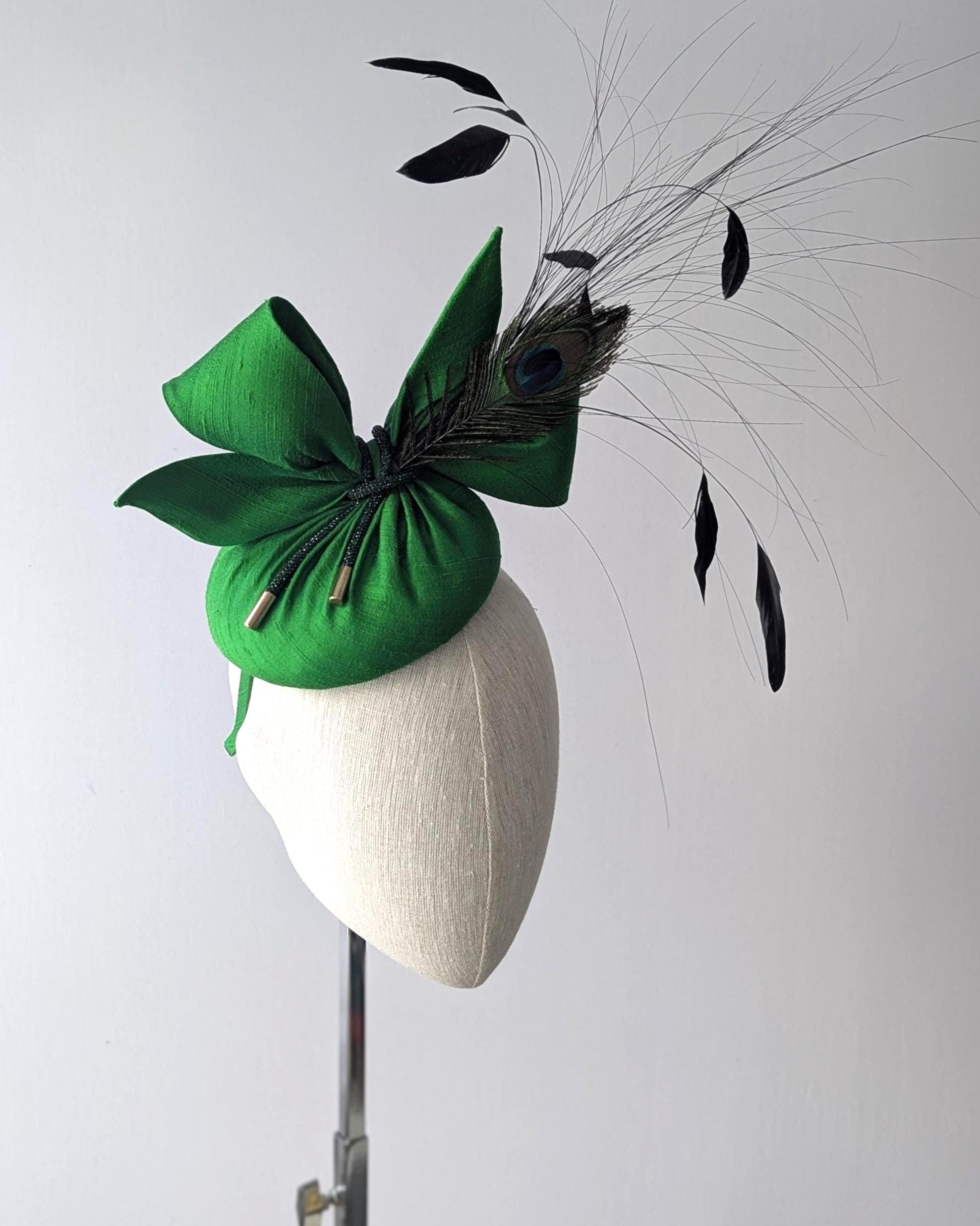 I made this showstopper hat in a luxurious green dupioni silk, made a matching contemporary bow and then made a lively grouping of iridescent coque feathers, peacock hurl, and a then trimmed a peacock feather to tie in with the lovely jewel tone of the hat. I then added an emerald green rhinestone cord and I finished it off with gold tips to add even more glamour.