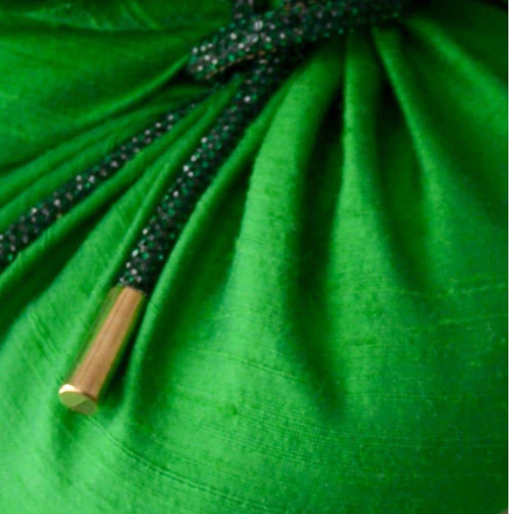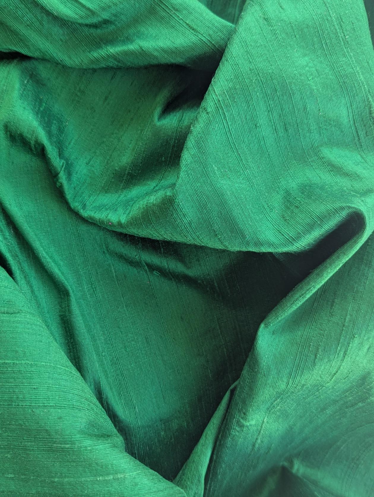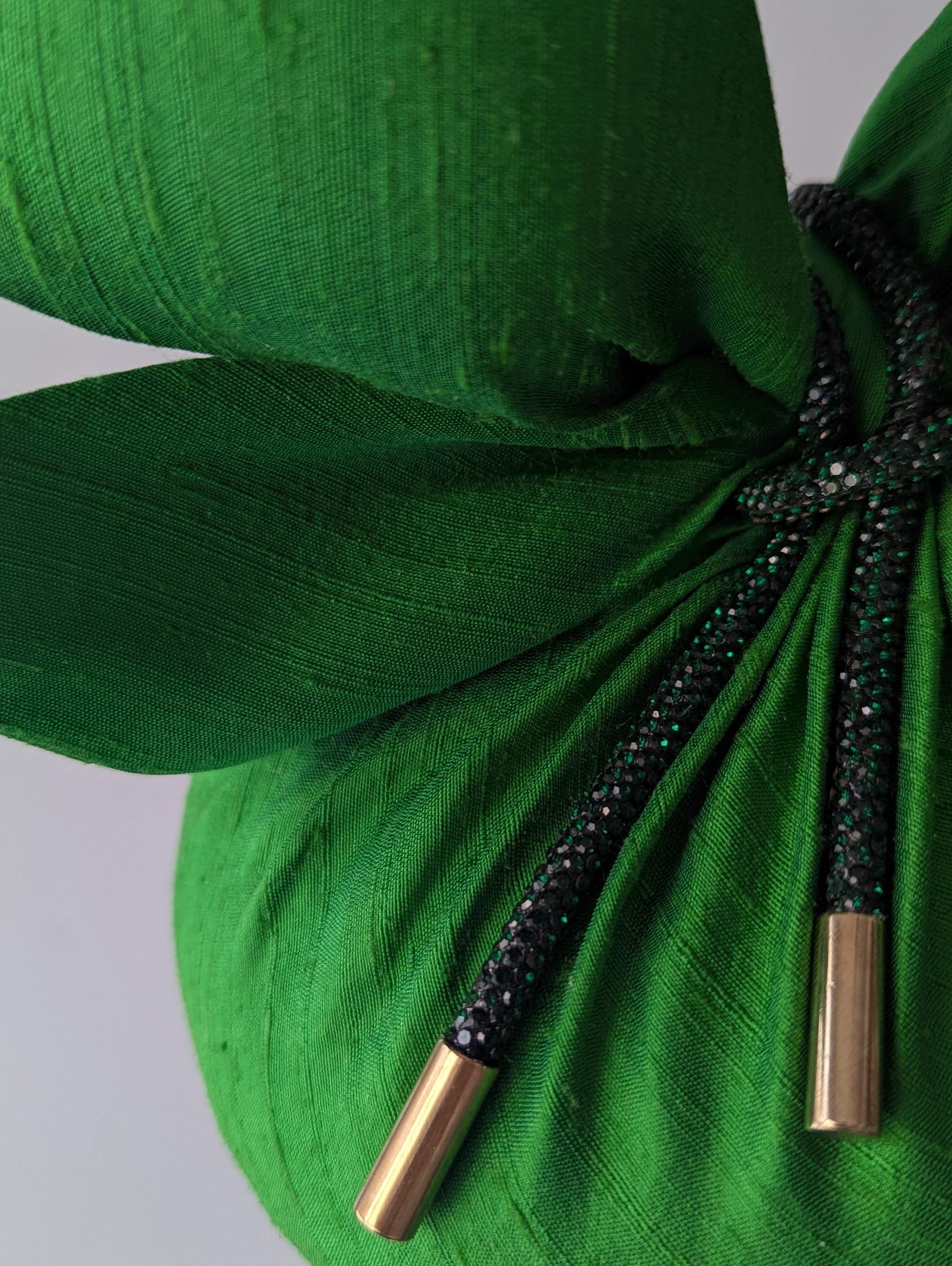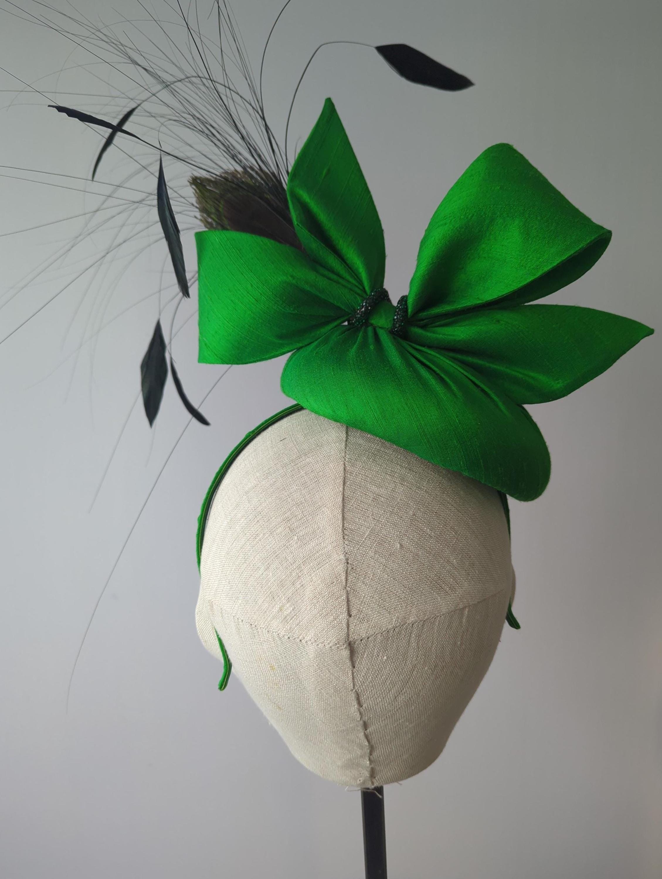 I made this showstopper hat in a luxurious green dupioni silk, made a matching contemporary bow and then made a lively grouping of iridescent coque feathers, peacock hurl, and a then trimmed a peacock feather to tie in with the lovely jewel tone of the hat. I then added an emerald green rhinestone cord and I finished it off with gold tips to add even more glamour.