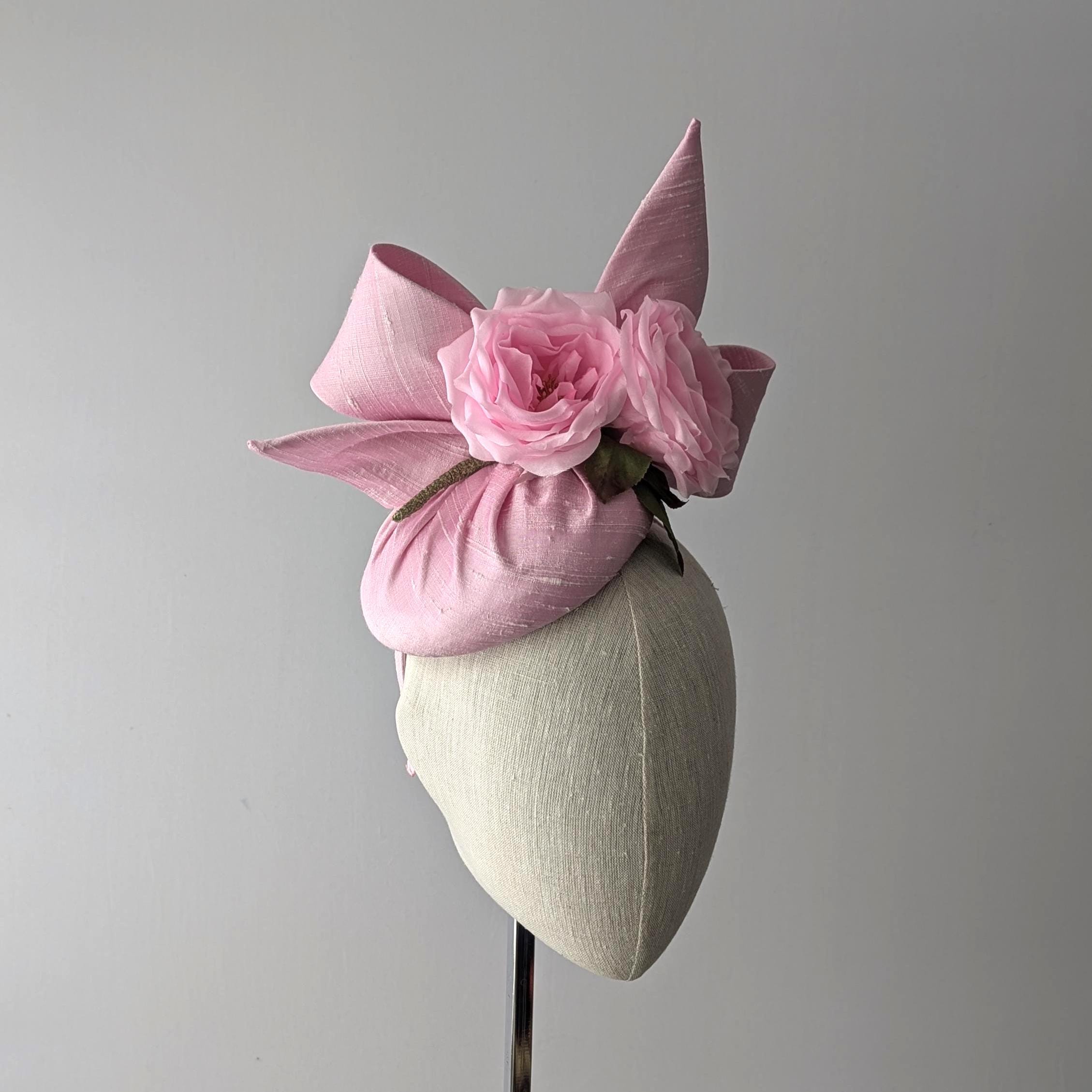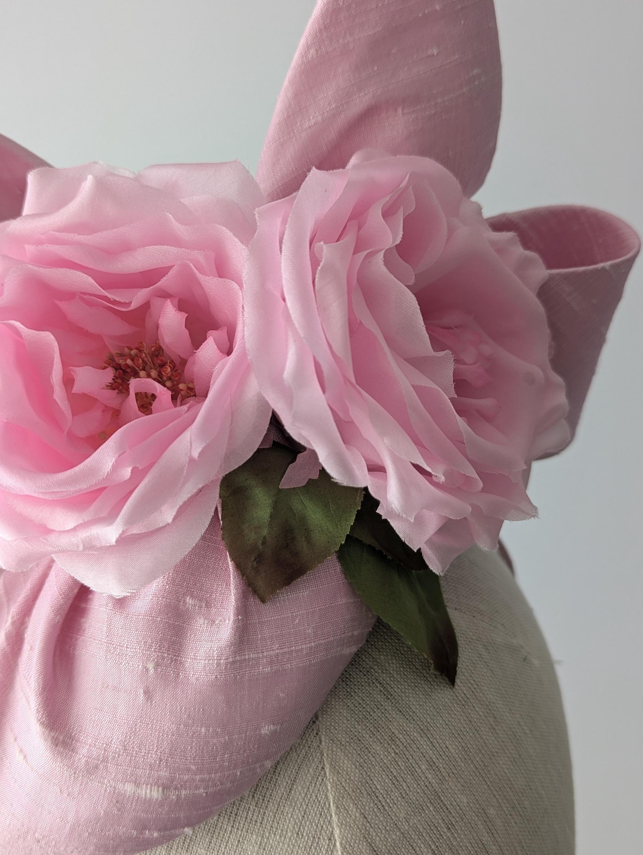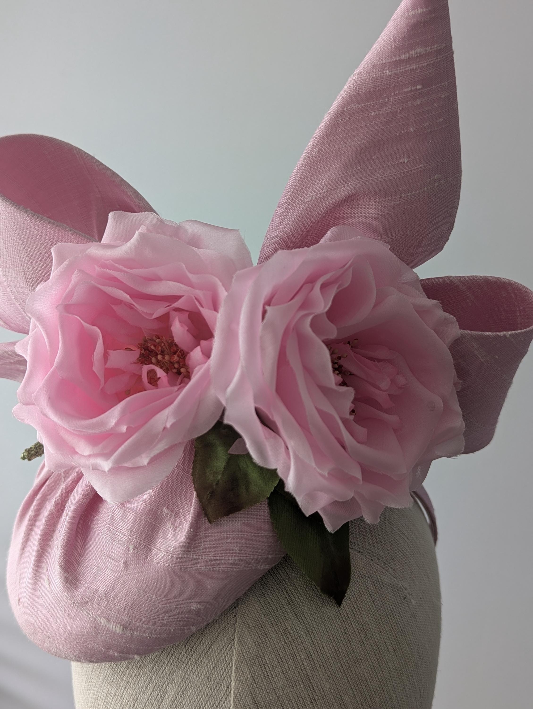 I made this luxe hat in a gorgeous light pink silk, made the bow the same silk and added vintage stock silk millinery roses with leaves and added a Swiss straw stem. I love this perky bow style.
