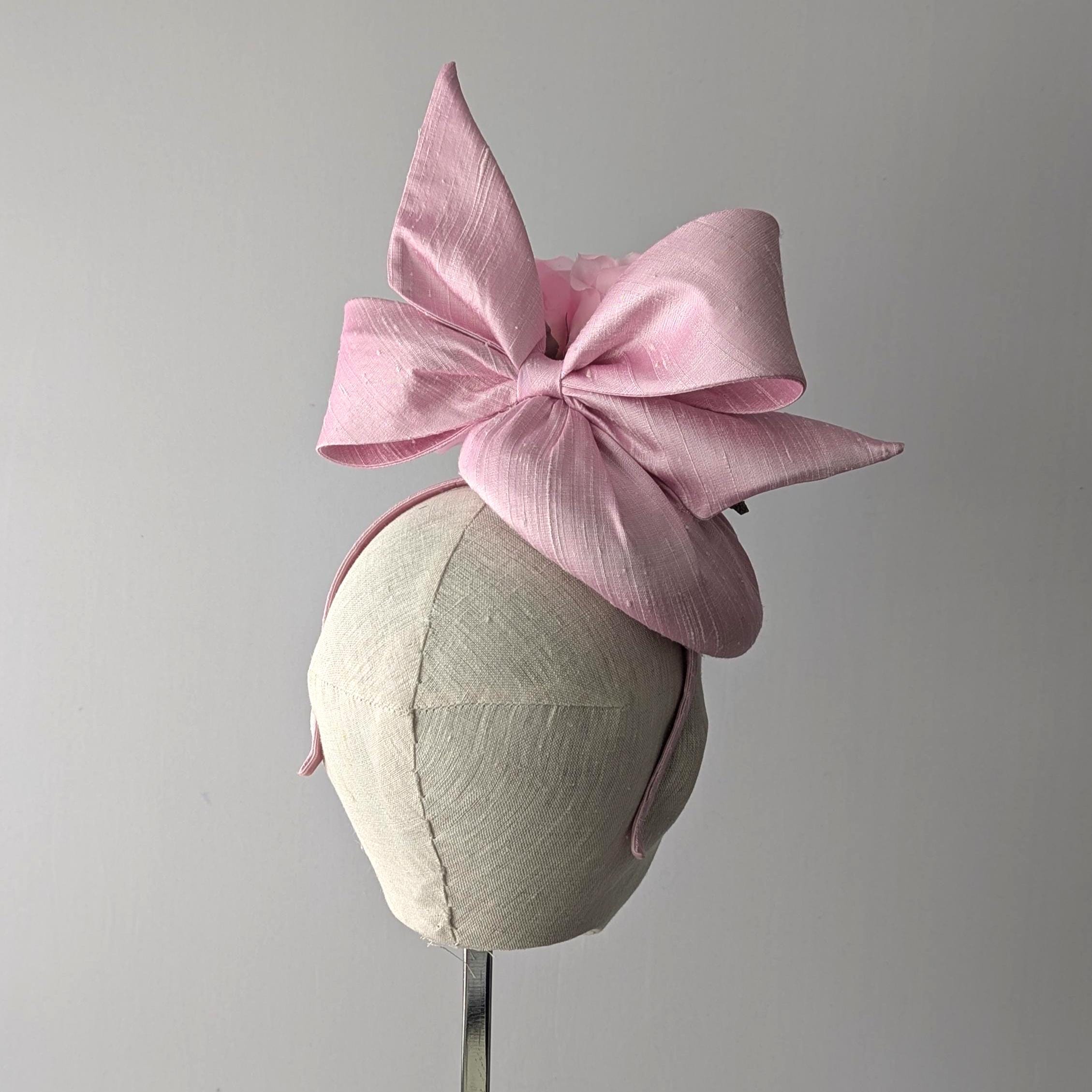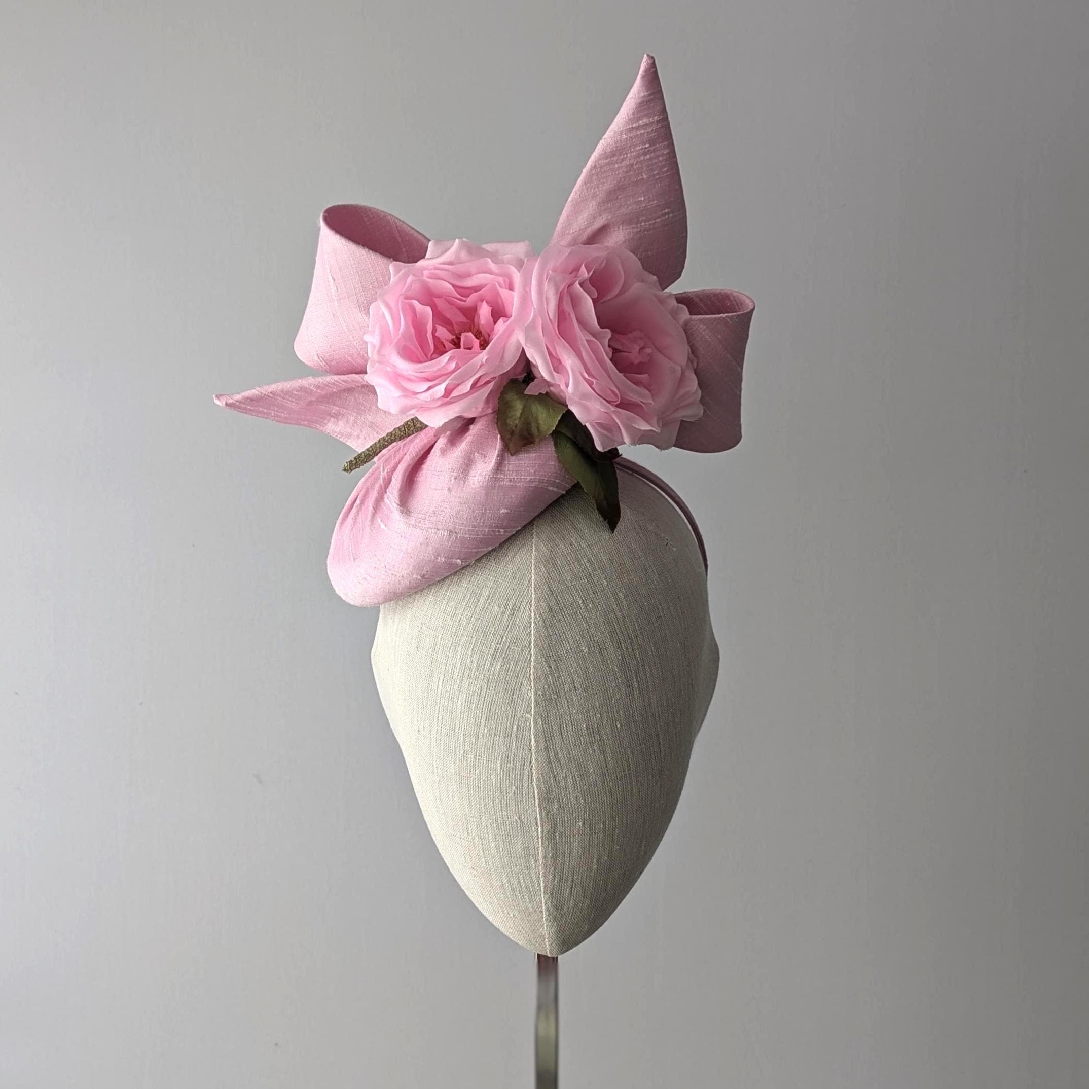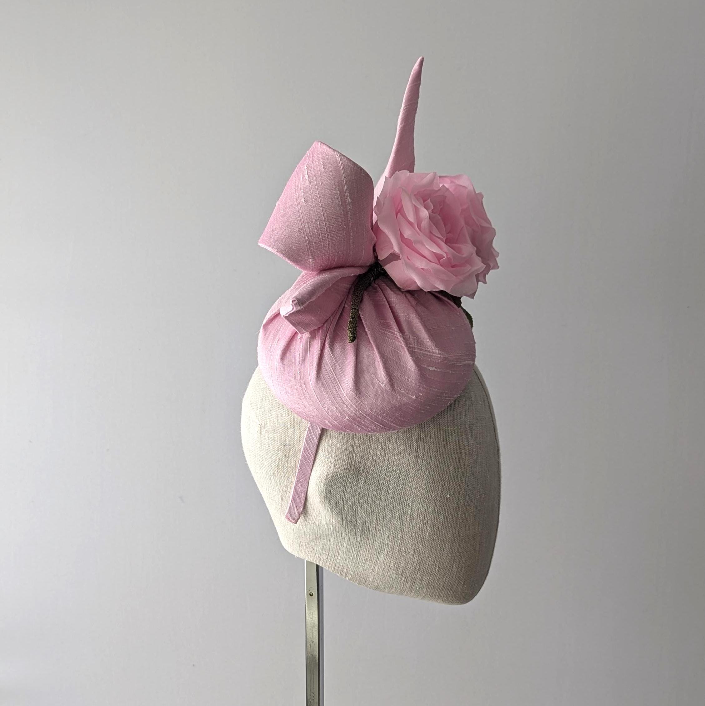 I made this luxe hat in a gorgeous light pink silk, made the bow the same silk and added vintage stock silk millinery roses with leaves and added a Swiss straw stem. I love this perky bow style.