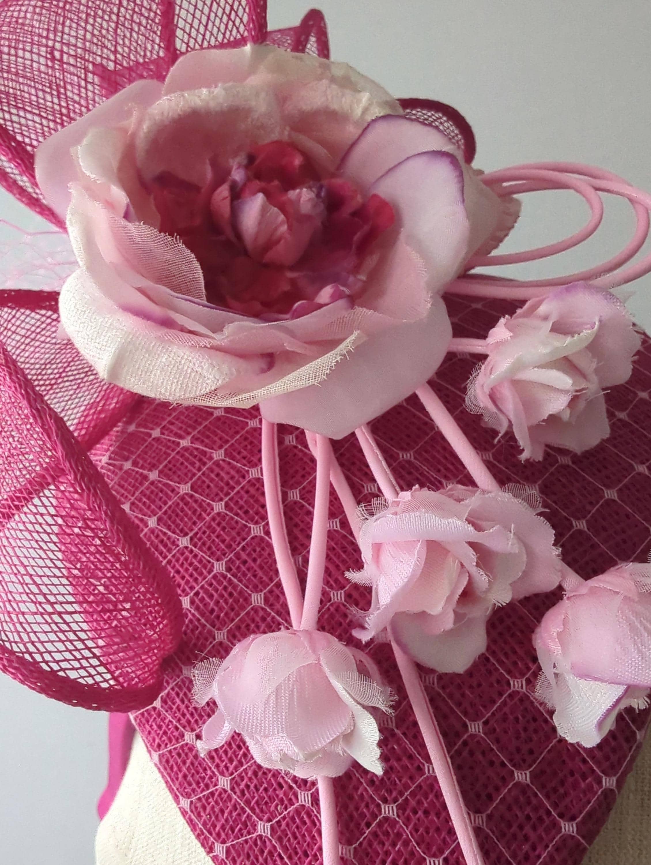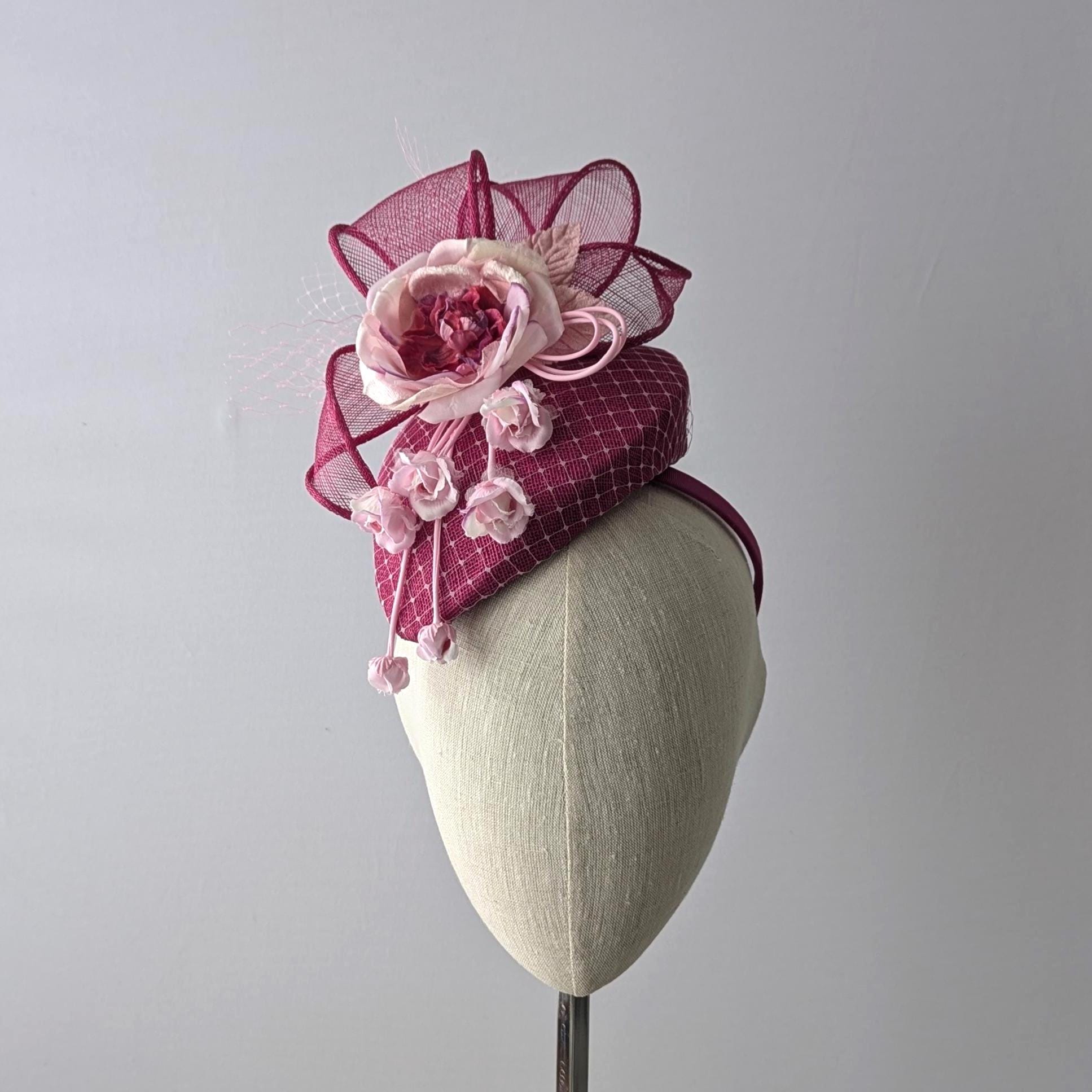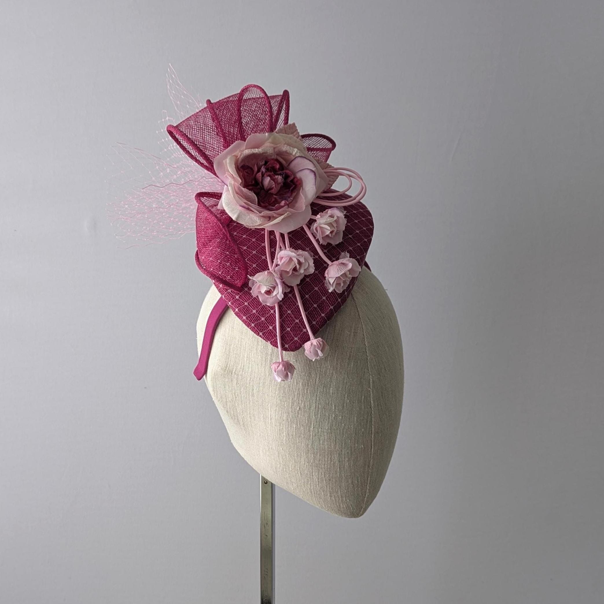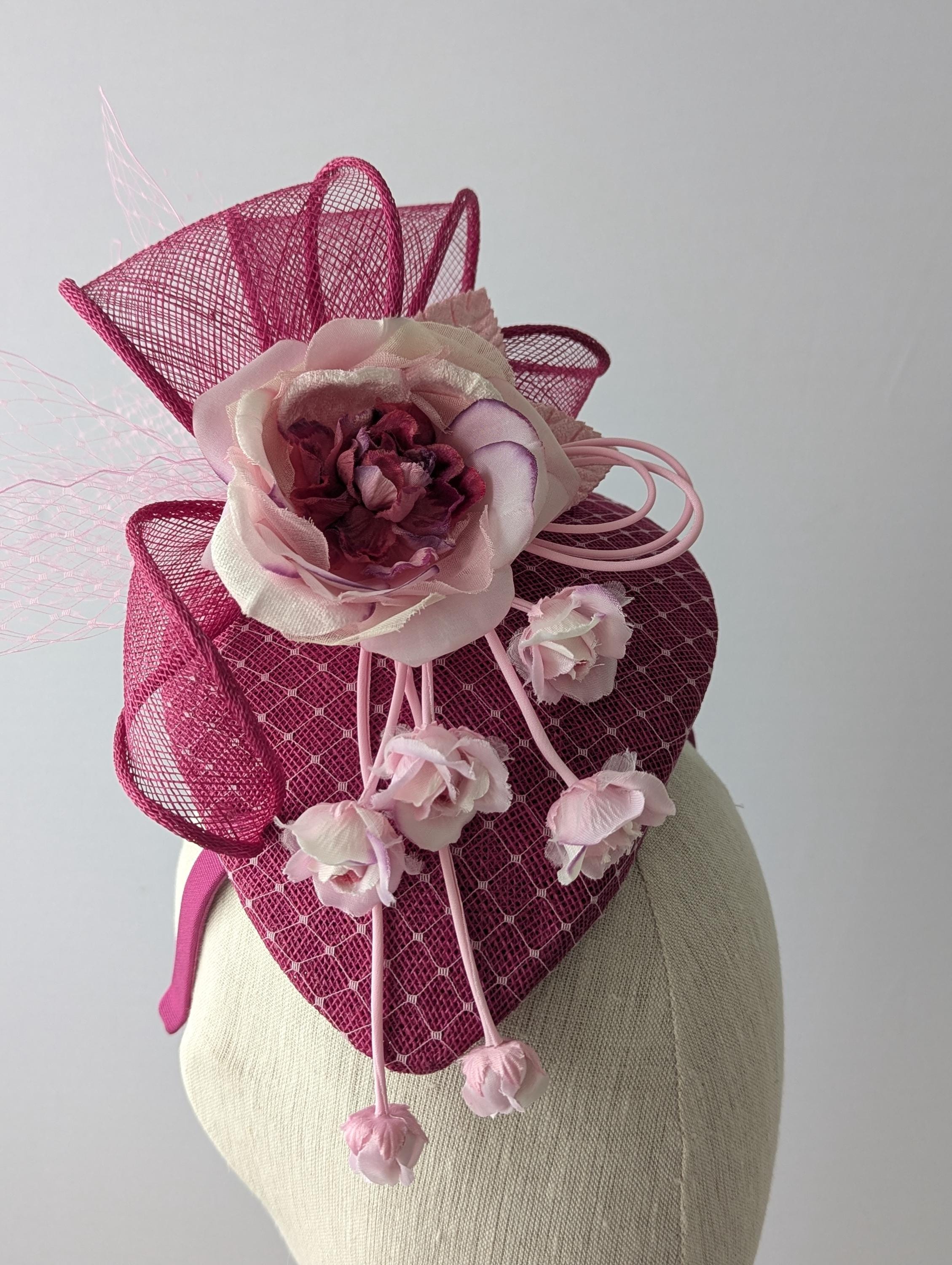 I hand blocked this elegant hat in a rich magenta sinamay straw, its a lovely teardrop shape that hugs the head and I overlayed it with a veiling to tie the colors together. It features a bow design in matching magenta straw which adds a lot of drama. The showstopper handmade silk flower has a cascade of little buds that give lovely movement and whimsy to the hat.