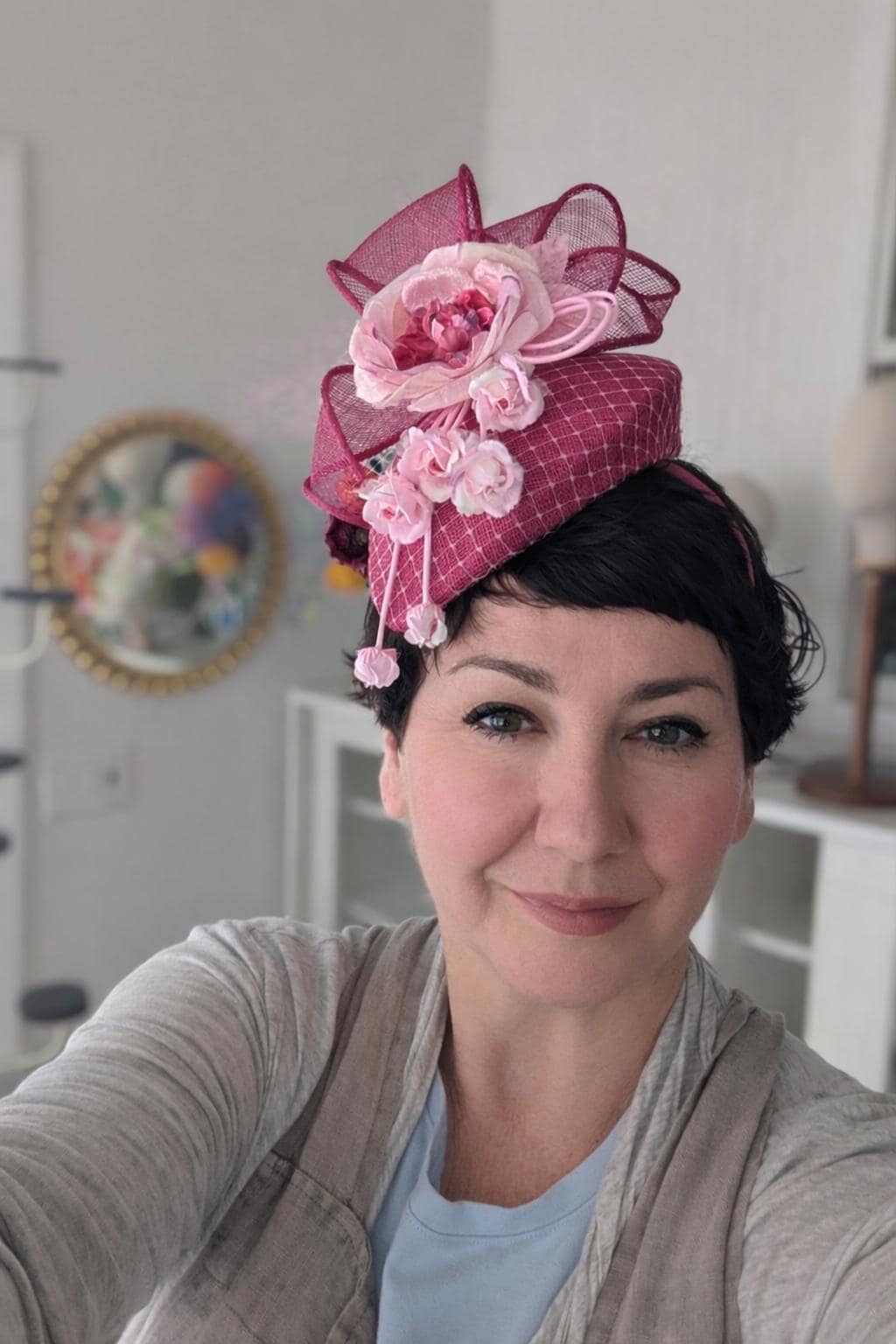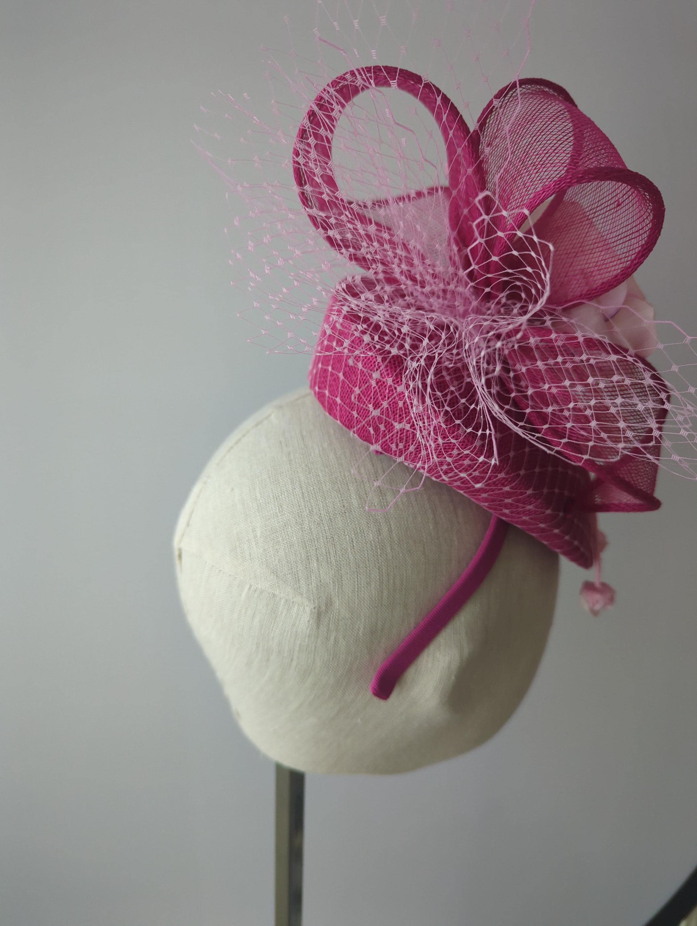 Its held on by a metal headband that I covered in magenta grosgrain ribbon and a hair comb. This looks so fabulous on, it has a lovely curvaceous shape that sits very happily and suits all face shapes.