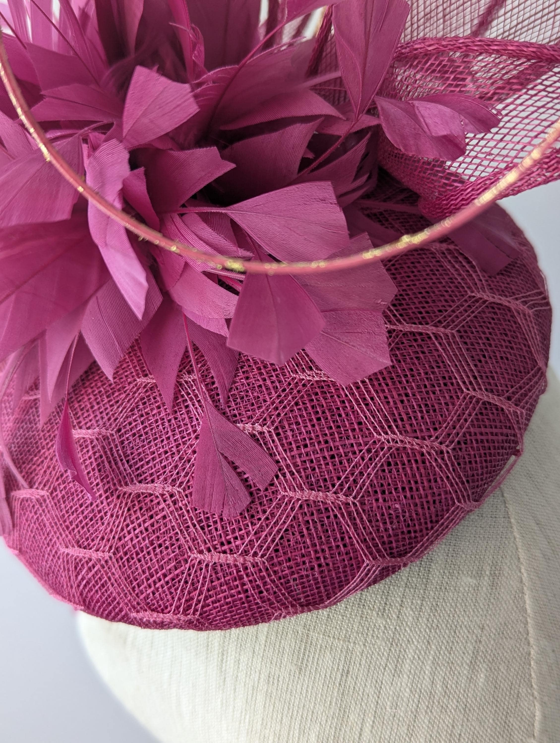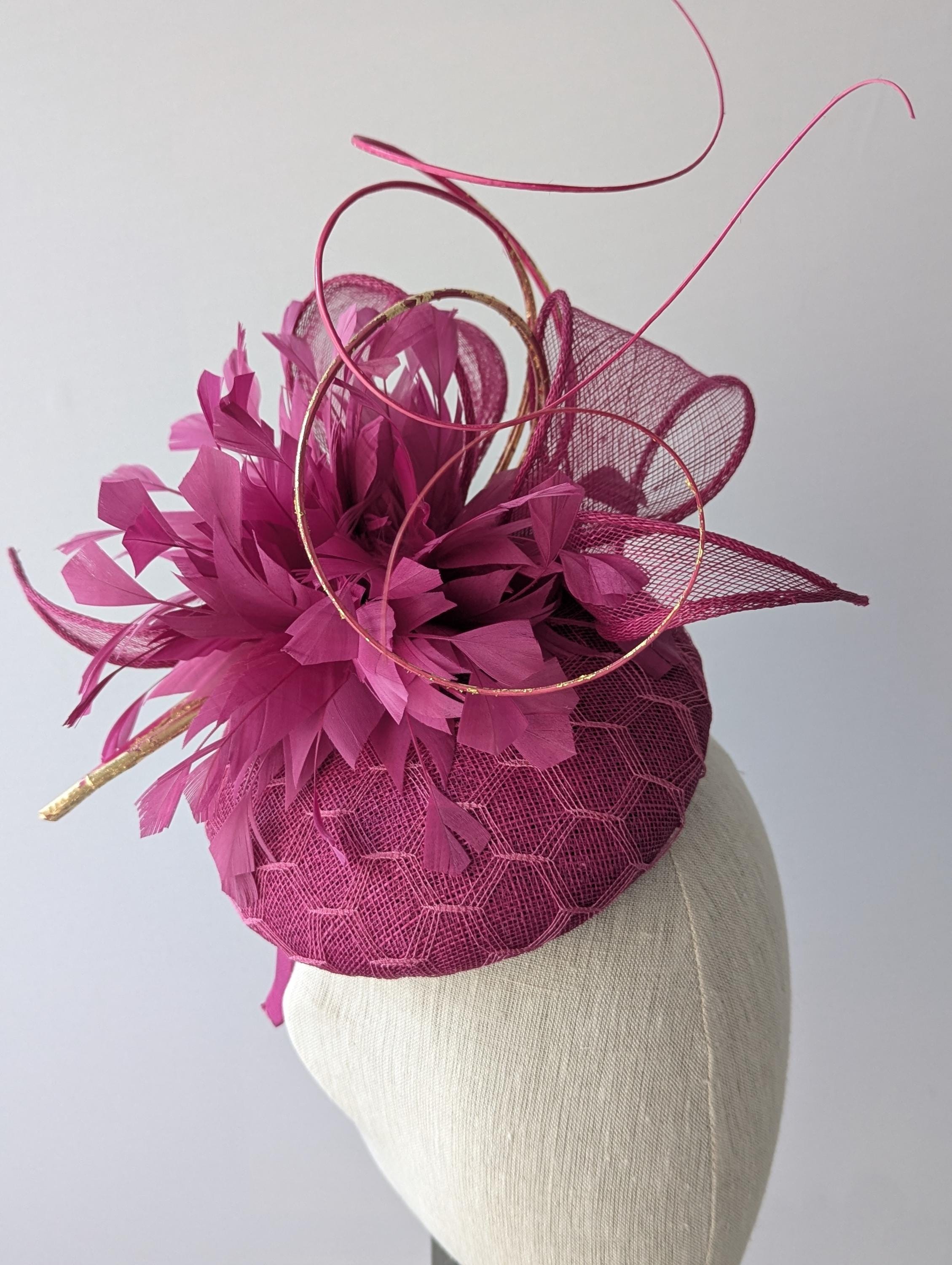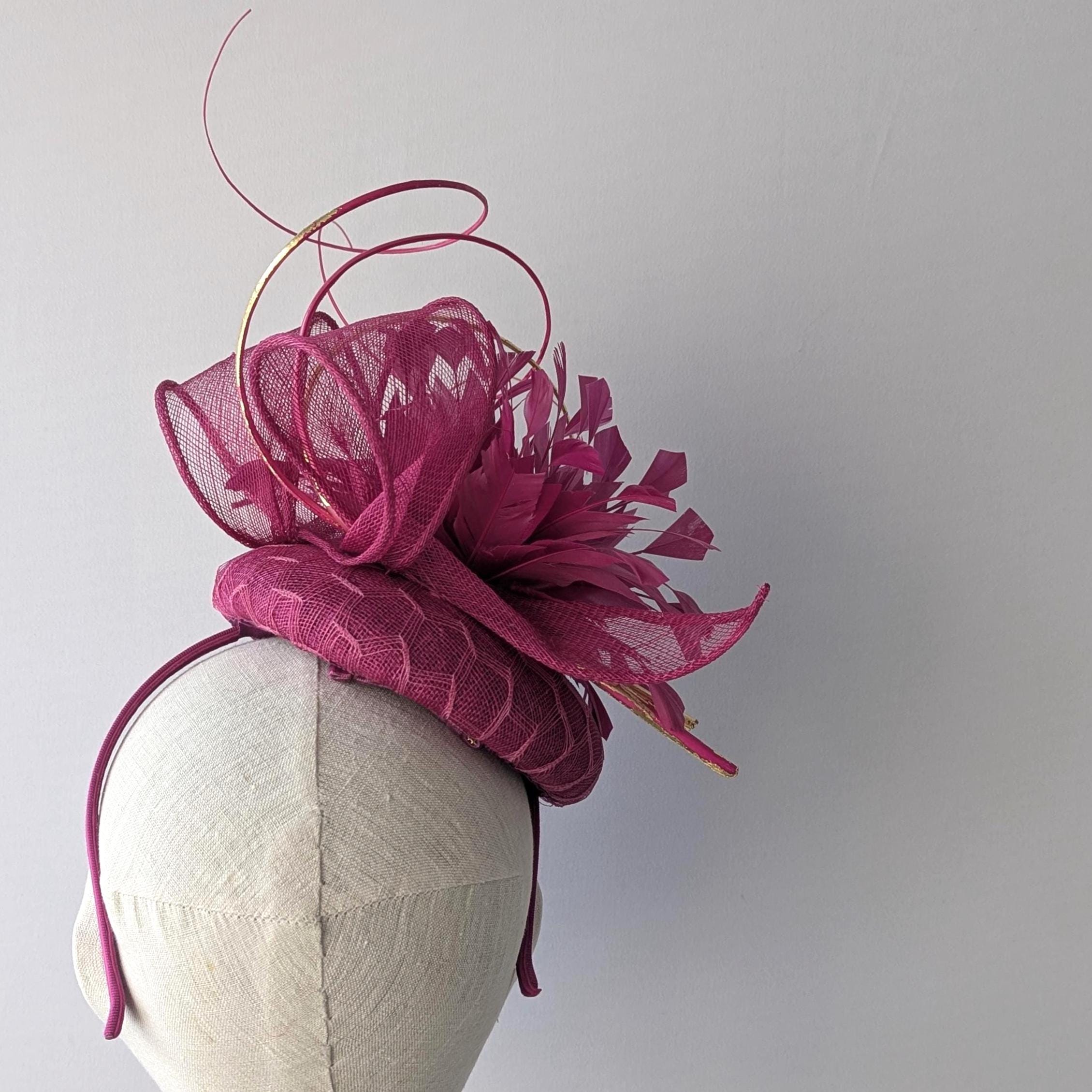I hand blocked this contempory style hat in a rich magenta sinamay straw, and I overlayed it with a unique vintage hexagon veiling. It features quills that I curled and gold leafed along with a modern swirl bow design in matching magenta straw which adds a lot of drama. I finished it off with a modern cut feather design in the same magenta color.
