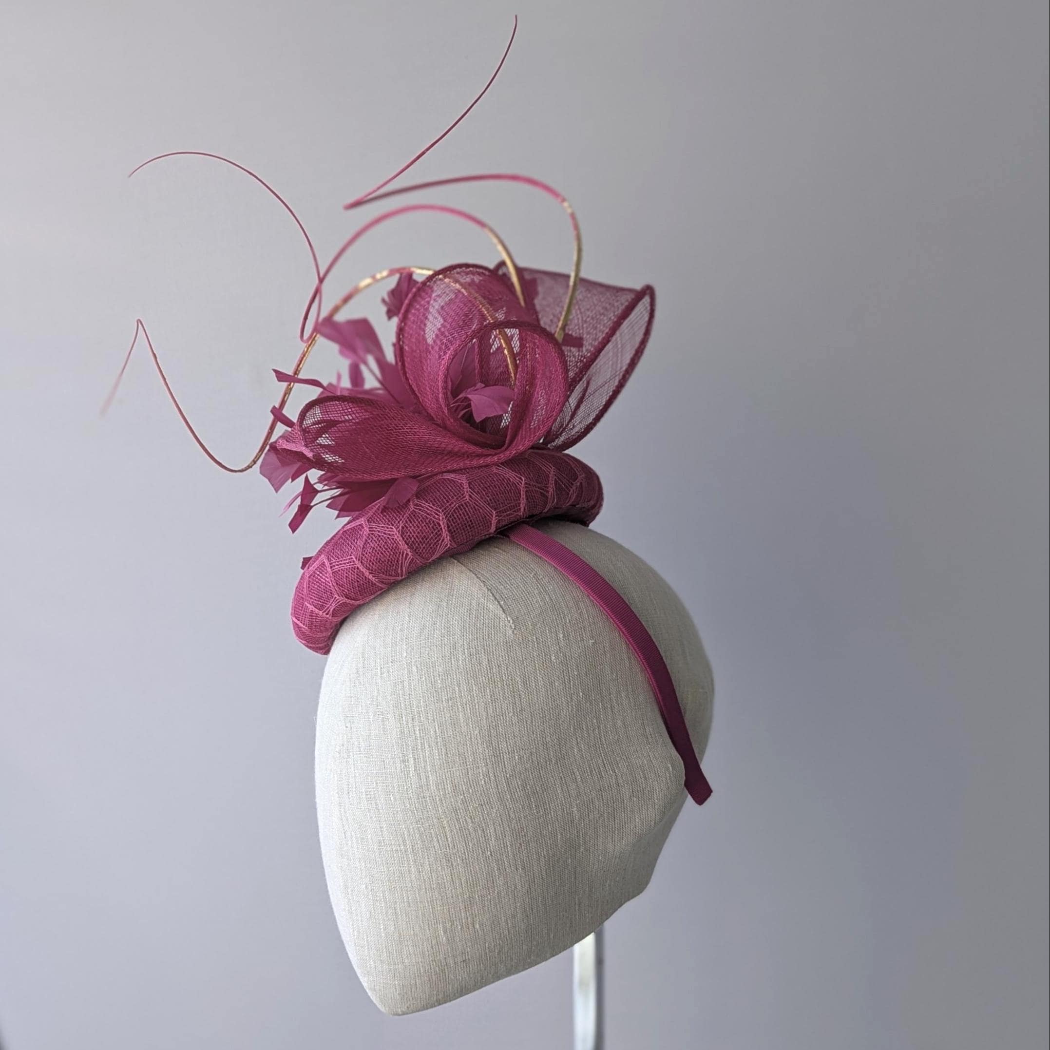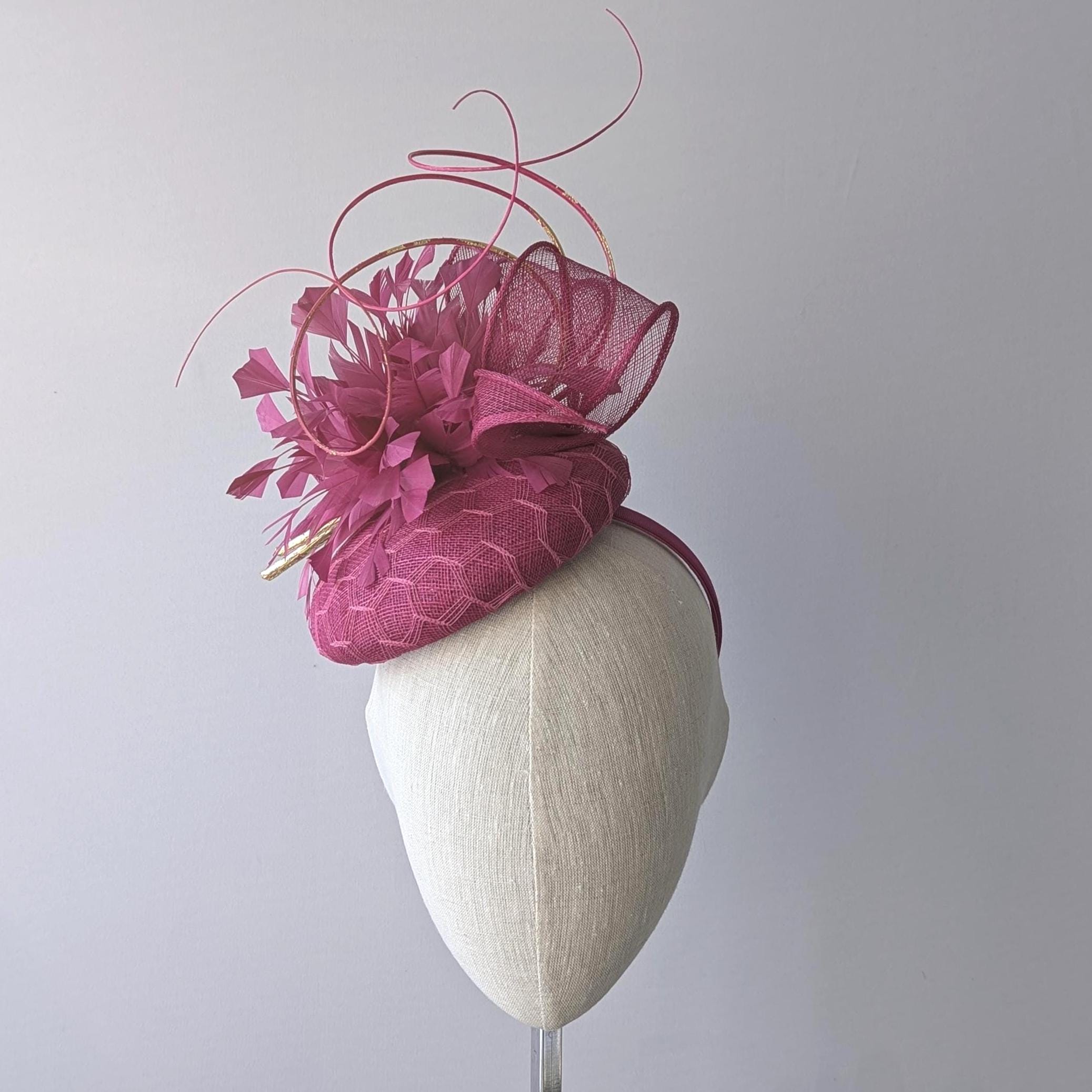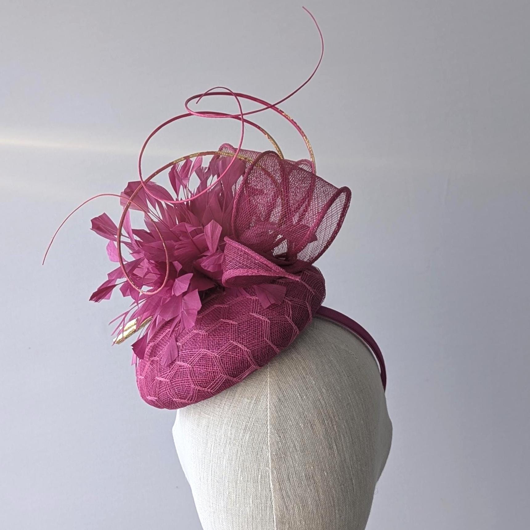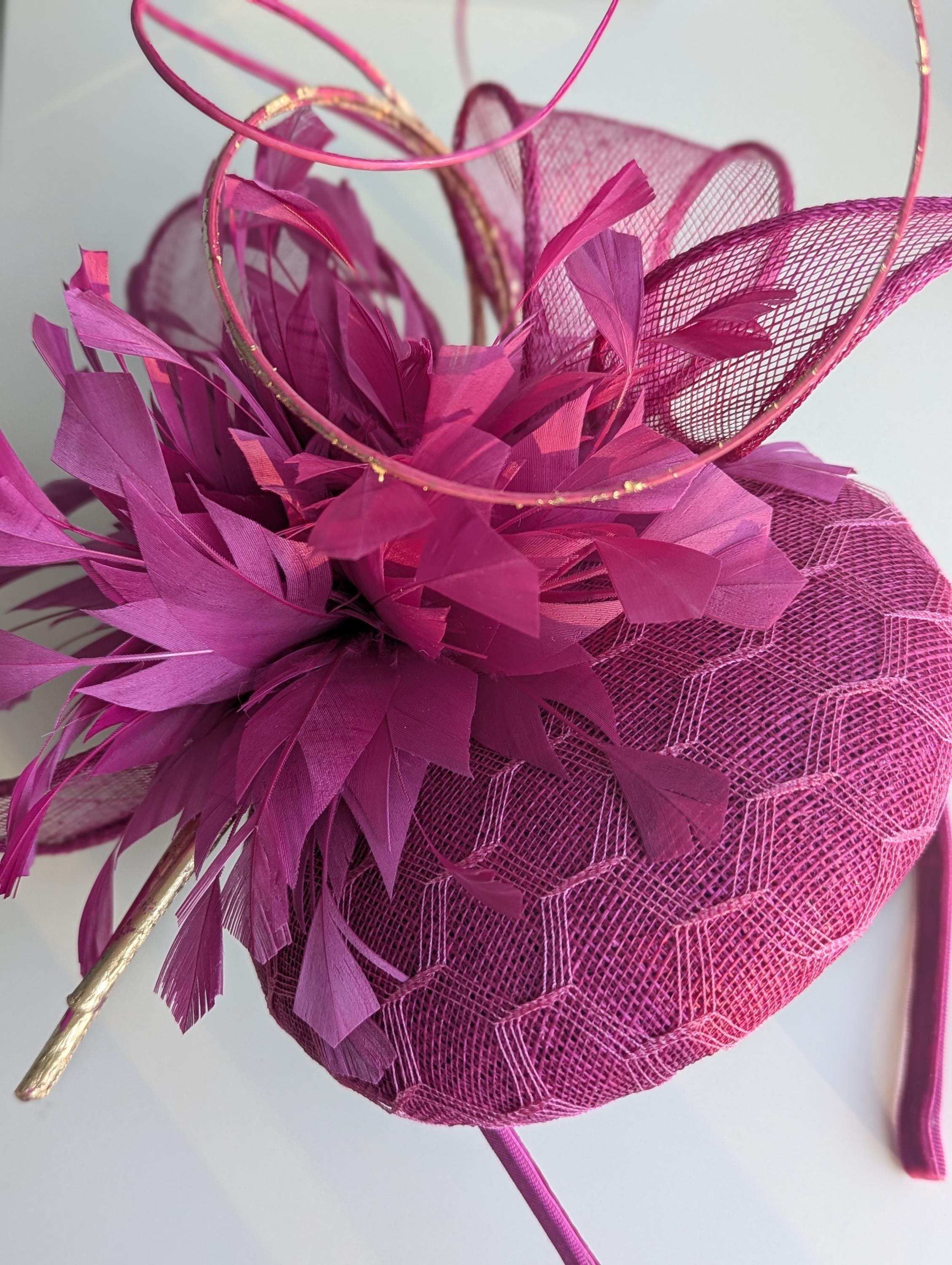 I hand blocked this contempory style hat in a rich magenta sinamay straw, and I overlayed it with a unique vintage hexagon veiling. It features quills that I curled and gold leafed along with a modern swirl bow design in matching magenta straw which adds a lot of drama. I finished it off with a modern cut feather design in the same magenta color.