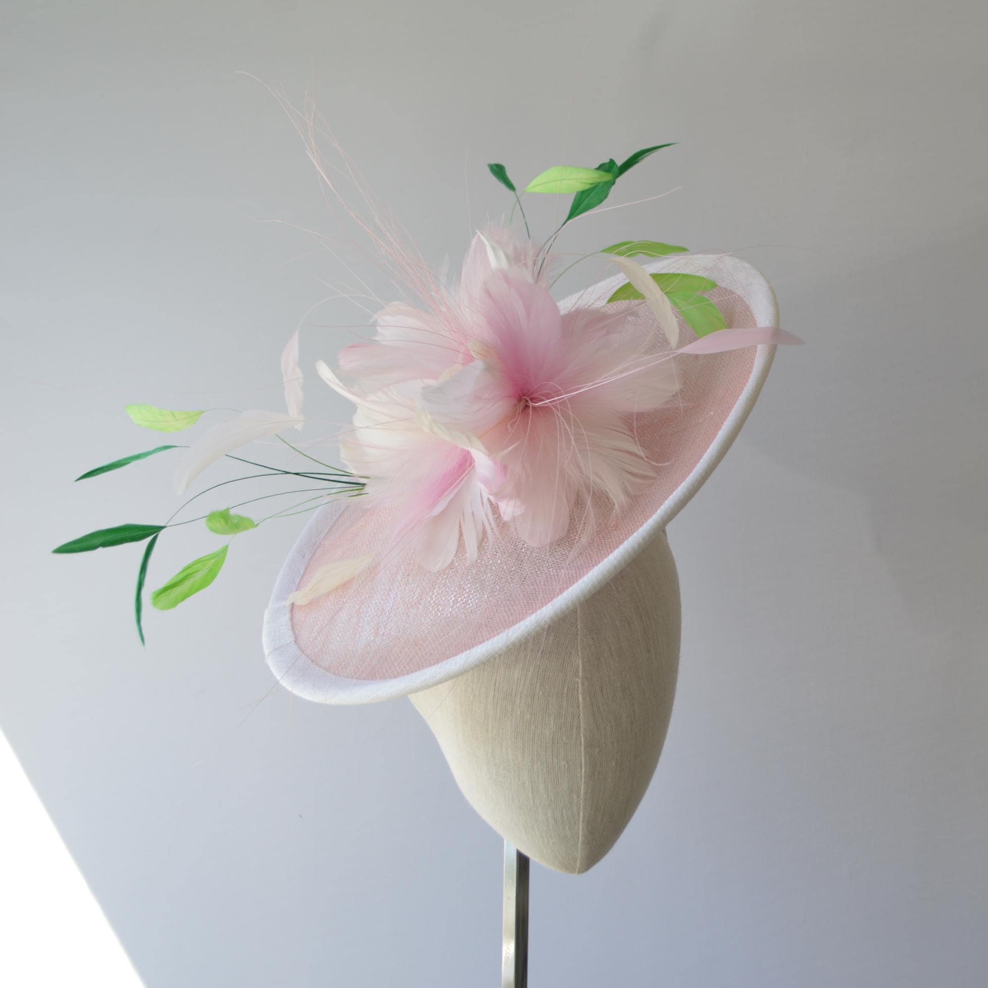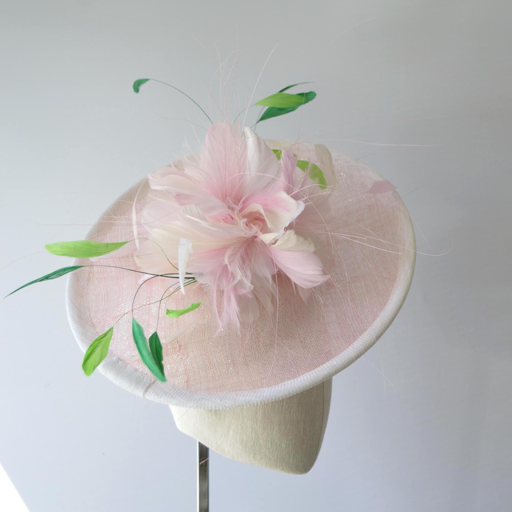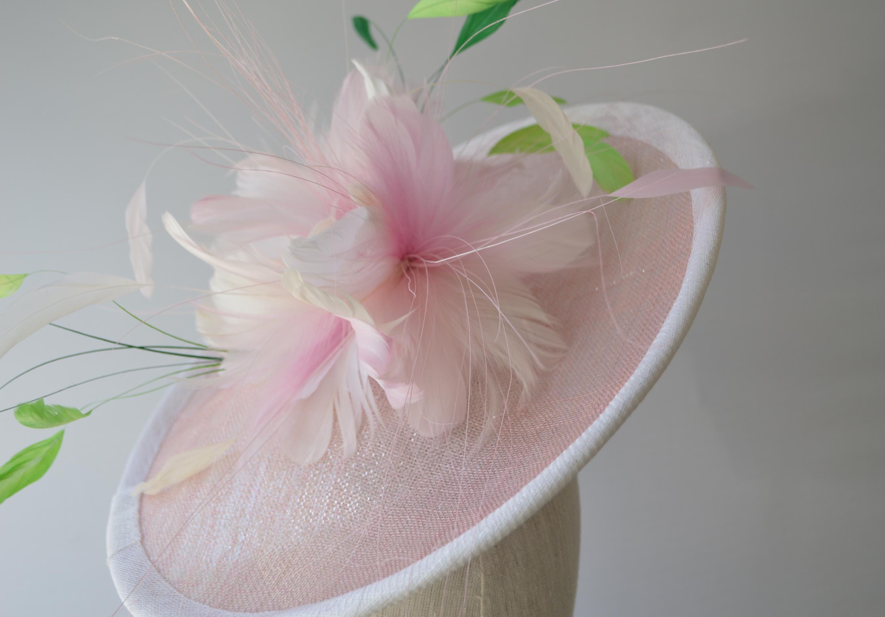 This is a fabulous shape, so flattering. I made the hat in a pink sinamay straw with silver running through it on one side - its shimmery and lovely, its white on the other with a white binding. It features my gorgeous flower like feathers and I also added some coque feathers in green like leaves to carry on the floral look.