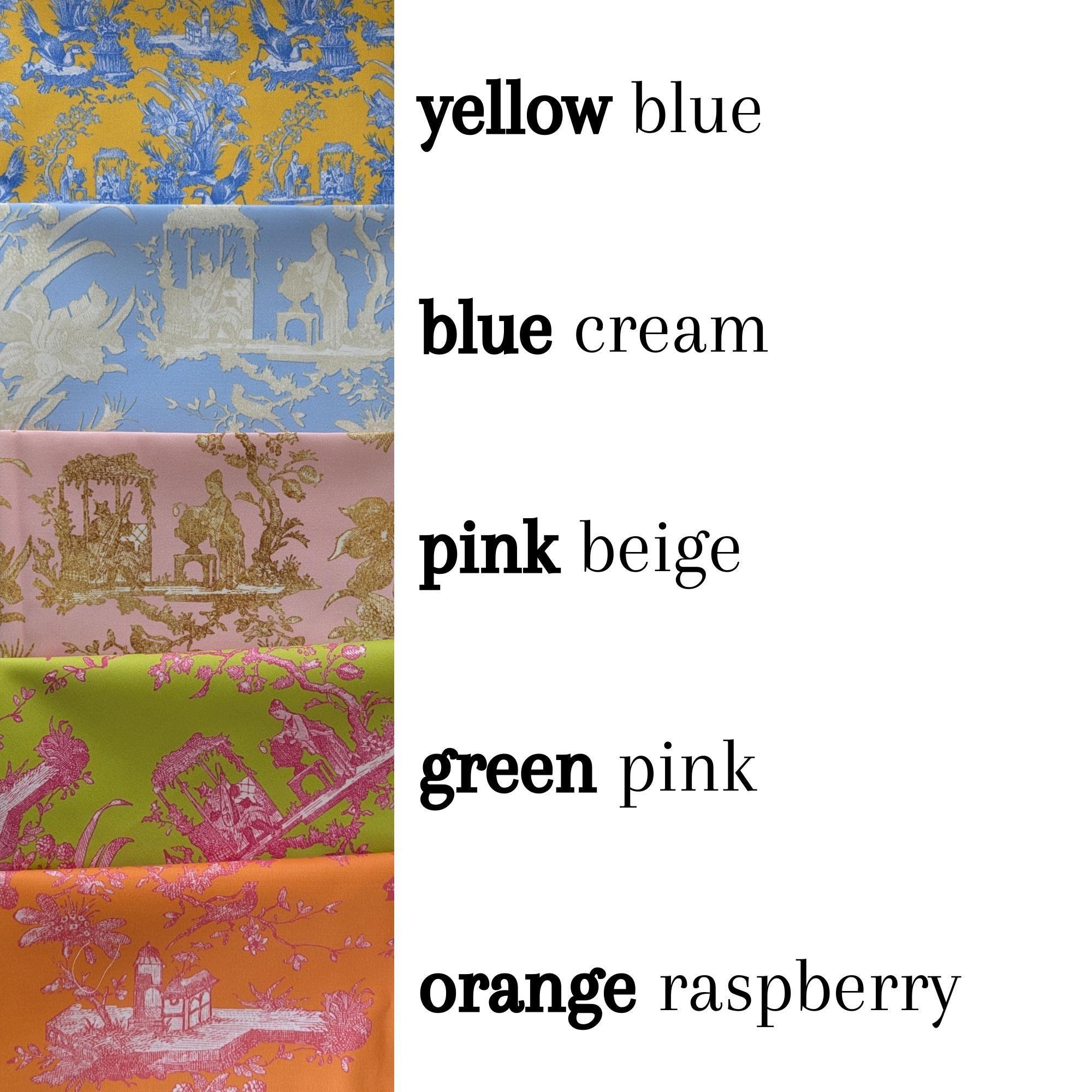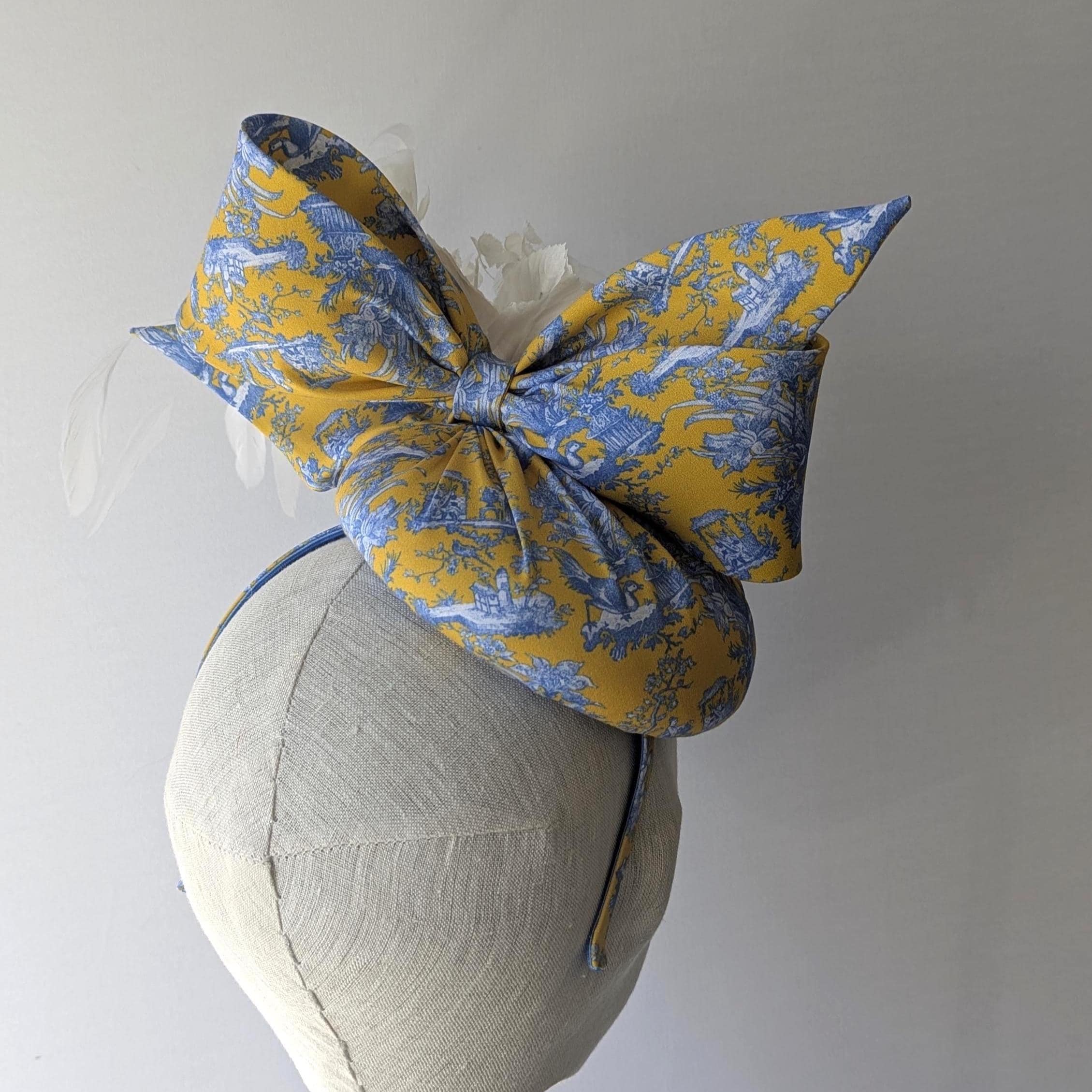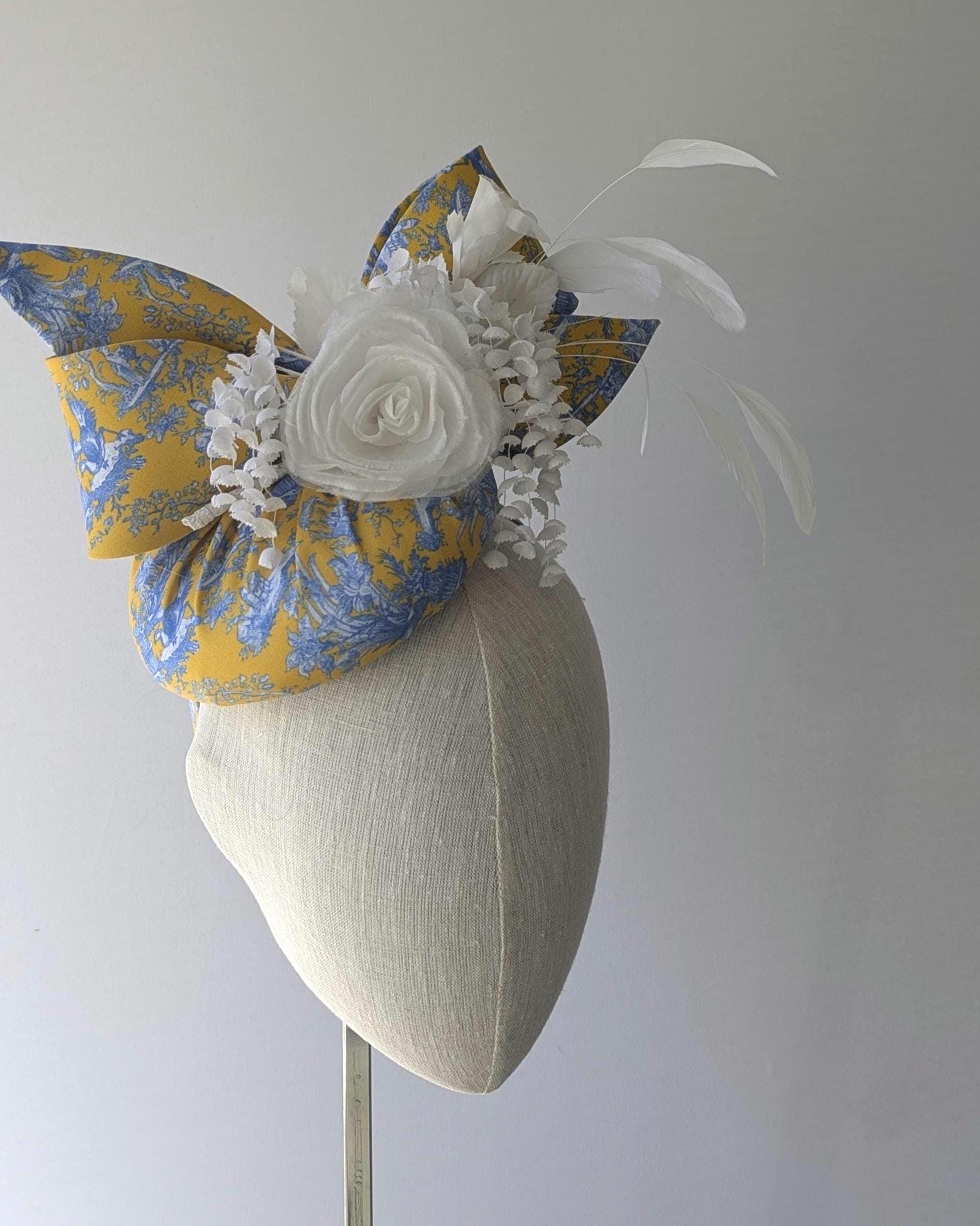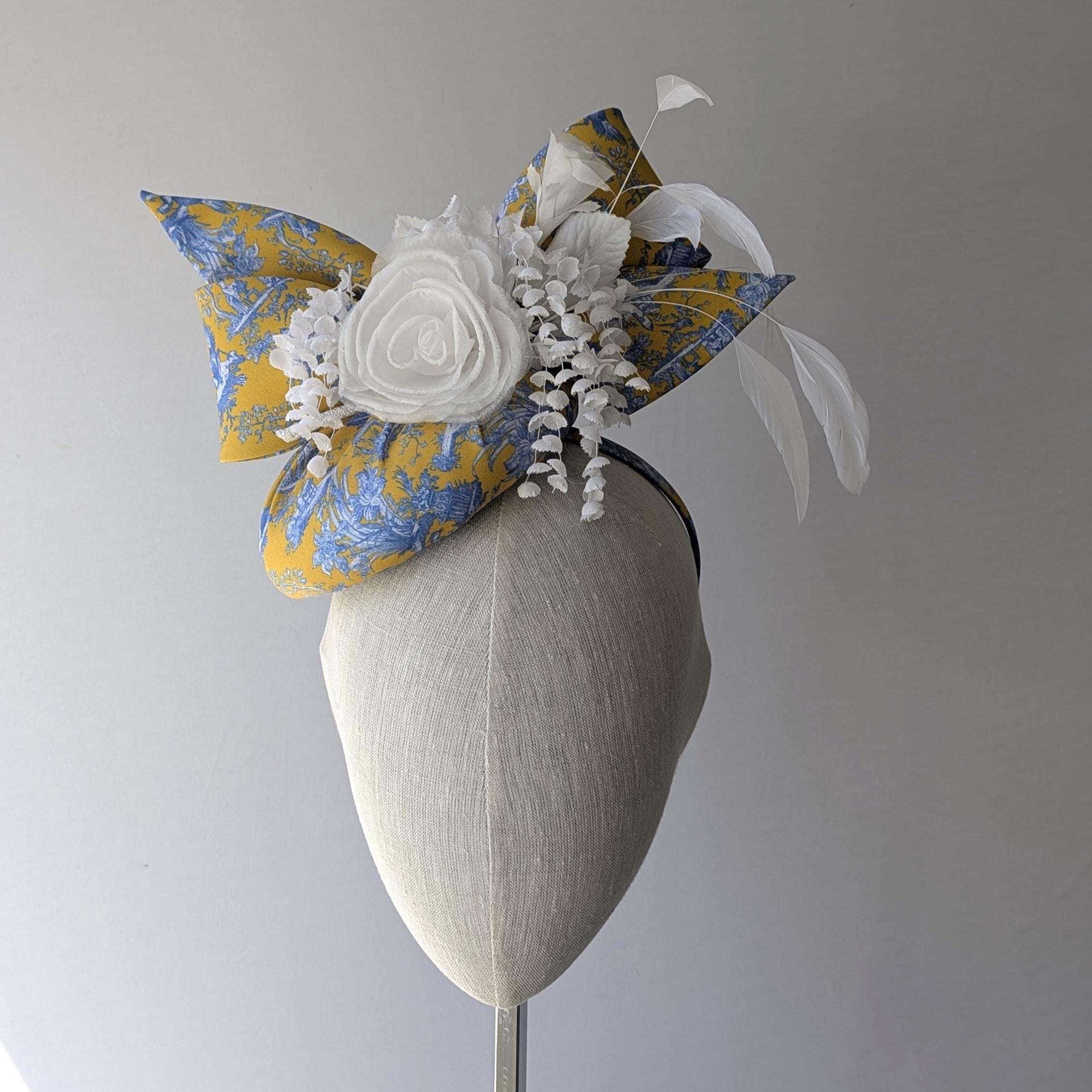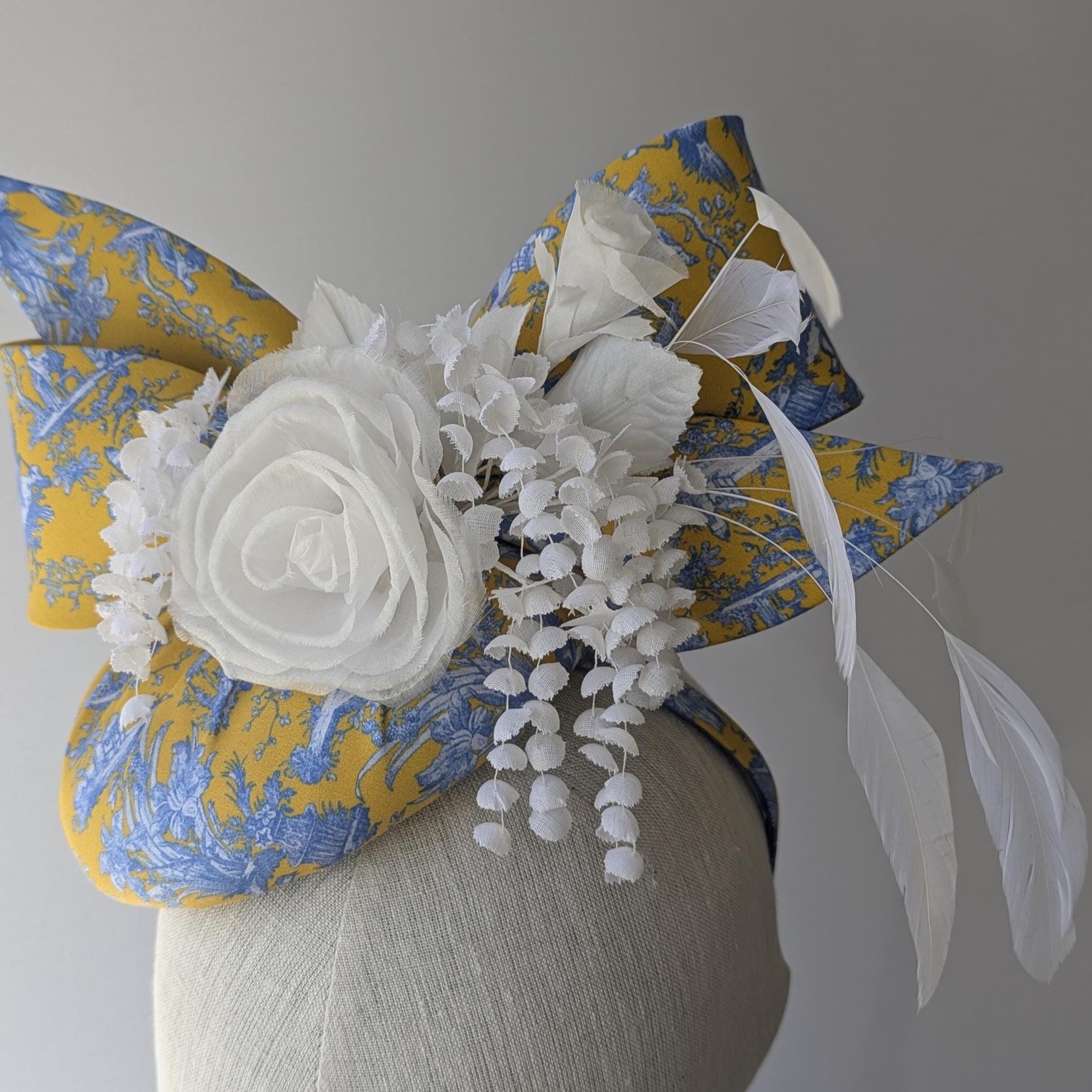 I made this charming hat is in a lovely blue and yellow toile print in organic fabric and made the bow in the same fabric. I adorned it with a white ranunculus flower, cascading little flowers and dancing coque feathers.