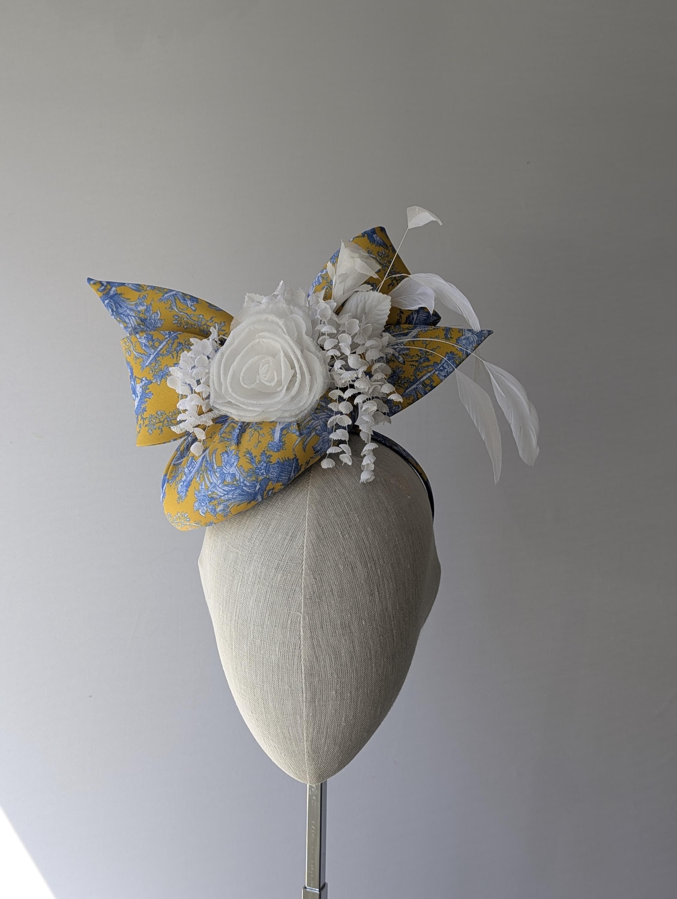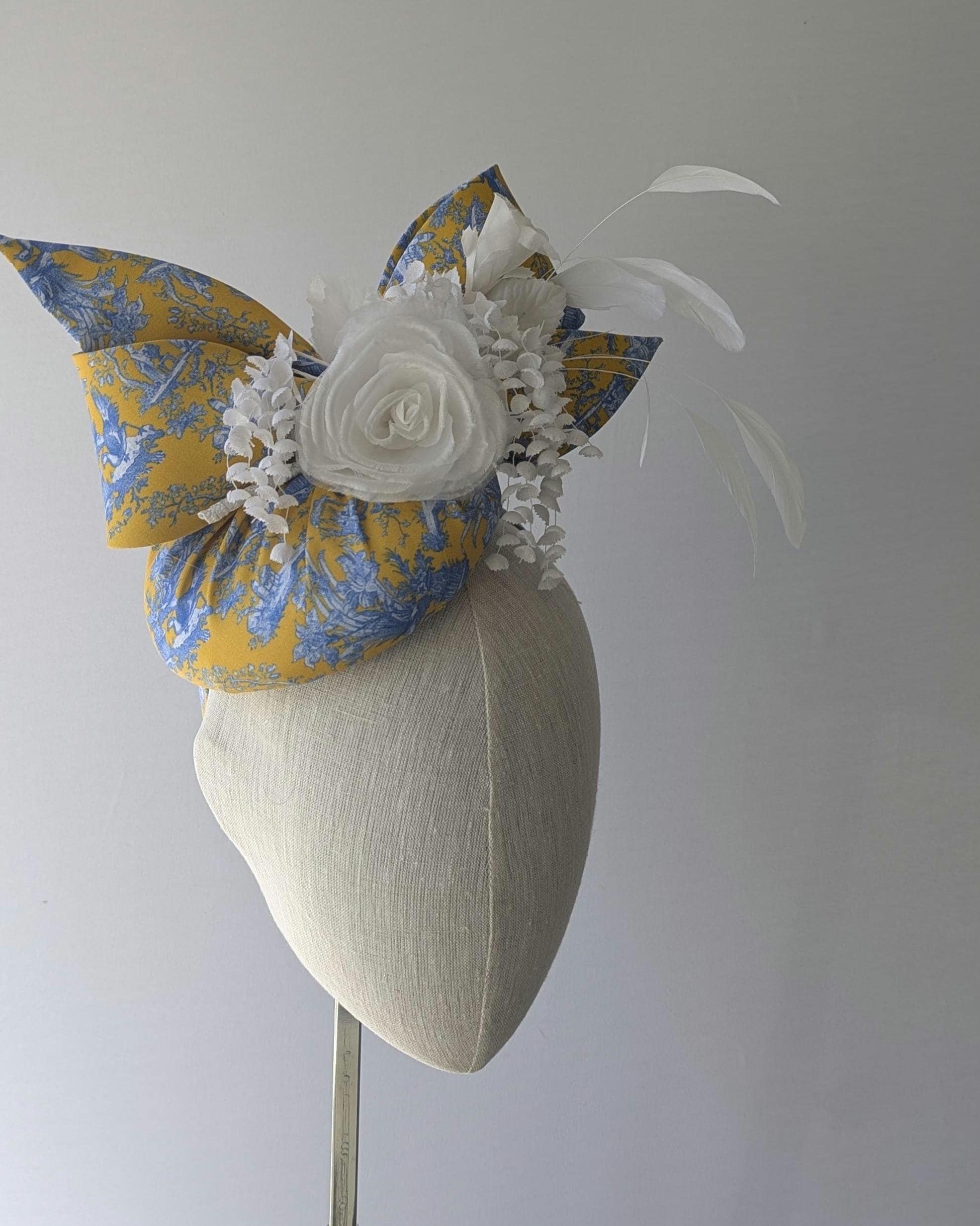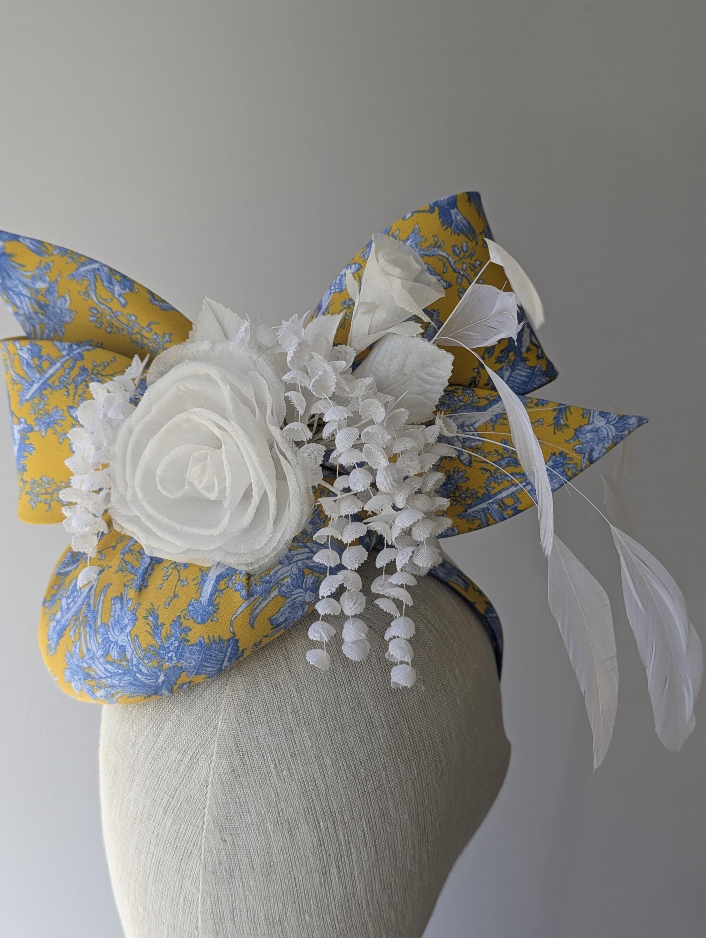 I made this charming hat is in a lovely blue and yellow toile print in organic fabric, made the bow in the same fabric to tie in to these exciting matching feathers! I adorned it with a white ranunculus flower, cascading little flowers and dancing coque feathers.