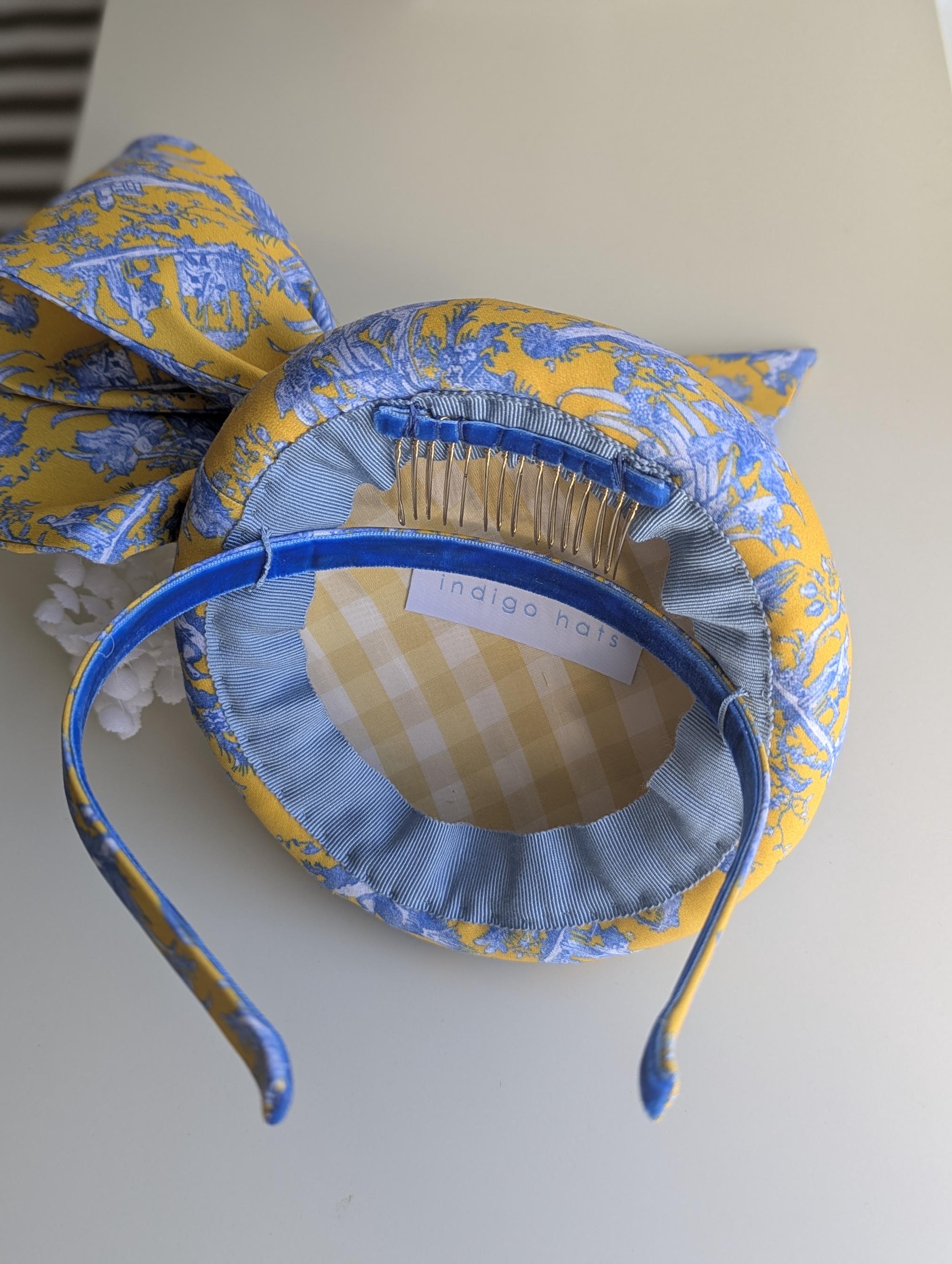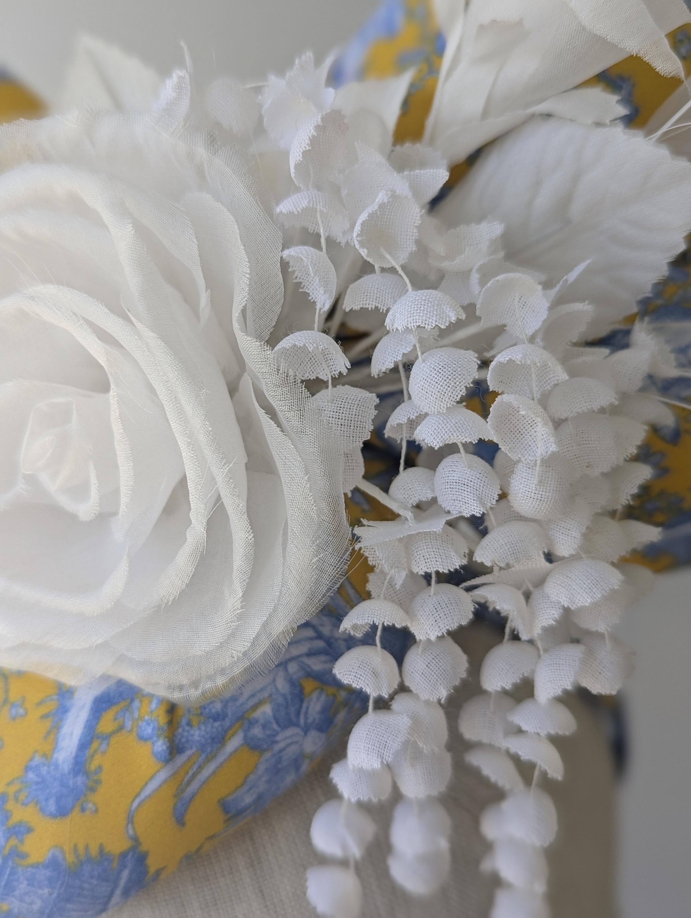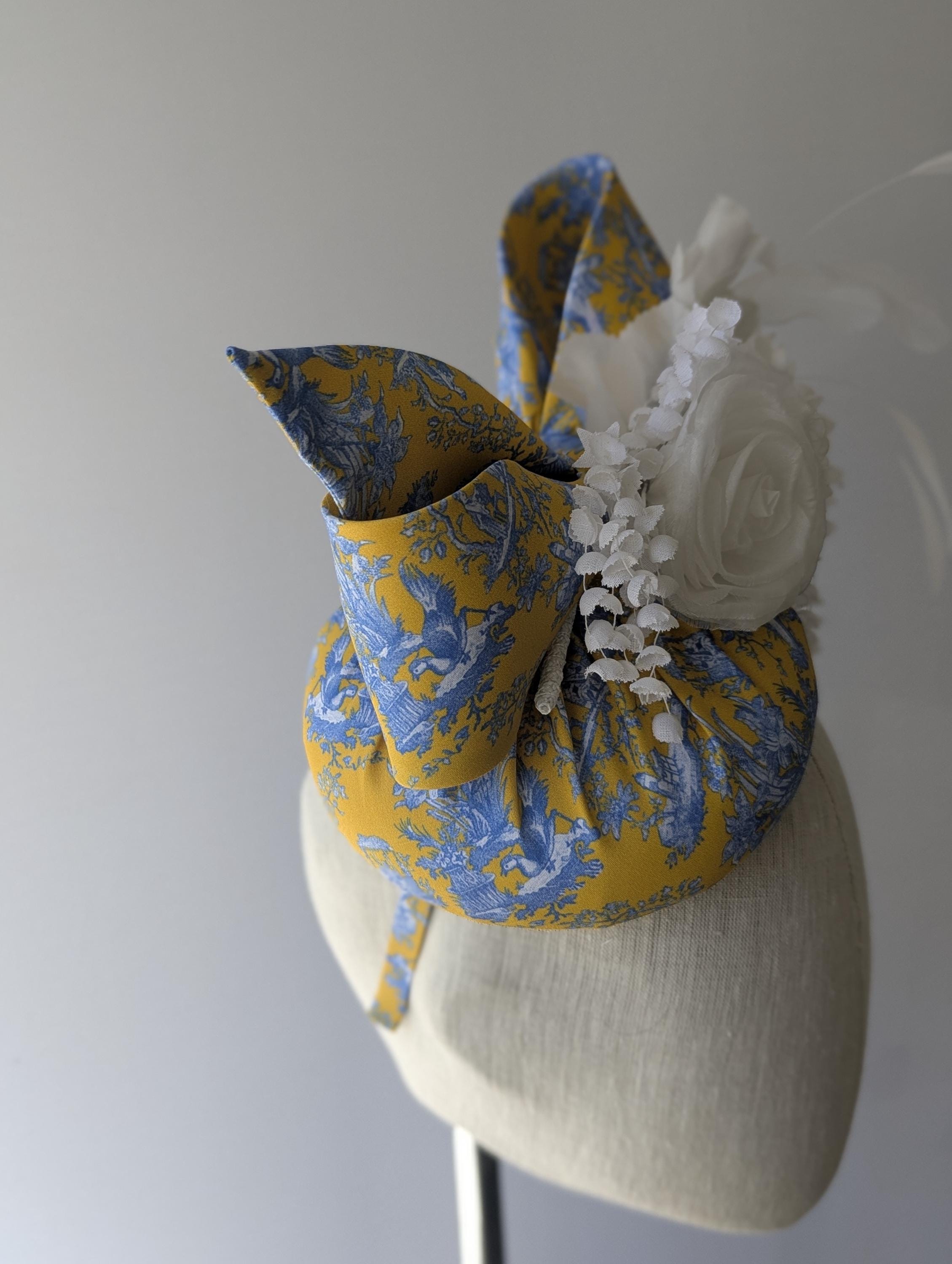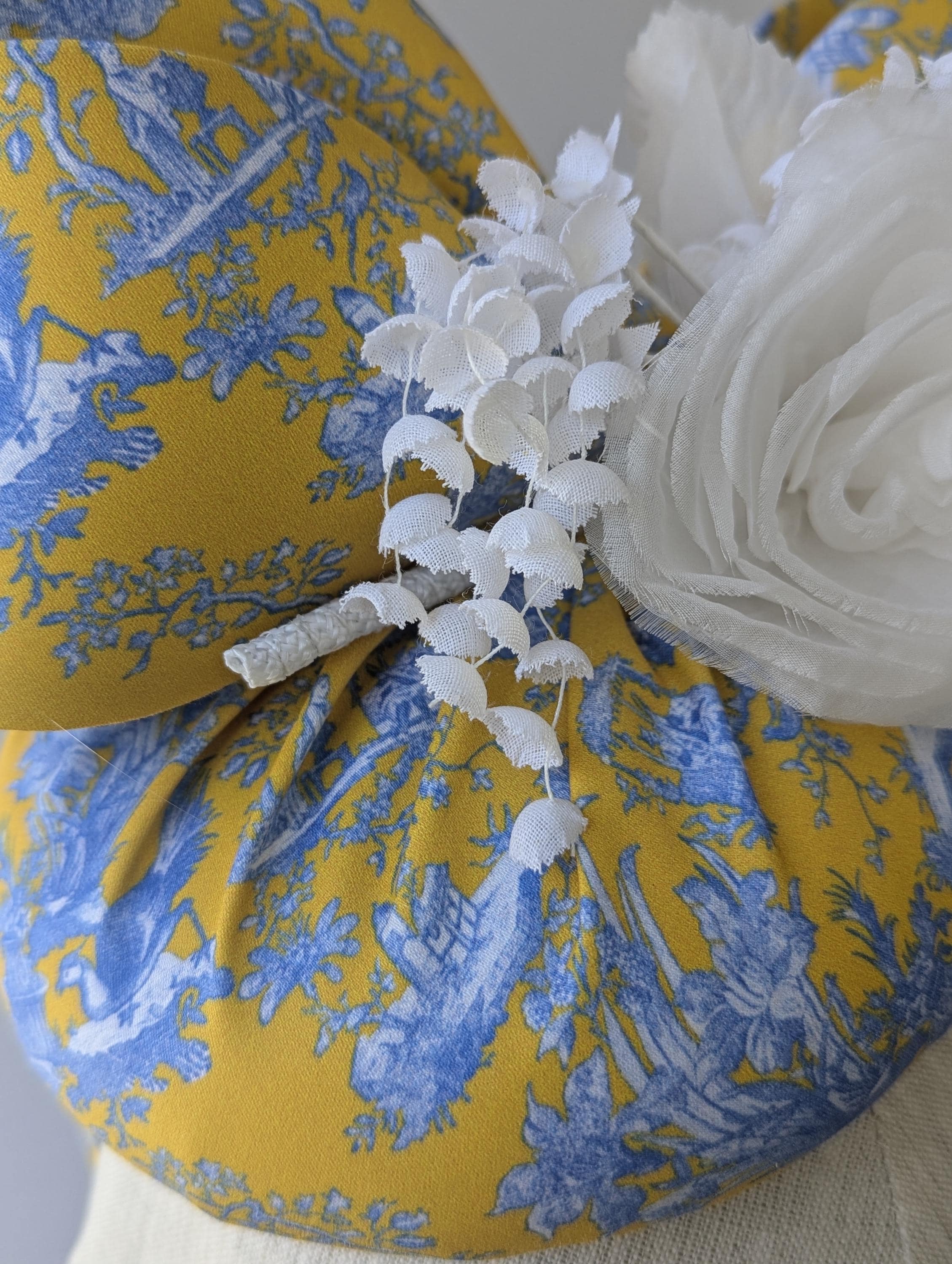I made this charming hat is in a lovely blue and yellow toile print in organic fabric, made the bow in the same fabric to tie in to these exciting matching feathers! I adorned it with a white ranunculus flower, cascading little flowers and dancing coque feathers.